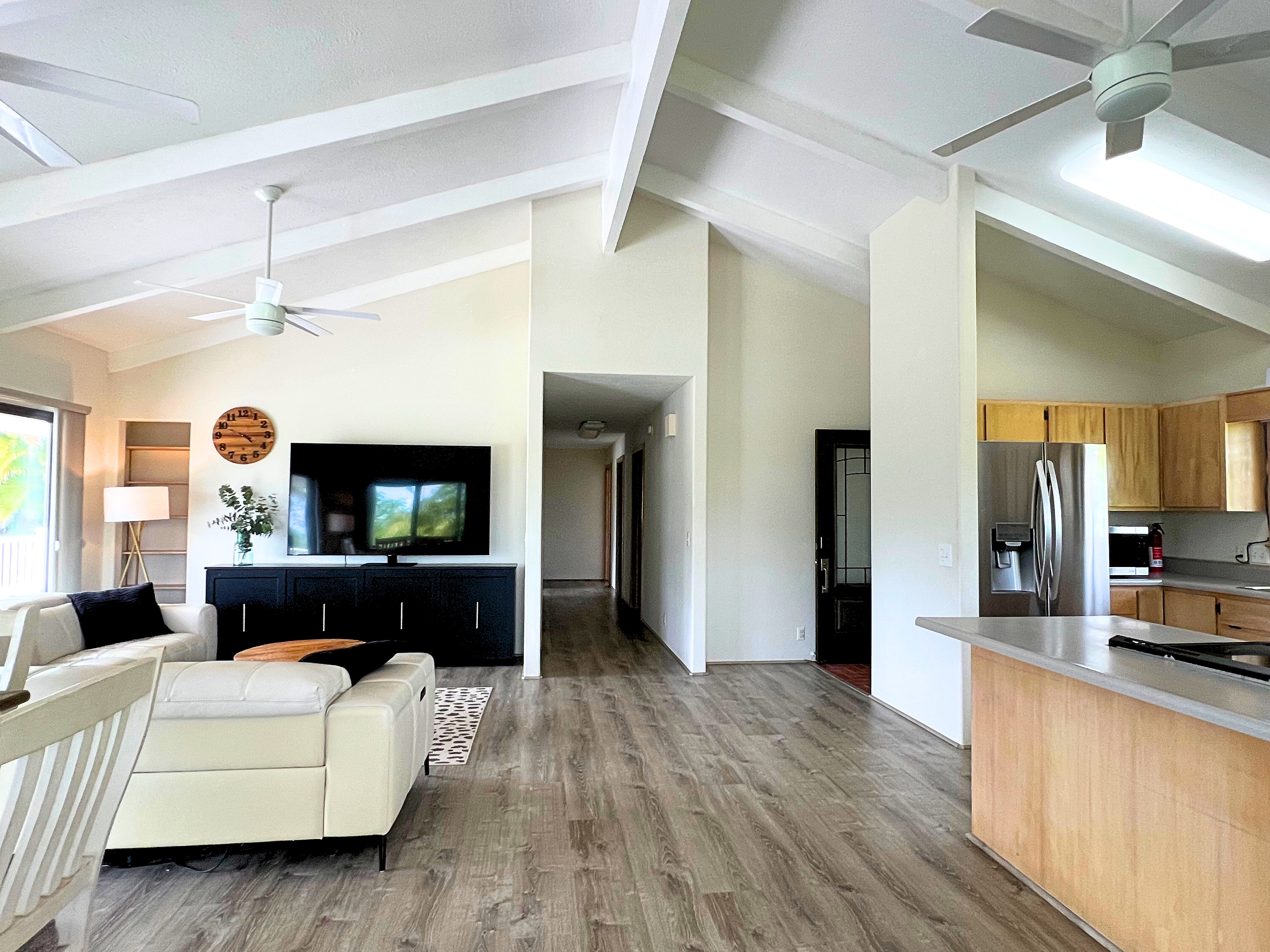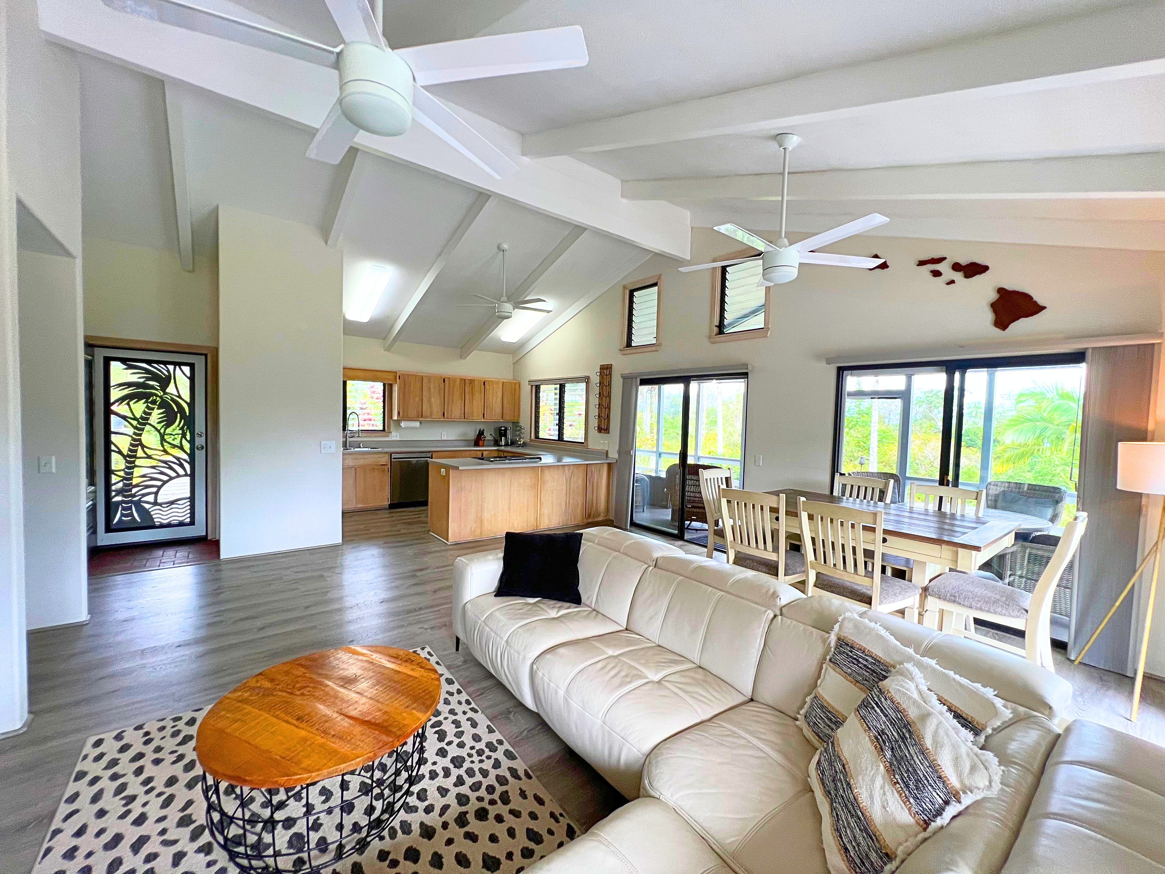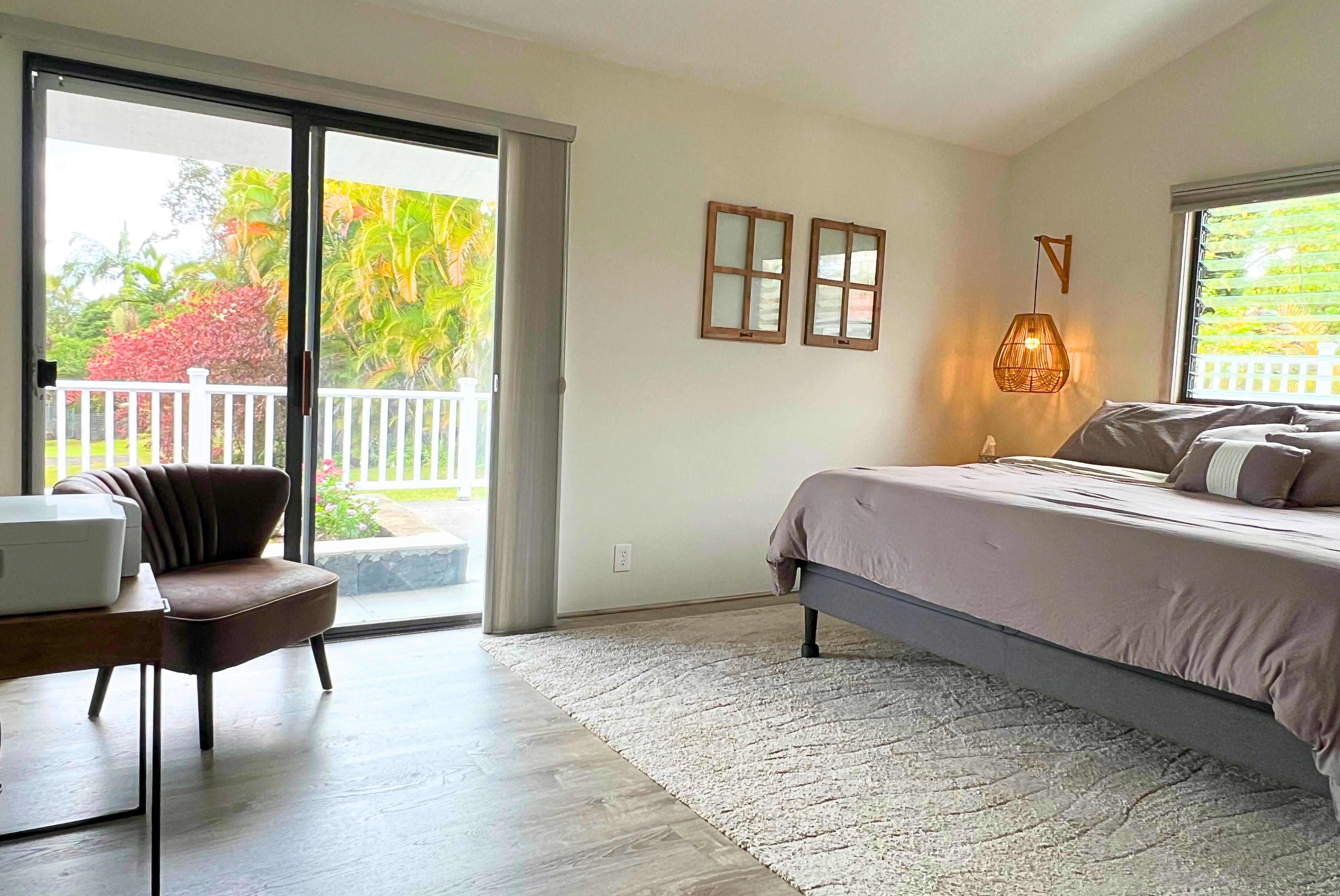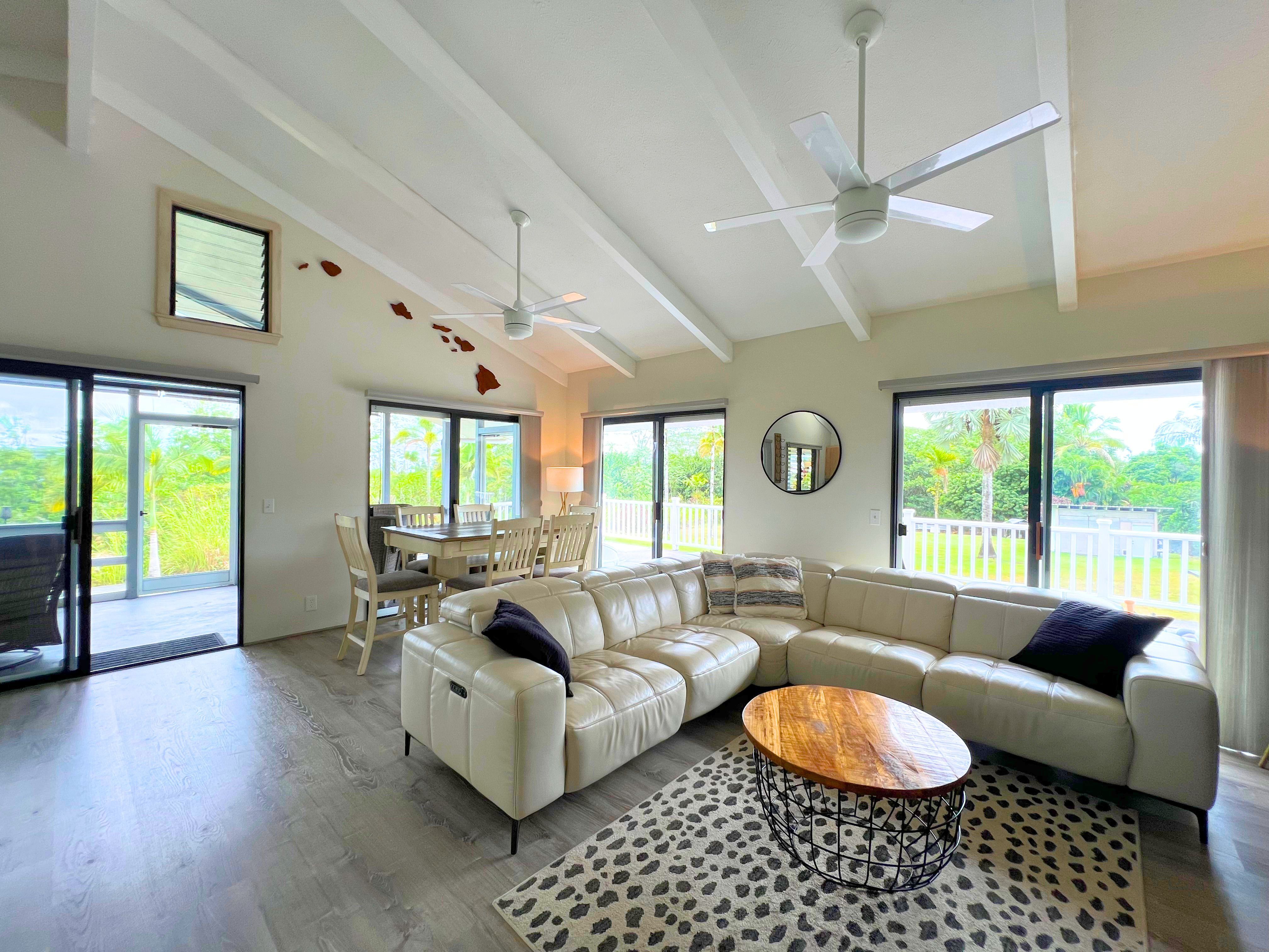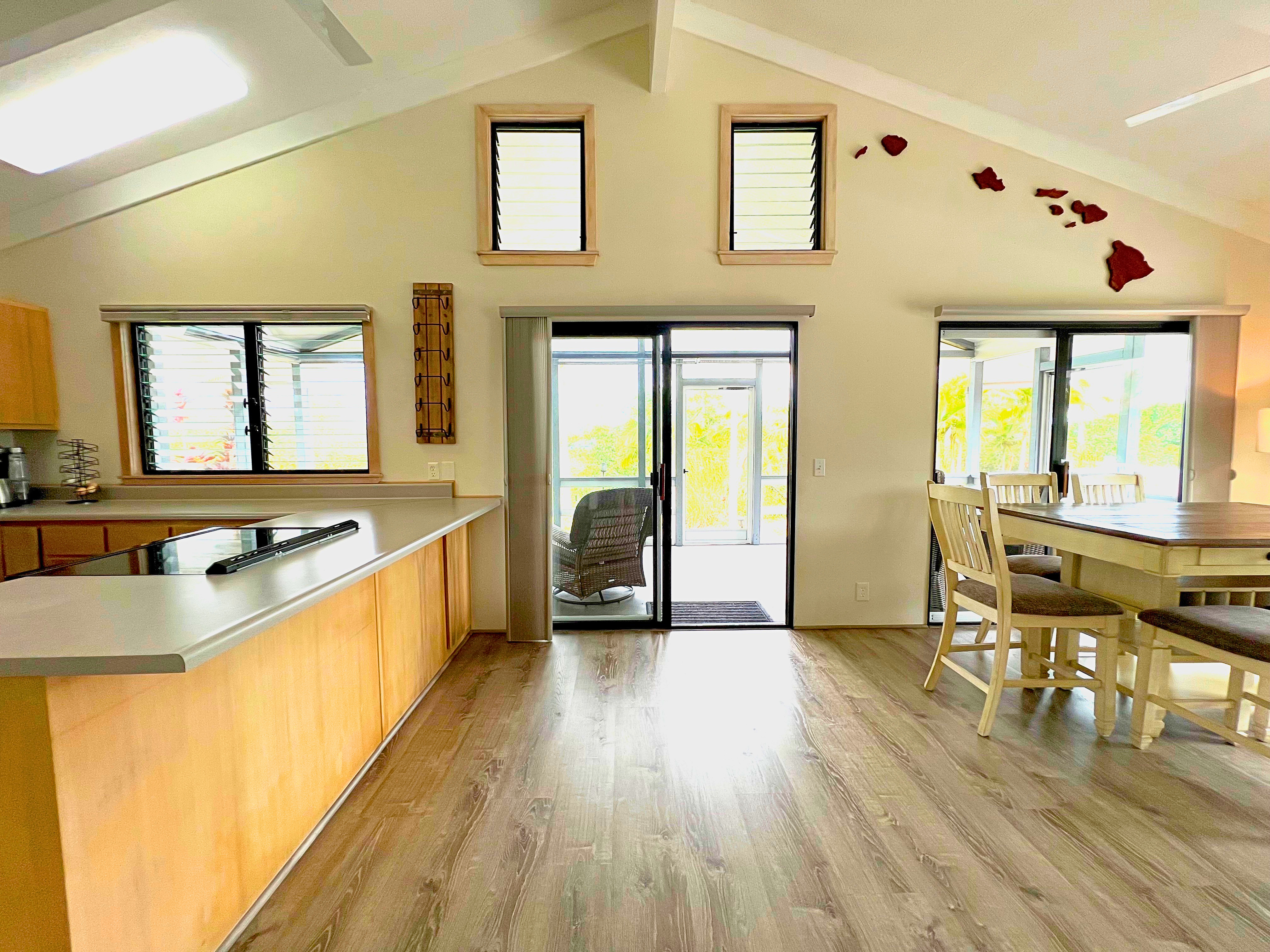 Beautifully upgraded 3-bedroom, 2.5-bath home situated on a full acre in Hawaiian Paradise Park. This well-maintained single-level property offers 1,384 square feet of living space and combines modern updates with peaceful island living. Recent 2023 upgrades include a new SunRun solar system (leased), a brand-new roof, an 80-gallon hybrid hot water heater, and a fully screened-in lanai–perfect for relaxing or entertaining while enjoying garden and mountain views. The open-concept floor plan features vaulted ceilings, abundant natural light, and sliding glass doors that open to a spacious, partially wraparound lanai. The remodeled kitchen is equipped with LG stainless steel appliances, a large peninsula with bar seating, and generous cabinetry. Durable life-proof flooring, wood trim accents, and built-in shelving add both charm and function throughout the home. Wide doorways and hallways provide wheelchair accessibility. The attached two-car garage includes a half bath, a utility sink, a storage room, and an air compressor, making it ideal for a home workshop. Additional improvements include new lighting, faucets, sinks, door hardware, window coverings, and a new front entrance door. A fully fenced dog run and attractively landscaped yard with decorative lava rock walls and walkways add both privacy and curb appeal. Water is supplied by a 10,000-gallon enclosed catchment tank paired with an Uncle Tilo’s UV filtration system and pump. The home is serviced by electricity, phone, cable, and a cesspool system. Zoned A-1A and sold fee simple. Partially furnished and move-in ready. Pre-home inspection available upon request. Seller is offering a $10,000 credit with full-price offer. Located just a short drive from Hilo, Pahoa, beaches, shopping, and the airport, this home offers the perfect blend of privacy and convenience in one of East Hawai‘i’s most desirable communities.