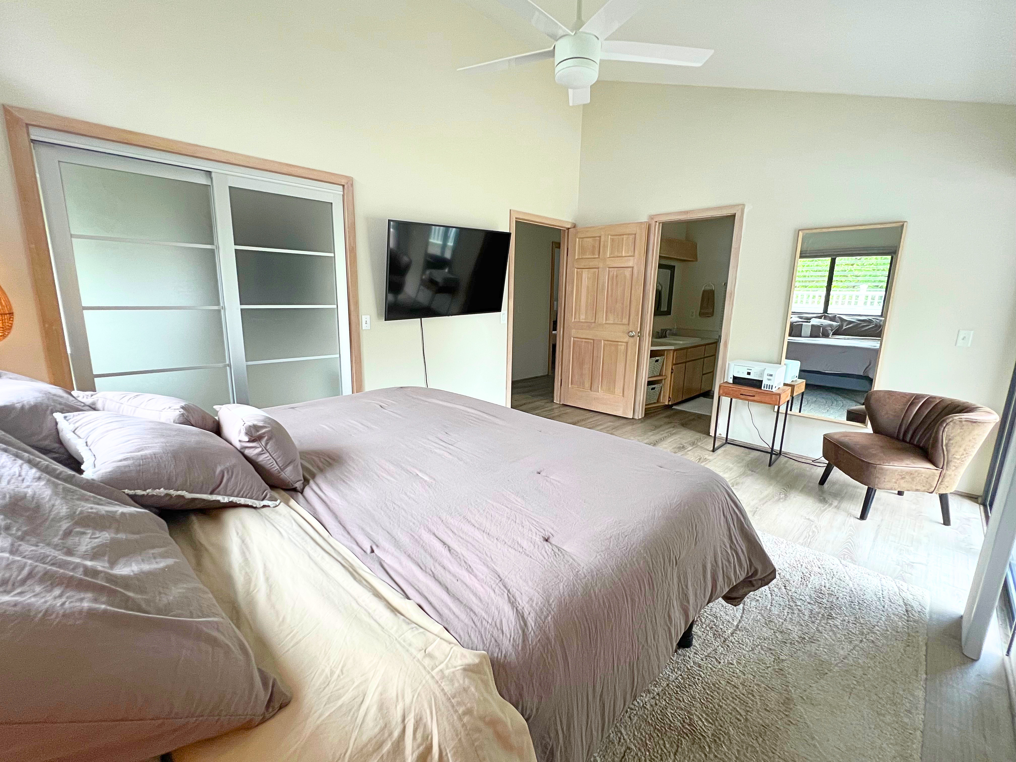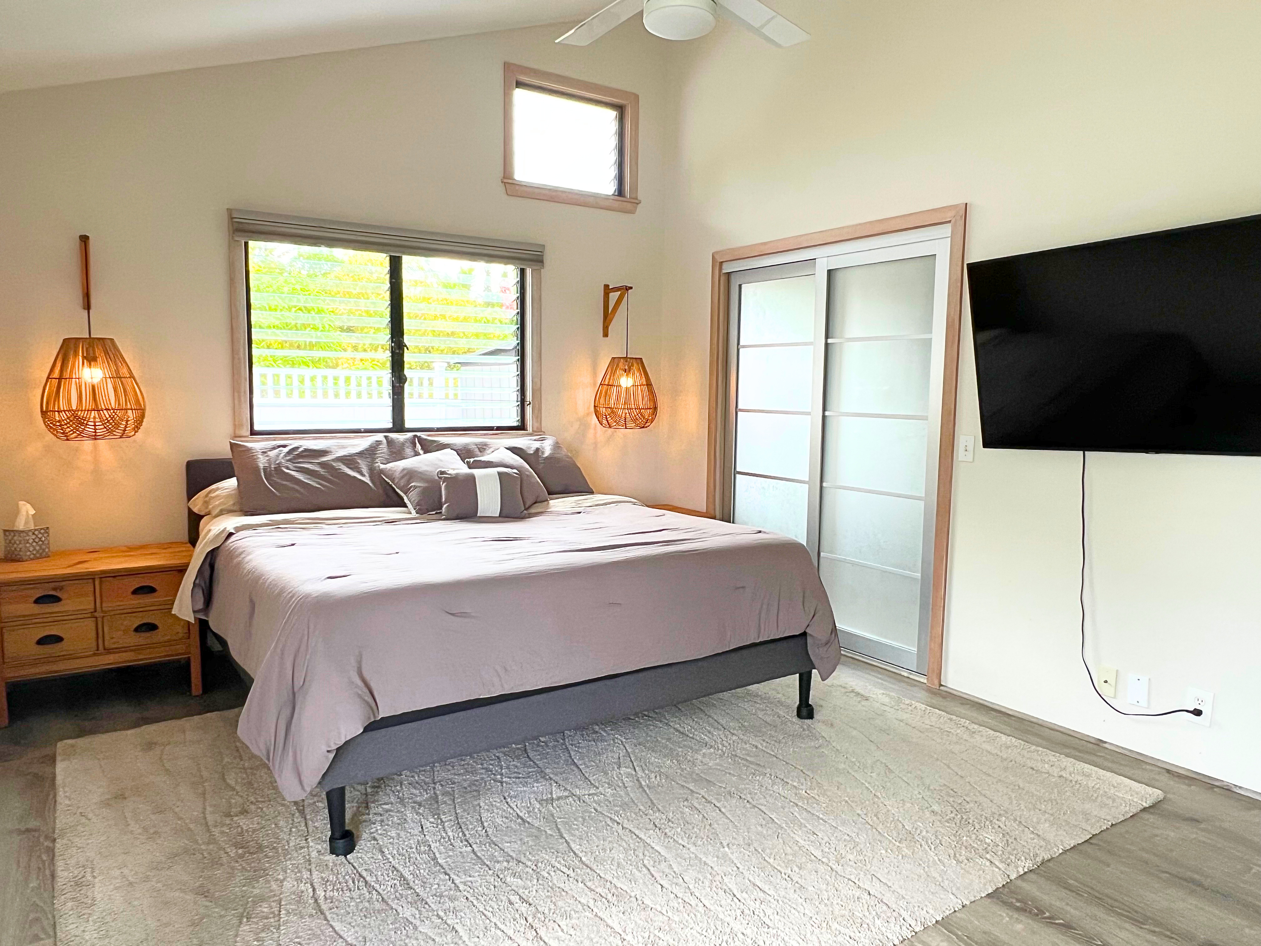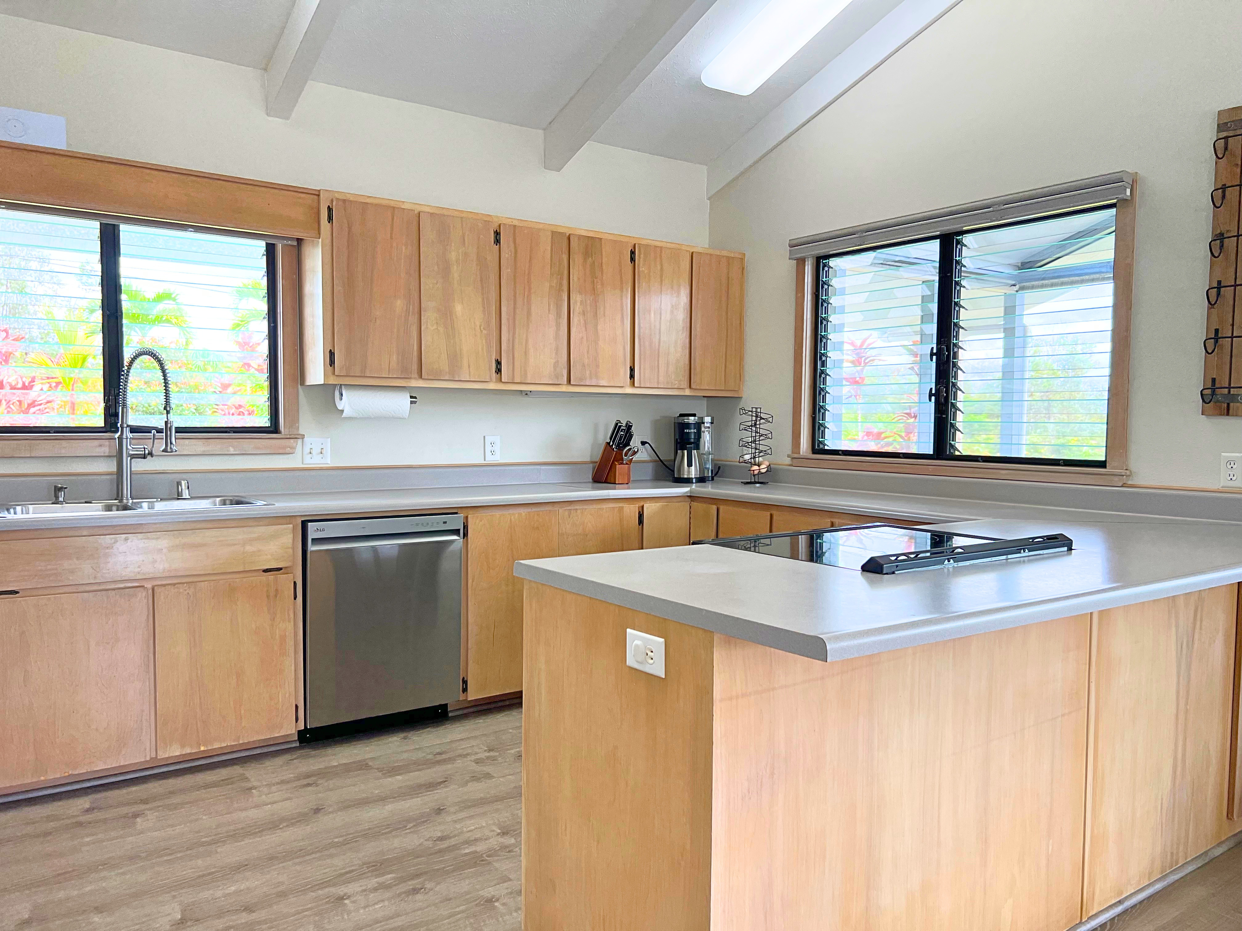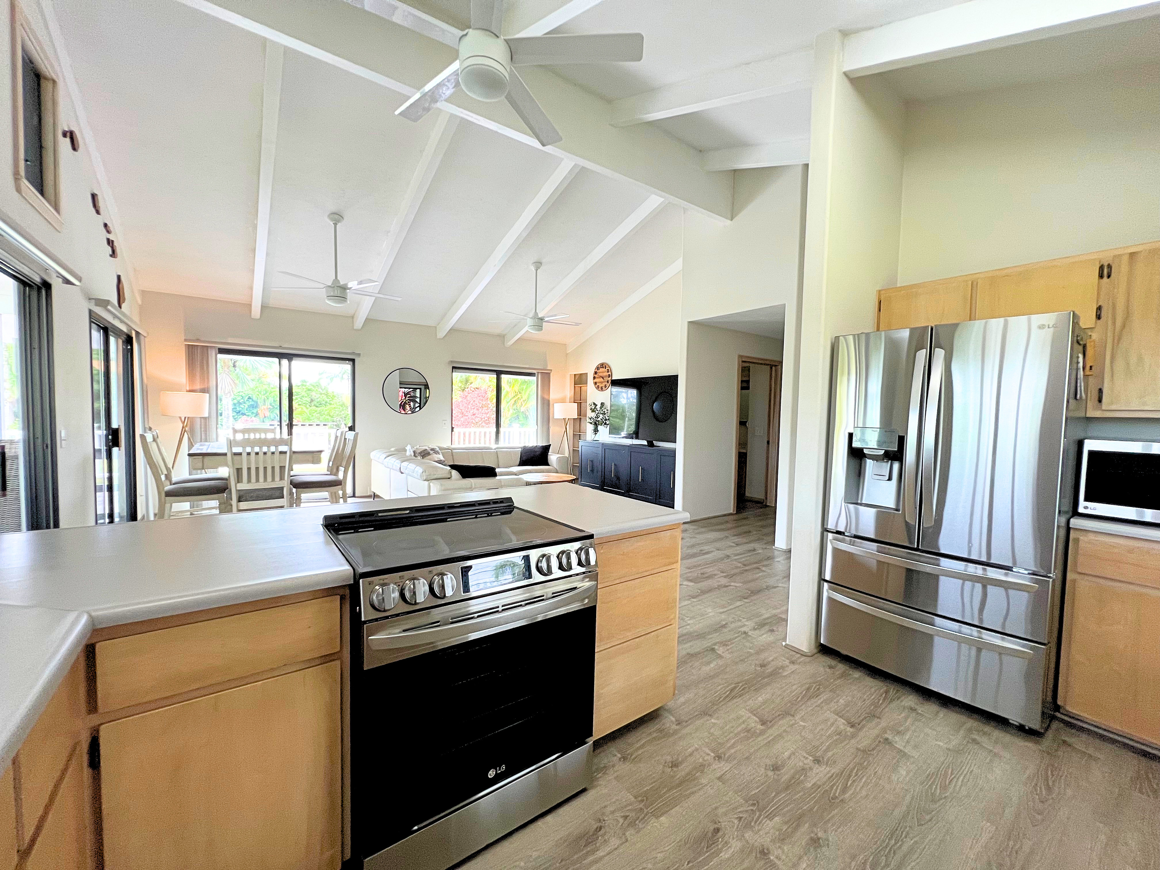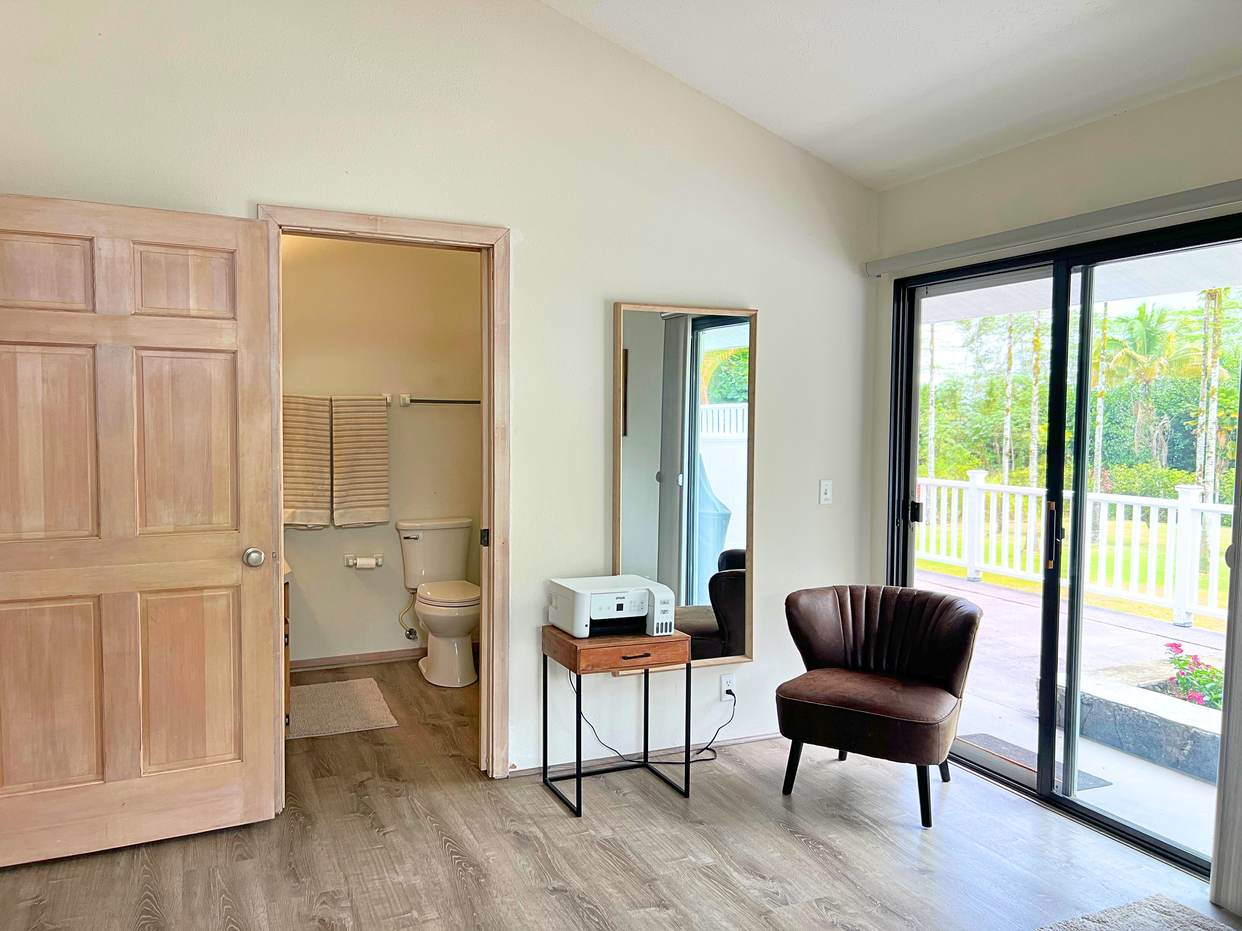 Beautifully upgraded 3-bedroom, 2.5-bath home situated on a full acre in Hawaiian Paradise Park. This well-maintained single-level property offers 1,384 square feet of living space and combines modern updates with peaceful island living. Recent 2023 upgrades include a new SunRun solar system (leased), a brand-new roof, an 80-gallon hybrid hot water heater, and a fully screened-in lanai–perfect for relaxing or entertaining while enjoying garden and mountain views. The open-concept floor plan features vaulted ceilings, abundant natural light, and sliding glass doors that open to a spacious, partially wraparound lanai. The remodeled kitchen is equipped with LG stainless steel appliances, a large peninsula with bar seating, and generous cabinetry. Durable life-proof flooring, wood trim accents, and built-in shelving add both charm and function throughout the home. Wide doorways and hallways provide wheelchair accessibility. The attached two-car garage includes a half bath, a utility sink, a storage room, and an air compressor, making it ideal for a home workshop. Additional improvements include new lighting, faucets, sinks, door hardware, window coverings, and a new front entrance door. A fully fenced dog run and attractively landscaped yard with decorative lava rock walls and walkways add both privacy and curb appeal. Water is supplied by a 10,000-gallon enclosed catchment tank paired with an Uncle Tilo’s UV filtration system and pump. The home is serviced by electricity, phone, cable, and a cesspool system. Zoned A-1A and sold fee simple. Partially furnished and move-in ready. Pre-home inspection available upon request. Seller is offering a $10,000 credit with full-price offer. Located just a short drive from Hilo, Pahoa, beaches, shopping, and the airport, this home offers the perfect blend of privacy and convenience in one of East Hawai‘i’s most desirable communities.