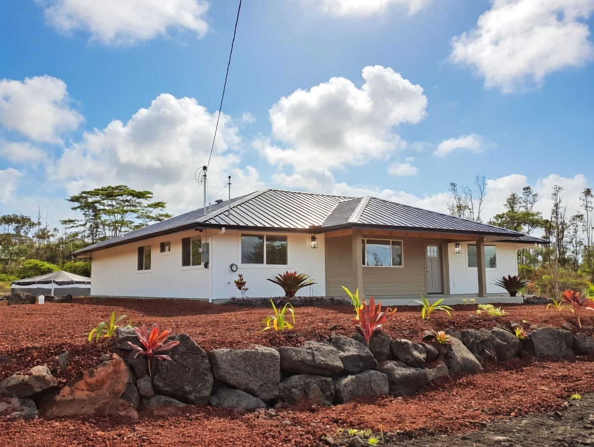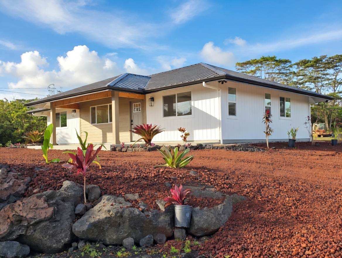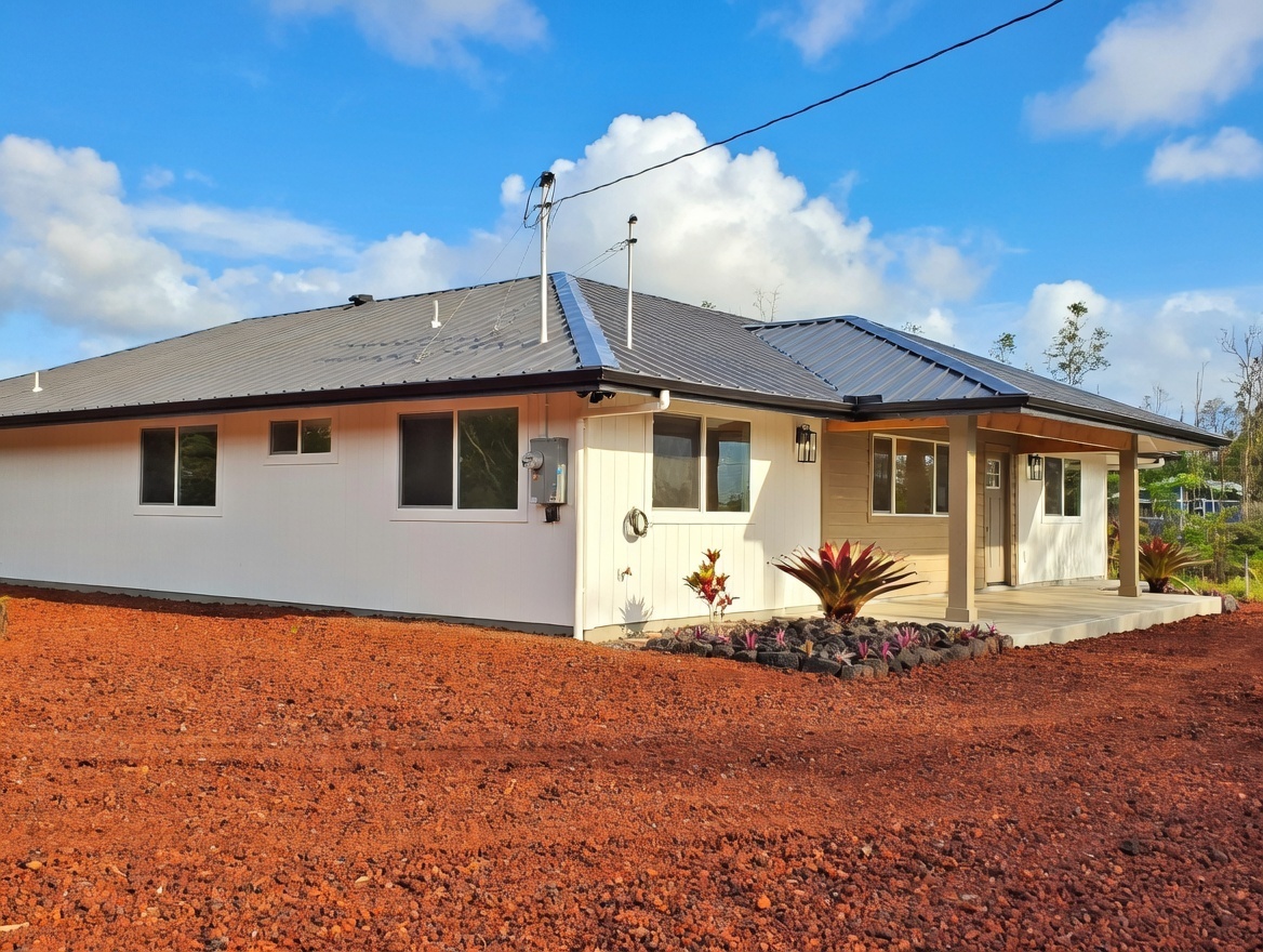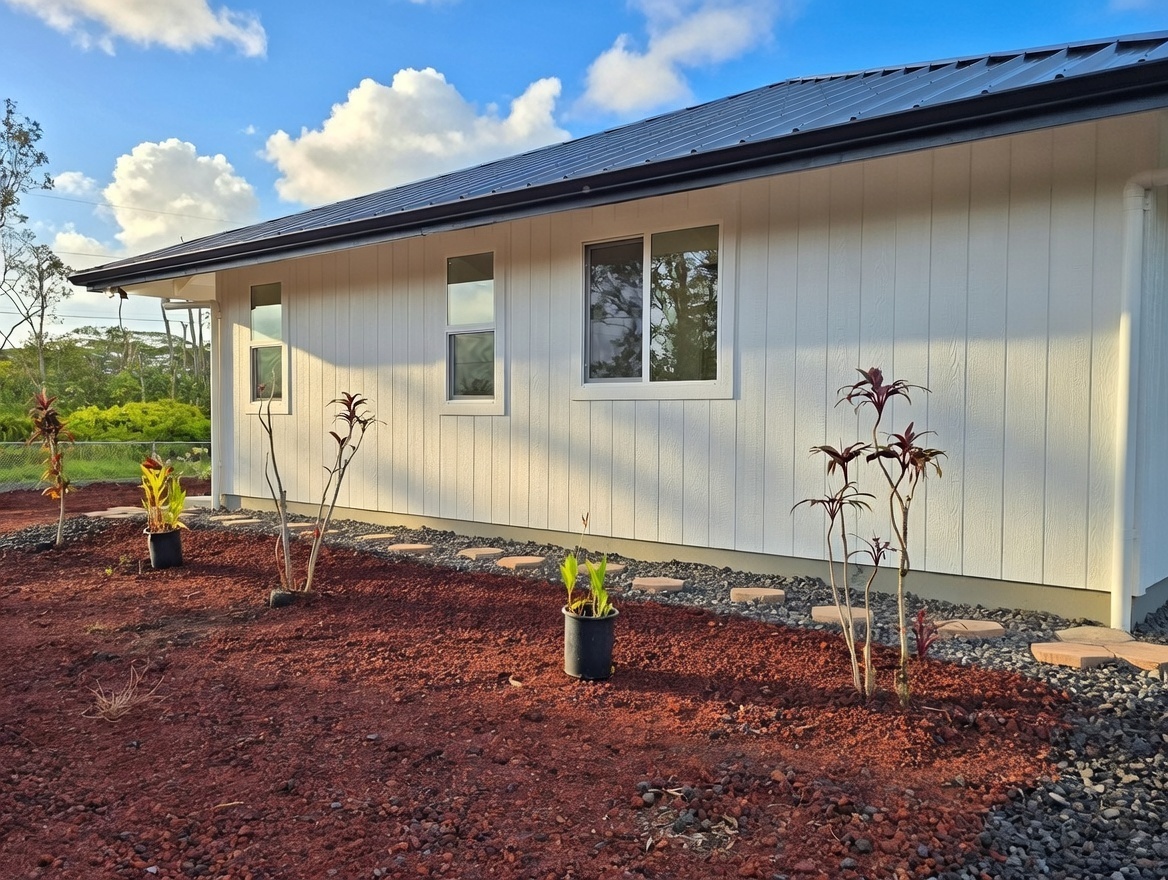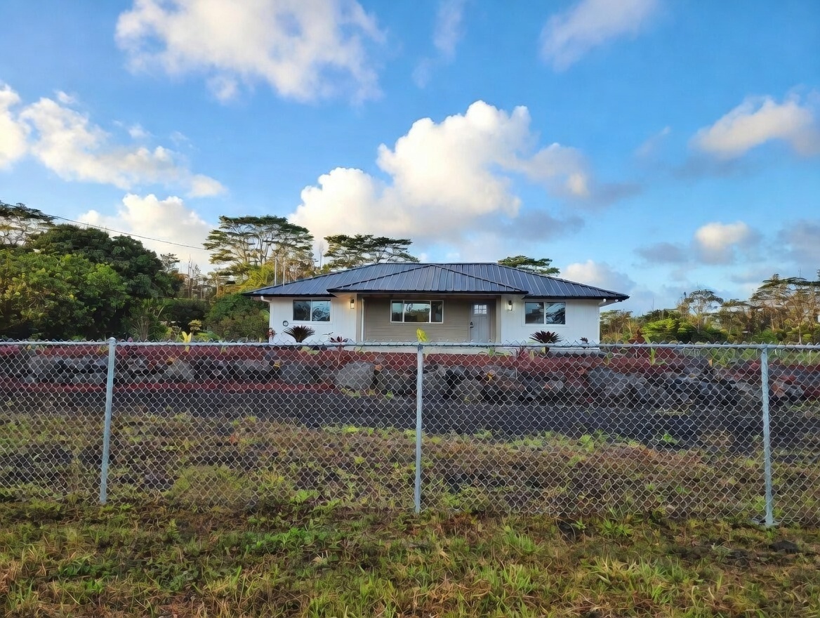 Discover this stunning new construction home in desirable Keaau, nestled within the popular Hawaiian Paradise Park subdivision. This modern 3-bedroom, 2-bath residence boasts an expansive open floor plan that seamlessly blends living, dining, and kitchen areas–perfect for relaxed island living and entertaining. Premium features include elegant lighting fixtures, stylish wall accents, ceiling fans throughout, and a chic fireplace for added ambiance. The heart of the home is the beautiful kitchen, highlighted by a large central island with integrated sink and dishwasher, plus all-new stainless steel appliances: refrigerator, range, microwave, and dishwasher. Pristine stone countertops flow throughout, complemented by gorgeous laminate flooring that beautifully mimics the look of real hardwood. The primary suite offers a generous walk-in closet and a luxurious bathroom featuring a sleek glass-enclosed shower and lighted vanity mirrors. Both bathrooms include lighted mirrors for added convenience and style. Additional highlights include a spacious carport ideal for vehicle parking or extra storage space, and a large, beautifully landscaped yard with ample room to plant a garden, add fruit trees, or create your own outdoor oasis. Located in a well-established community–this home provides the perfect blend of tranquility and accessibility. Enjoy a short drive to Hilo for schools, dining, shopping, a mall, and movie theater, or head the opposite direction to Pahoa for additional conveniences and local charm.