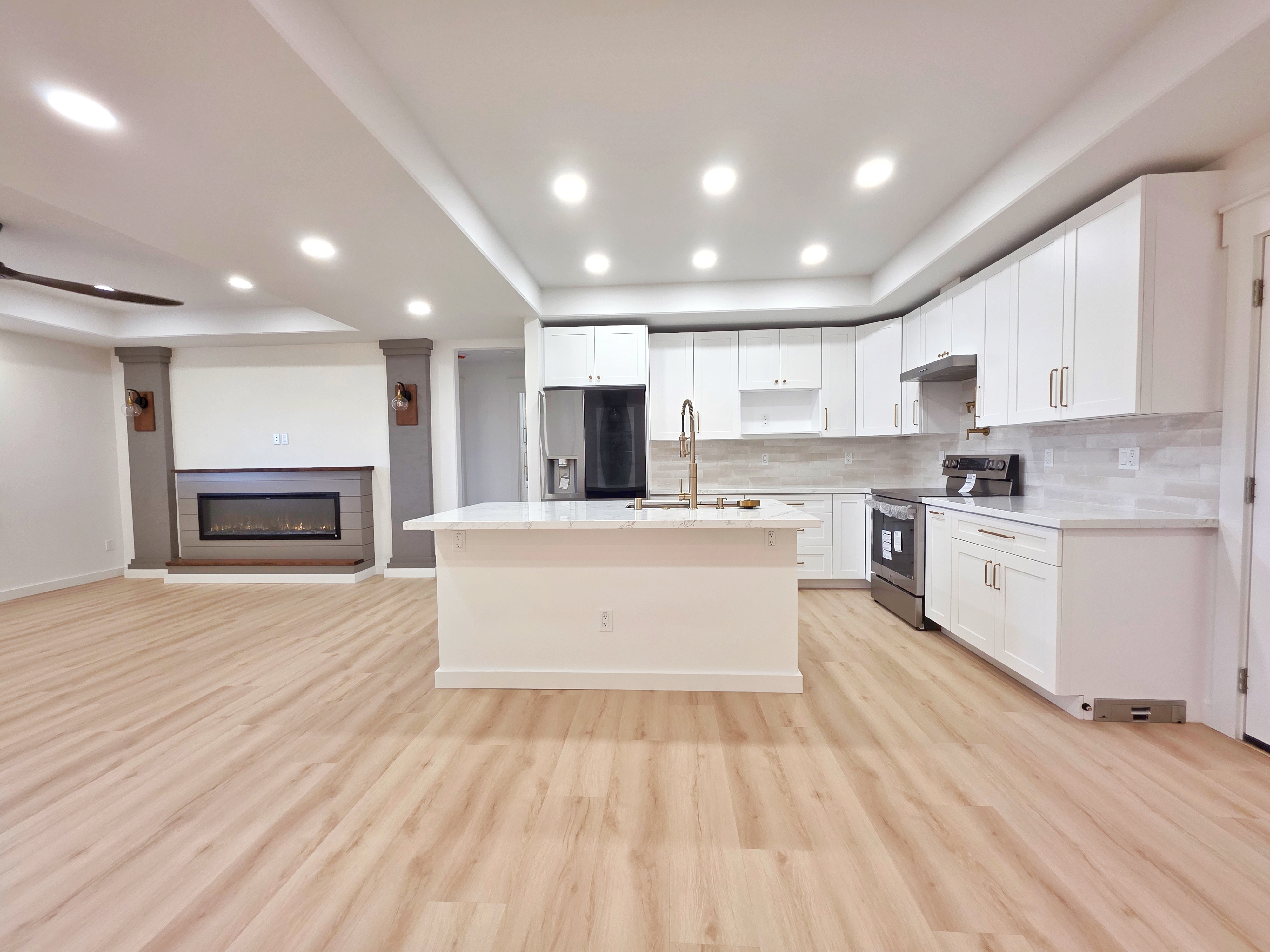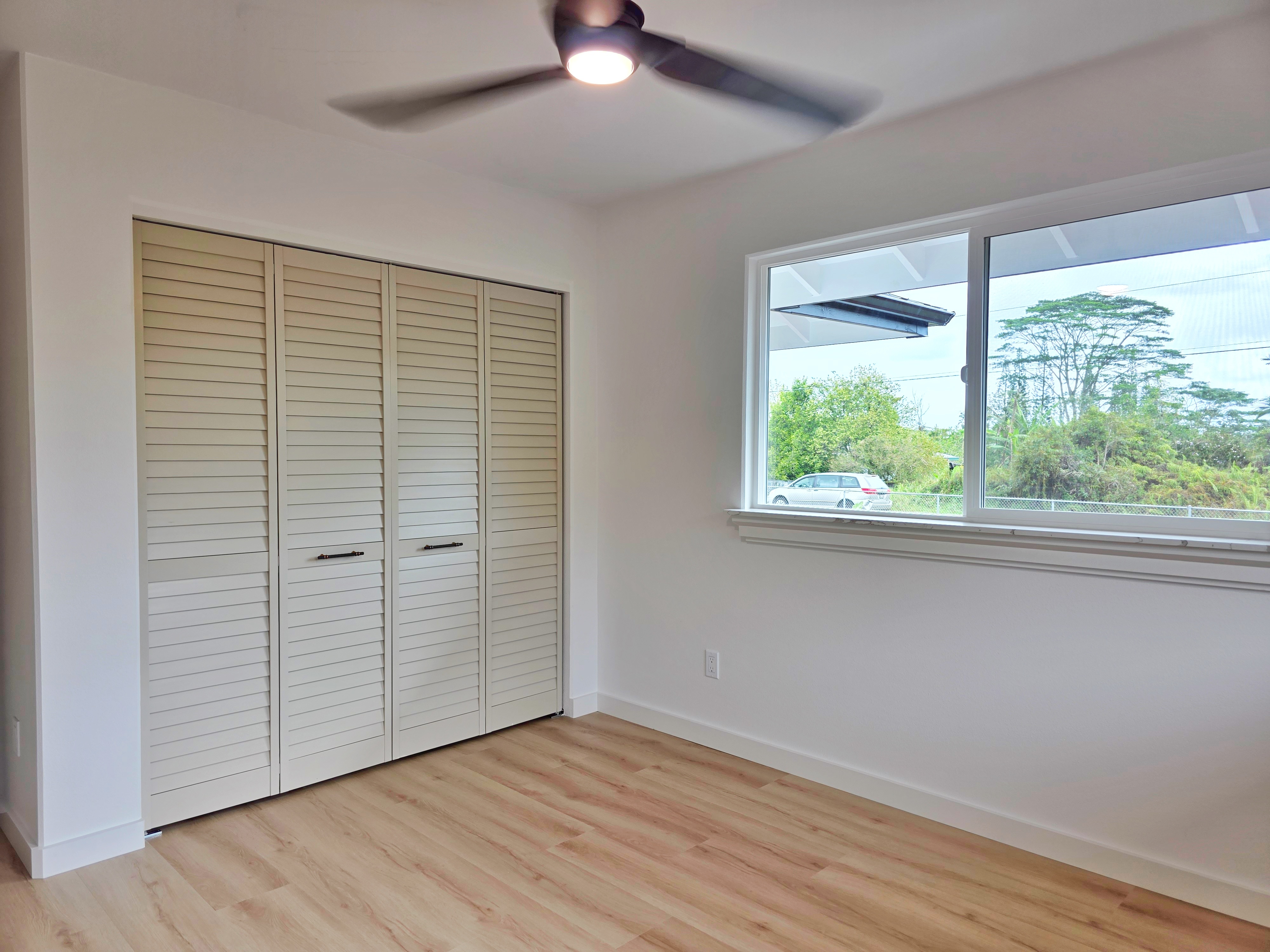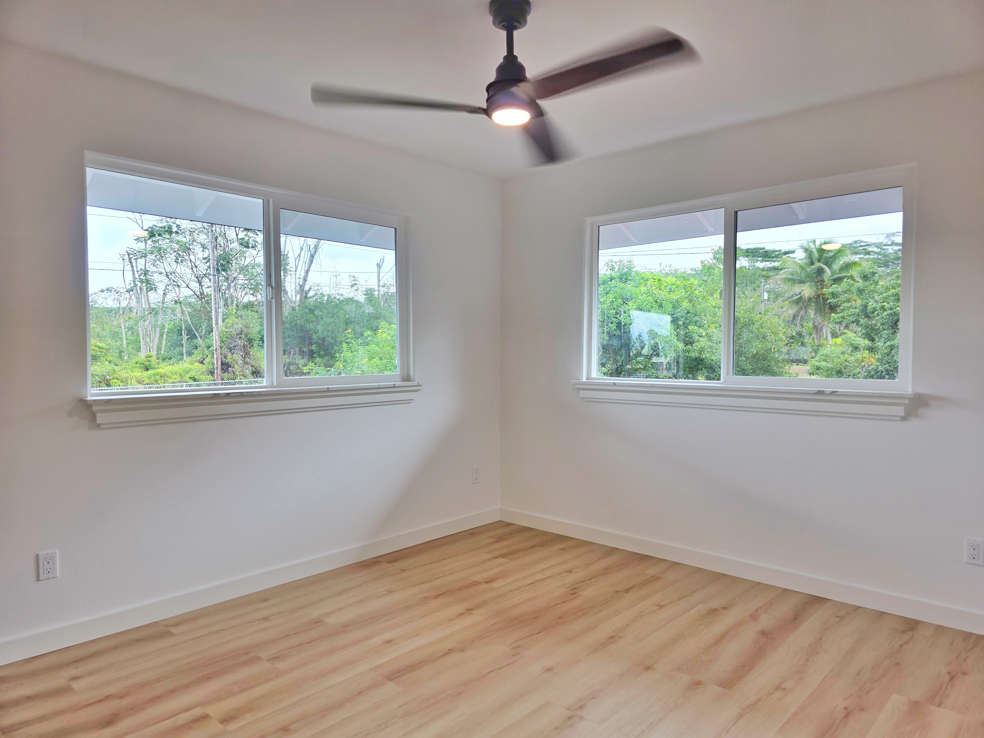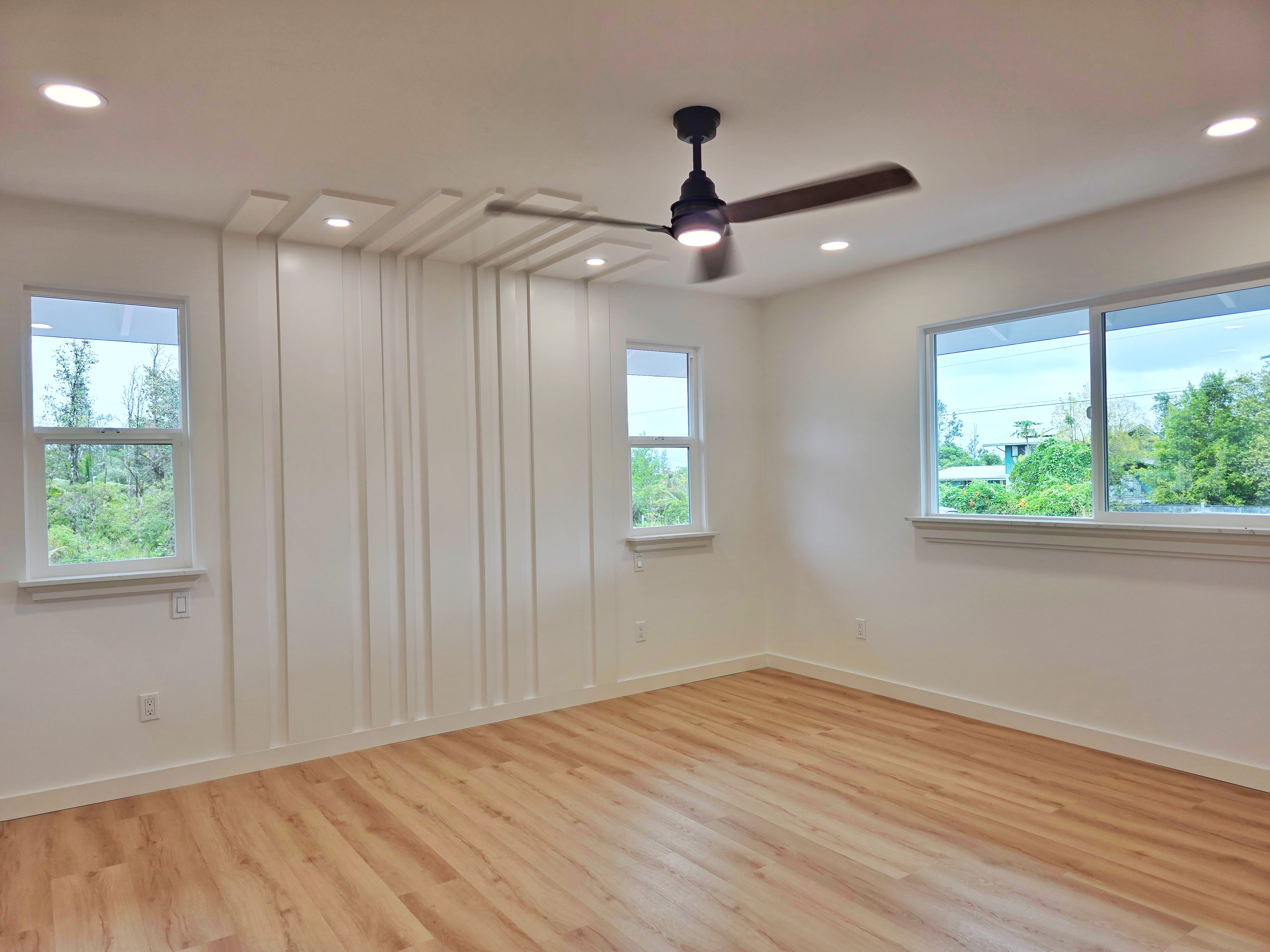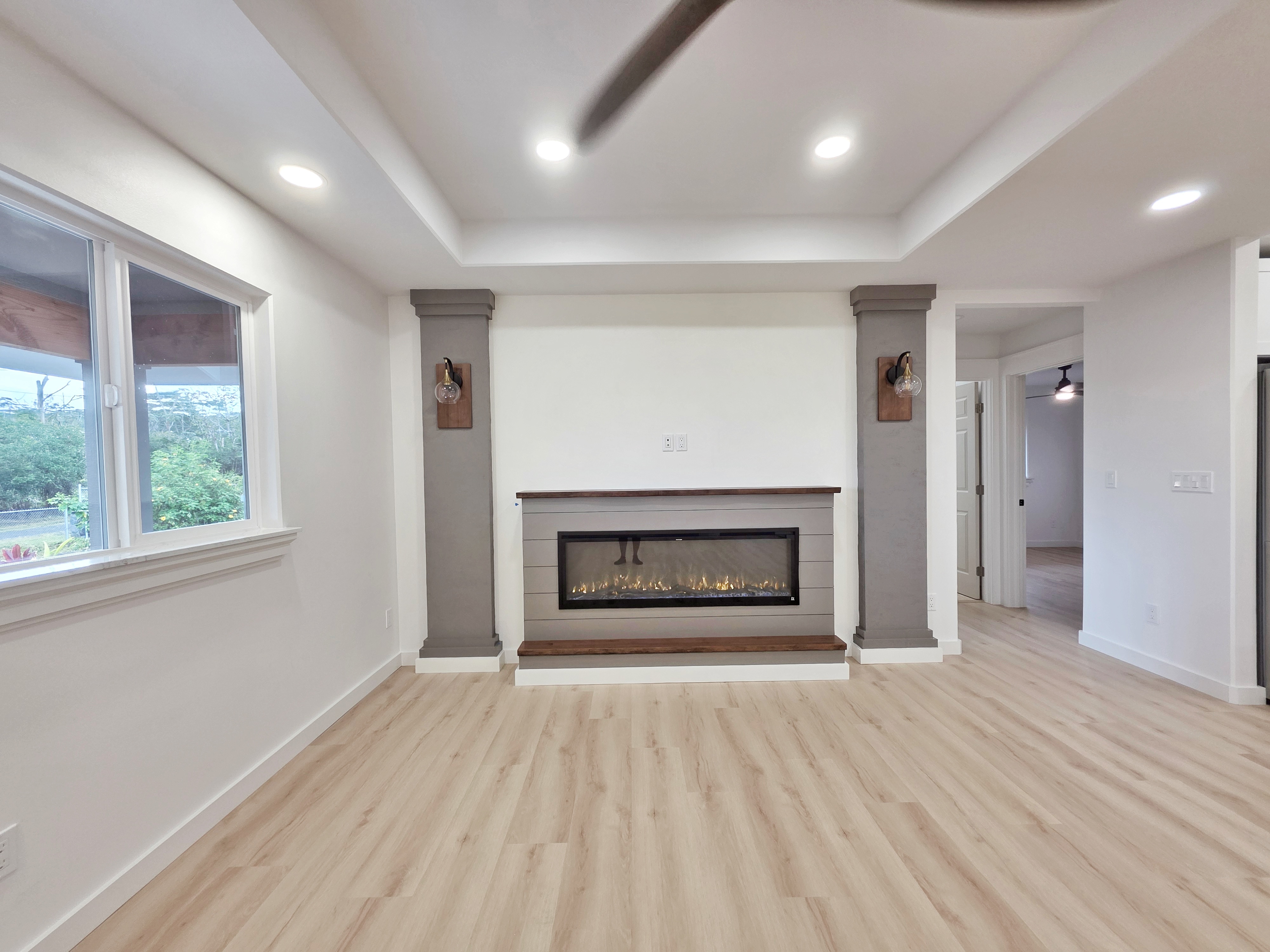 Discover this stunning new construction home in desirable Keaau, nestled within the popular Hawaiian Paradise Park subdivision. This modern 3-bedroom, 2-bath residence boasts an expansive open floor plan that seamlessly blends living, dining, and kitchen areas–perfect for relaxed island living and entertaining. Premium features include elegant lighting fixtures, stylish wall accents, ceiling fans throughout, and a chic fireplace for added ambiance. The heart of the home is the beautiful kitchen, highlighted by a large central island with integrated sink and dishwasher, plus all-new stainless steel appliances: refrigerator, range, microwave, and dishwasher. Pristine stone countertops flow throughout, complemented by gorgeous laminate flooring that beautifully mimics the look of real hardwood. The primary suite offers a generous walk-in closet and a luxurious bathroom featuring a sleek glass-enclosed shower and lighted vanity mirrors. Both bathrooms include lighted mirrors for added convenience and style. Additional highlights include a spacious carport ideal for vehicle parking or extra storage space, and a large, beautifully landscaped yard with ample room to plant a garden, add fruit trees, or create your own outdoor oasis. Located in a well-established community–this home provides the perfect blend of tranquility and accessibility. Enjoy a short drive to Hilo for schools, dining, shopping, a mall, and movie theater, or head the opposite direction to Pahoa for additional conveniences and local charm.