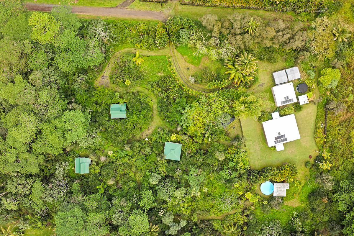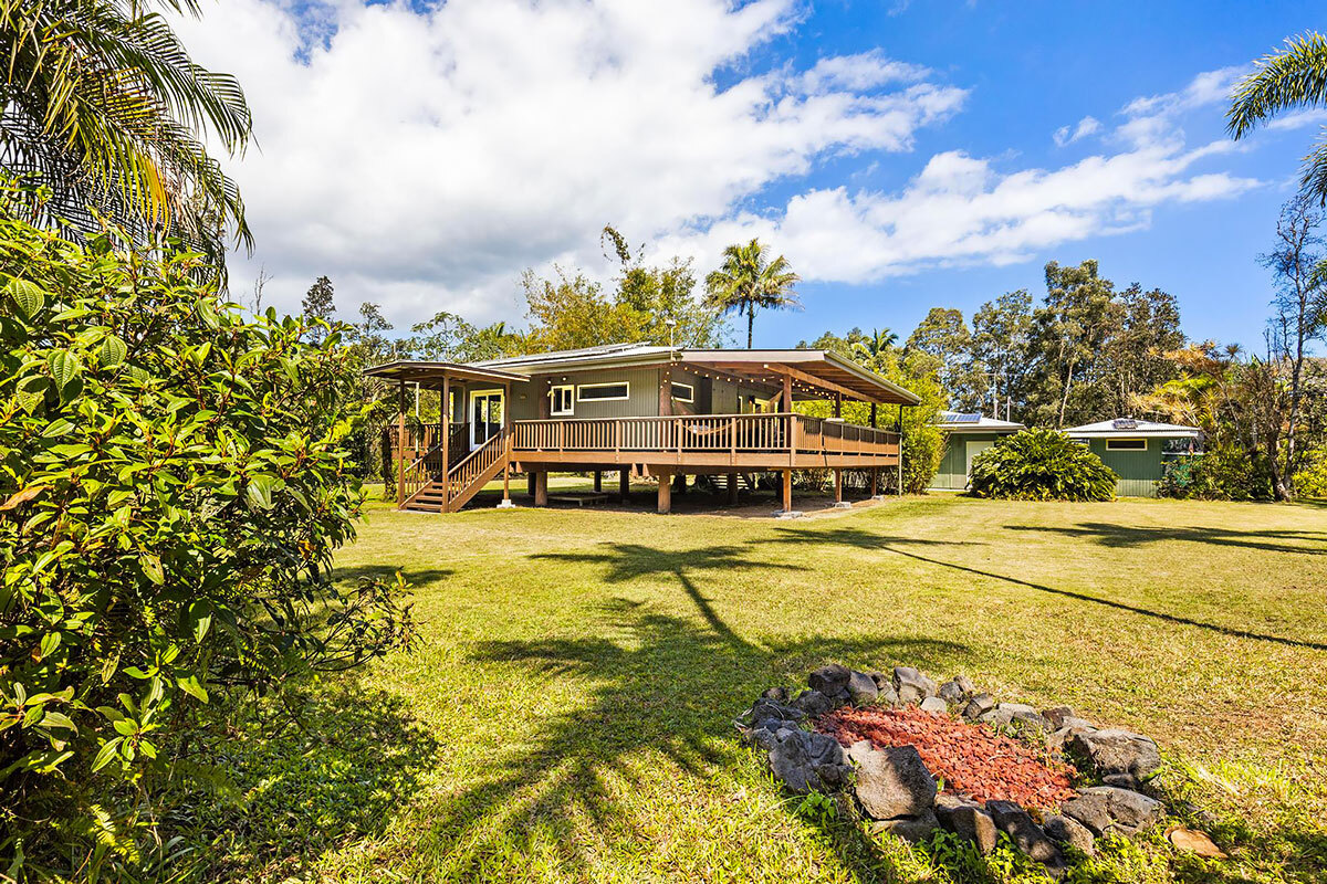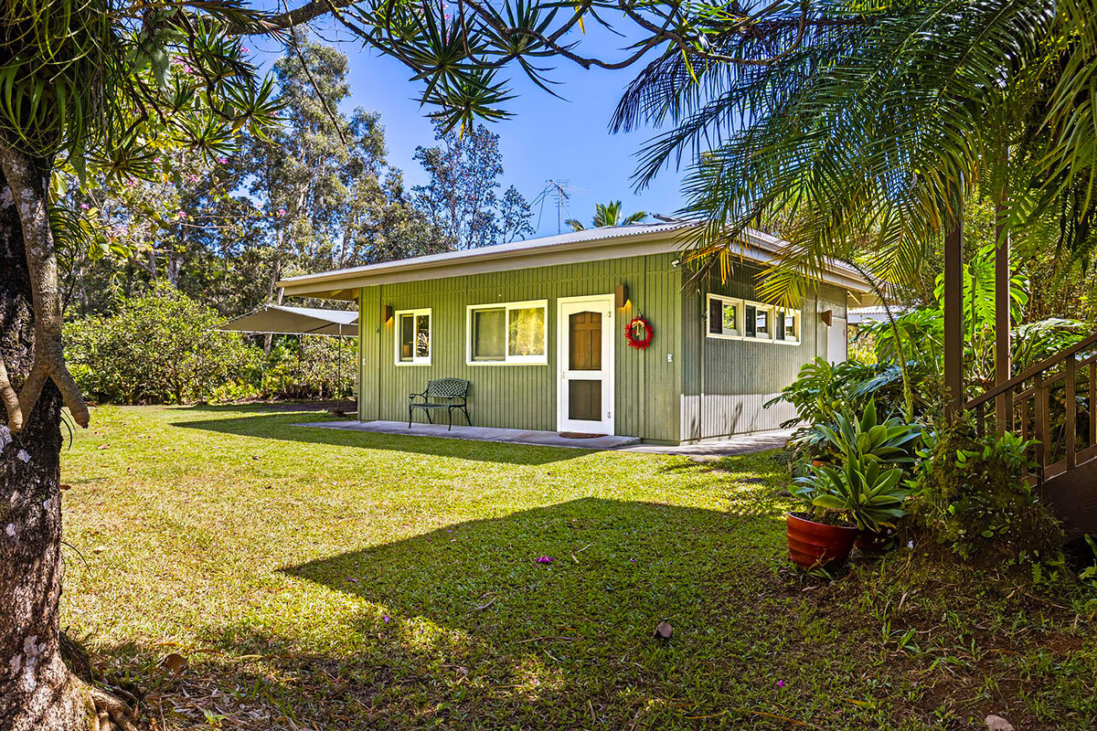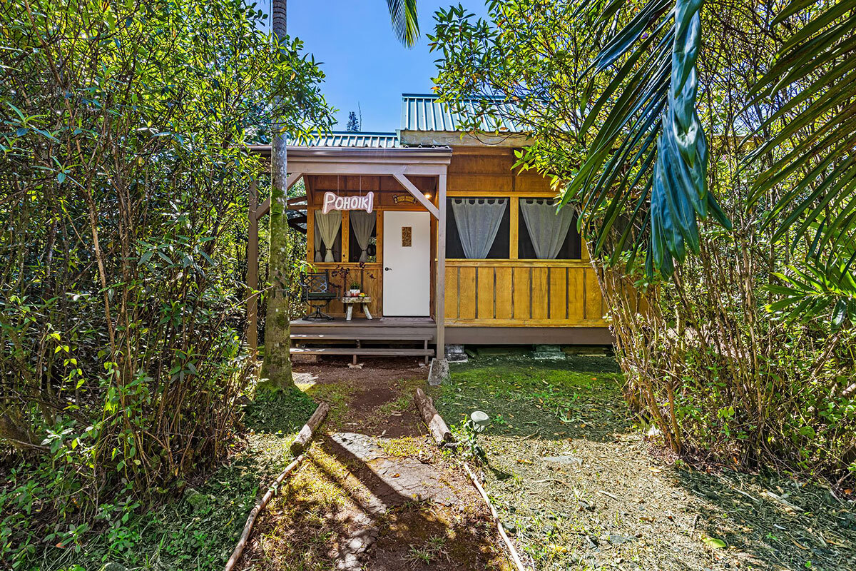 Experience serene island living on this exceptional 3-acre homestead comprised of 3 separate adjoining lots. Tucked away at the end of a quiet cul-de-sac the property is bordered by a Hawaiian rock wall & State land, offering privacy & a peaceful setting. The main acre features 2 distinct living spaces. The primary residence is a custom one-bedroom, one-bath post & pier house showcasing open-beam ceilings, white oak floors, mango wood countertops, wood-framed windows/sliding glass doors, & wrap-around lanai. There is also a charming ohana-style dwelling with half bath & outdoor shower. Originally designed as an office/workshop, it easily serves as guest accommodation. Completing this portion of the property is an above-ground pool with Trex decking, lush lawn, & an abundance of mature fruit trees including citrus, coconut, avocado, rambutan, lychee, starfruit, soursop, white pineapple & breadfruit. The additional 2 acres offer winding jungle walking paths leading to 2 beautifully crafted, standalone cabins with electricity & water. Each cabin provides privacy & features a front lanai, kitchenette, sleeping area, loft, outdoor bathroom & shower. Nearby, an outdoor kitchen creates an inviting space to relax & entertain while enjoying the natural surroundings. Ornamental landscaping & additional fruit trees are found throughout this area. Additional highlights: Granite counter tops, custom wood details Pond with rock wall accents Owned net-metered 5.57 kW grid-tied solar system 10,000-gallon catchment tank supplying all structures, with filtration Located in the sunbelt region of HPP, 9 blocks from the ocean Smoke house The Pacific coastline is just a short drive away, where you can enjoy Hawaiian sunrises, seasonal whale watching, & cooling trade winds. Shopping/amenities & airport are within a 15—30 minute drive. A truly one-of-a-kind property–ideal for an extended family, business venture, or a unique rental opportunity.