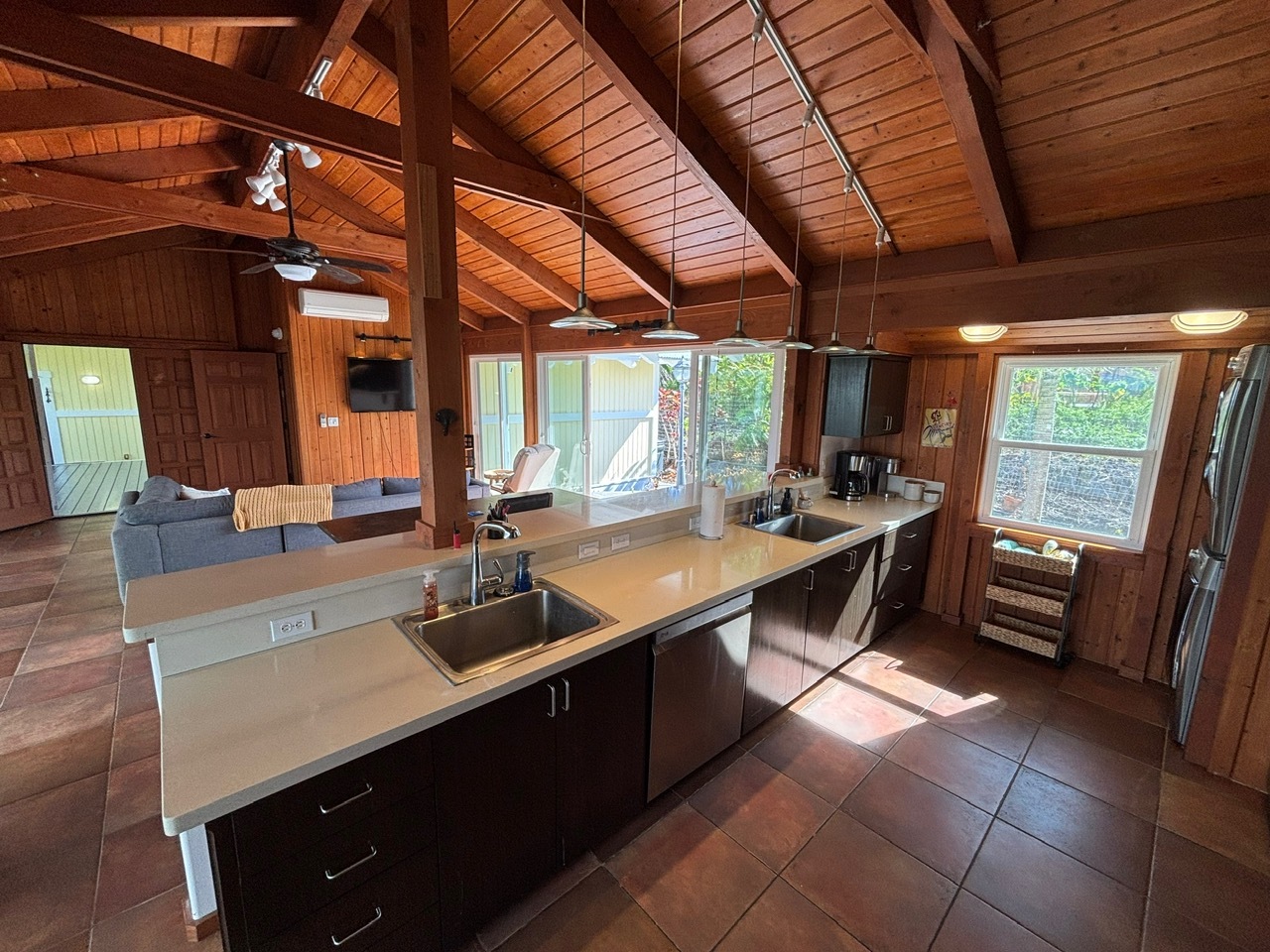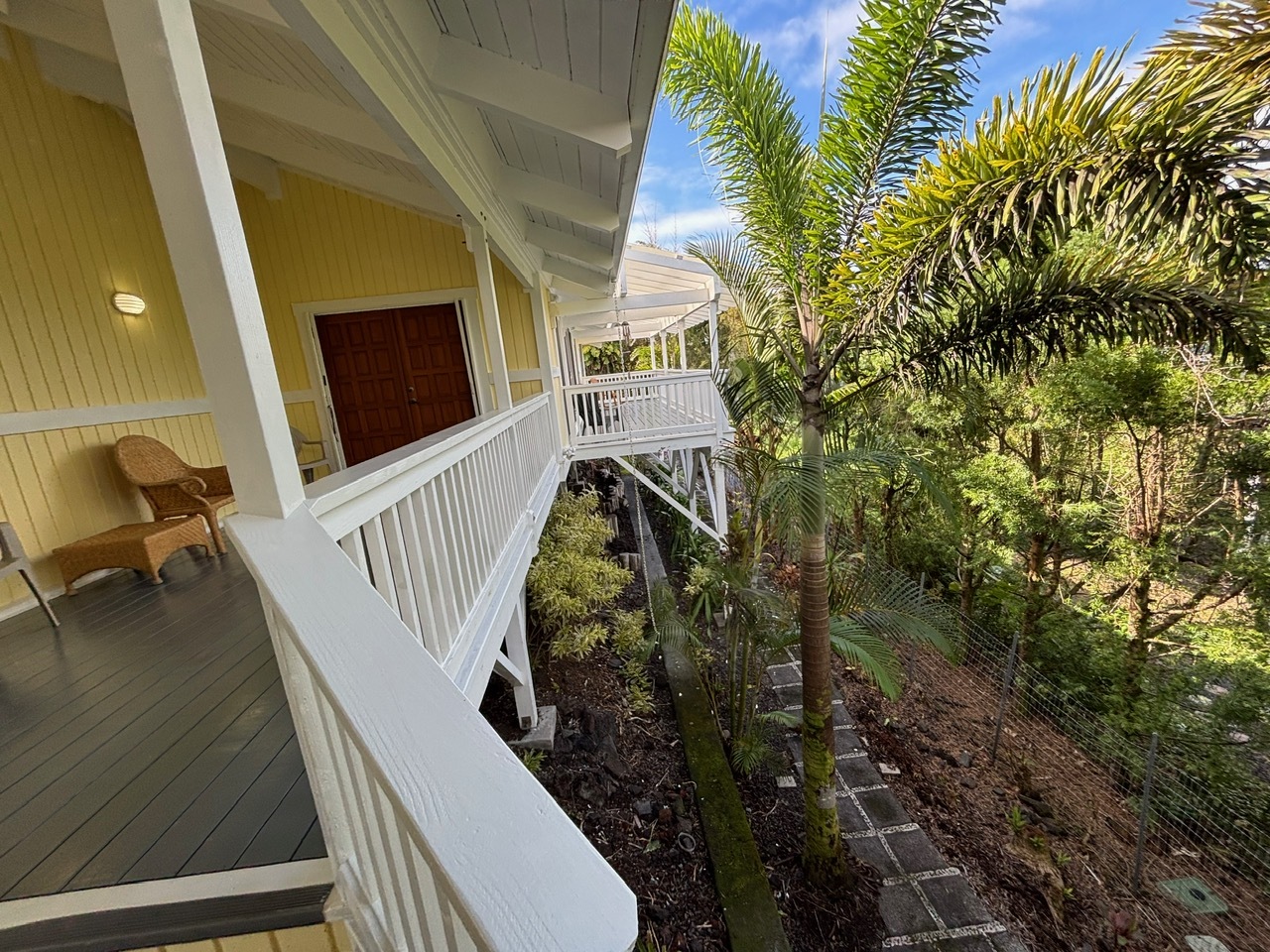 Escape to this one-of-a-kind custom home in the heart of the Hawaiian Shores neighborhood. This stunning residence captivates with breathtaking ocean views from every room, where the sound of the waves will lull you to sleep. Exquisite attention to detail is showcased from the gorgeous vaulted ceilings to the elegant lampposts that illuminate the stone pathway as it winds around the home. This two-bedroom, two-bath retreat includes a separate Ohana that looks and feels like a treehouse Robinson Crusoe would have been proud of. The modern kitchen blends style and functionality, and the home is offered fully furnished, including most garage tools. Tradewinds provide the perfect breeze to keep the home cool and although there is AC in every room it was rarely needed. Solar panels on the roof that are paid for make electricity a nominal cost. As part of Hawaiian Shores Association, residents enjoy exclusive access to a community pool, scenic parks, and lively weekly community events, fostering a true sense of island connection. Embrace the ultimate Puna coast lifestyle in this coastal gem! All comments, data is provided by seller or seller's representatives. Buyer to confirm all & hold all parties harmless from any discrepancy data in the mls and advertising. Limited Service—Data Entry Addendum signed by seller/s must be signed by buyer/s with Purchase Contract.
