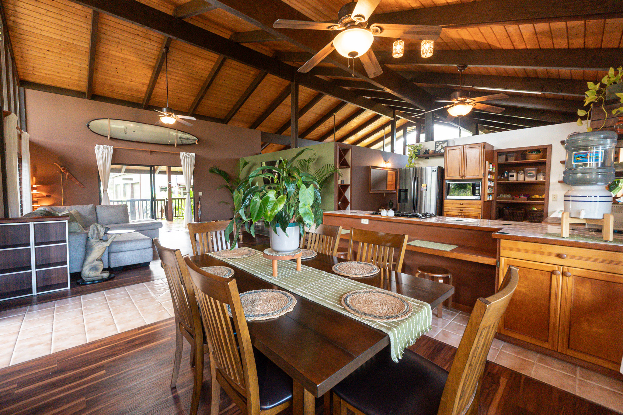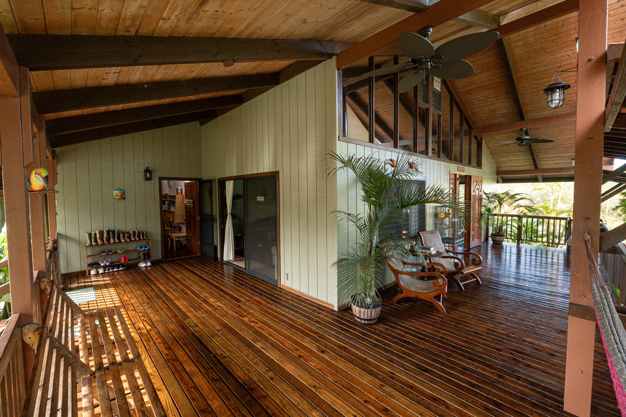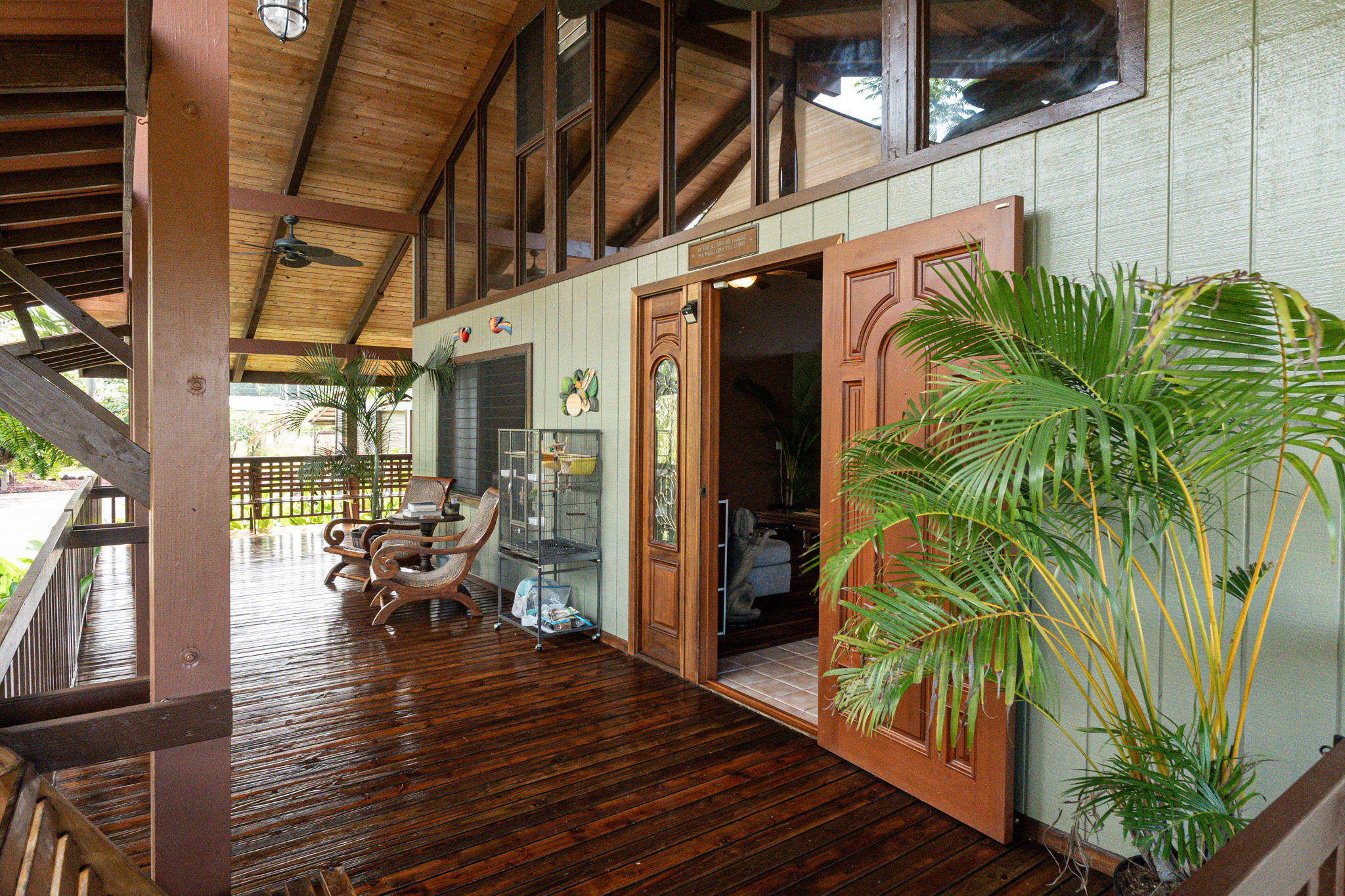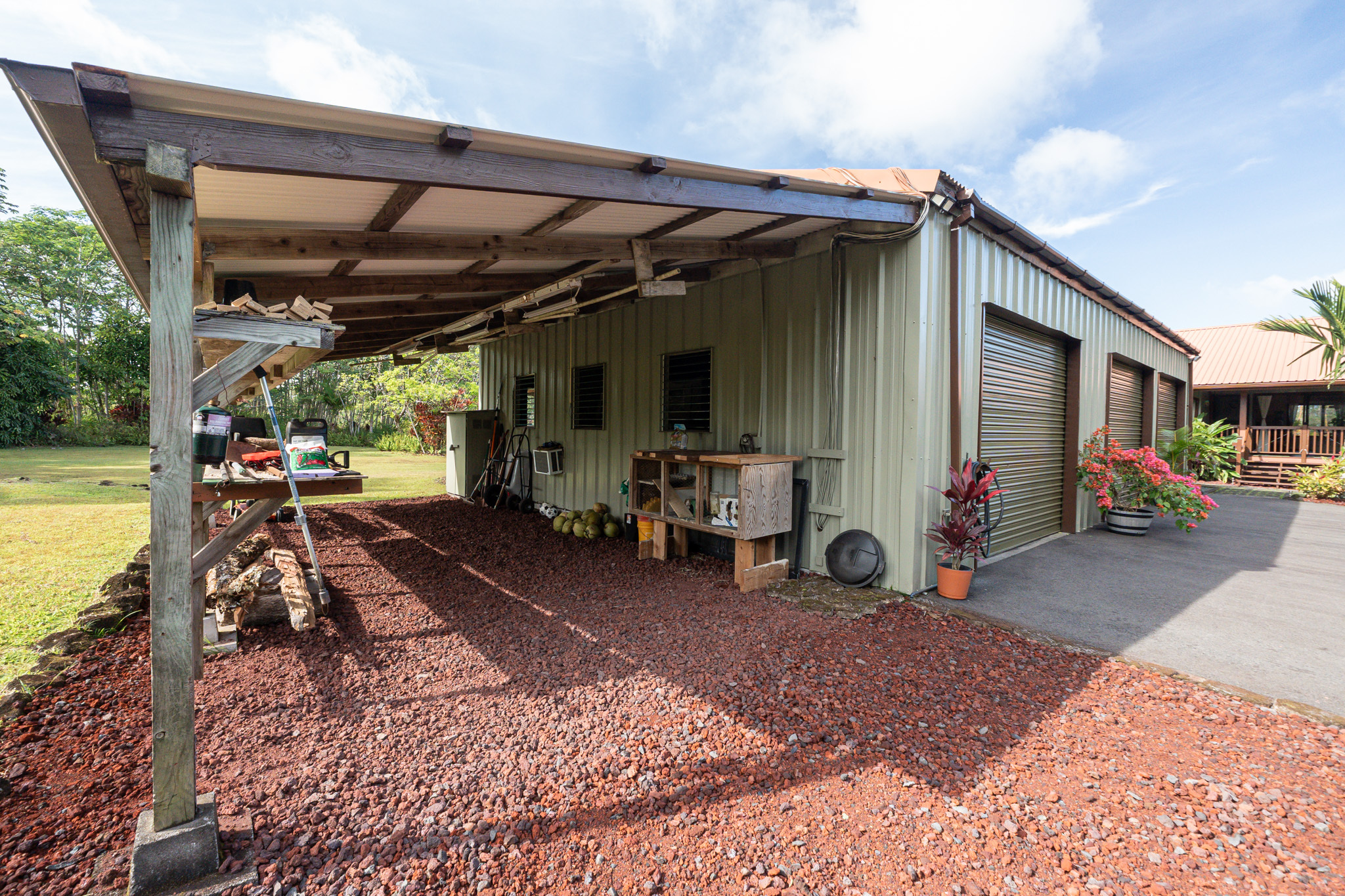 This turnkey, fully furnished home is being sold with the lot next door (MLS 728694) for a total of 1 acre. The elevated design captures refreshing trade winds throughout the day. It is located on a quiet, paved, dead-end street, which is ideal for privacy. The interior features solid mahogany doors and trim, new laminate flooring, fresh premium paint, attic fans, remodeled butler walk-through pantry, and updated bathrooms with both a walk-in shower and a jacuzzi tub. The kitchen includes a gas stove, dishwasher, microwave, disposal, and trash compactor. The spacious laundry room offers propane dryer, utility sink, freezer, second fridge, custom cabinetry, and sewing station. The guest suite has a private entry, lanai, and bath. A flex room with AC overlooks the garden. The primary bedroom includes dual closets, two lanai doors, and AC. Exterior updates include freshly painted roof, siding, railings, garage doors, new fans, refreshed covered lanai, and upgraded landscaping with lava-stone bird bath and grill. The home is wired for alarm system and has a paved driveway. A rare 1260 sqft 3-car garage plus 480 sqft carport includes industrial garage doors, air-compressor lines, attic fan, and tall ceilings for large trucks or a lift. The third bay features its own bathroom, AC, 220-volt hookups, propane access, and private entry–perfect for a studio, gym, or apartment. It is solar-ready with a dedicated breaker box connected to 22 solar panels. Beautiful landscaping includes avocado, mango, coconut, dragon fruit, guava, and mulberry, plus rare yellow and orange ?ohi?a, hibiscus, orchids, heliconias, and anthuriums. Wrap-around lanai offers 825 sqft of outdoor living with new stain, custom gates, hardwood benches, and updated lighting. The HOA community center offers a pool, playground, pickleball courts, BBQ pavilion, grassy field, and “The Stables” with monthly activities. Each lot has its own mailbox and piped water.