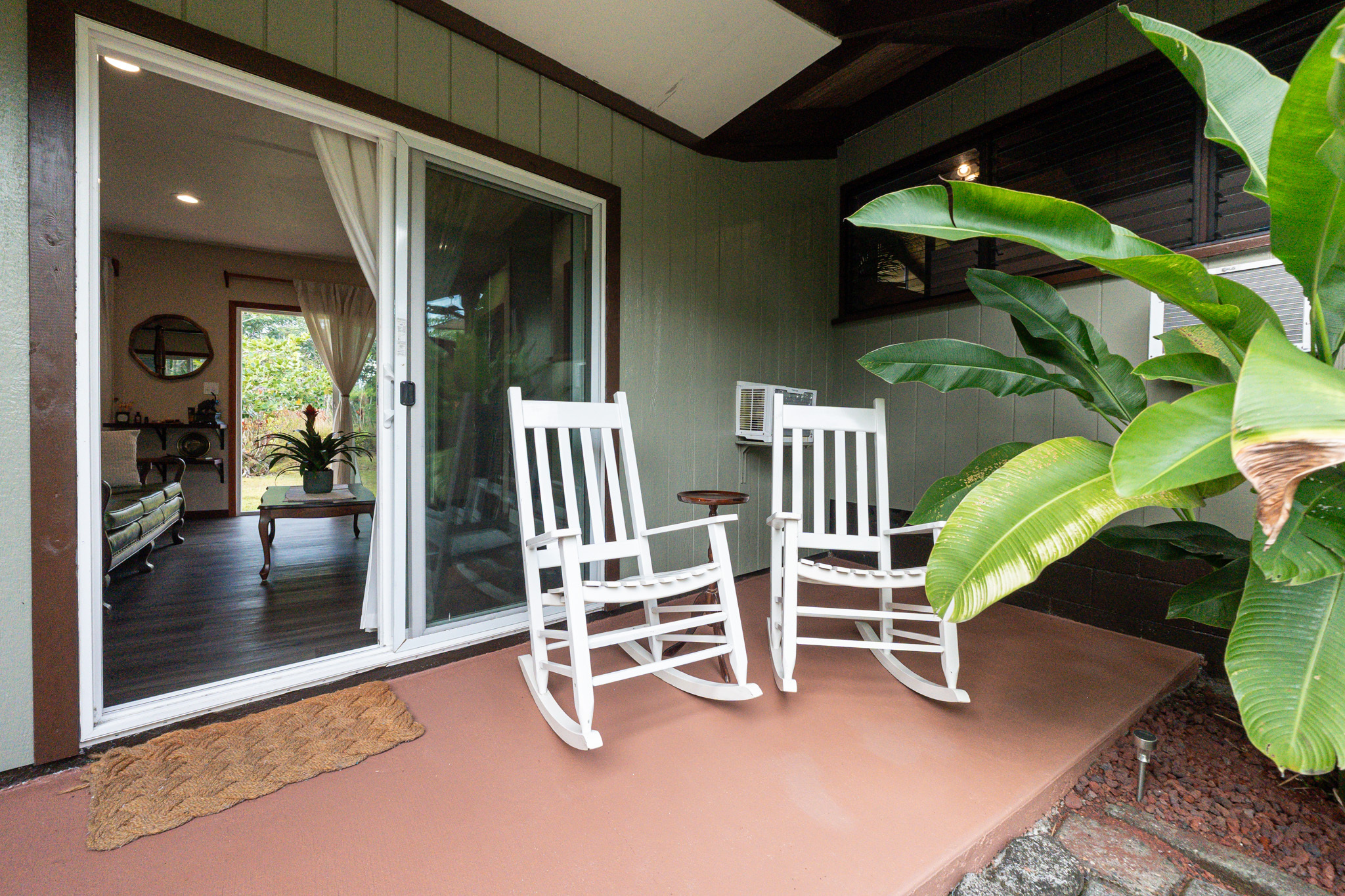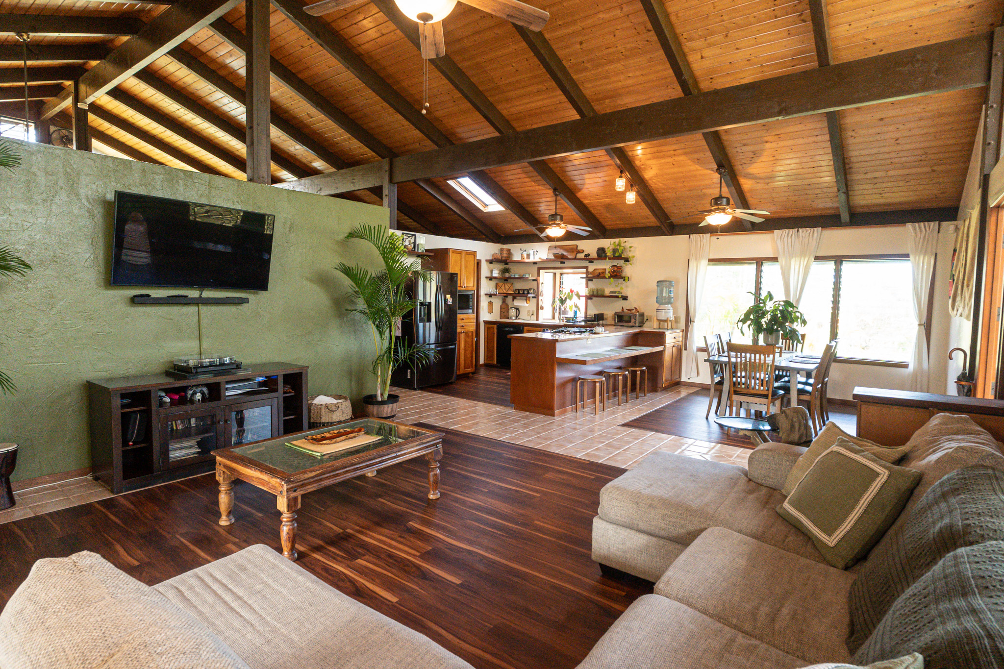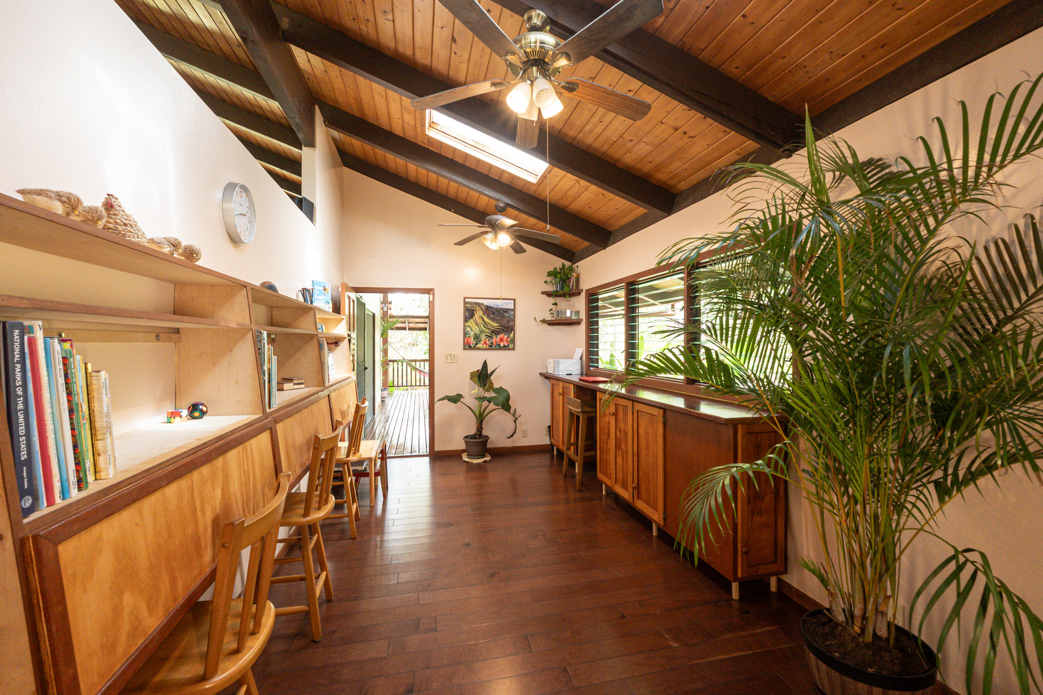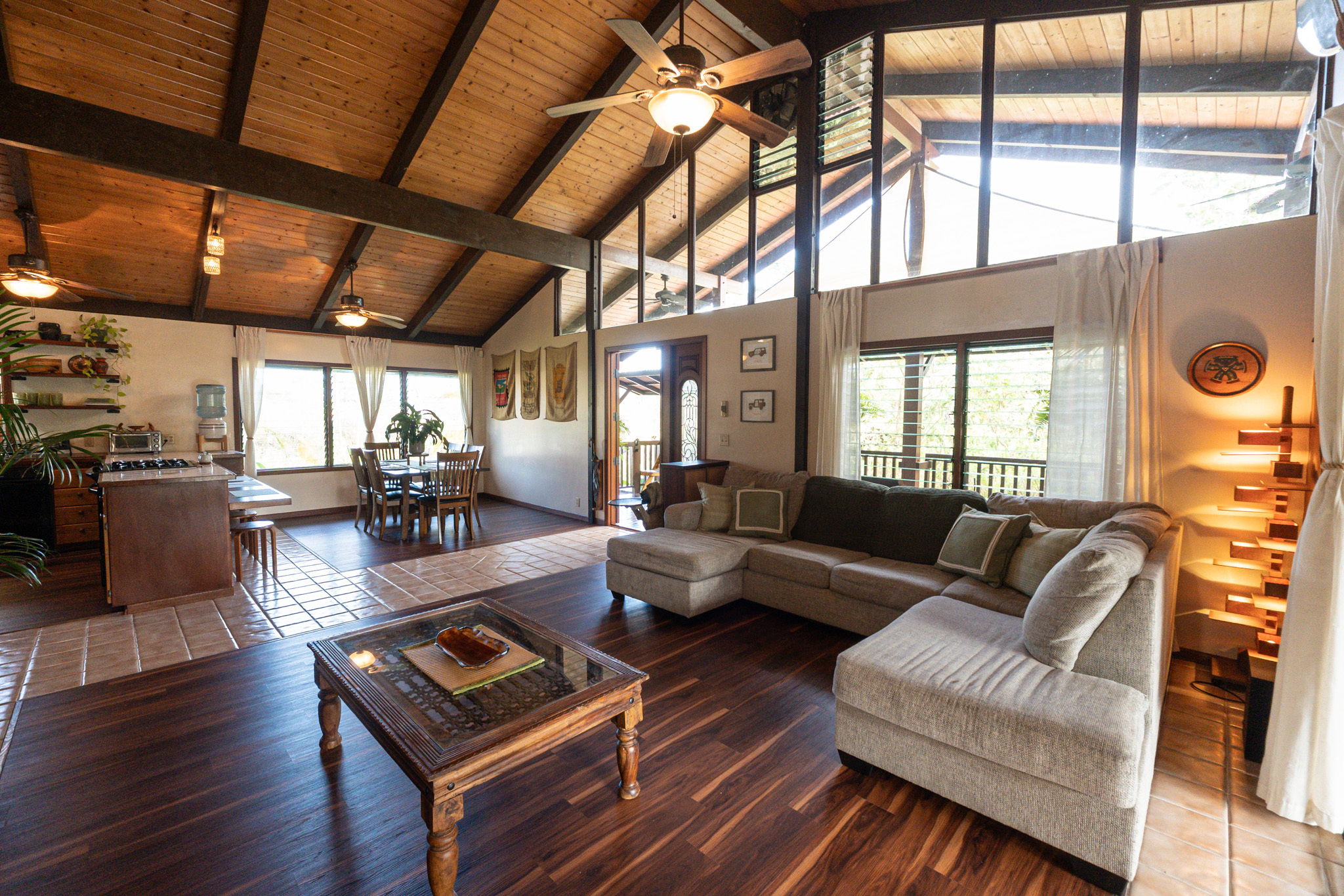 This turnkey, fully furnished home is being sold with the lot next door (MLS 728694) for a total of 1 acre. The elevated design captures refreshing trade winds throughout the day. It is located on a quiet, paved, dead-end street, which is ideal for privacy. The interior features solid mahogany doors and trim, new laminate flooring, fresh premium paint, attic fans, remodeled butler walk-through pantry, and updated bathrooms with both a walk-in shower and a jacuzzi tub. The kitchen includes a gas stove, dishwasher, microwave, disposal, and trash compactor. The spacious laundry room offers propane dryer, utility sink, freezer, second fridge, custom cabinetry, and sewing station. The guest suite has a private entry, lanai, and bath. A flex room with AC overlooks the garden. The primary bedroom includes dual closets, two lanai doors, and AC. Exterior updates include freshly painted roof, siding, railings, garage doors, new fans, refreshed covered lanai, and upgraded landscaping with lava-stone bird bath and grill. The home is wired for alarm system and has a paved driveway. A rare 1260 sqft 3-car garage plus 480 sqft carport includes industrial garage doors, air-compressor lines, attic fan, and tall ceilings for large trucks or a lift. The third bay features its own bathroom, AC, 220-volt hookups, propane access, and private entry–perfect for a studio, gym, or apartment. It is solar-ready with a dedicated breaker box connected to 22 solar panels. Beautiful landscaping includes avocado, mango, coconut, dragon fruit, guava, and mulberry, plus rare yellow and orange ?ohi?a, hibiscus, orchids, heliconias, and anthuriums. Wrap-around lanai offers 825 sqft of outdoor living with new stain, custom gates, hardwood benches, and updated lighting. The HOA community center offers a pool, playground, pickleball courts, BBQ pavilion, grassy field, and “The Stables” with monthly activities. Each lot has its own mailbox and piped water.