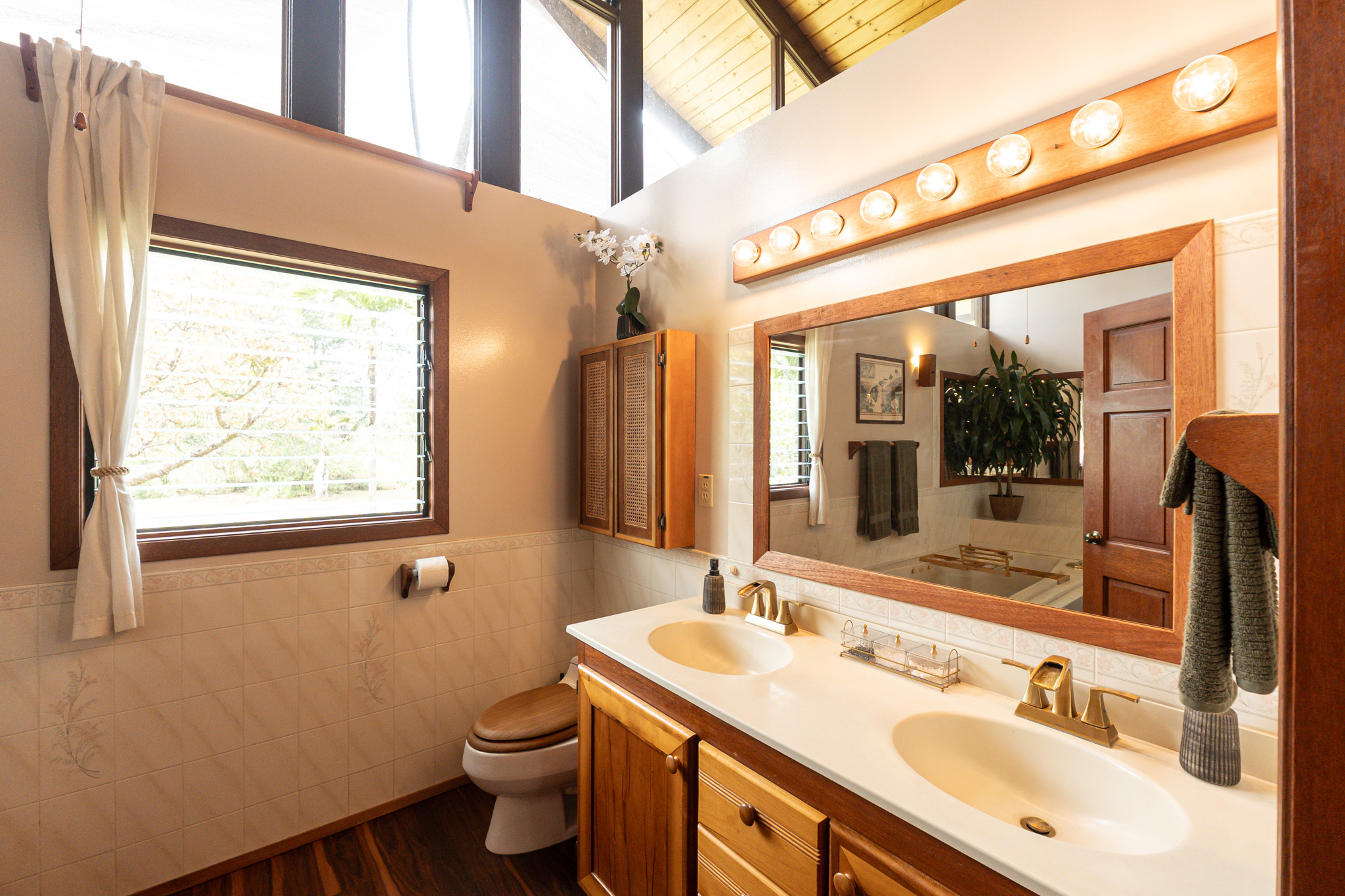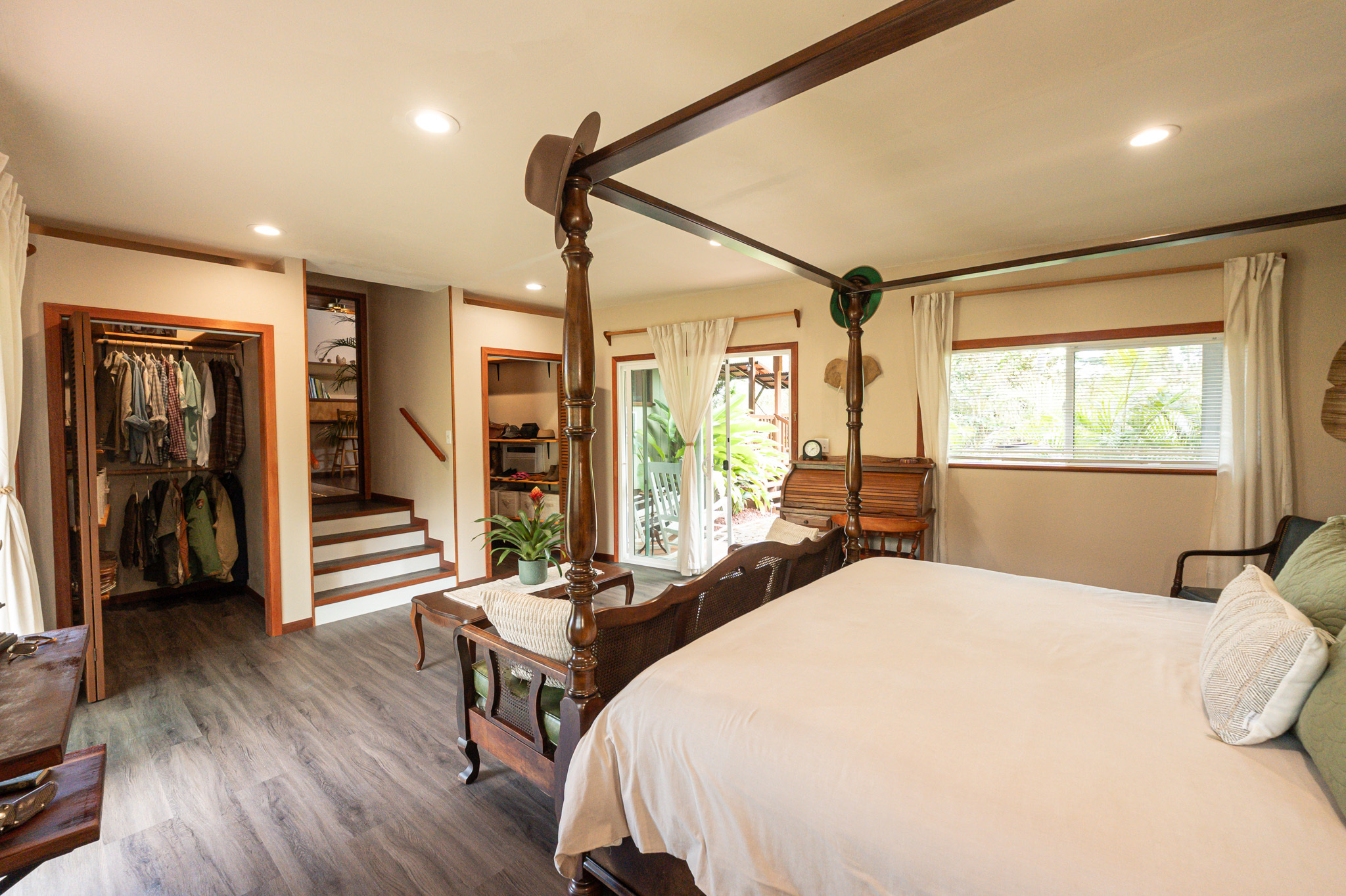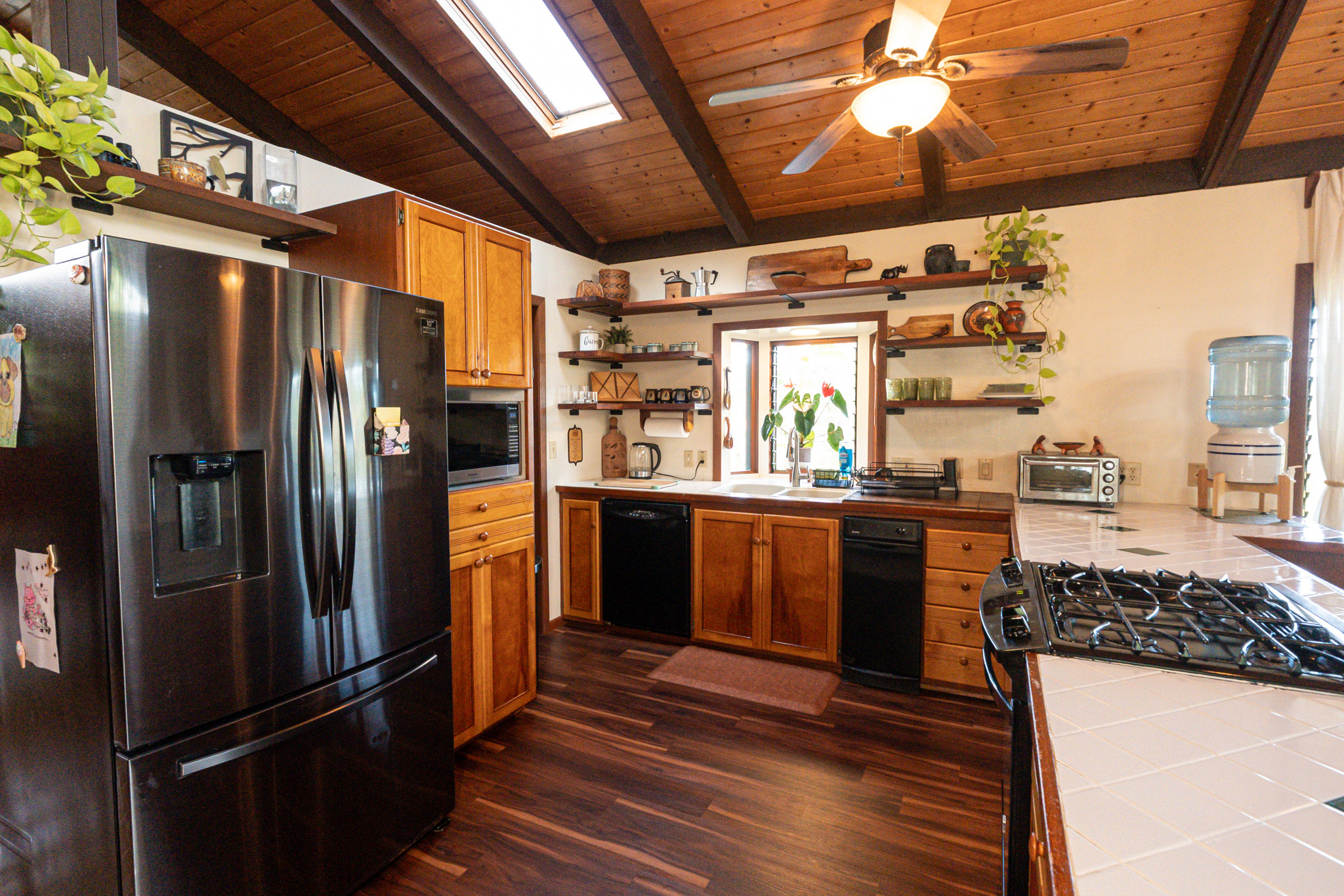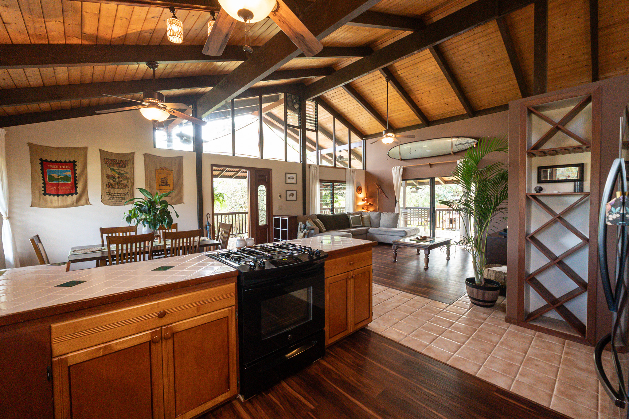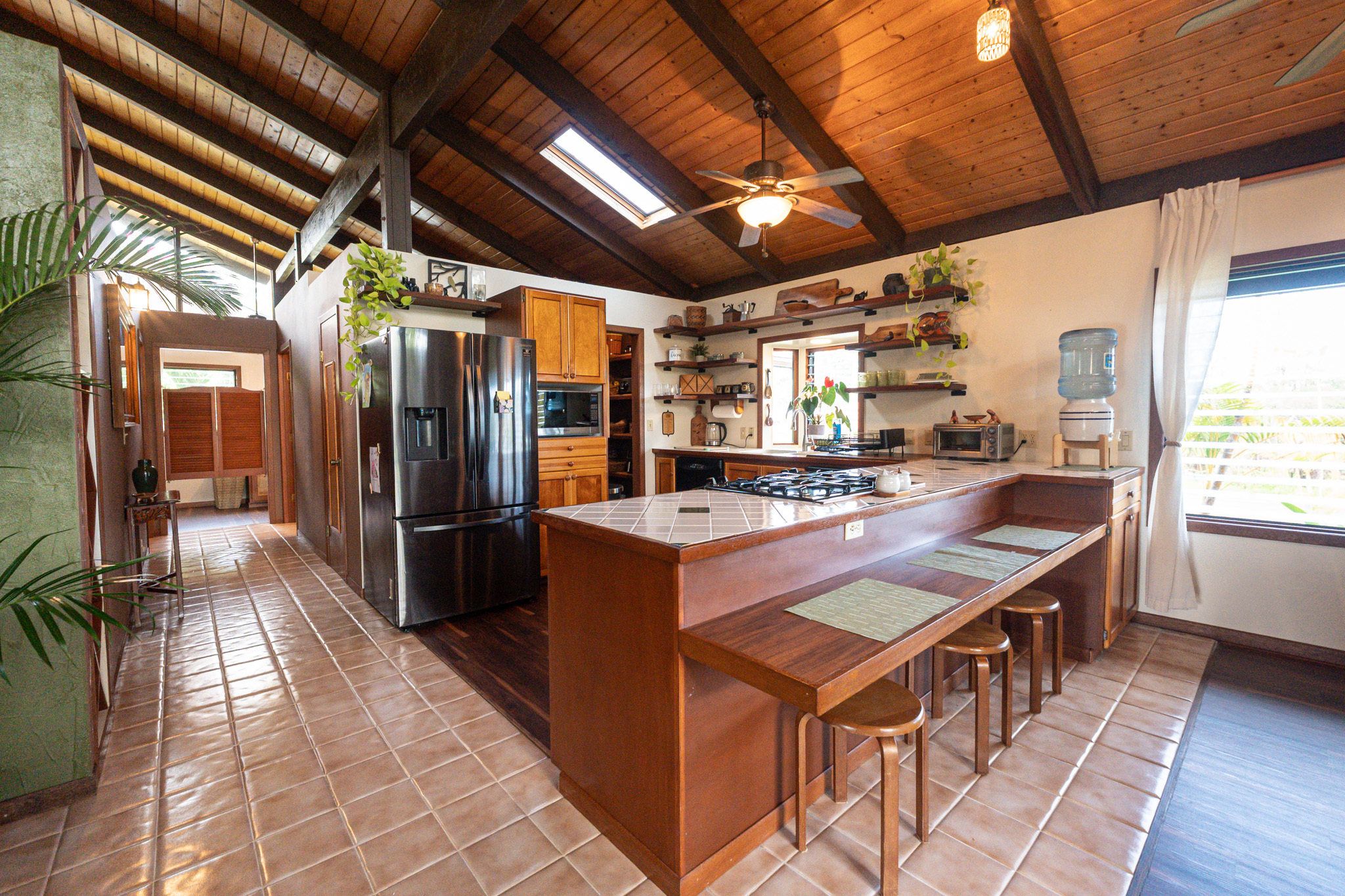 This turnkey, fully furnished home is being sold with the lot next door (MLS 728694) for a total of 1 acre. The elevated design captures refreshing trade winds throughout the day. It is located on a quiet, paved, dead-end street, which is ideal for privacy. The interior features solid mahogany doors and trim, new laminate flooring, fresh premium paint, attic fans, remodeled butler walk-through pantry, and updated bathrooms with both a walk-in shower and a jacuzzi tub. The kitchen includes a gas stove, dishwasher, microwave, disposal, and trash compactor. The spacious laundry room offers propane dryer, utility sink, freezer, second fridge, custom cabinetry, and sewing station. The guest suite has a private entry, lanai, and bath. A flex room with AC overlooks the garden. The primary bedroom includes dual closets, two lanai doors, and AC. Exterior updates include freshly painted roof, siding, railings, garage doors, new fans, refreshed covered lanai, and upgraded landscaping with lava-stone bird bath and grill. The home is wired for alarm system and has a paved driveway. A rare 1260 sqft 3-car garage plus 480 sqft carport includes industrial garage doors, air-compressor lines, attic fan, and tall ceilings for large trucks or a lift. The third bay features its own bathroom, AC, 220-volt hookups, propane access, and private entry–perfect for a studio, gym, or apartment. It is solar-ready with a dedicated breaker box connected to 22 solar panels. Beautiful landscaping includes avocado, mango, coconut, dragon fruit, guava, and mulberry, plus rare yellow and orange ?ohi?a, hibiscus, orchids, heliconias, and anthuriums. Wrap-around lanai offers 825 sqft of outdoor living with new stain, custom gates, hardwood benches, and updated lighting. The HOA community center offers a pool, playground, pickleball courts, BBQ pavilion, grassy field, and “The Stables” with monthly activities. Each lot has its own mailbox and piped water.