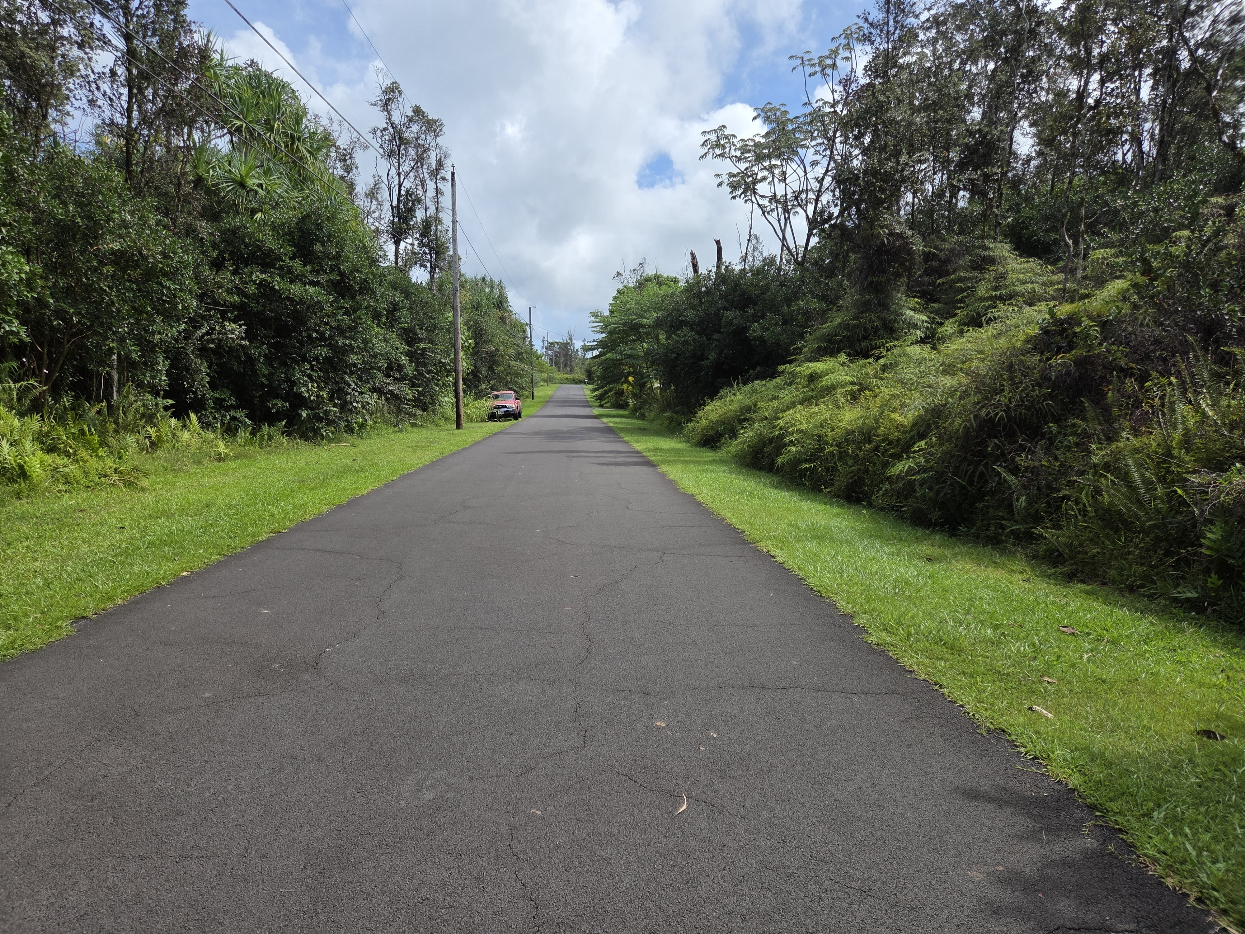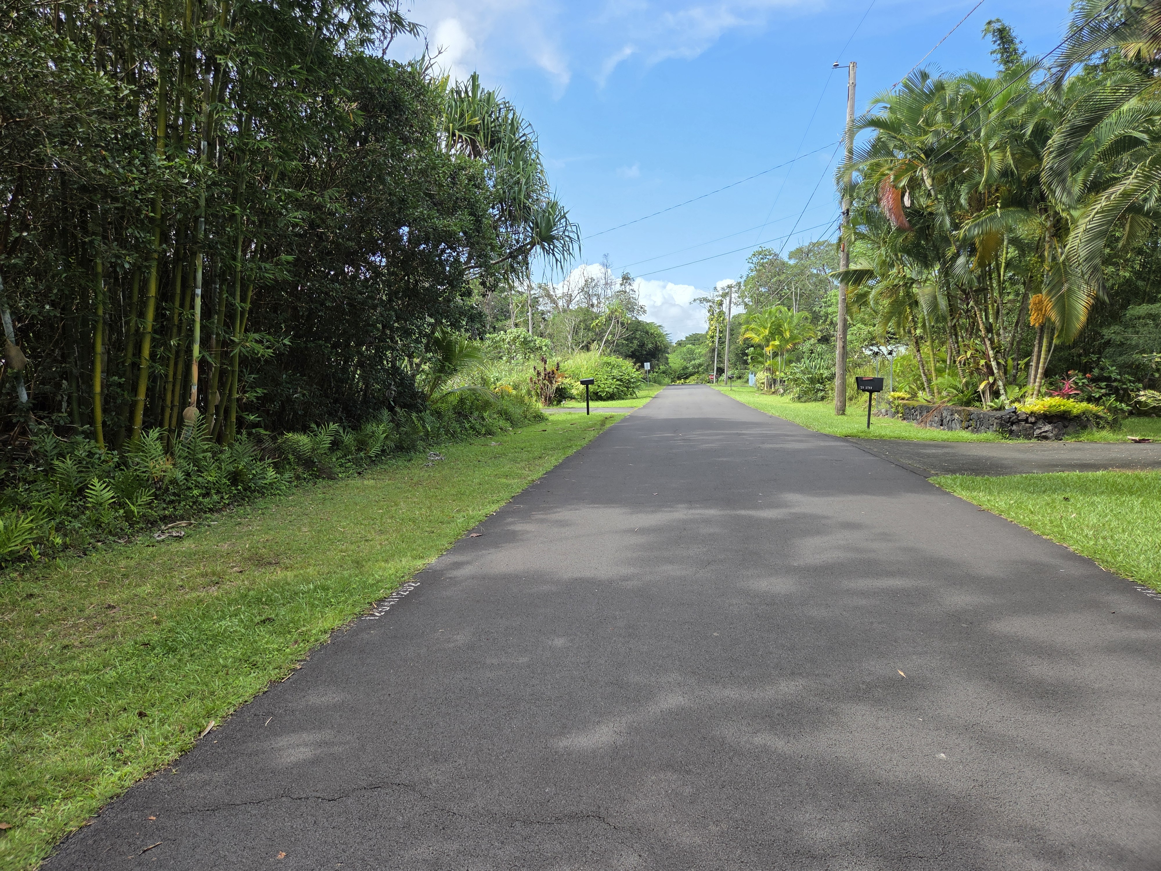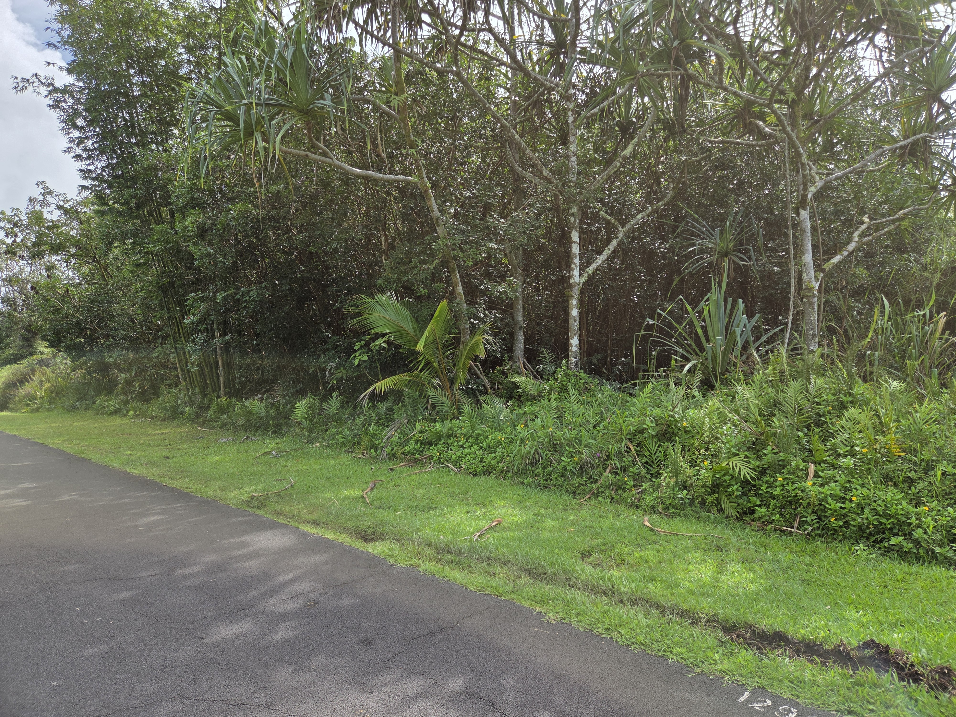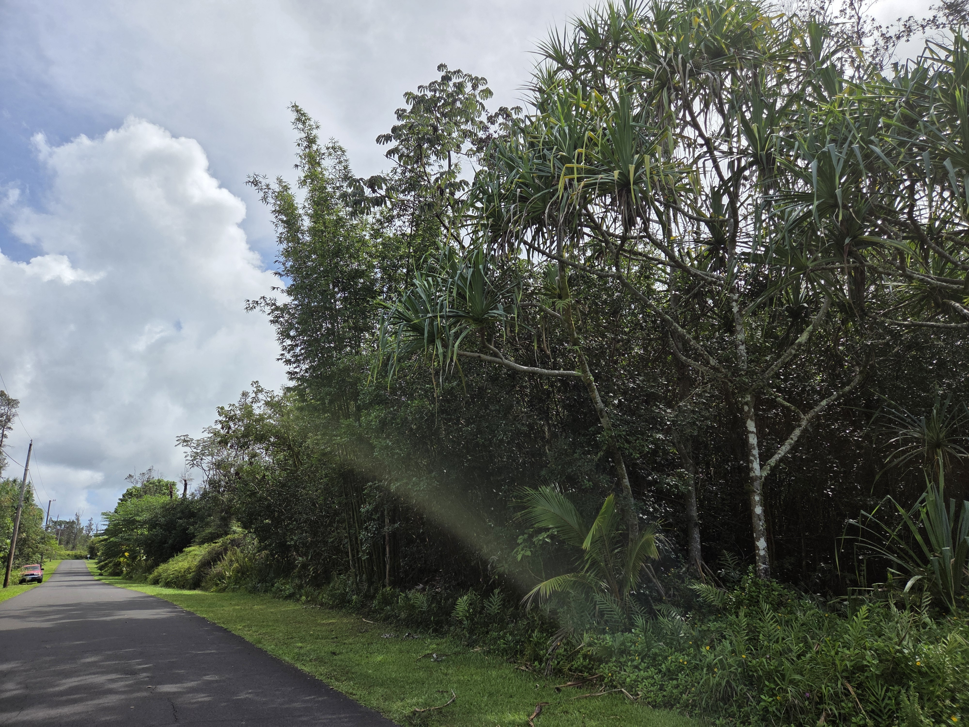 This is a prime building lot in Hawaiian Shores Recreational Estates. The lot appears to be free from big bad albiezia trees. There is bamboo, a coconut and an avocado tree visible and there may be more hidden treasures. There are well-taken-care-of homes across the street and on a neighboring lot.