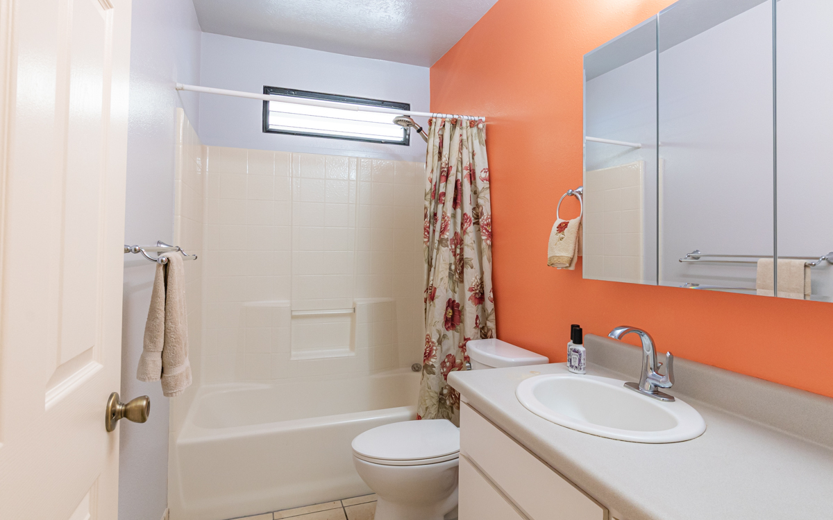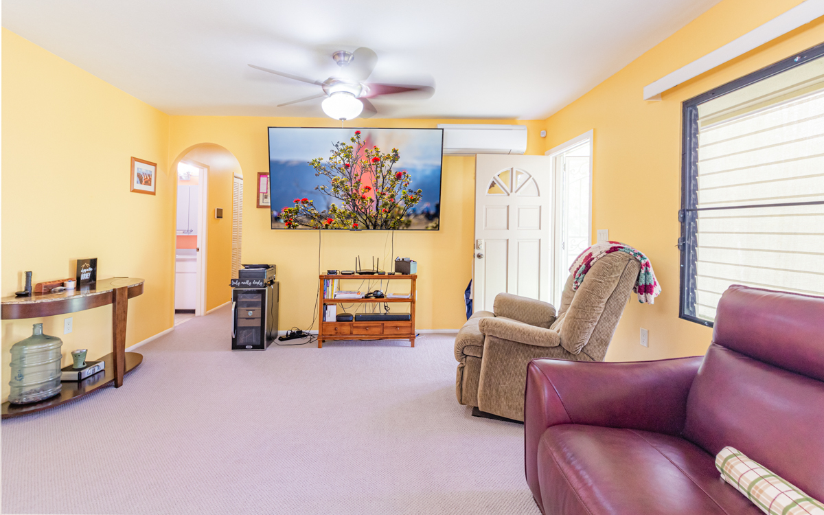 Situated on a quiet street in Hawaiian Shores Recreational Estates, this house exemplifies "cool". Built of hollow tile concrete walls covered in stucco the house is naturally cooled. Additionally, split AC units are installed in almost every room for a central air-conditioned atmosphere. Coooool! Drive into the covered, attached carport where there is a locking storage room as well as a full laundry room with 1/4 bath. All paved with concrete, the covered lanai is a great place to chill in the shade. Once inside the house check out the curved hallway detail that amplifies the curves on the front of the house. The kitchen and living room are open and allow enough space for a dining table. Down the hallway you'll find three bedrooms and two full bathrooms. A fun inclusion - all wall-mounted TVs are included in the property sale. The primary bedroom features an ensuite bathroom with vessel sink and fully tiled walk-in shower. Each bedroom has ample closet storage and the hallway has a wide storage closet. Hawaiian Shores Recreational Estates boasts a fabulous neighborhood park and swimming pool just a few blocks walk from this house. Enjoy the pool on hot days or reserve the pavilion for your gatherings from time to time.
