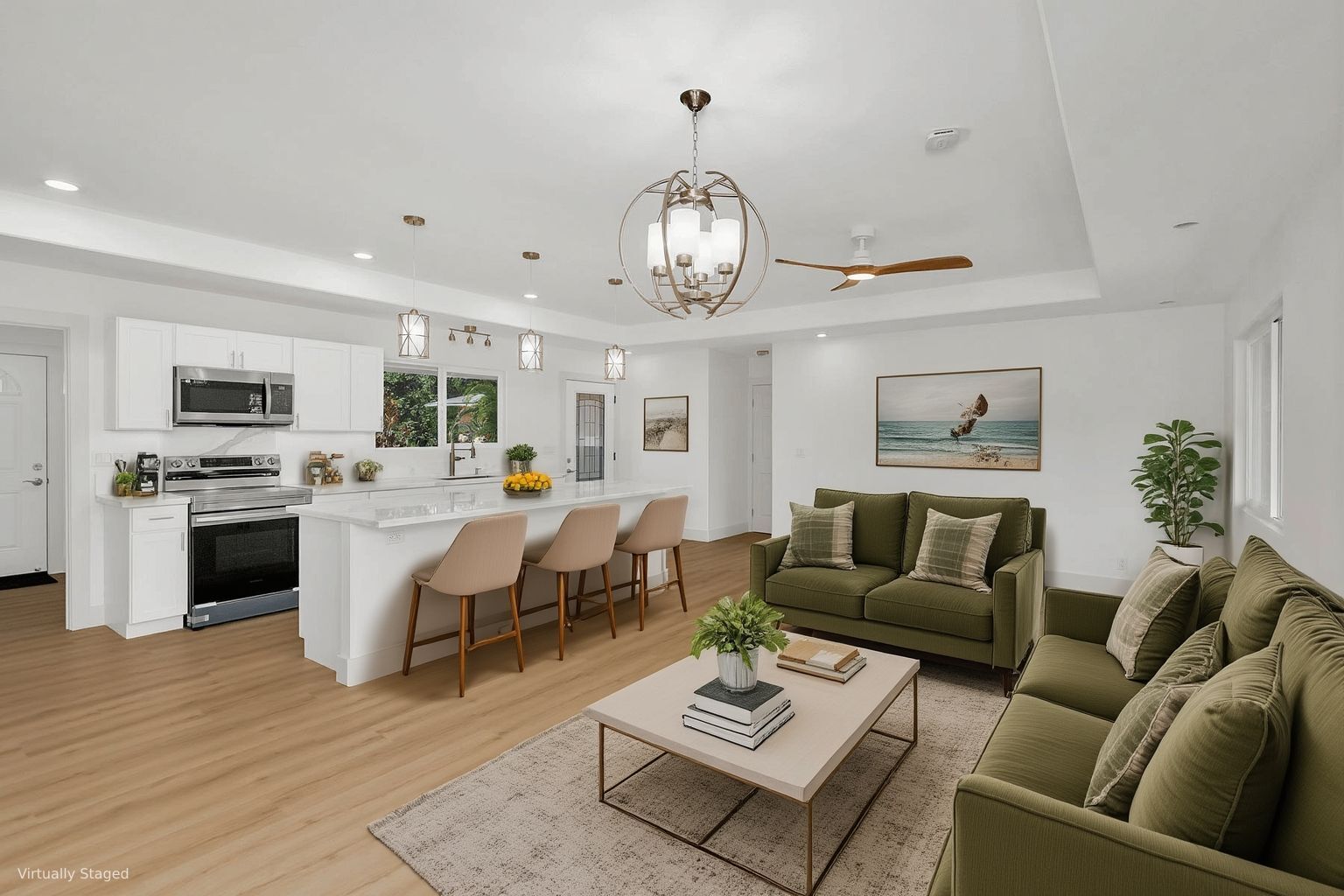 New construction 3 bedroom / 2.5 bathroom home in Hawaiian Shores Recreational Estates, offering modern materials and a practical floor plan. The home includes approximately 1,235 sq ft of interior living area on a 12,040 sq ft lot. Interior features include vinyl plank flooring, a spacious primary bedroom with a walk-in closet, and a step-in shower. The kitchen and living areas are designed for efficient use of space and natural light. An oversized carport provides additional covered parking and room for storage, projects, entertaining, or outdoor equipment. Utilities include Hawaii Beaches private well water and an individual septic system.