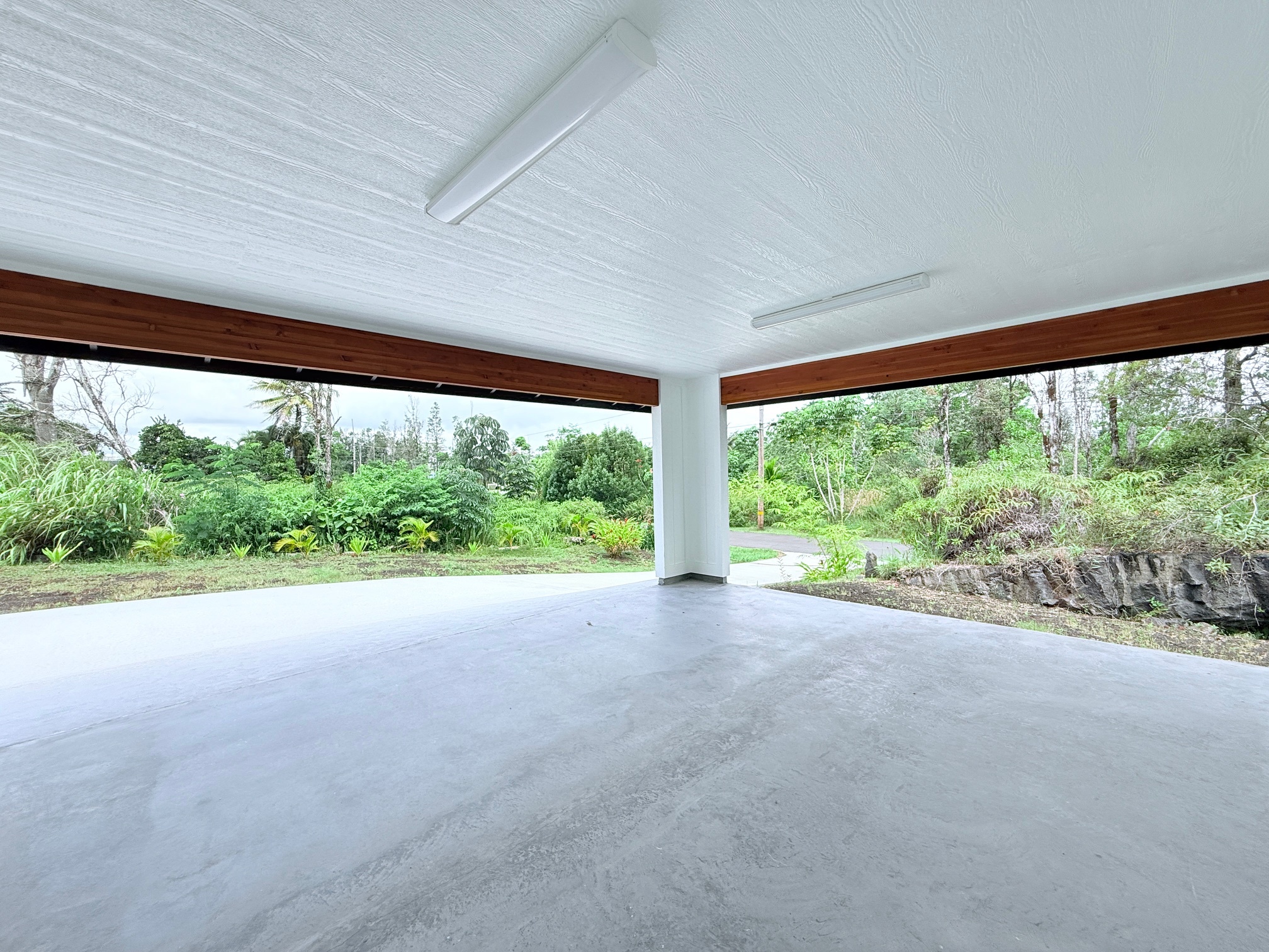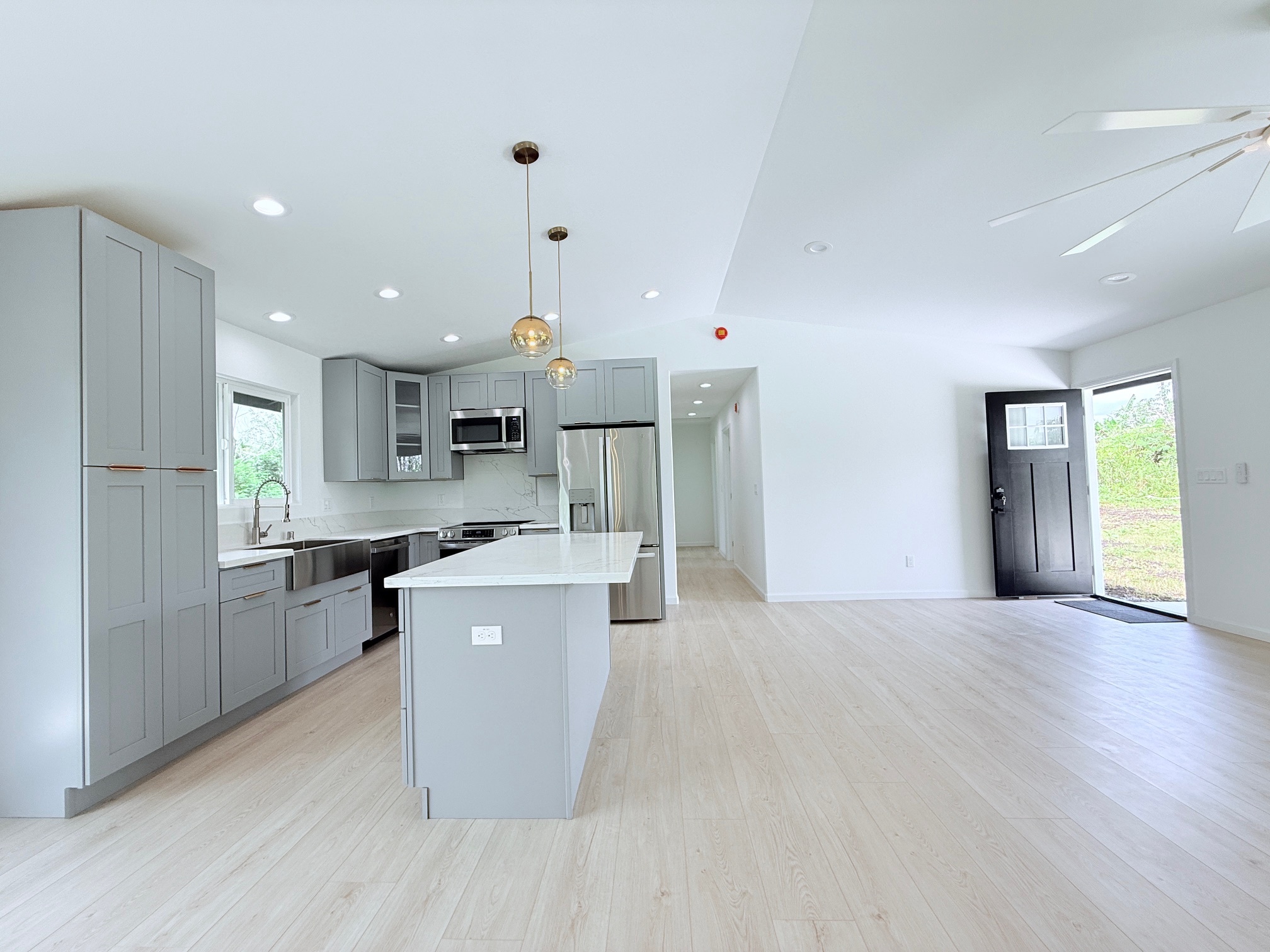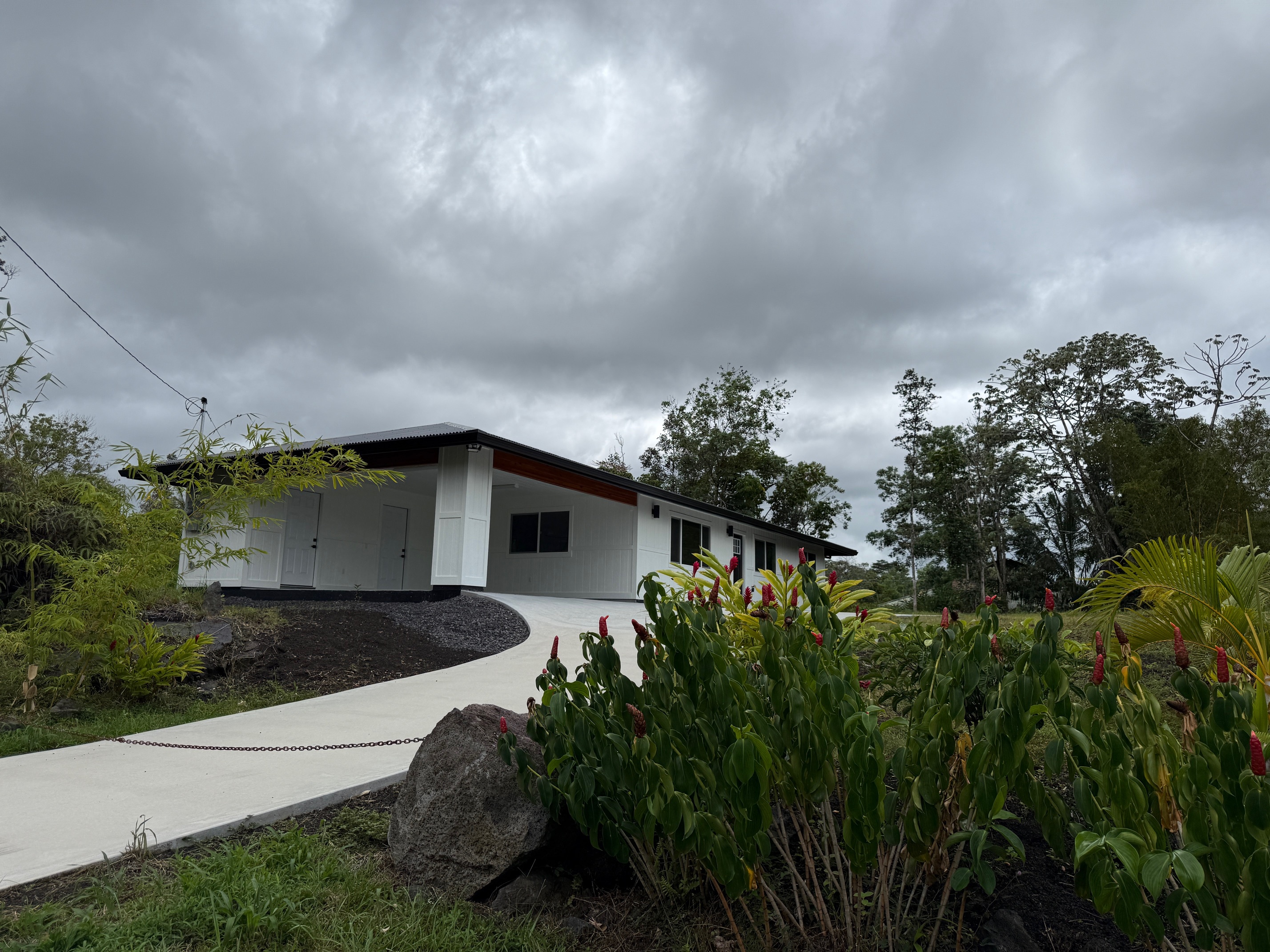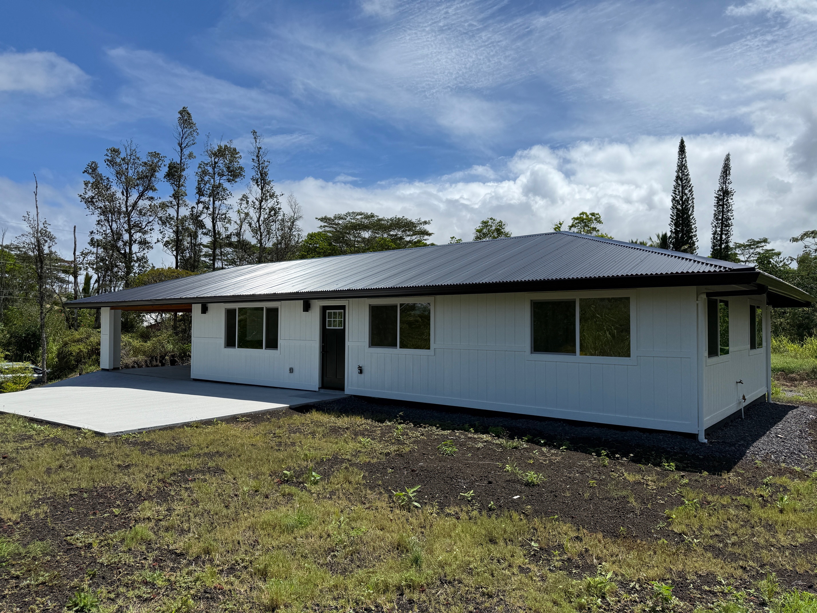 Step into a bright and airy living space with vaulted ceilings and expansive windows that fill the home with natural light. The open concept design connects kitchen, dinning and living perfectly for entertaining or everyday comfort. The kitchen features quartz counter tops, stainless steel GE appliances, high end fixtures, deep stainless farm sink and ample assigned cabinet storage. The spacious laundry room is equipped with washer, dryer, large utility sink in cabinet and upper and lower cabinets with quartz countertop. Custom finished bathrooms feature designer tile work, top-tier fixtures and vanities that create a luxurious feel. Home is thoughtfully set on this larger, elevated lot in the subdivision allowing the breeze to flow through with picturesque views throughout. There is convenient access to the home from the carport which also boasts a large storage room. A concrete driveway begins at the road and goes to the front door for seamless transition. The yard has been tastefully landscaped. This property offers the convenience of a private water system, paved roads and mail delivery. Enjoy community amenities including a recreation center, pool, and parks. All 2 miles from the ocean and ten minutes to Pahoa town. The new Puna Kai shopping center in Pahoa along with schools, restaurants, banks, post office and emergency services provide for all necessities and enjoyment. Also high speed internet available!