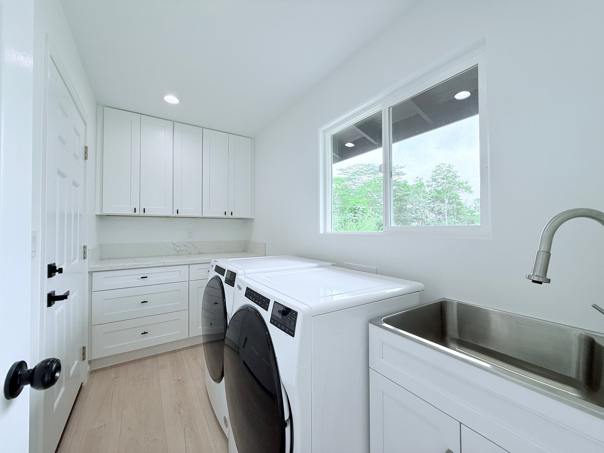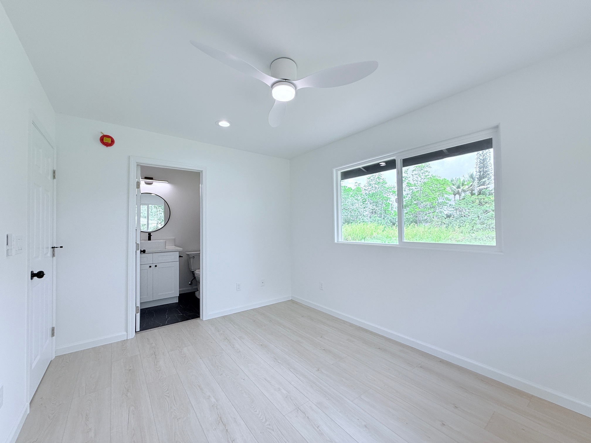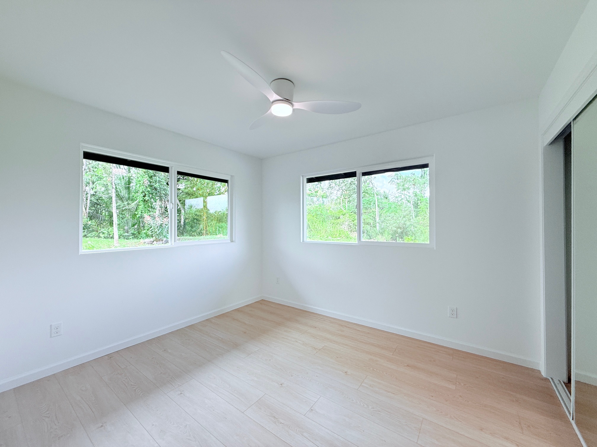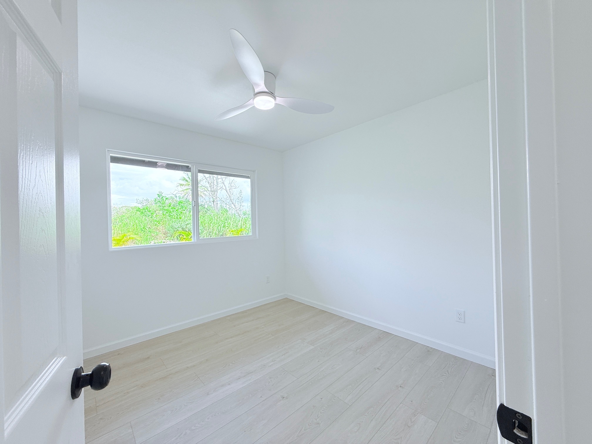 Step into a bright and airy living space with vaulted ceilings and expansive windows that fill the home with natural light. The open concept design connects kitchen, dinning and living perfectly for entertaining or everyday comfort. The kitchen features quartz counter tops, stainless steel GE appliances, high end fixtures, deep stainless farm sink and ample assigned cabinet storage. The spacious laundry room is equipped with washer, dryer, large utility sink in cabinet and upper and lower cabinets with quartz countertop. Custom finished bathrooms feature designer tile work, top-tier fixtures and vanities that create a luxurious feel. Home is thoughtfully set on this larger, elevated lot in the subdivision allowing the breeze to flow through with picturesque views throughout. There is convenient access to the home from the carport which also boasts a large storage room. A concrete driveway begins at the road and goes to the front door for seamless transition. The yard has been tastefully landscaped. This property offers the convenience of a private water system, paved roads and mail delivery. Enjoy community amenities including a recreation center, pool, and parks. All 2 miles from the ocean and ten minutes to Pahoa town. The new Puna Kai shopping center in Pahoa along with schools, restaurants, banks, post office and emergency services provide for all necessities and enjoyment. Also high speed internet available!