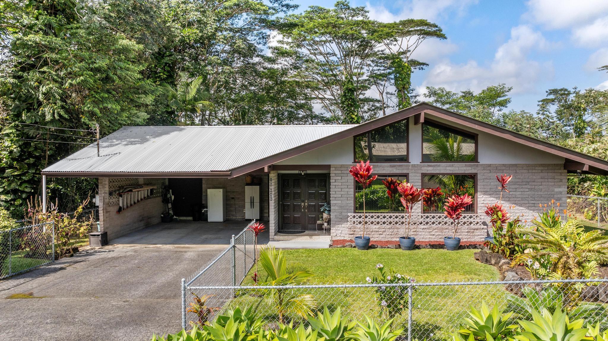 The outdoor space has also been transformed. Rich topsoil was hauled in, the yard was landscapped featuring towering palms and native flora, and a stunning "Big Island" shaped garden was created - a breathtaking tribute to the Island of Hawaii! Surrounded by jungle, with no neighbors on either side, and fully fenced with a brand new chain link fence, this property is both private and secure.