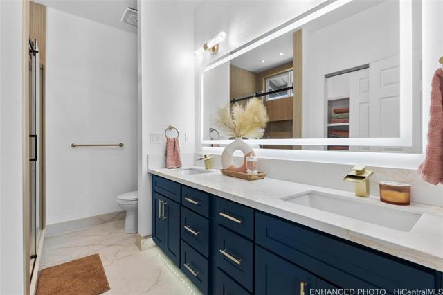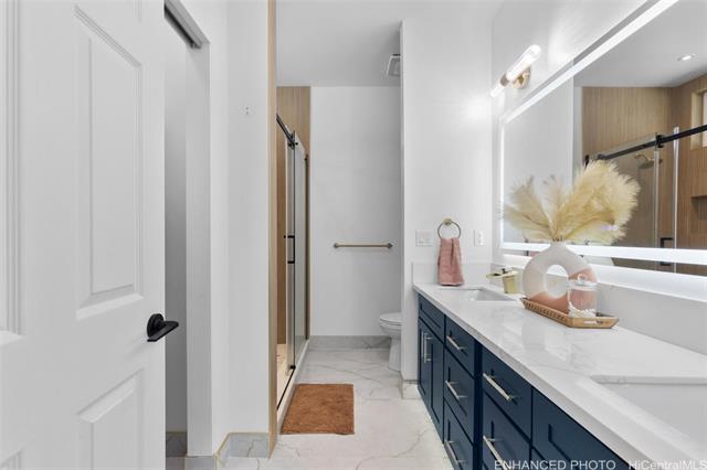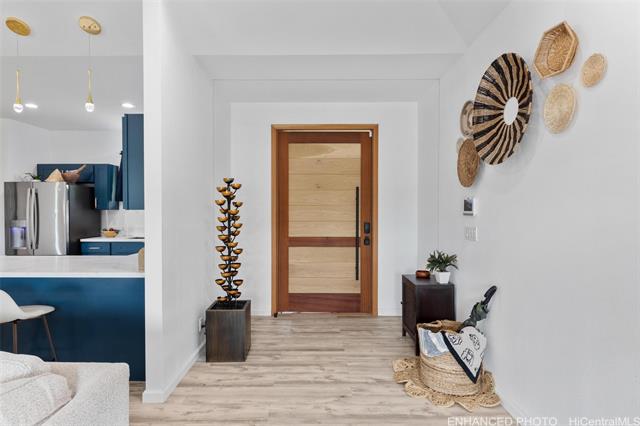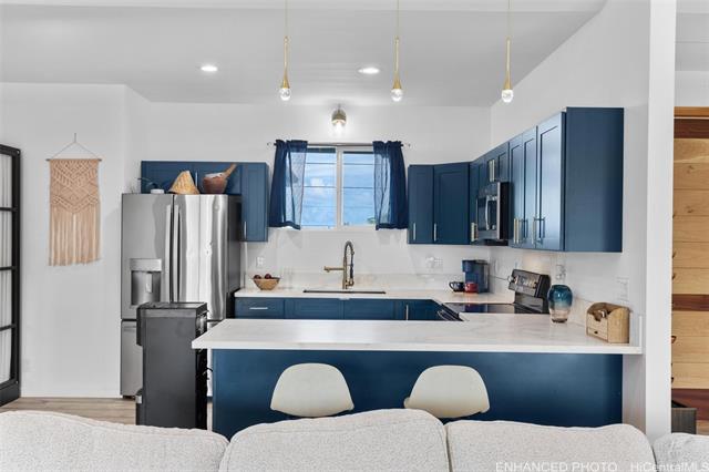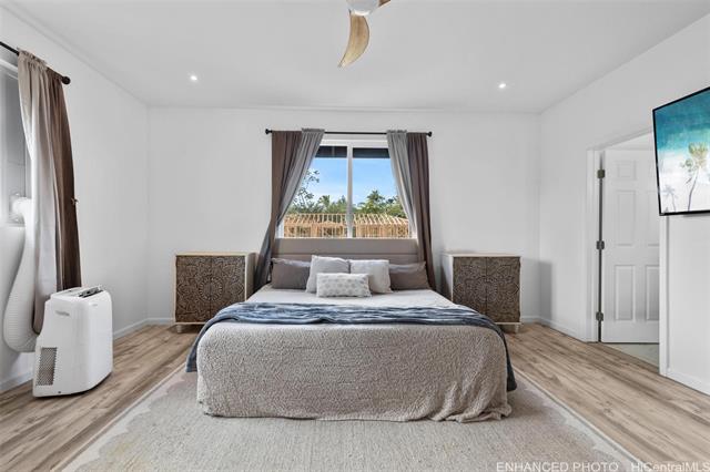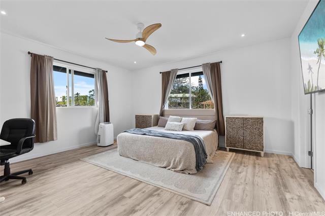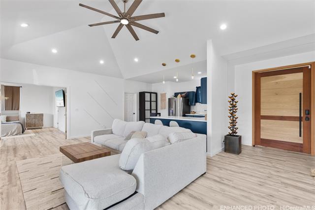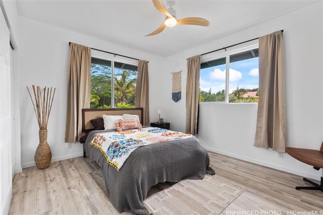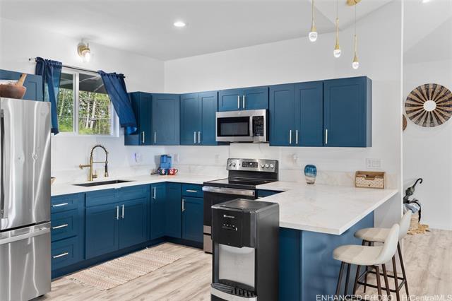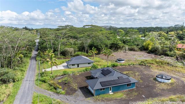 Welcome to 15-1430 19th Ave in Hawaiian Paradise Park, a unique property that sits on 1 acre of land. This home was tastefully built with custom wood paneling featured in the front of home with custom rock work. As you enter your home through the over sized wooden door you will be greeted with an open living and dining area with high 9ft vaulted ceilings surrounded by accent LED lights embedded in the walls and base of your kitchen, bathroom cabinets and vanity. The overs ized primary bedroom offers French doors, a walk in closet with built-in shelving . The Primary bedrooms offer custom stand up showers with his and her sinks , quartz countertops, stylish navy blue colored cabinets with gold accent fixtures. On the other side of the home you have two other over sized bedrooms, another stylish luxury bathroom with tile throughout as well as hydroelectric faucets. This home was not left without the wow! Leading to the back covered lanai is a sliding glass door. On the exterior of the home you will find a clear canvas within a fenced area for one to create their very own space. The home itself was custom wrapped with smart siding and a mix of tongue and groove woodwork.