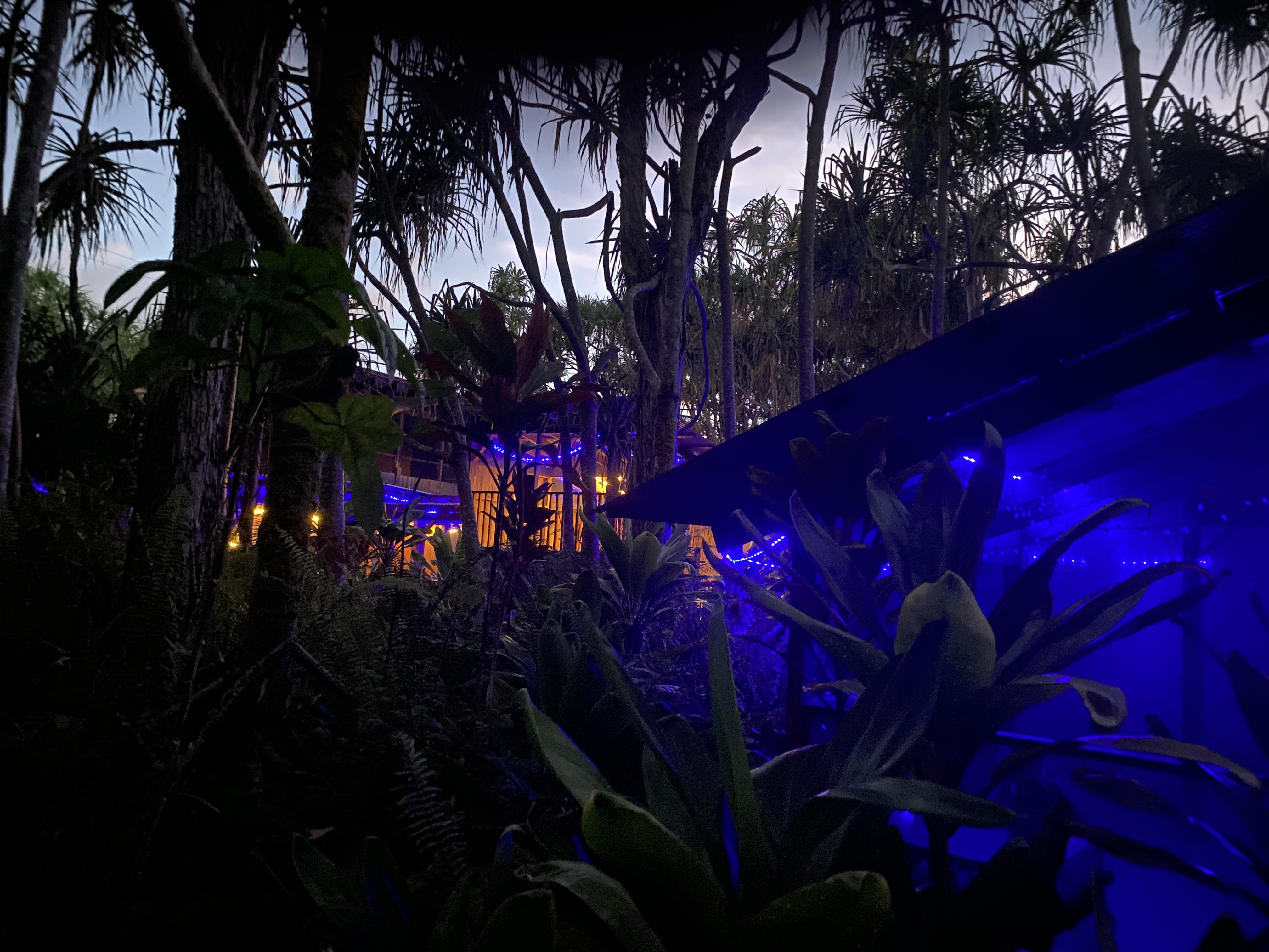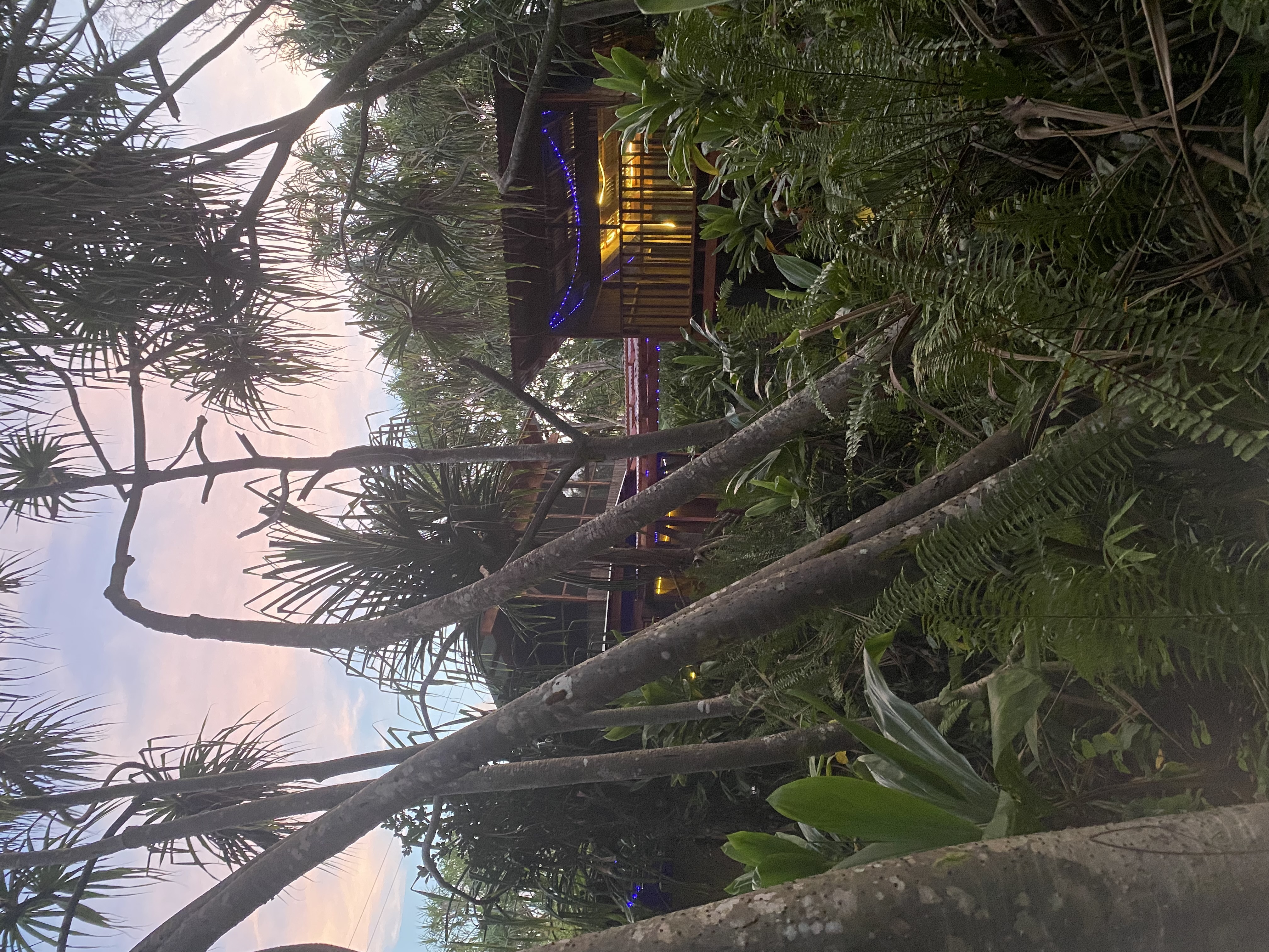 The surrounding old-growth Hala forest creates a shaded canopy, keeping the land cool while allowing dappled sunlight to nourish the diverse array of tropical plants and food crops. Winding trails meander through the forest, creating an enchanting setting.