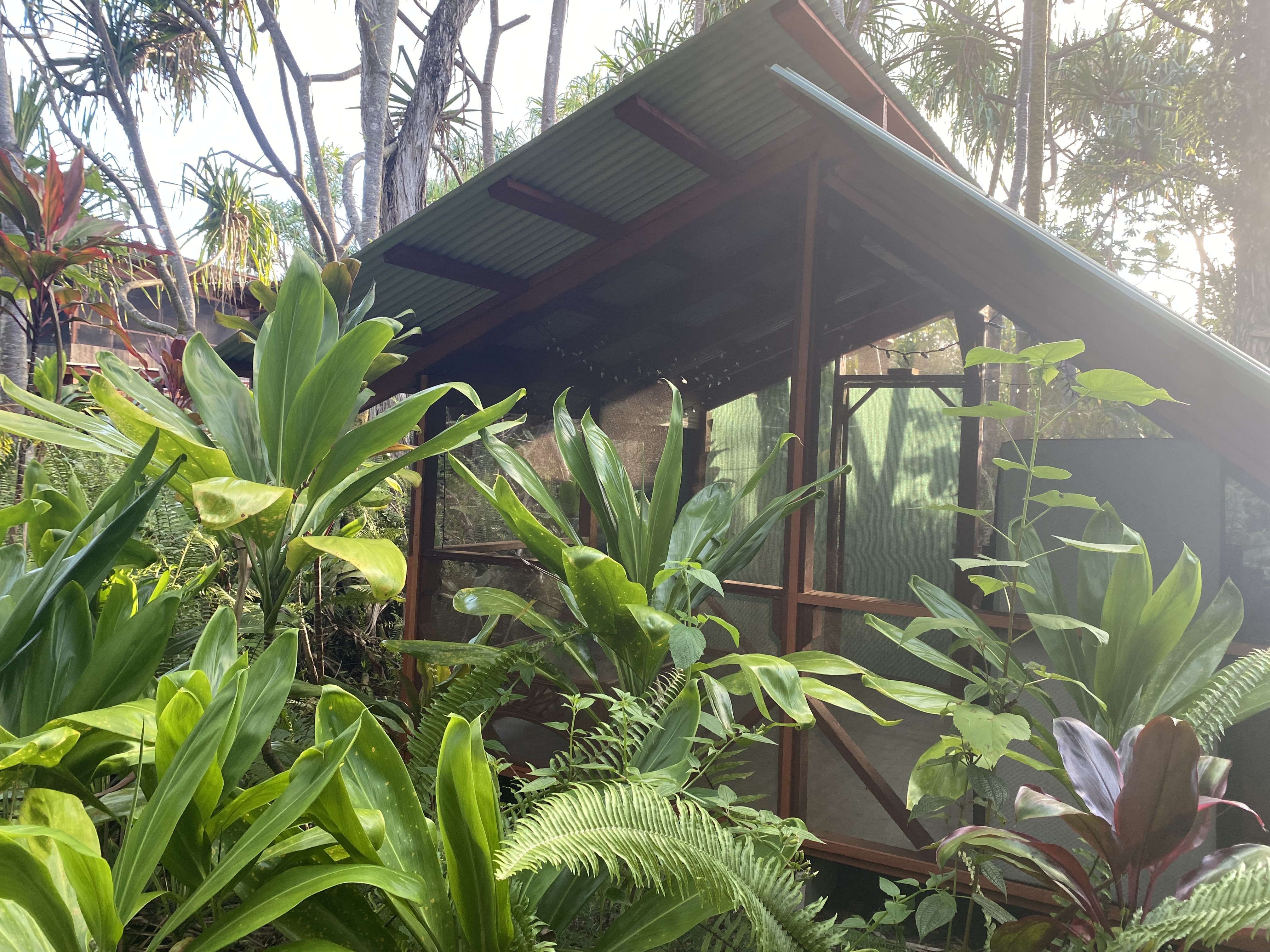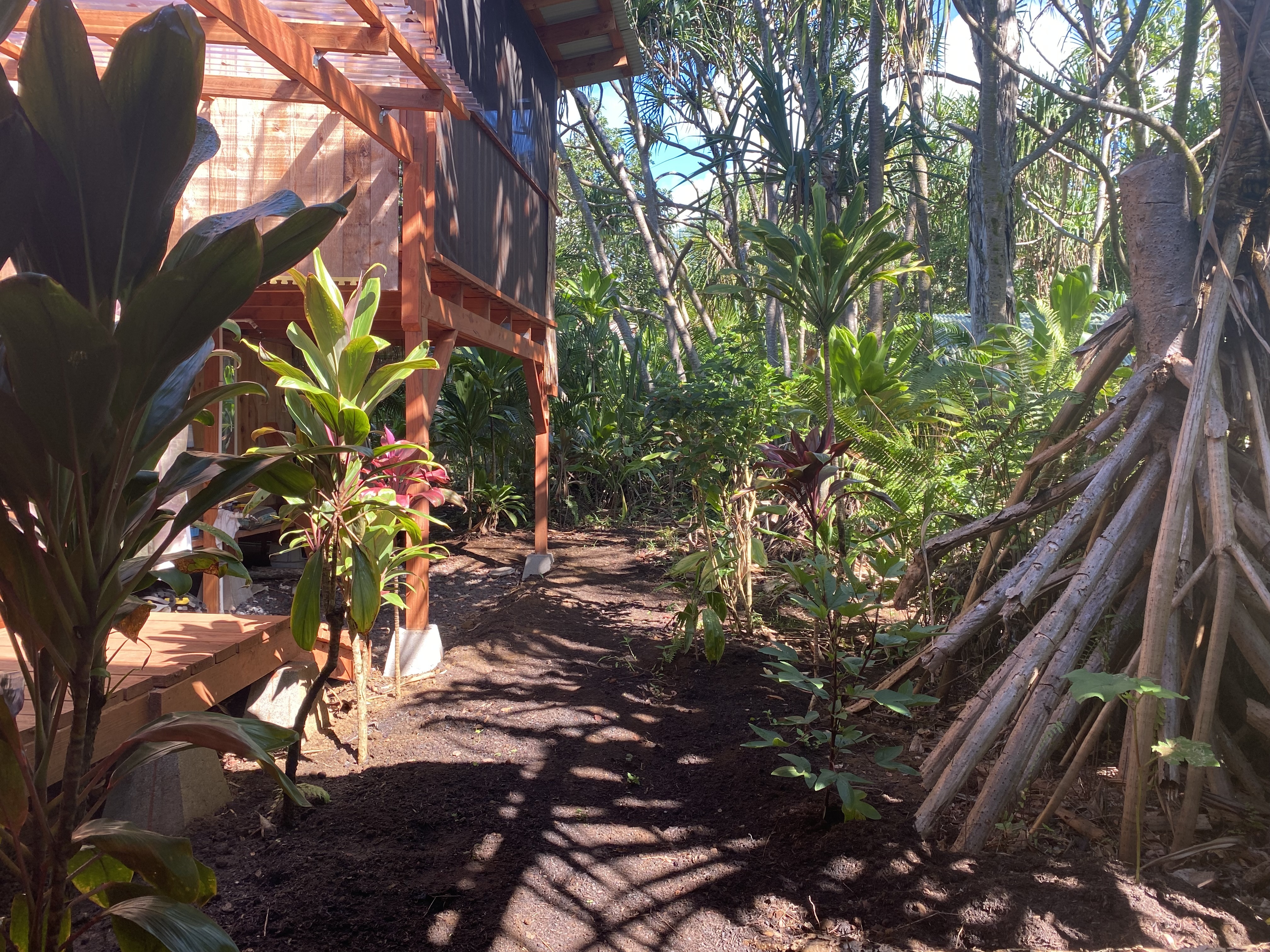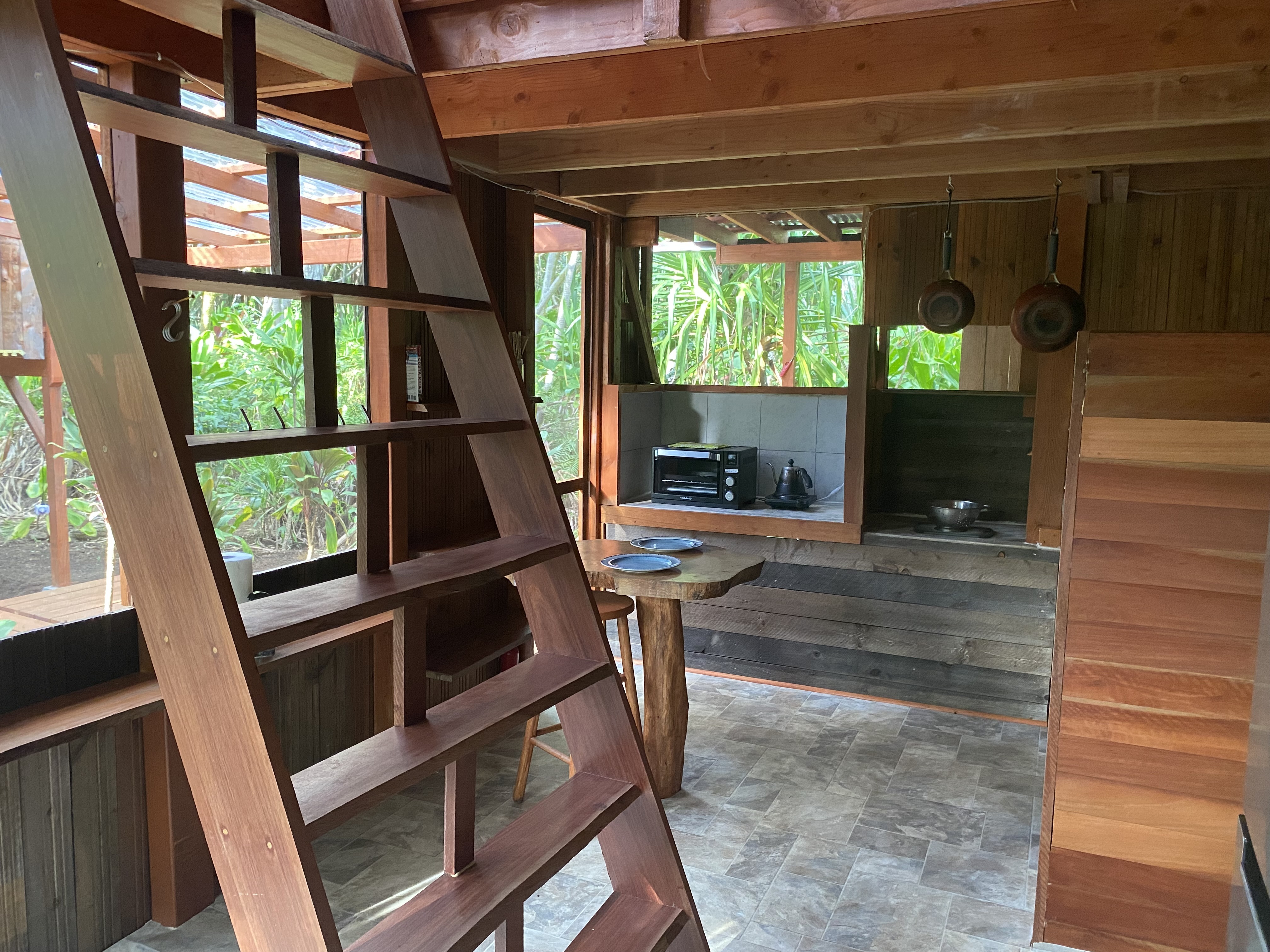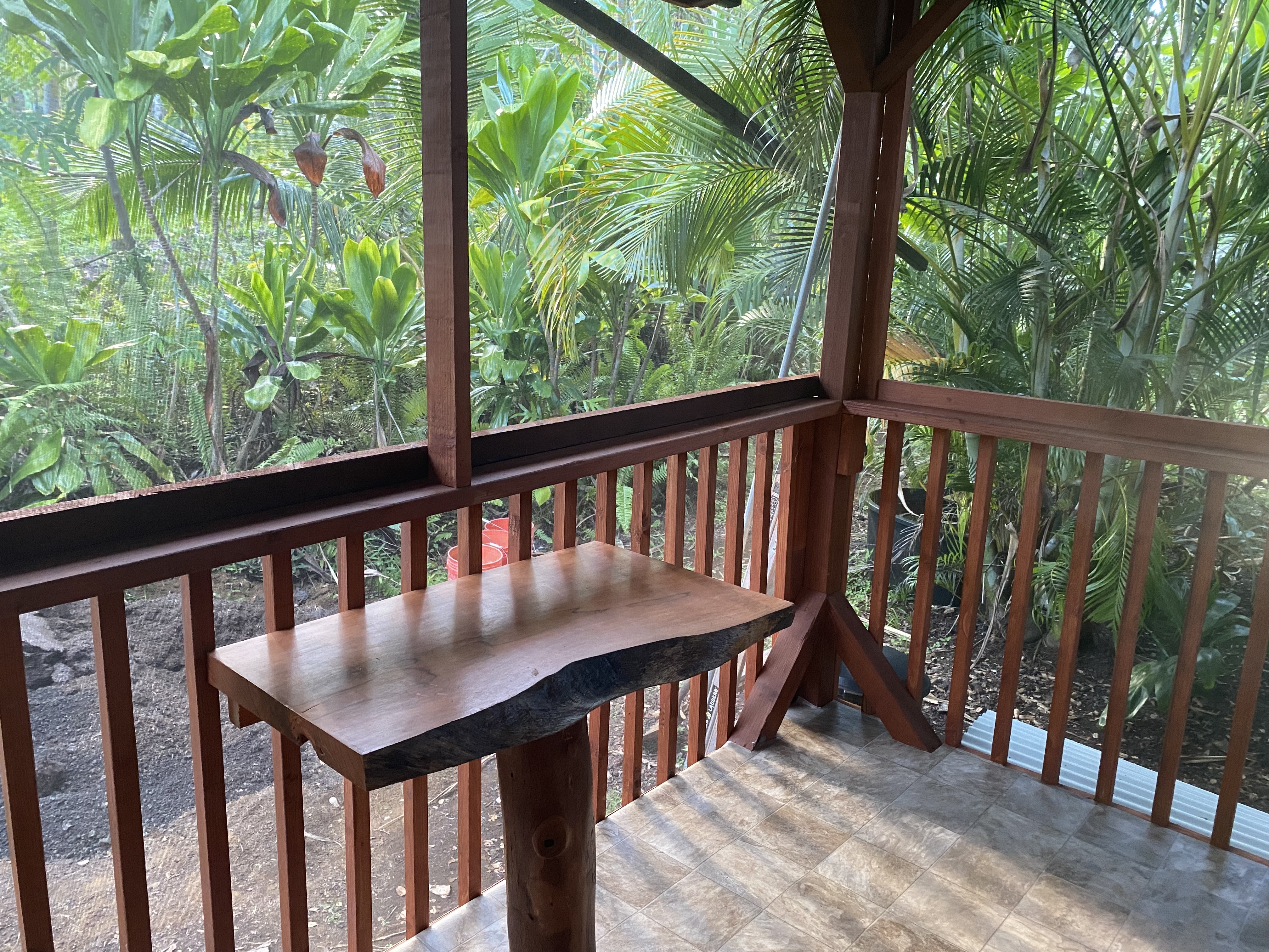 An additional screened-in 120 sq ft room sits gracefully among towering Ohia trees, ti plants, and ferns. The covered lanai, workspace, and bathing area expand the functionality of this off-grid retreat.