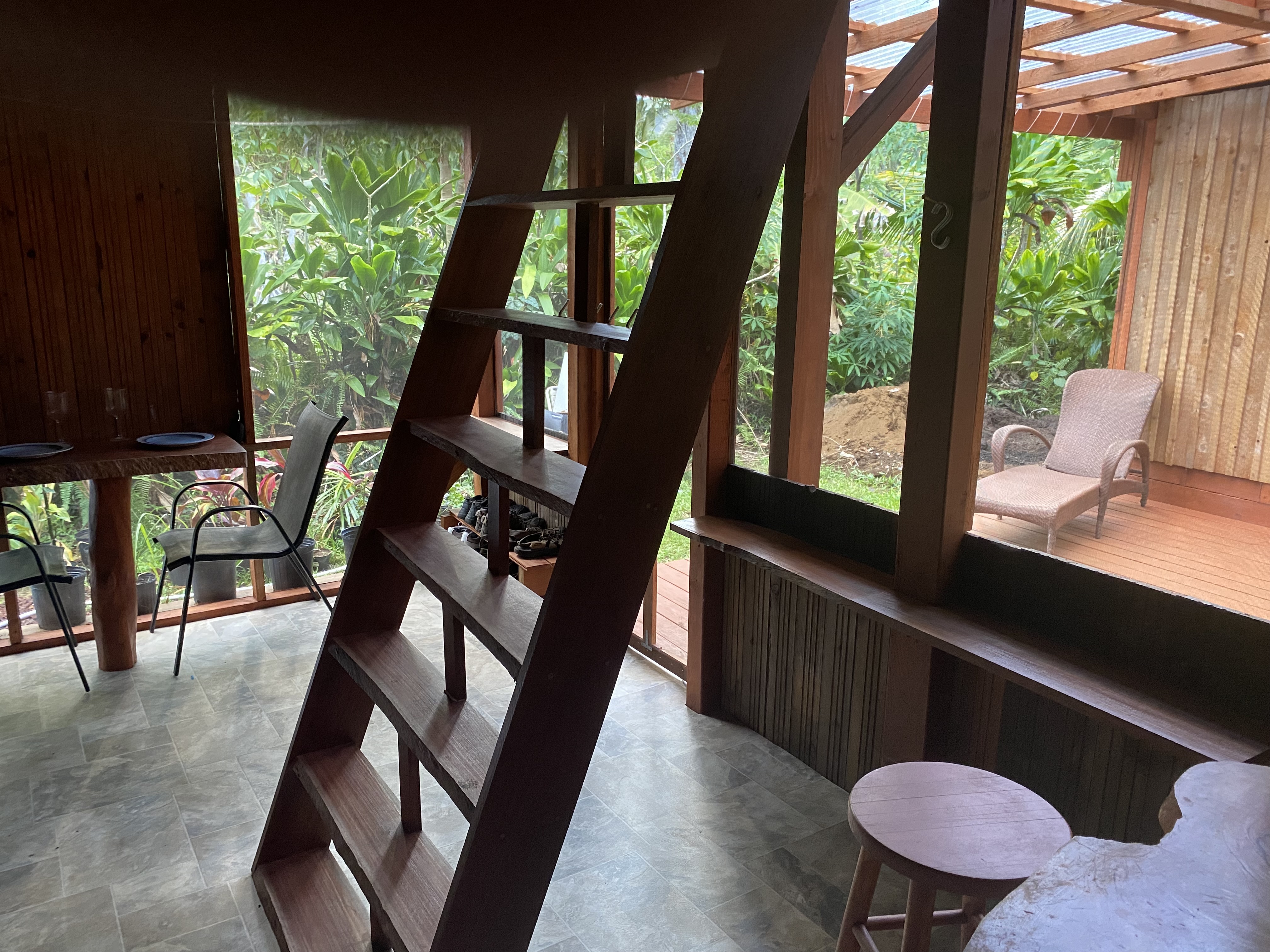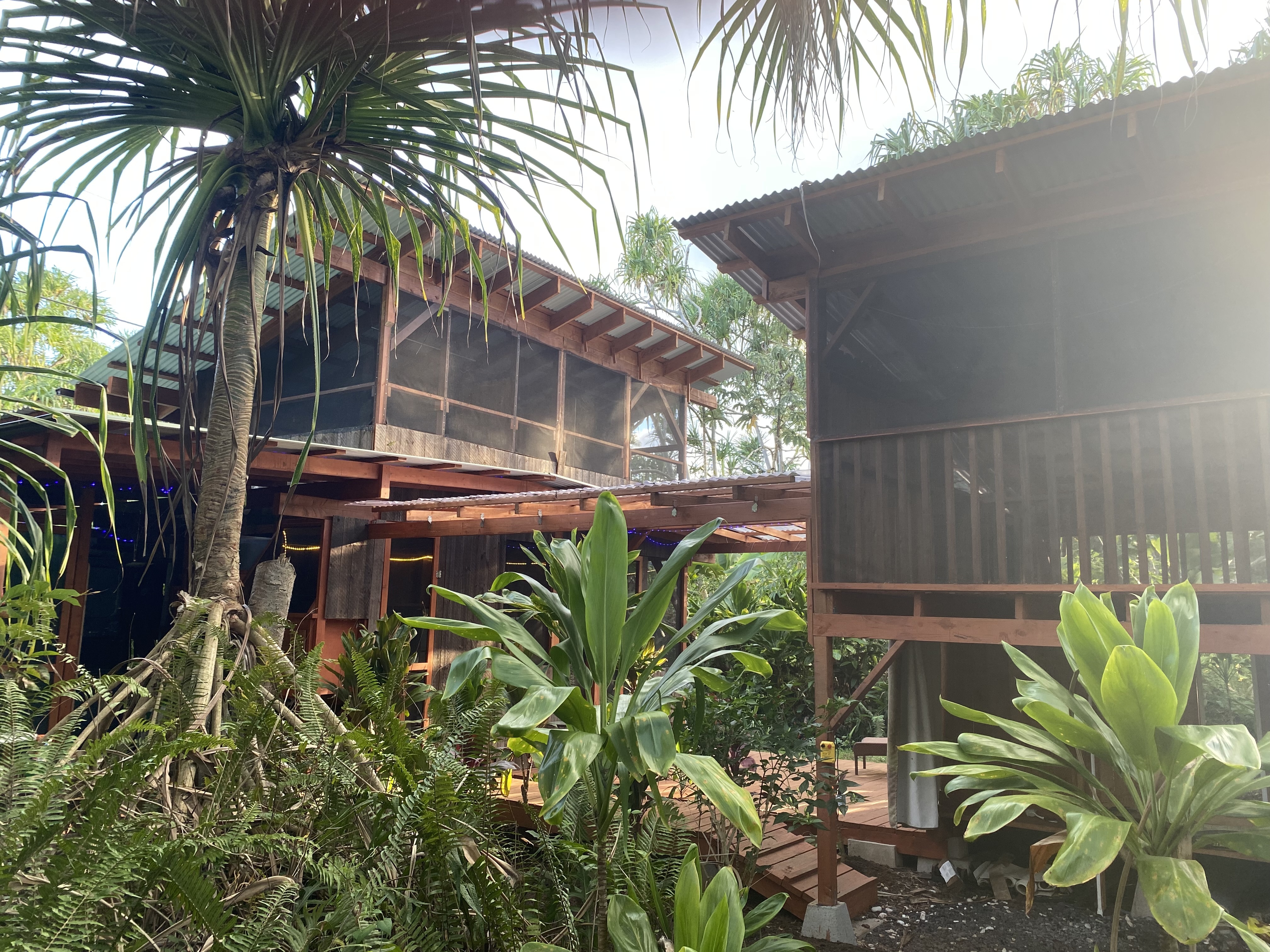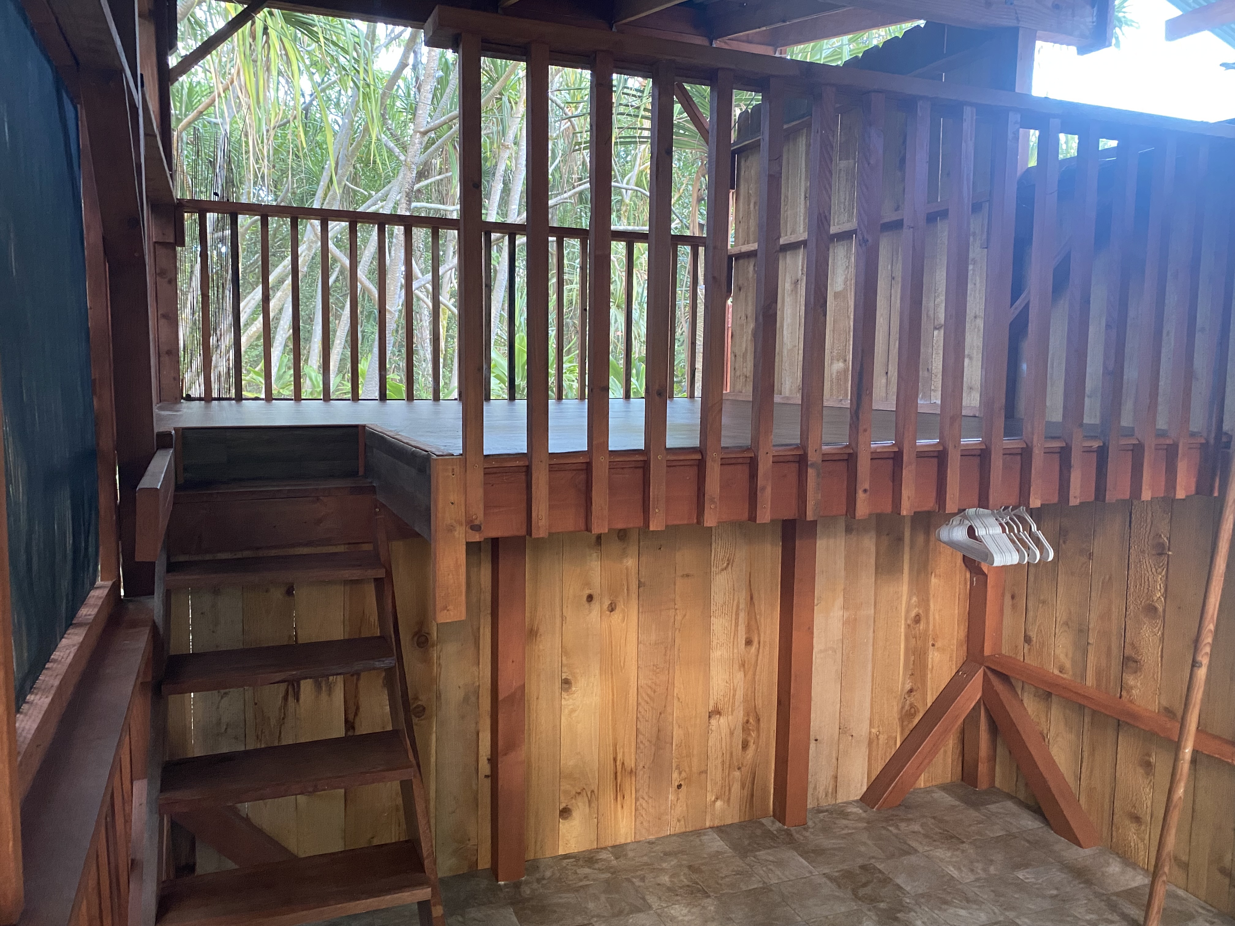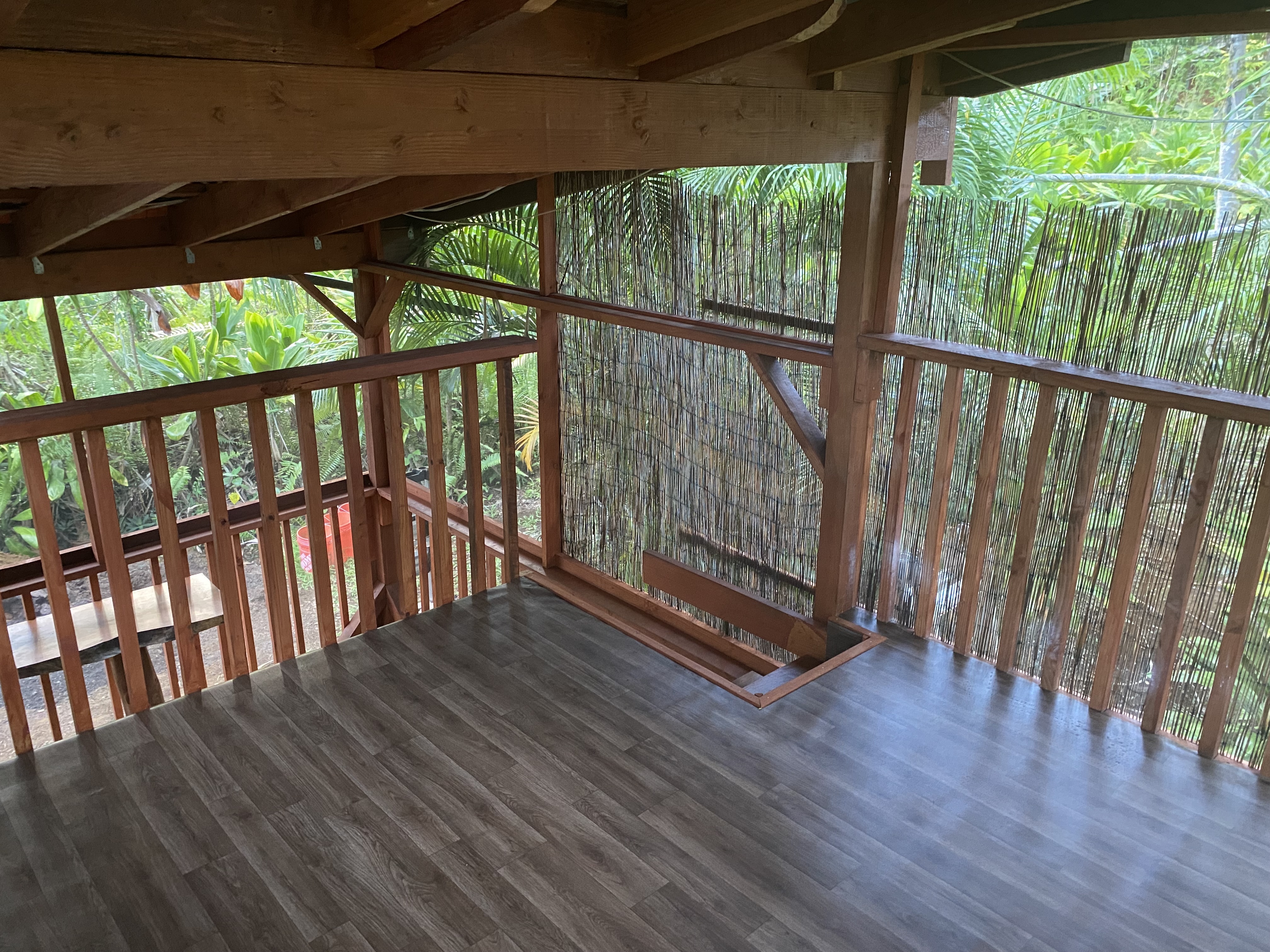 Two fully screened-in rooms are separated by a covered lanai, totaling approximately 350 sq. ft., with loft spaces above both rooms. Distinctive “ghost wood” siding blends seamlessly with the jungle setting, while local hardwoods add warmth and character throughout.