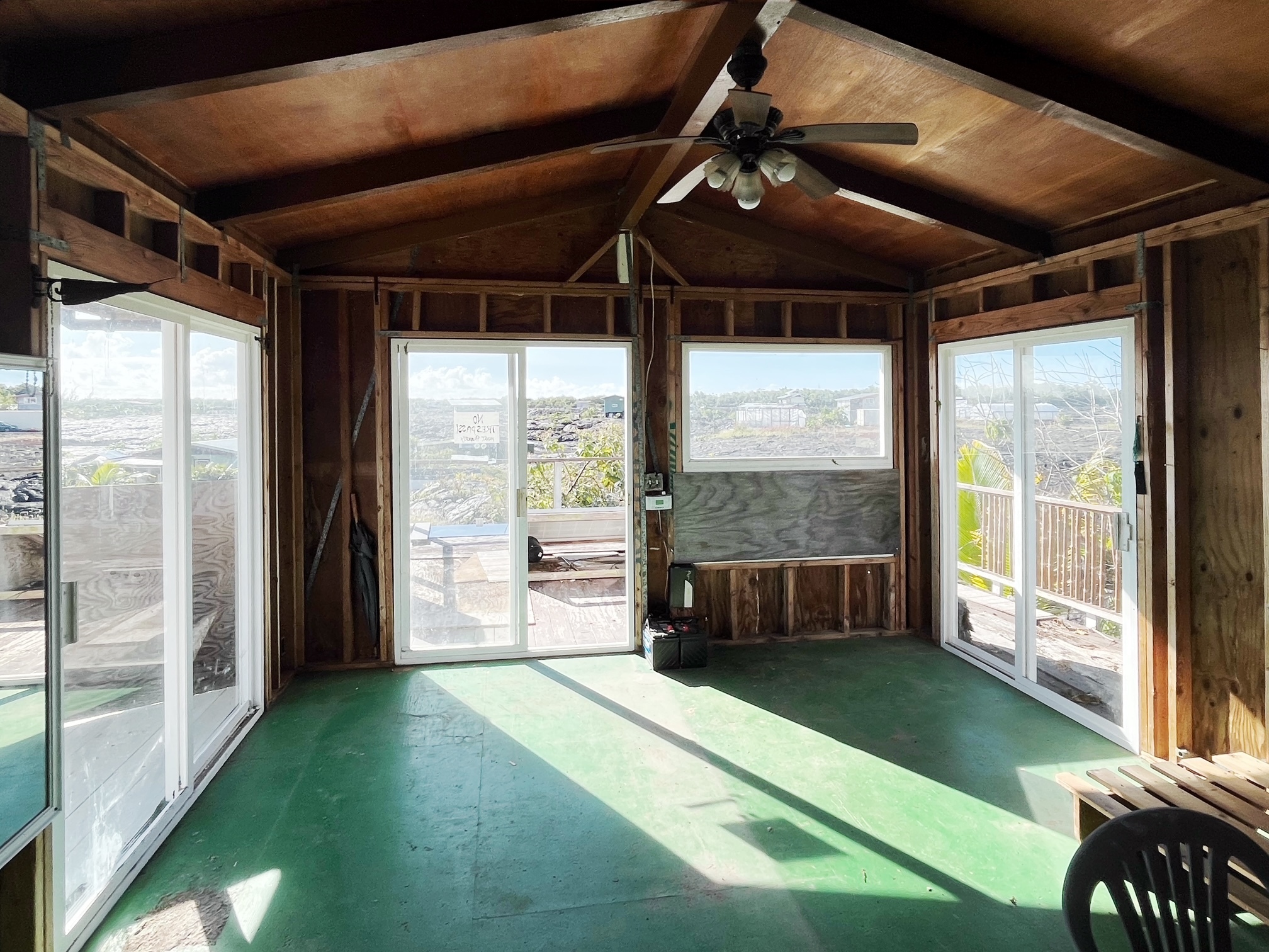 Enjoy the sunny climate and ocean views of seaside Kalapana Vacation Lots (also known as Kalapana Gardens). This initially well-constructed tiny home has fallen into disrepair in recent years, with most of the issues concentrated around the decking. Yes, repairs are needed–but the core structure appears to be in serviceable condition, offering a strong starting point for a comfortable small home. With the rising cost of new construction and building materials, this fixer presents an excellent opportunity to get ahead without starting from scratch. Bring your vision and restore this property into a charming island retreat in a unique Hawai'i coastal setting.