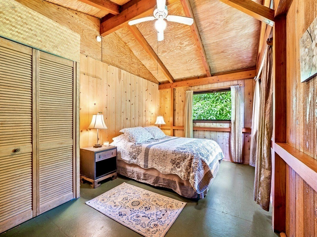 The home radiates Hawaiian country charm, with cedar walls, vaulted open-beam ceilings, bamboo accents, and expansive windows framing lush scenery. The upstairs grand bedroom features panoramic views, vaulted ceilings, and a private balcony. A tropical outdoor bathtub and shower surrounded by exotic foliage create your own spa oasis.