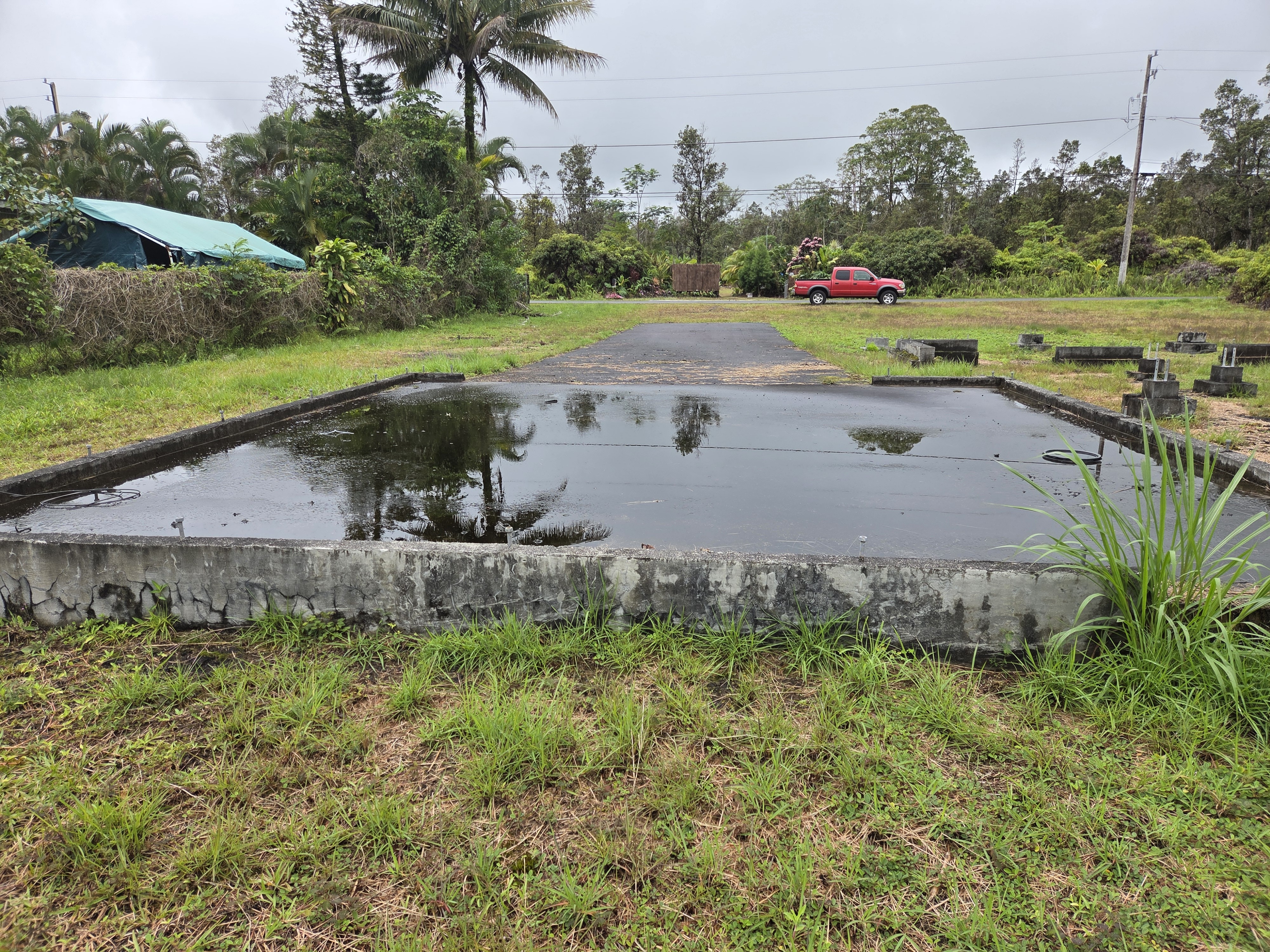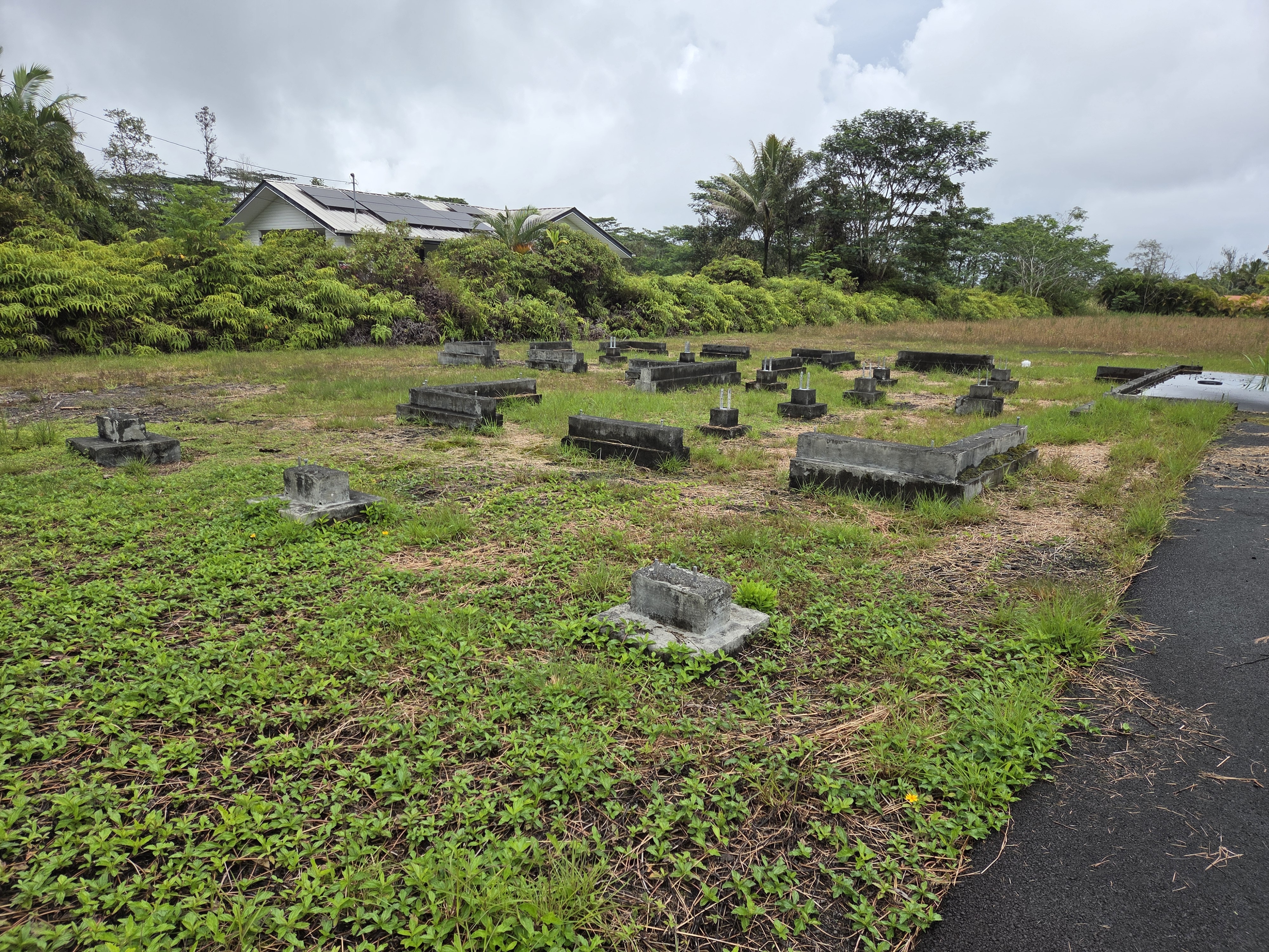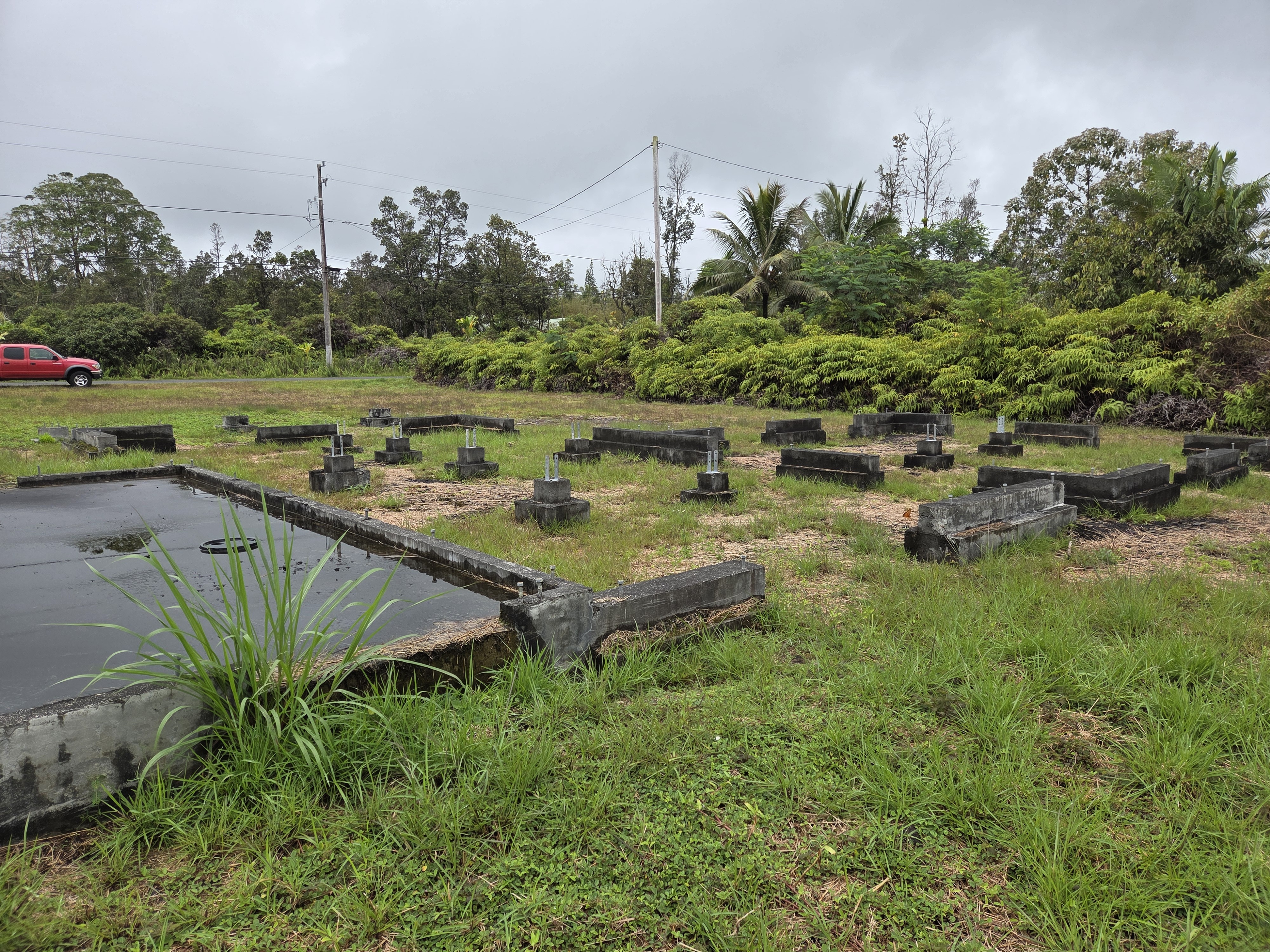 Here's your chance to own an improved acre on pavement in Leilani Estates. Improvements include: permitted cesspool, inspected and completed foundation, concrete slap for a carport and cement catchment ring. The house plans from 2016 have expired with county.