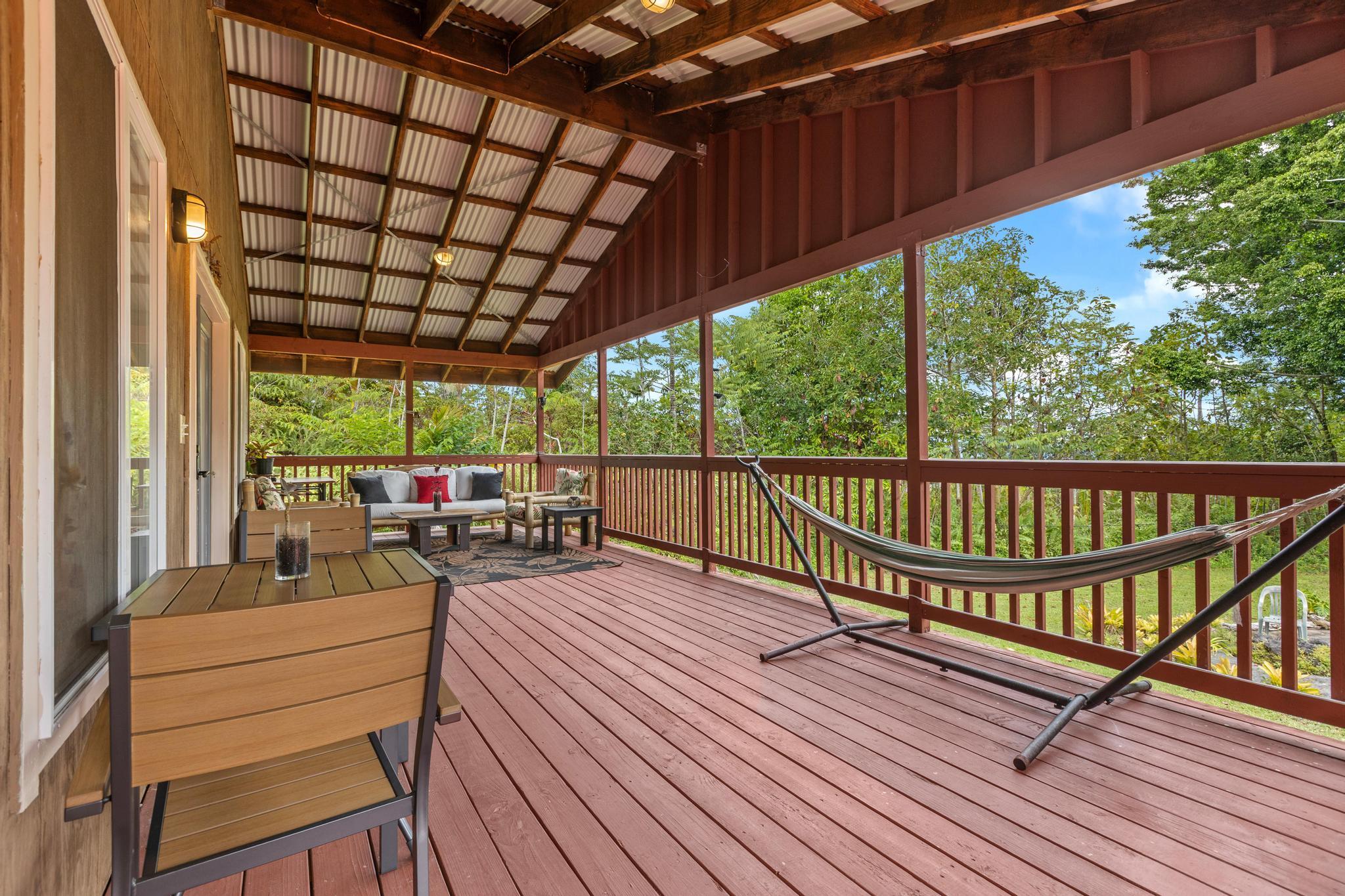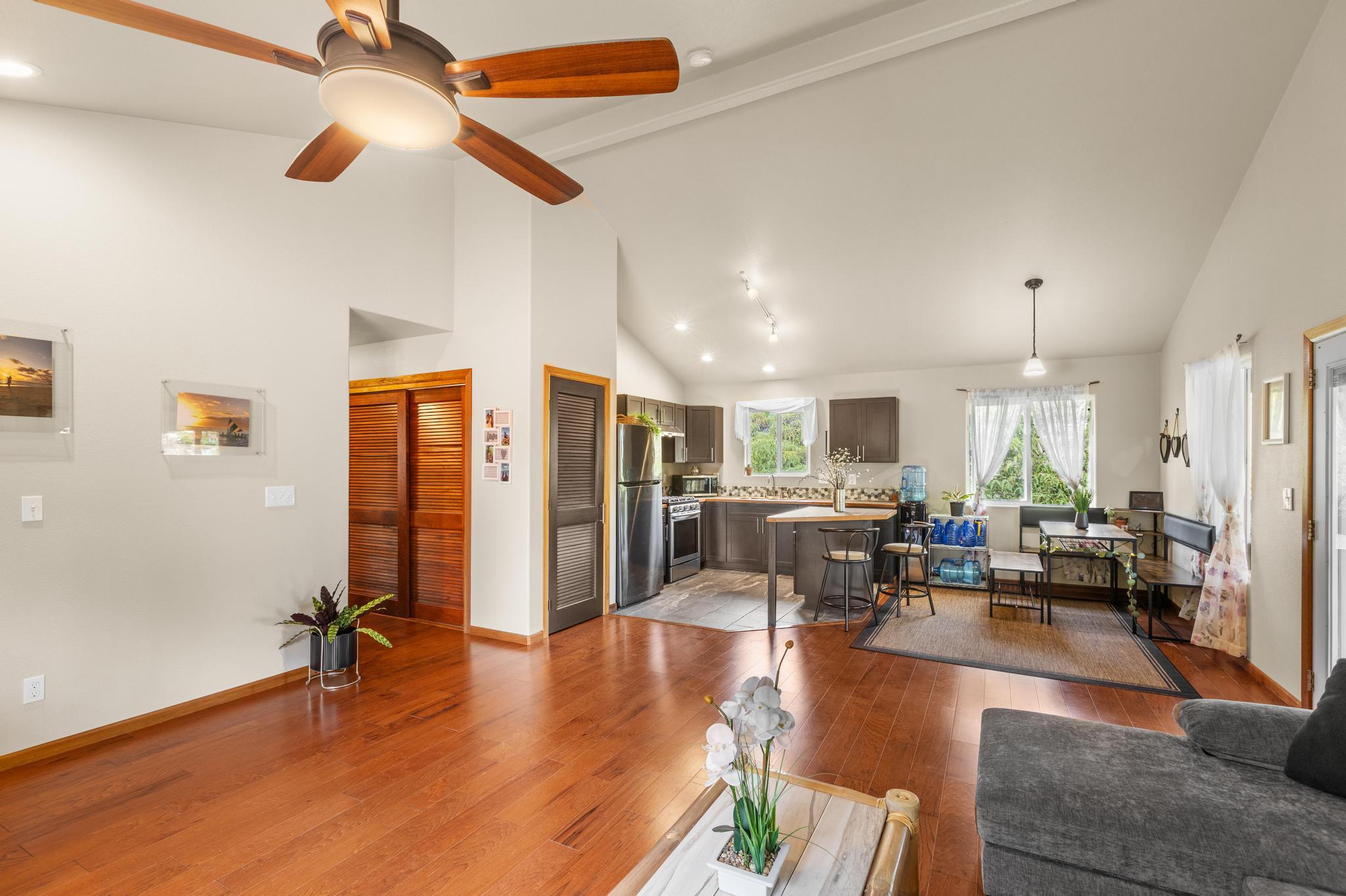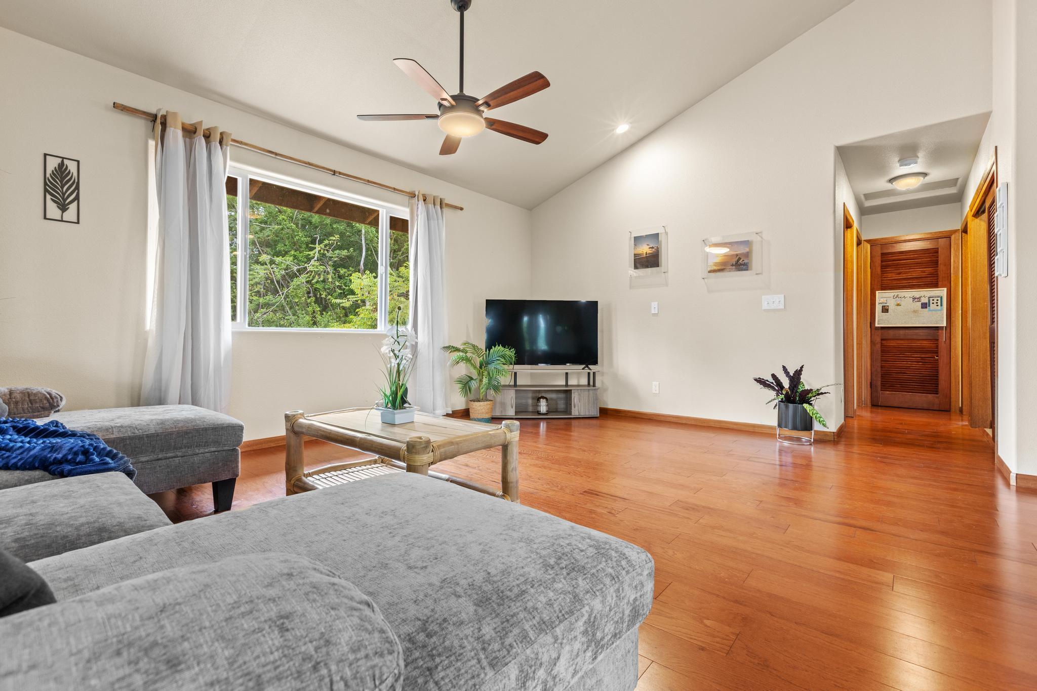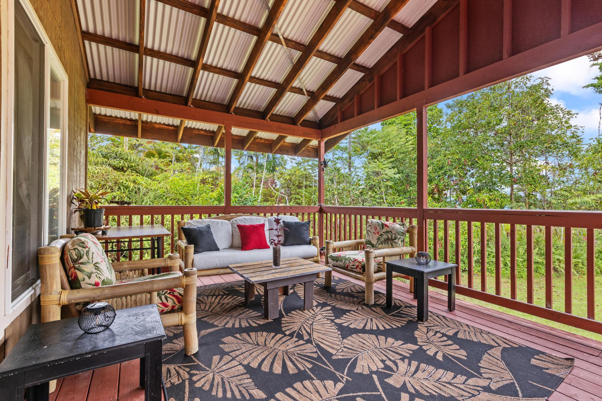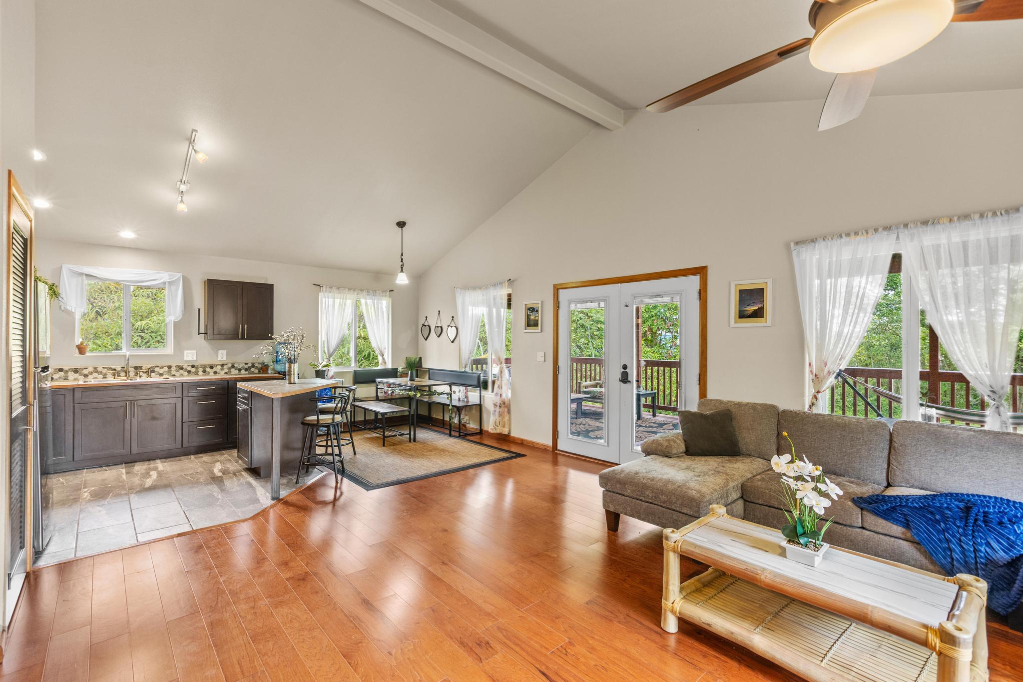 Built in 2017, this inviting 2-bedroom, 2-bathroom home sits on a SQUARE like shape acre in lush and beautiful subdivision. A spacious covered front lanai welcomes you with room for outdoor dining, lounging, and entertaining. Step inside through double French doors to a bright and cozy living area, featuring large picture windows that capture tropical garden views and gentle trade winds.