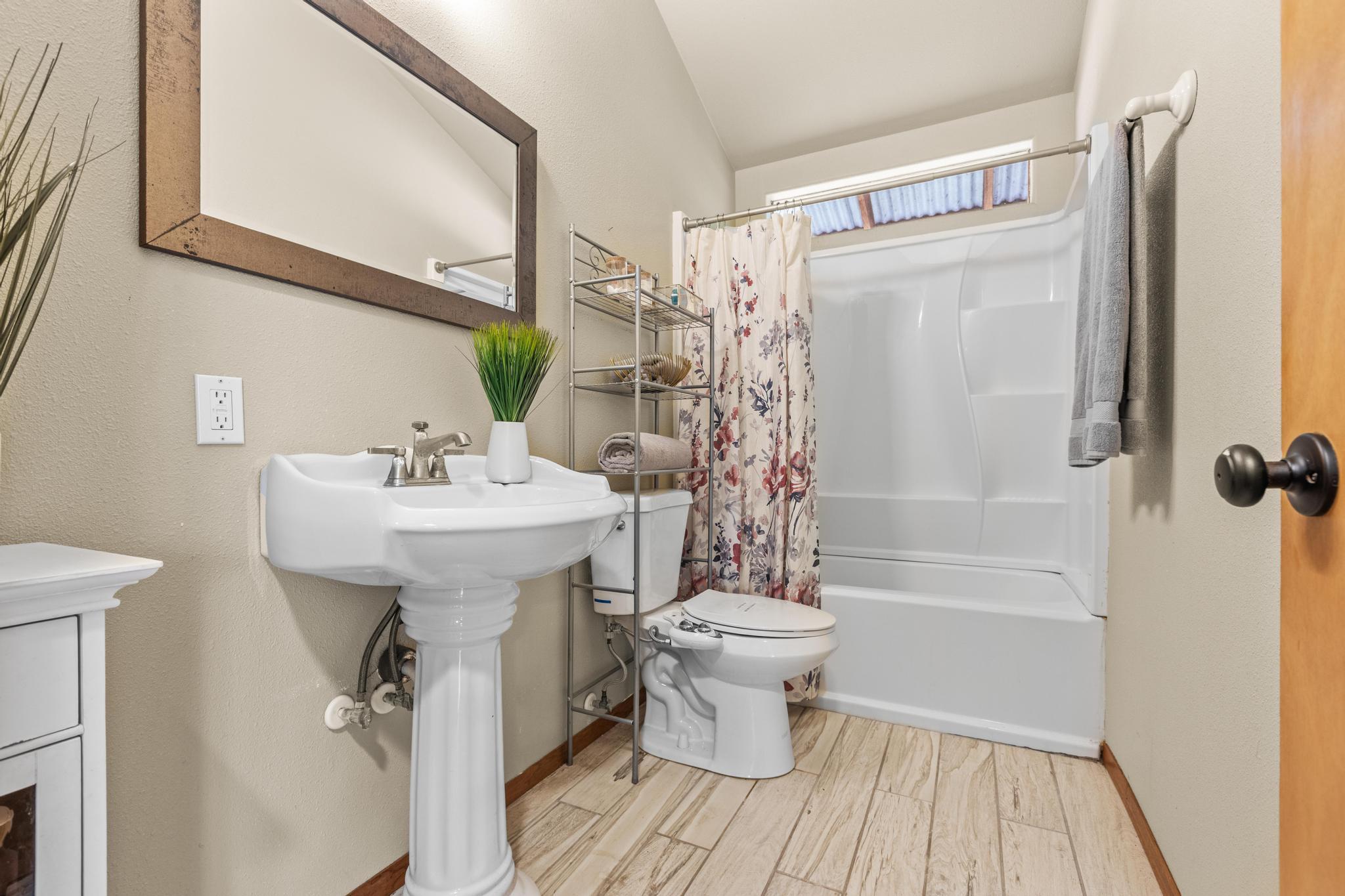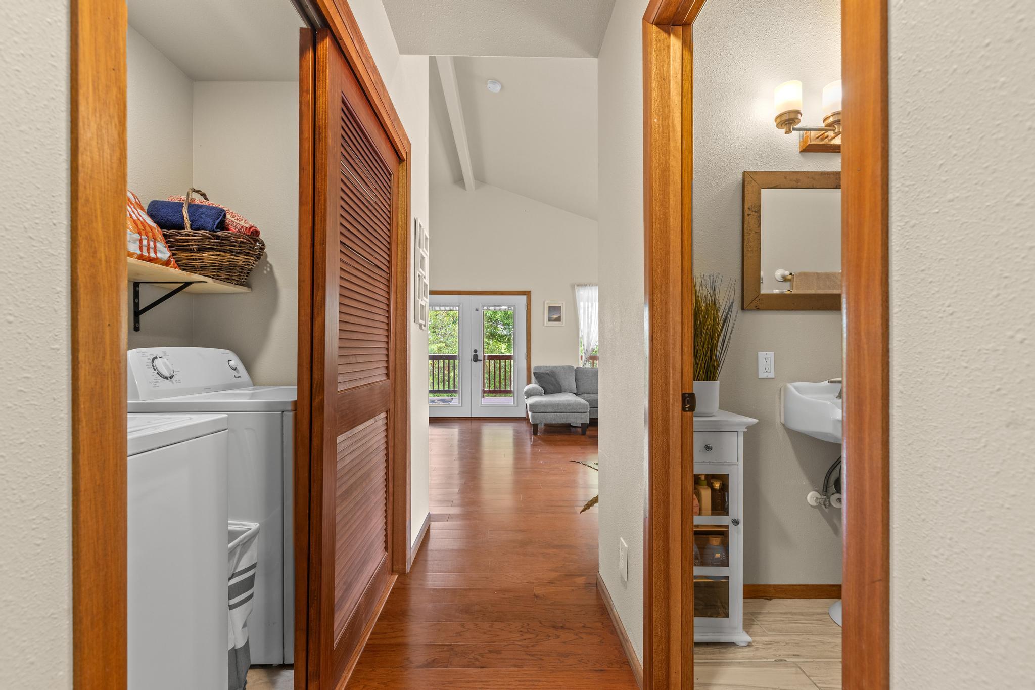 The open dining and kitchen space makes everyday living a breeze. The kitchen is well-appointed with soft-close wood cabinetry, stainless steel appliances, ceramic tile flooring, matching countertops, and a center island with bar seating; plus, a pullout trash drawer and Lazy Susan. The primary suite includes its own ensuite bathroom, while the guest bedroom and full guest bath are thoughtfully placed for comfort and convenience.