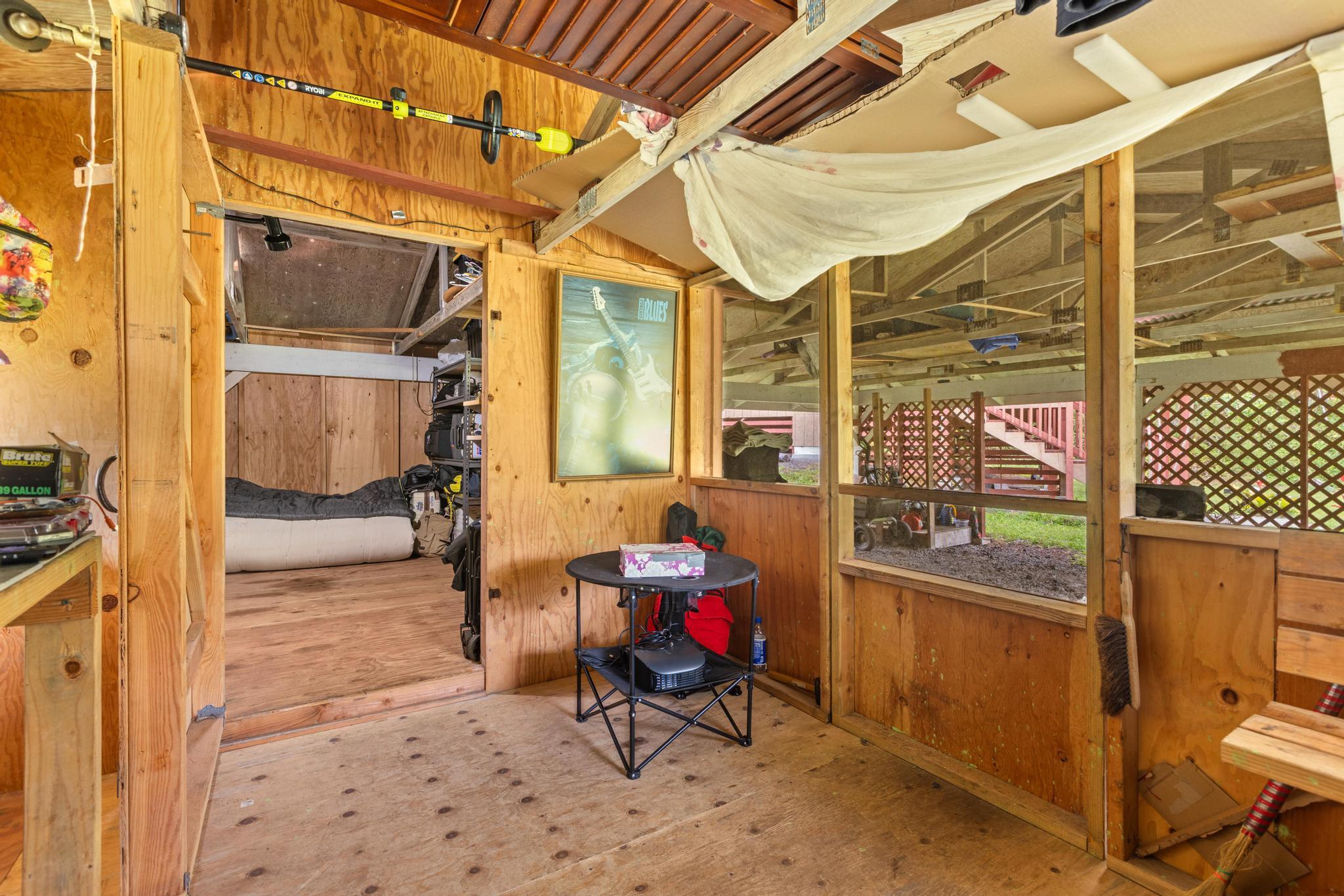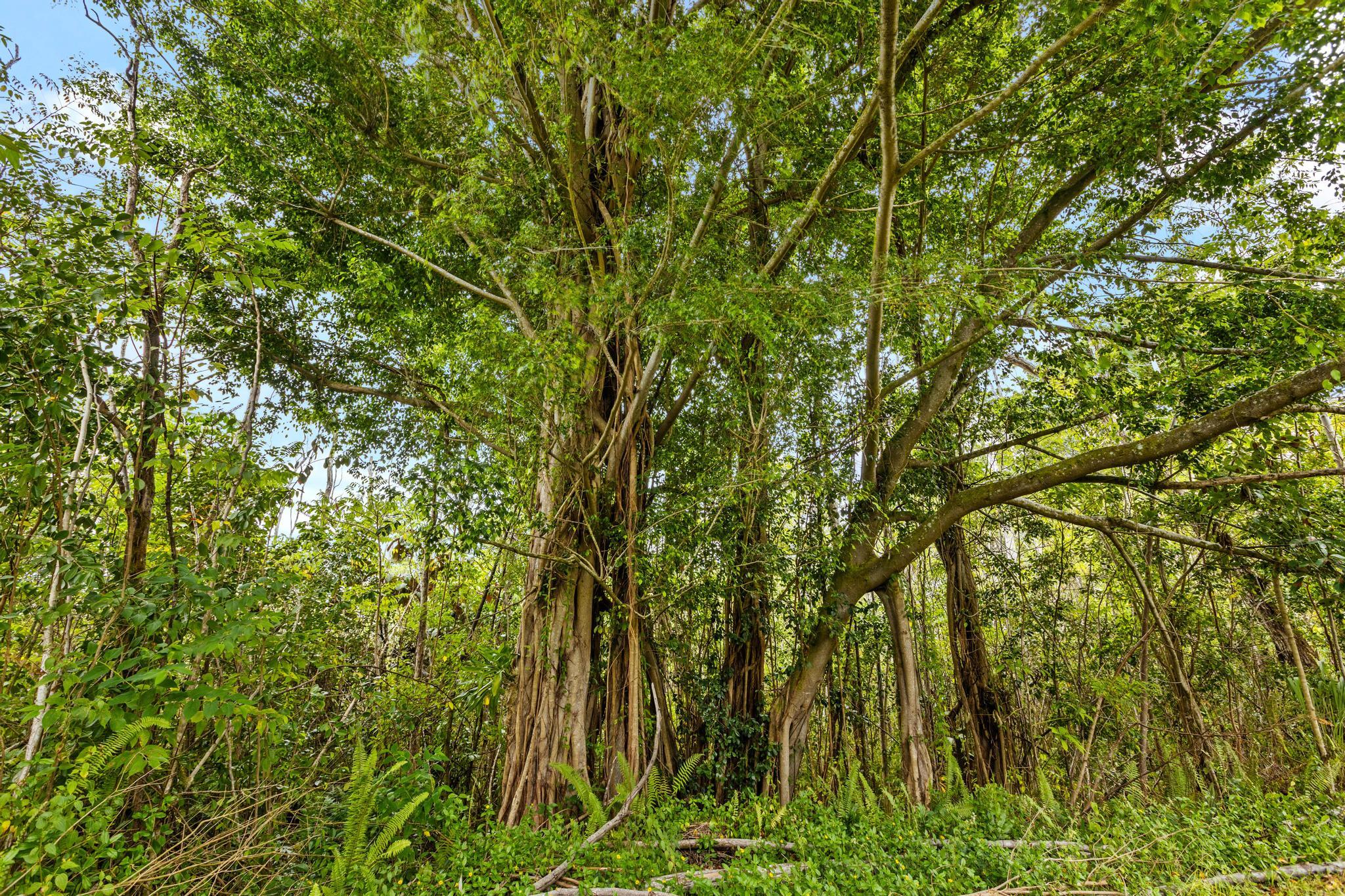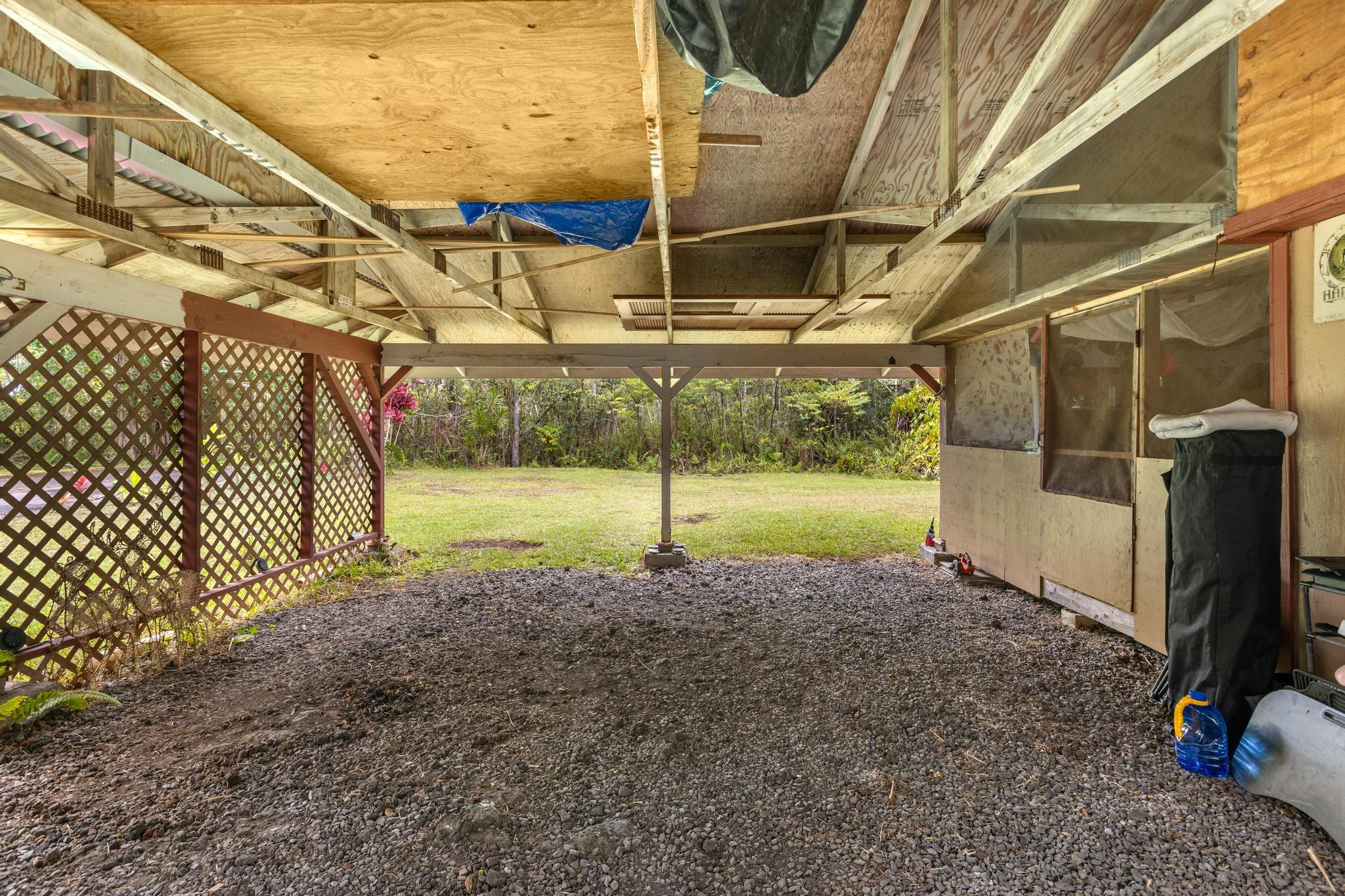 An approximate 576sqft carport with an enclosed storage area provides flexible space for parking, a workshop, or hobby use. The property includes a 10,000-gallon approx catchment system and a gated entrance. About half of the acre remains untouched, perfect for maintaining privacy or developing into a garden, orchard, or additional landscaping. A majestic banyan tree graces the corner of the lot.