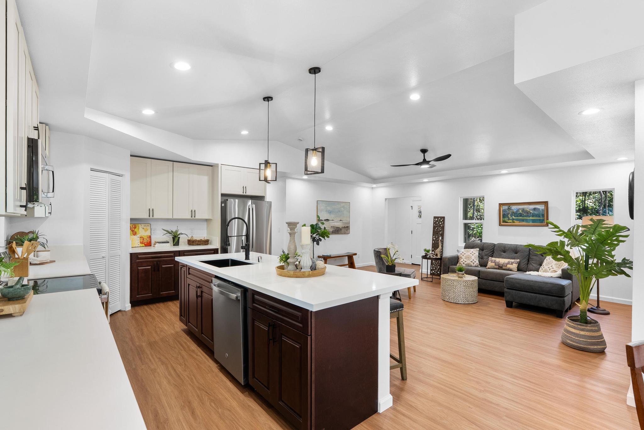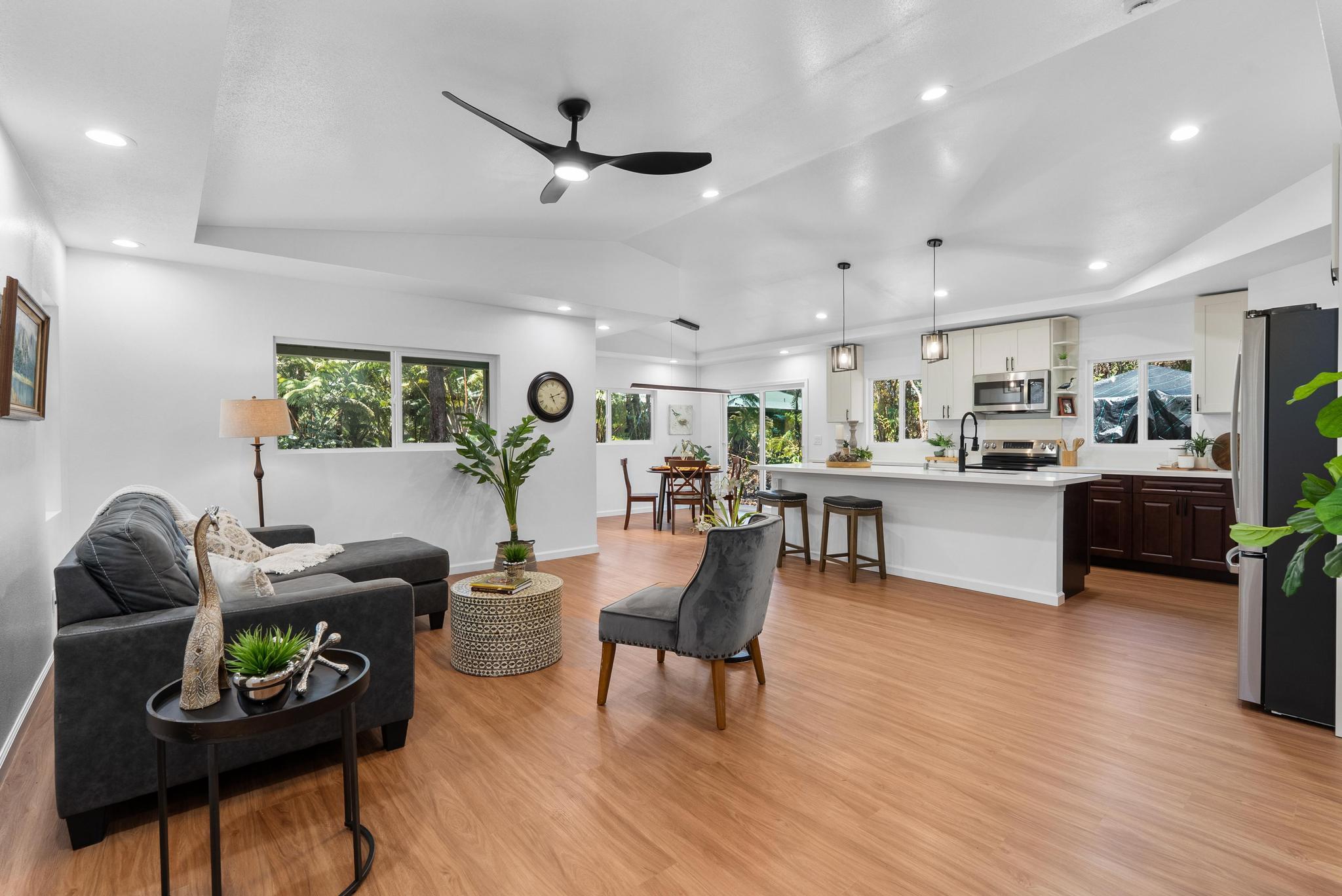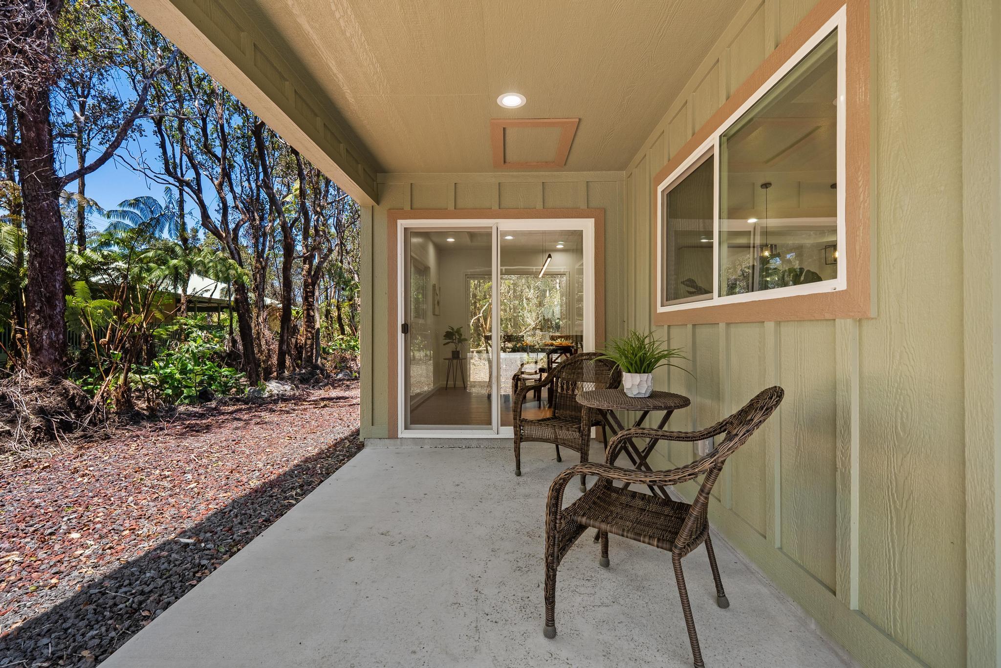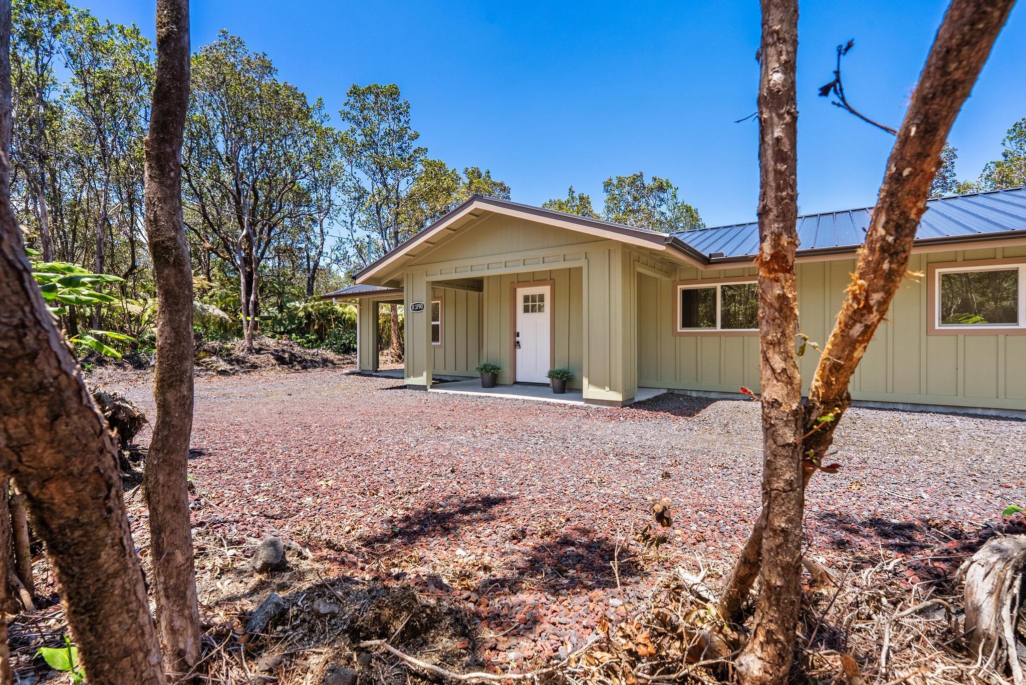 Tucked away on a dead end, paved road in peaceful Mauna Loa Estates, this 3 bedroom, 2 bath home is a hidden retreat surrounded by lush native forest. The 20,000 sq ft lot is beautifully framed by towering Ohia trees, wild ginger, and graceful hapuu ferns, creating the ultimate sense of privacy and natural beauty. At the Volcano elevation, the air is cooler, the pace slower, and the serenity unmatched. Step inside and be welcomed by soaring open beam ceilings, natural light, and a spacious great room designed for relaxation and connection. The kitchen is a showpiece an entertainer’s dream featuring an extra large island with an integrated sink, pantry, dishwasher, and plenty of counter space for creative cooking or hosting friends. Each bedroom is generously sized with ample storage, offering comfort for full-time living or vacation stays. The primary suite opens to a tranquil back lanai, perfect for morning coffee or evening unwinding while listening to native birdsong. The primary bath includes a sleek walk-in shower, combining elegance and simplicity. This property captures the artistic spirit of Volcano just minutes from Volcano Village galleries, farmers’ markets, and Hawaii Volcanoes National Park, where the energy of the earth creates a constant sense of wonder. Whether you’re drawn to the crisp mountain air, the cooling mist, or the lush native landscape, this home offers a peaceful, grounding lifestyle unlike anywhere else on the island. Experience the connection between art, nature, and home right here in Mauna Loa Estates.