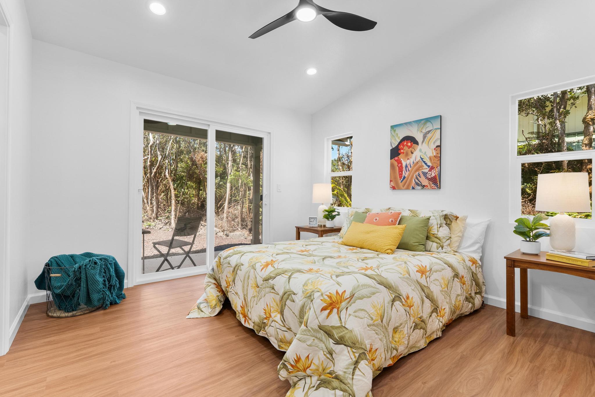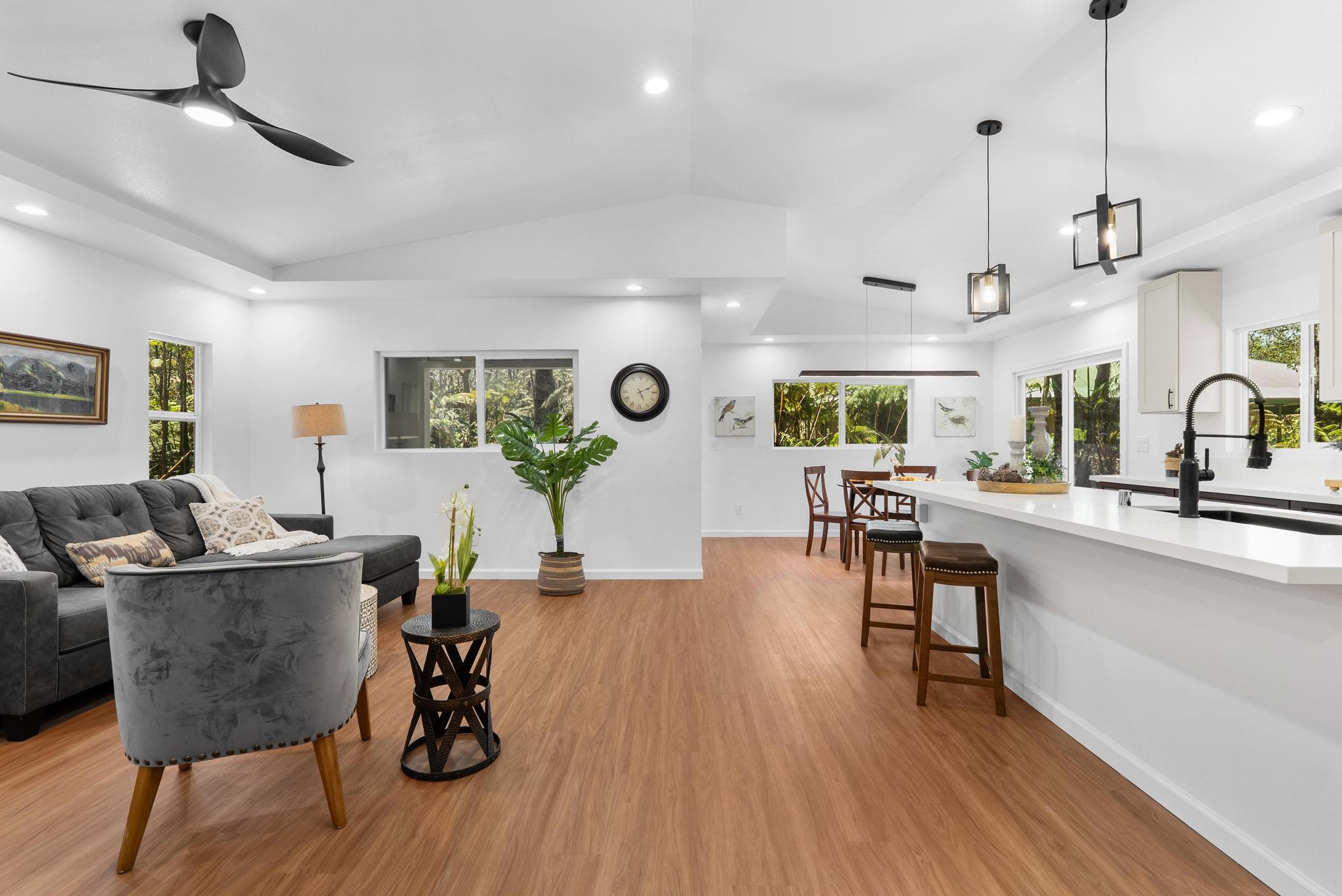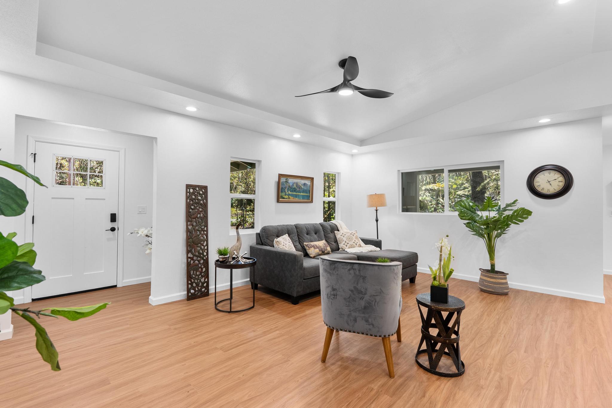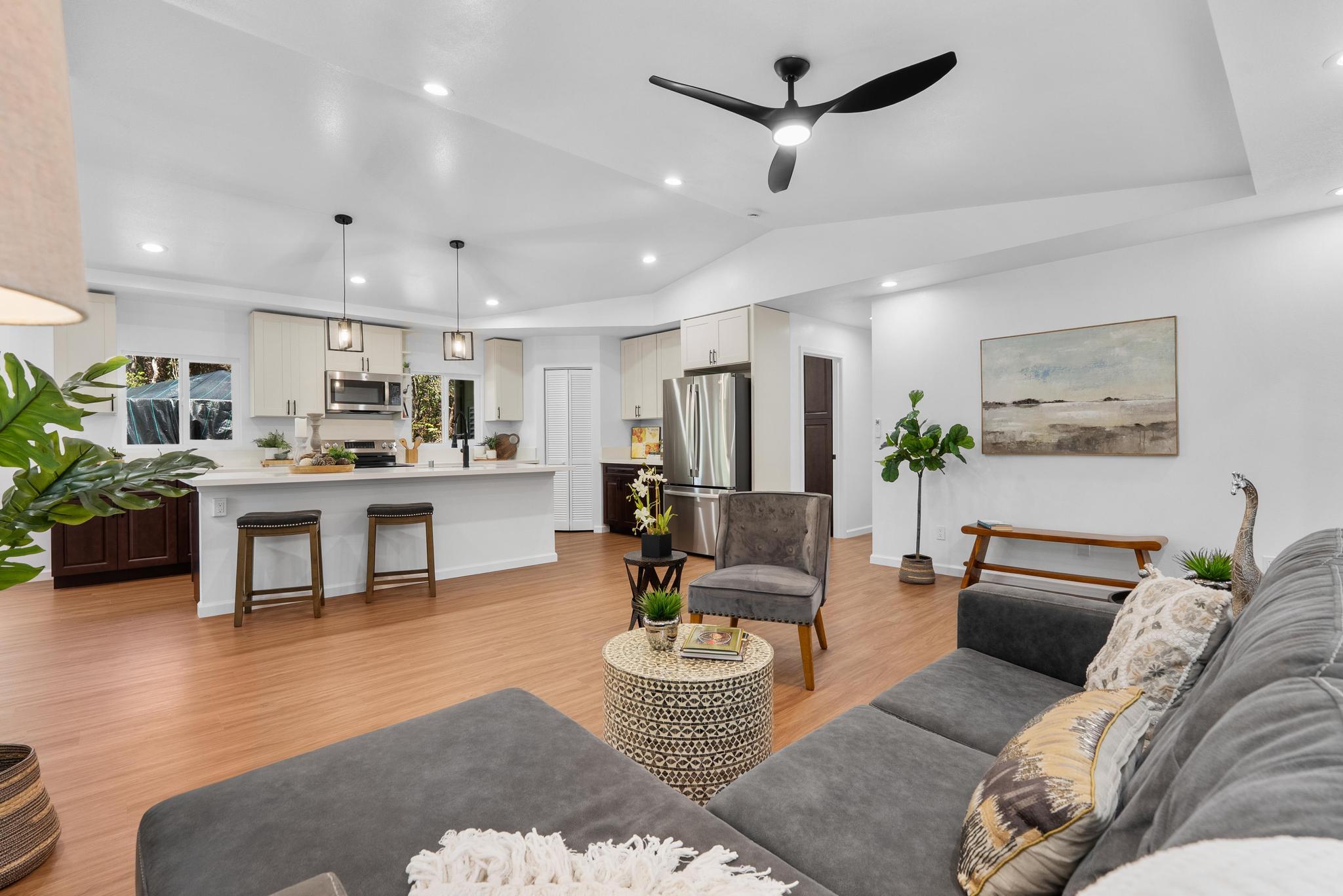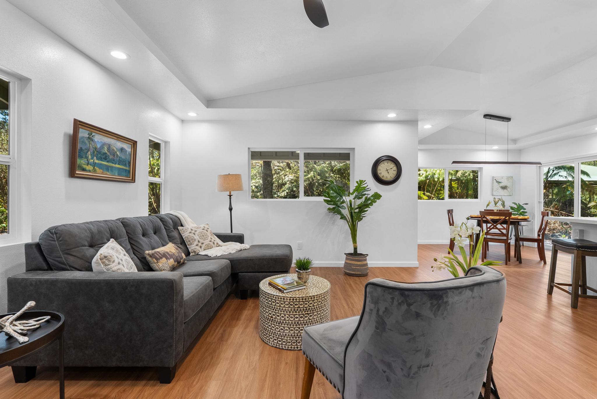 Tucked away on a dead end, paved road in peaceful Mauna Loa Estates, this 3 bedroom, 2 bath home is a hidden retreat surrounded by lush native forest. The 20,000 sq ft lot is beautifully framed by towering Ohia trees, wild ginger, and graceful hapuu ferns, creating the ultimate sense of privacy and natural beauty. At the Volcano elevation, the air is cooler, the pace slower, and the serenity unmatched. Step inside and be welcomed by soaring open beam ceilings, natural light, and a spacious great room designed for relaxation and connection. The kitchen is a showpiece an entertainer’s dream featuring an extra large island with an integrated sink, pantry, dishwasher, and plenty of counter space for creative cooking or hosting friends. Each bedroom is generously sized with ample storage, offering comfort for full-time living or vacation stays. The primary suite opens to a tranquil back lanai, perfect for morning coffee or evening unwinding while listening to native birdsong. The primary bath includes a sleek walk-in shower, combining elegance and simplicity. This property captures the artistic spirit of Volcano just minutes from Volcano Village galleries, farmers’ markets, and Hawaii Volcanoes National Park, where the energy of the earth creates a constant sense of wonder. Whether you’re drawn to the crisp mountain air, the cooling mist, or the lush native landscape, this home offers a peaceful, grounding lifestyle unlike anywhere else on the island. Experience the connection between art, nature, and home right here in Mauna Loa Estates.