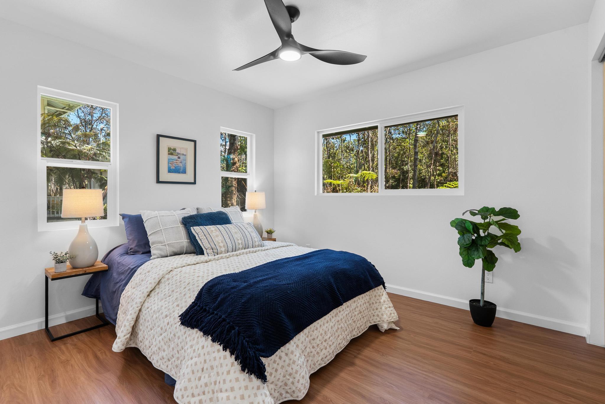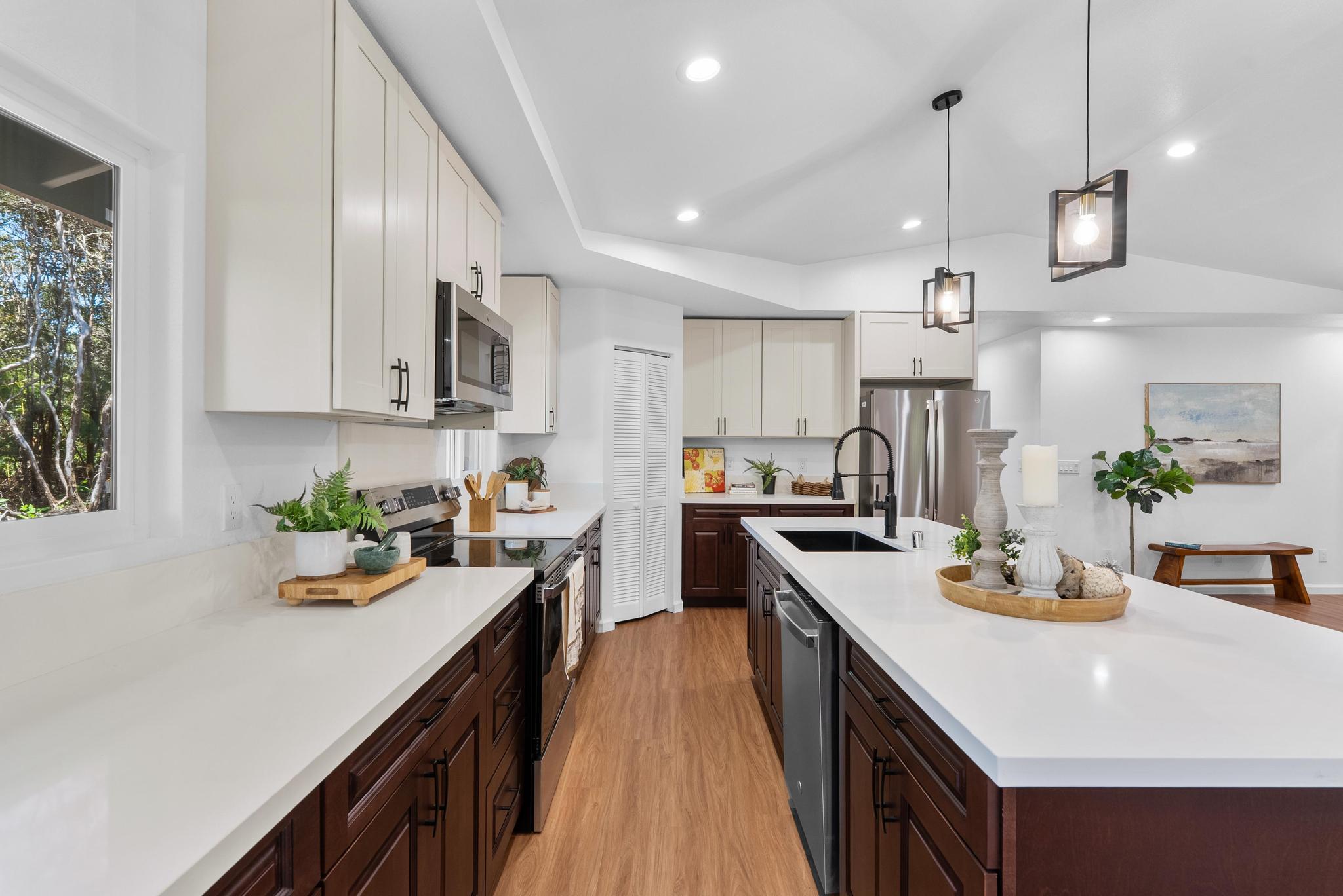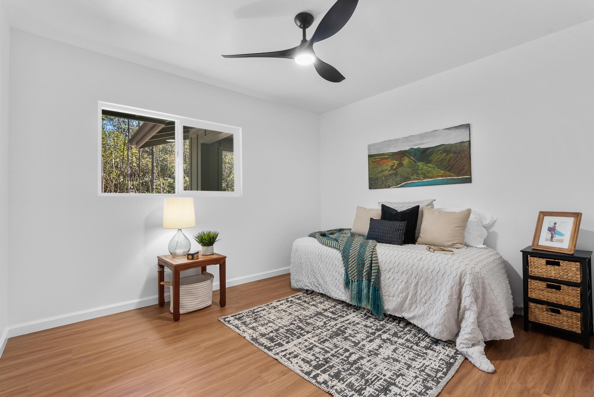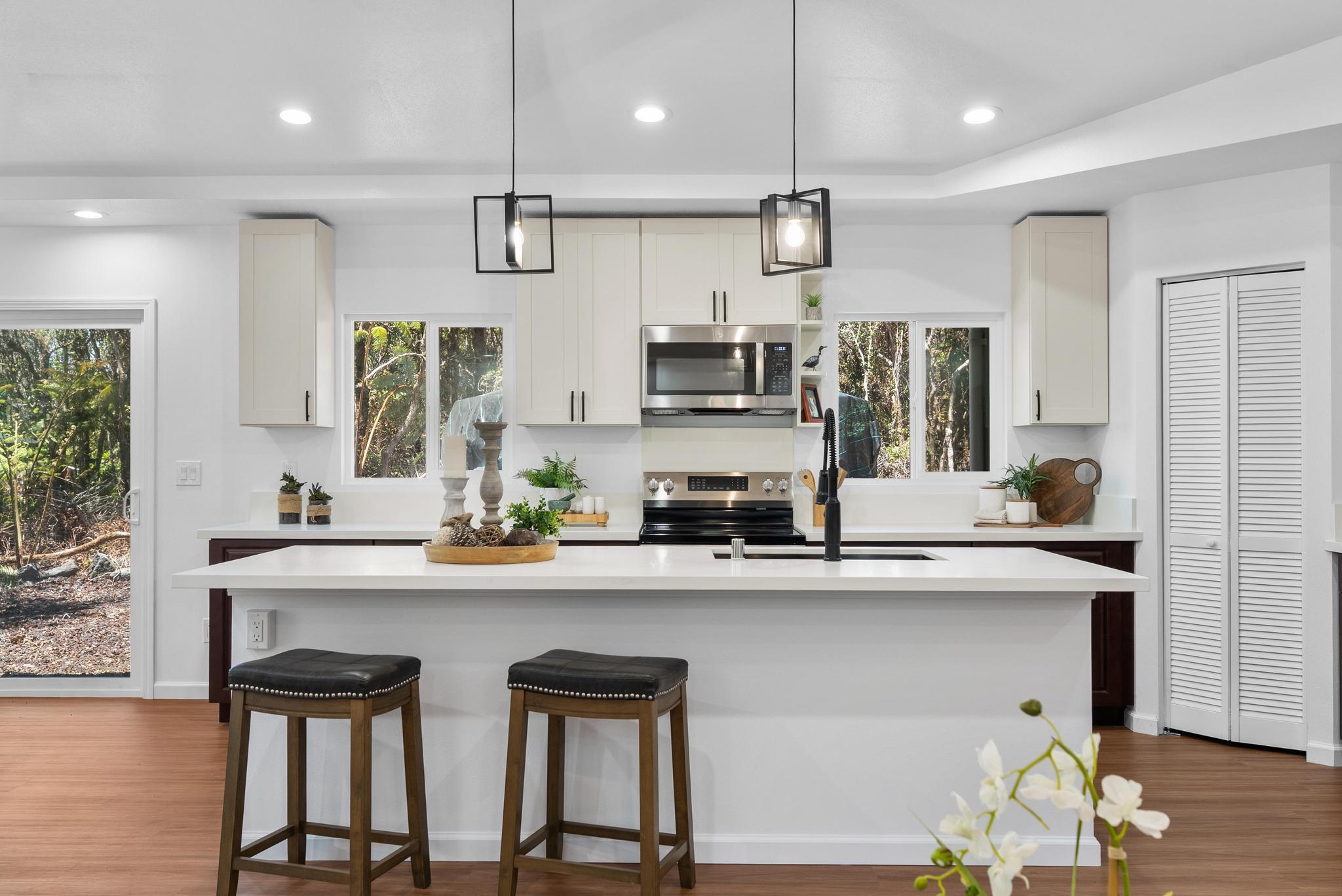 Tucked away on a dead end, paved road in peaceful Mauna Loa Estates, this 3 bedroom, 2 bath home is a hidden retreat surrounded by lush native forest. The 20,000 sq ft lot is beautifully framed by towering Ohia trees, wild ginger, and graceful hapuu ferns, creating the ultimate sense of privacy and natural beauty. At the Volcano elevation, the air is cooler, the pace slower, and the serenity unmatched. Step inside and be welcomed by soaring open beam ceilings, natural light, and a spacious great room designed for relaxation and connection. The kitchen is a showpiece an entertainer’s dream featuring an extra large island with an integrated sink, pantry, dishwasher, and plenty of counter space for creative cooking or hosting friends. Each bedroom is generously sized with ample storage, offering comfort for full-time living or vacation stays. The primary suite opens to a tranquil back lanai, perfect for morning coffee or evening unwinding while listening to native birdsong. The primary bath includes a sleek walk-in shower, combining elegance and simplicity. This property captures the artistic spirit of Volcano just minutes from Volcano Village galleries, farmers’ markets, and Hawaii Volcanoes National Park, where the energy of the earth creates a constant sense of wonder. Whether you’re drawn to the crisp mountain air, the cooling mist, or the lush native landscape, this home offers a peaceful, grounding lifestyle unlike anywhere else on the island. Experience the connection between art, nature, and home right here in Mauna Loa Estates.