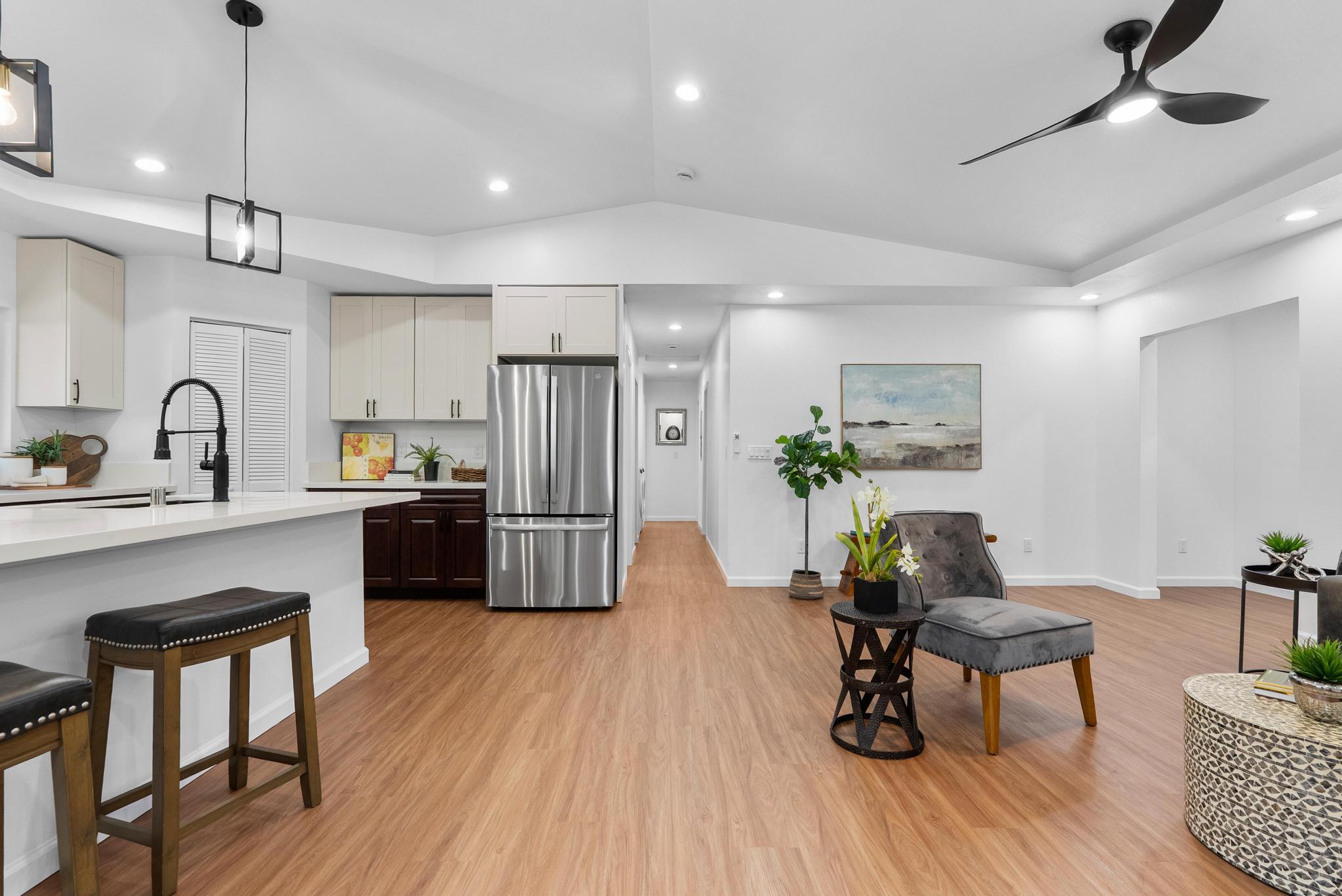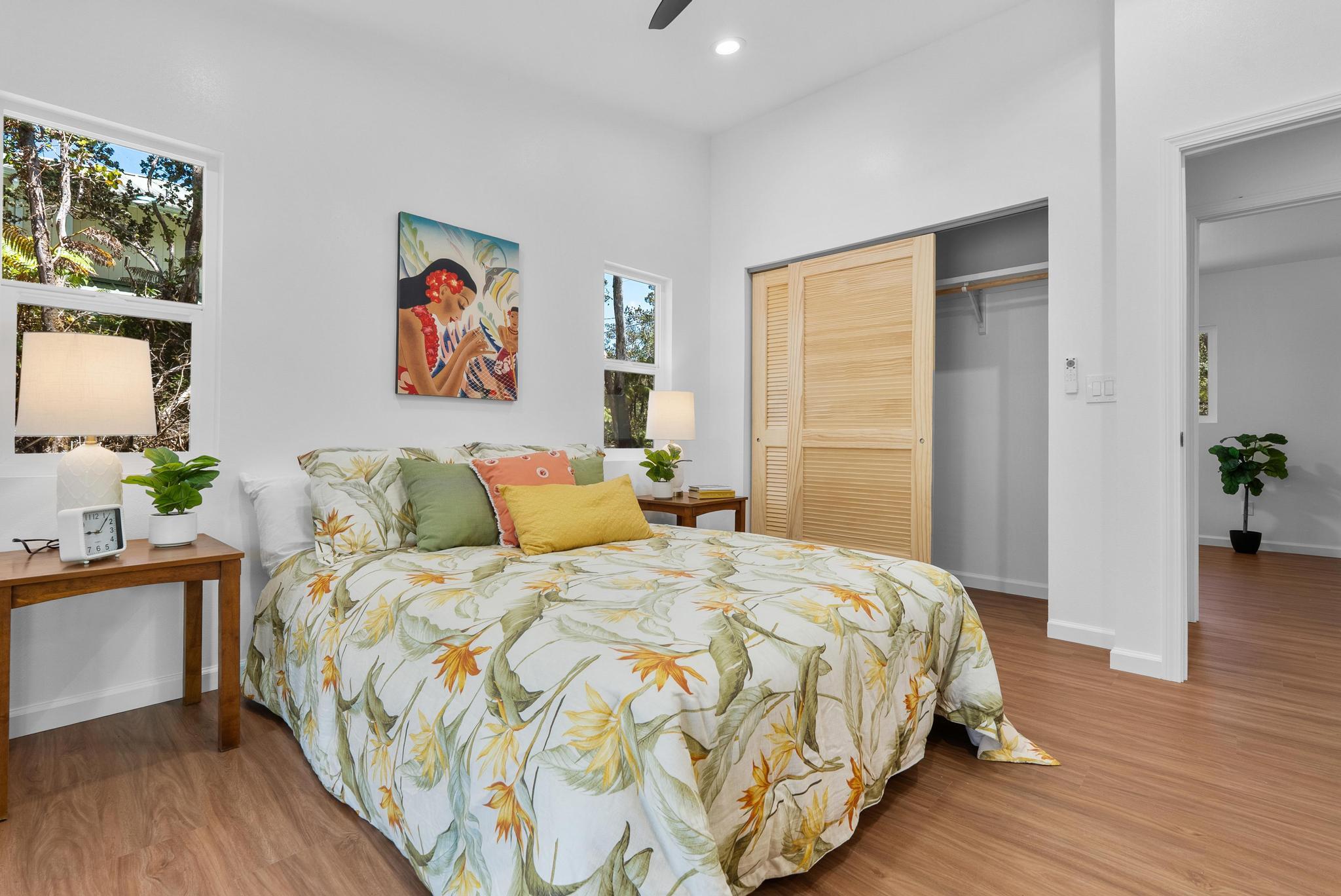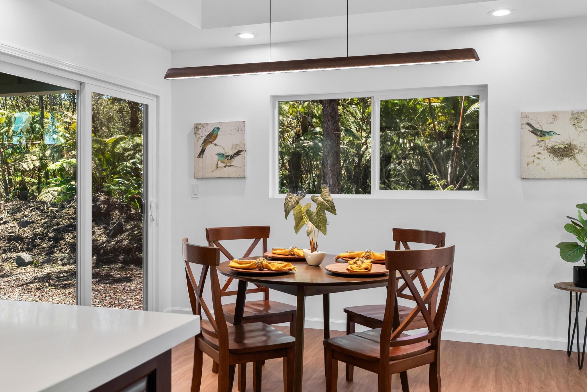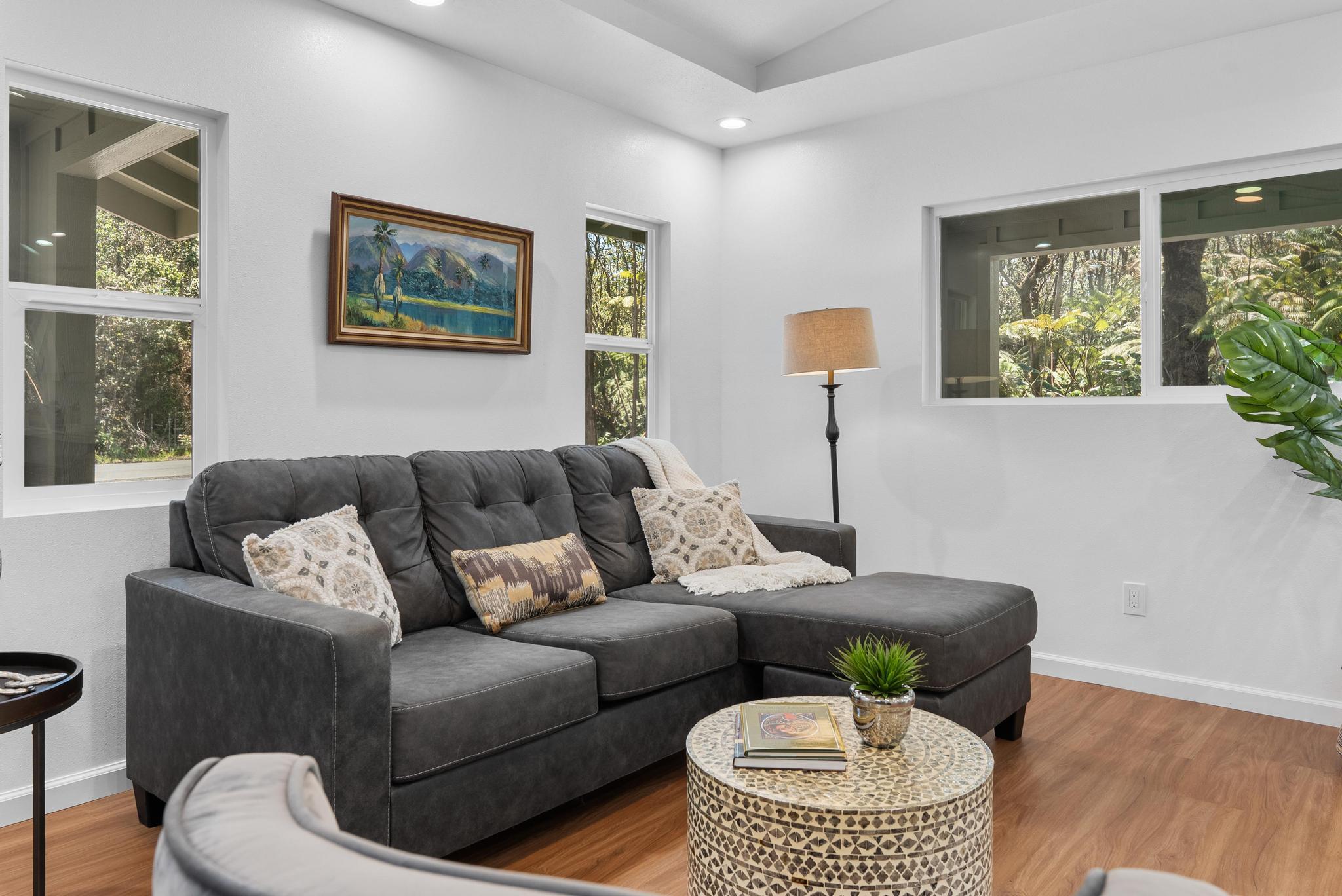 Tucked away on a dead end, paved road in peaceful Mauna Loa Estates, this 3 bedroom, 2 bath home is a hidden retreat surrounded by lush native forest. The 20,000 sq ft lot is beautifully framed by towering Ohia trees, wild ginger, and graceful hapuu ferns, creating the ultimate sense of privacy and natural beauty. At the Volcano elevation, the air is cooler, the pace slower, and the serenity unmatched. Step inside and be welcomed by soaring open beam ceilings, natural light, and a spacious great room designed for relaxation and connection. The kitchen is a showpiece an entertainer’s dream featuring an extra large island with an integrated sink, pantry, dishwasher, and plenty of counter space for creative cooking or hosting friends. Each bedroom is generously sized with ample storage, offering comfort for full-time living or vacation stays. The primary suite opens to a tranquil back lanai, perfect for morning coffee or evening unwinding while listening to native birdsong. The primary bath includes a sleek walk-in shower, combining elegance and simplicity. This property captures the artistic spirit of Volcano just minutes from Volcano Village galleries, farmers’ markets, and Hawaii Volcanoes National Park, where the energy of the earth creates a constant sense of wonder. Whether you’re drawn to the crisp mountain air, the cooling mist, or the lush native landscape, this home offers a peaceful, grounding lifestyle unlike anywhere else on the island. Experience the connection between art, nature, and home right here in Mauna Loa Estates.