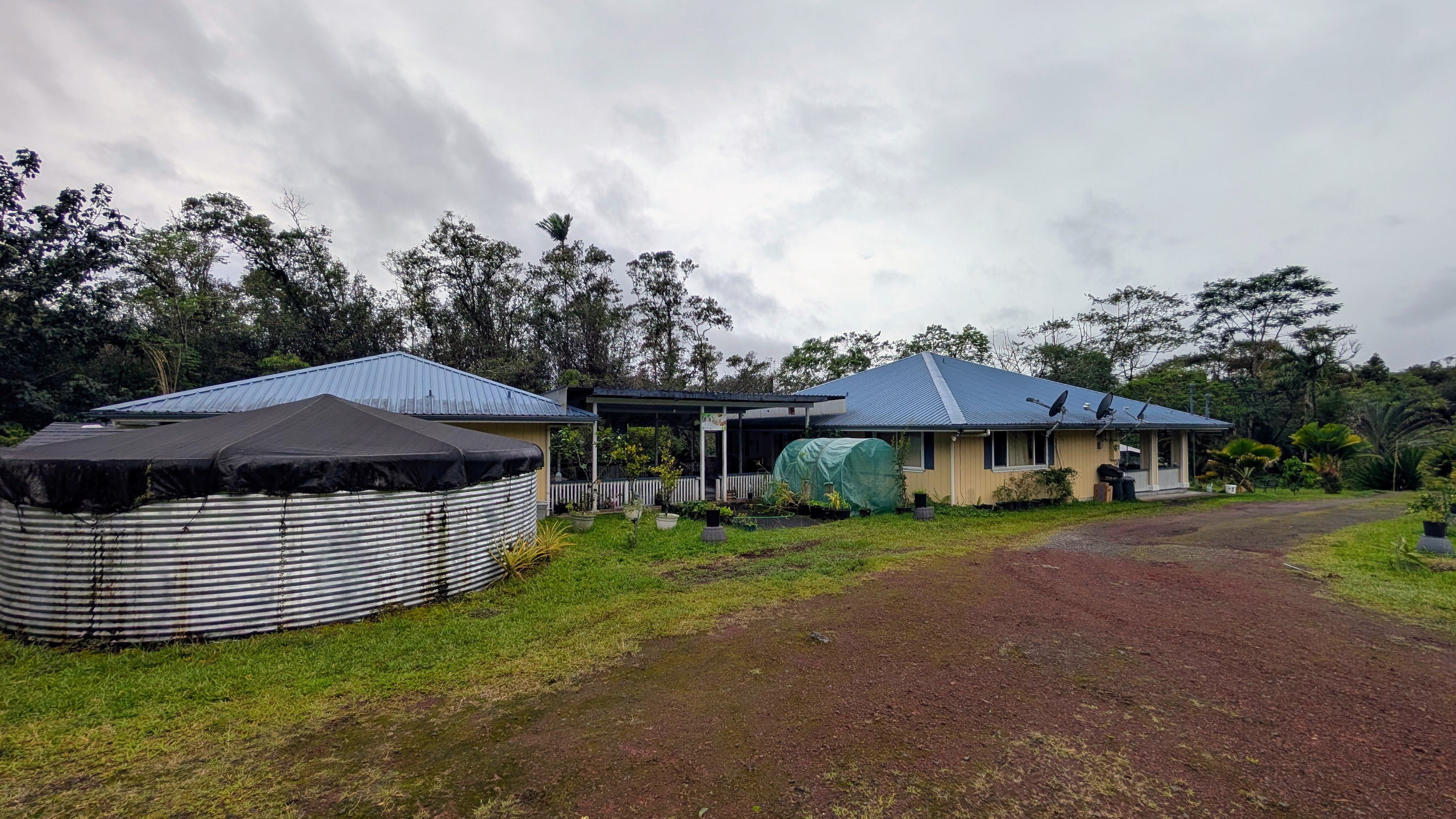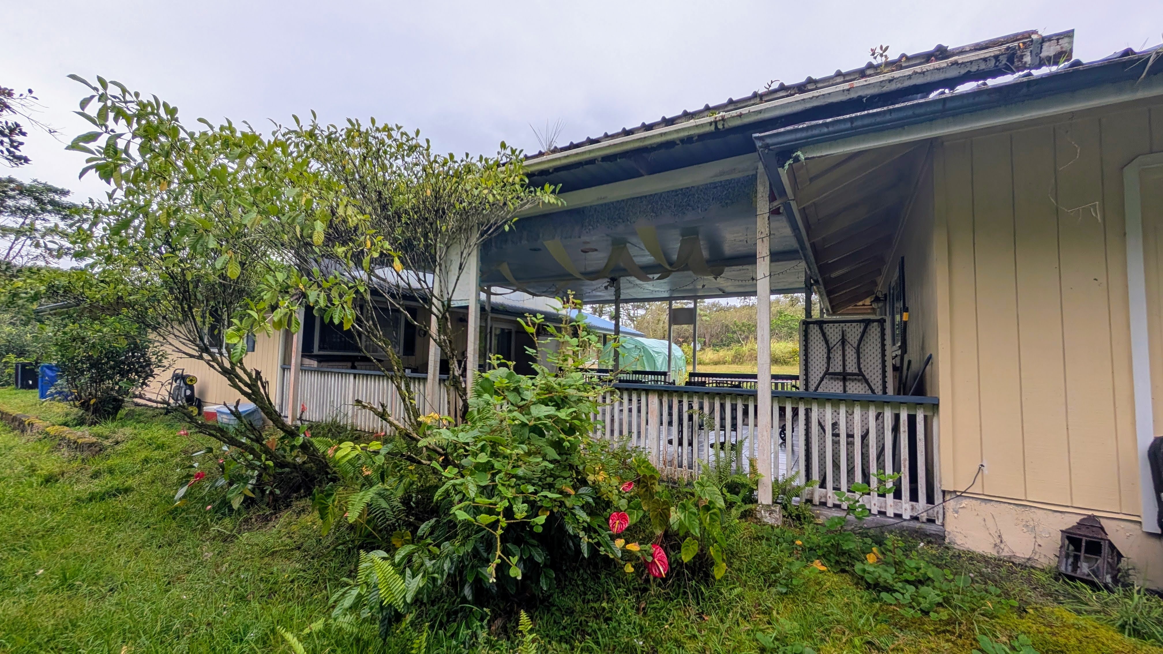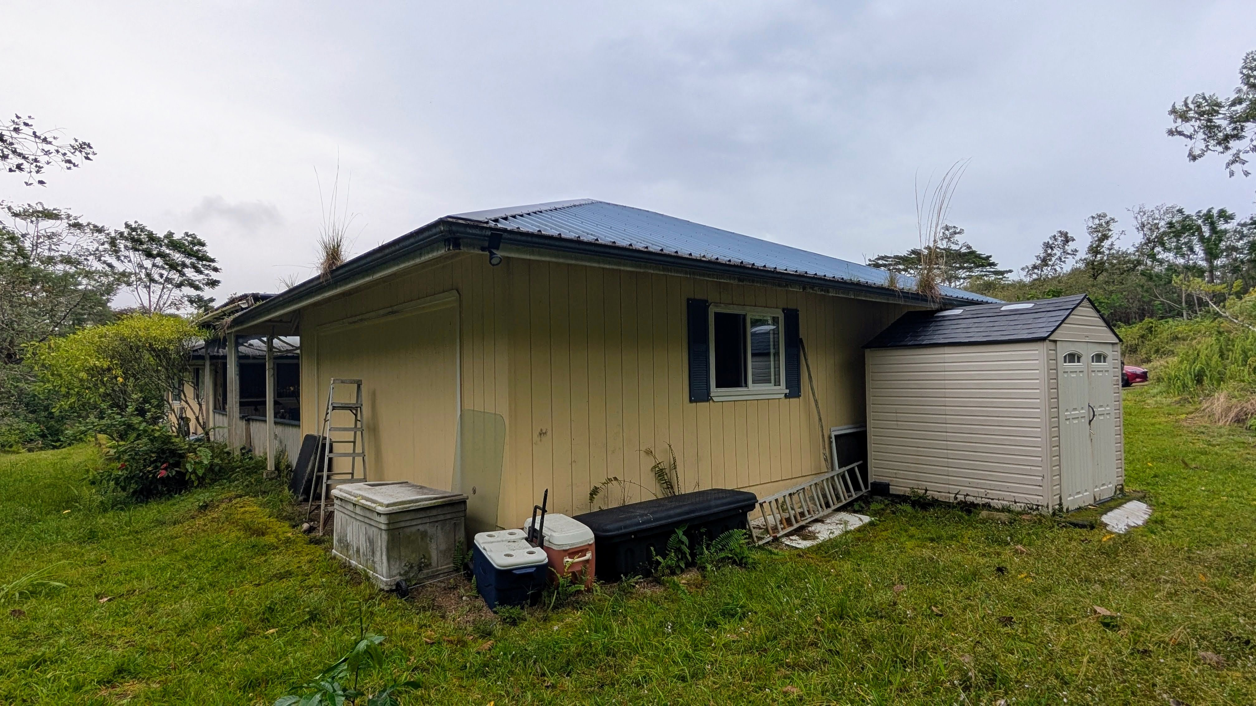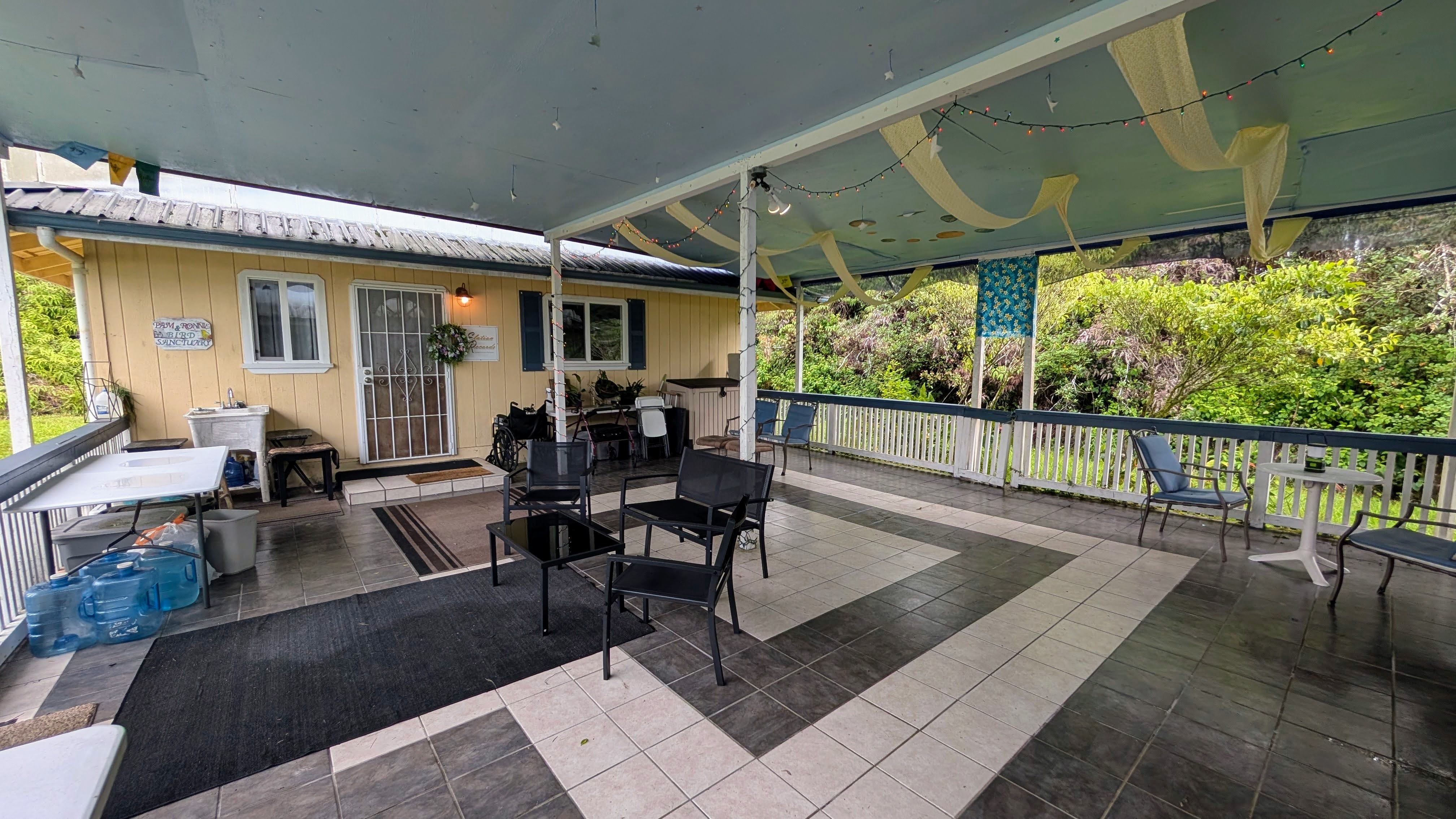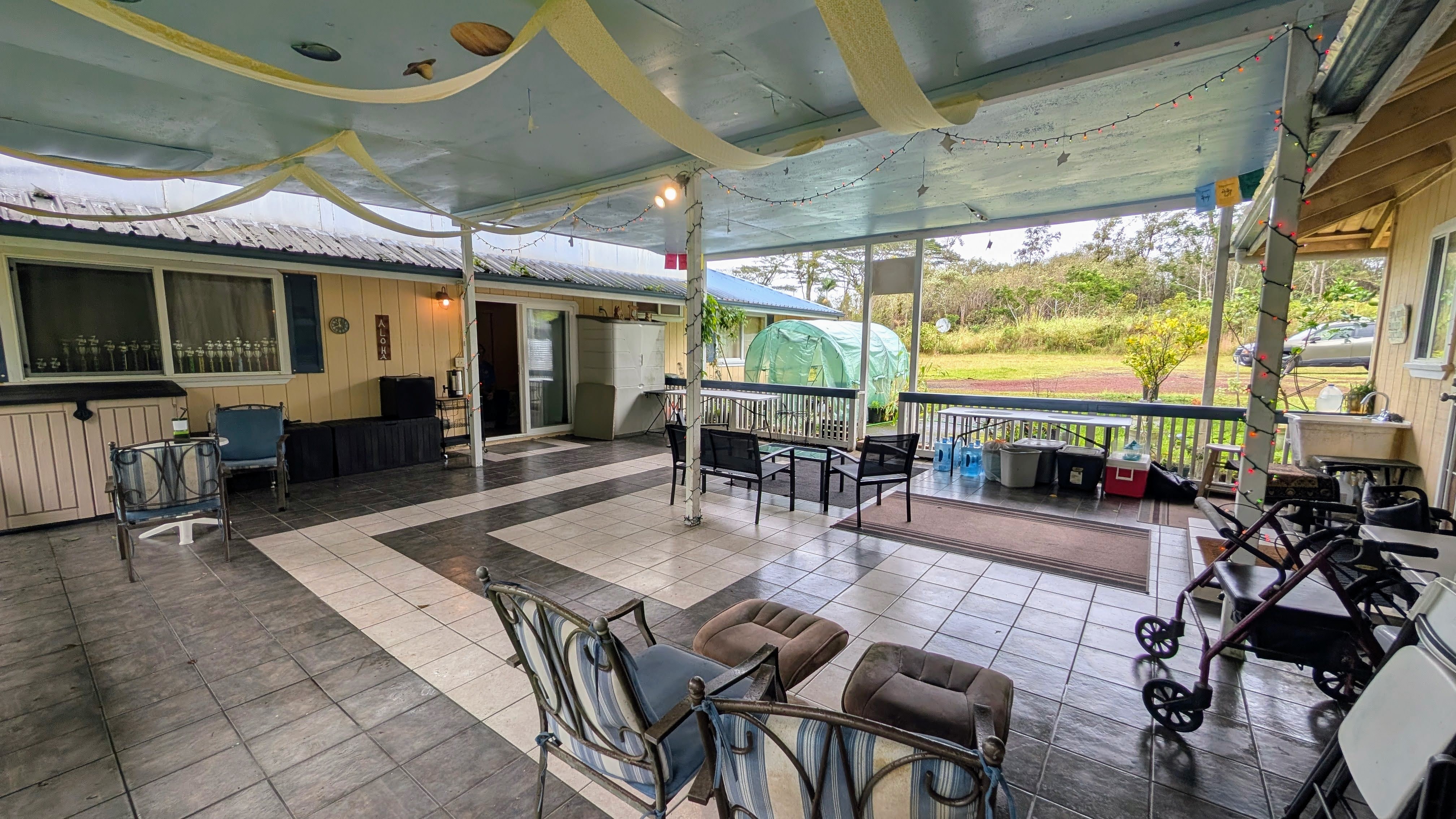 Situated on a one-acre parcel in the cool elevation of Mountain View, this popular Lauhala plan home offers comfort, space, and versatility. The home features an inviting 420 sq. ft. front lanai with spa, perfect for relaxing and enjoying the tropical surroundings. Inside, the open floor plan and vaulted ceilings create a bright, spacious feel. Originally designed as a 3-bedroom home, the primary bedroom was thoughtfully divided to create a 4-bedroom, 2-bath layout. Additional highlights include a generous 780 sq. ft. covered patio behind the home, ideal for entertaining or workspace area. Fiber-optic internet is available, and the garage workshop has been converted into a guest or rental unit for added flexibility. The property is equipped with an 8,000-gallon water catchment tank and an Alexapure water purification system. Numerous fruit trees have already been planted, some already producing, and a small greenhouse is included for gardening enthusiasts. Built at the back of the parcel for added privacy and located on a paved county road, this property offers both convenience and seclusion. Priced to sell and easy to show!