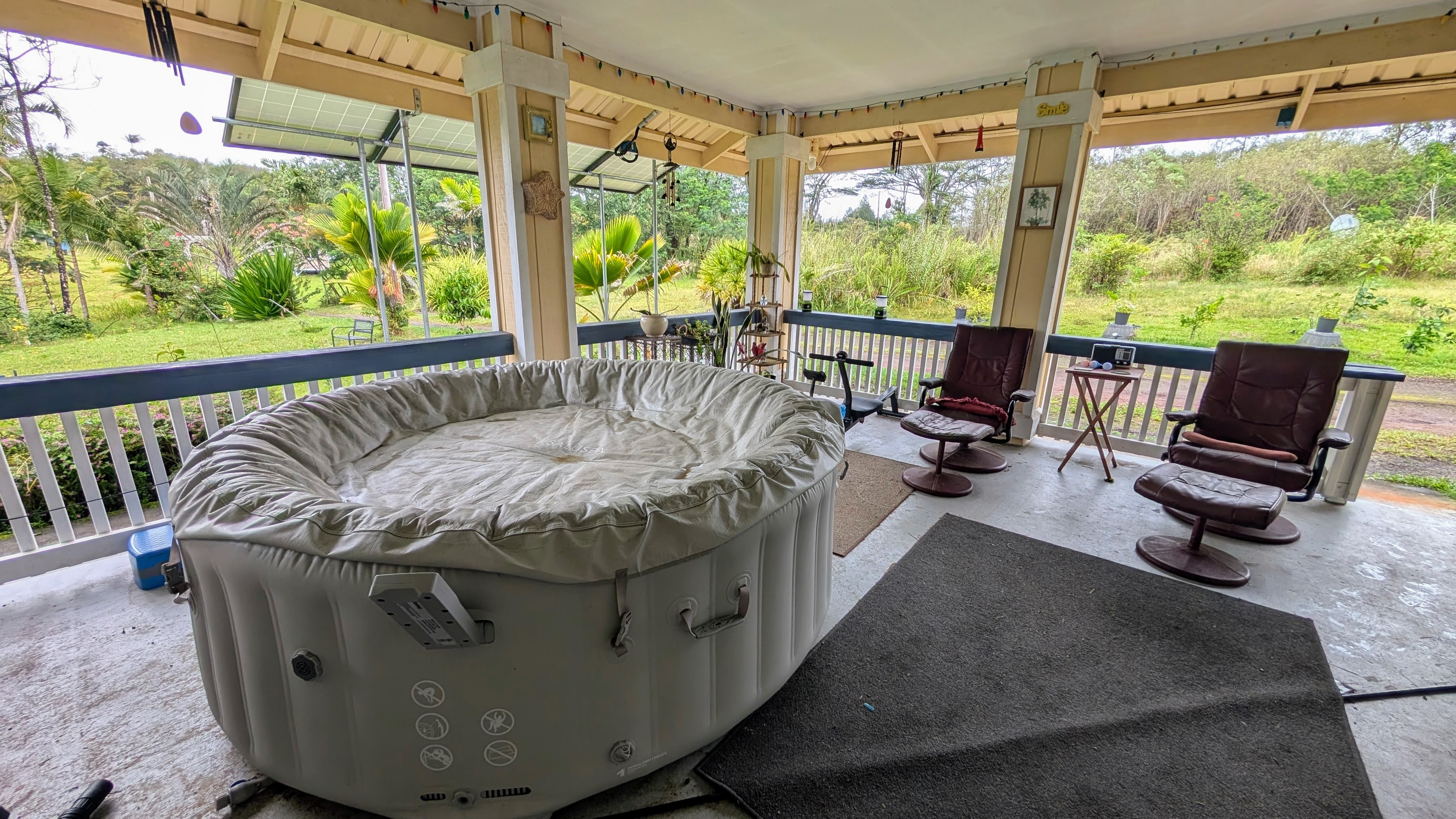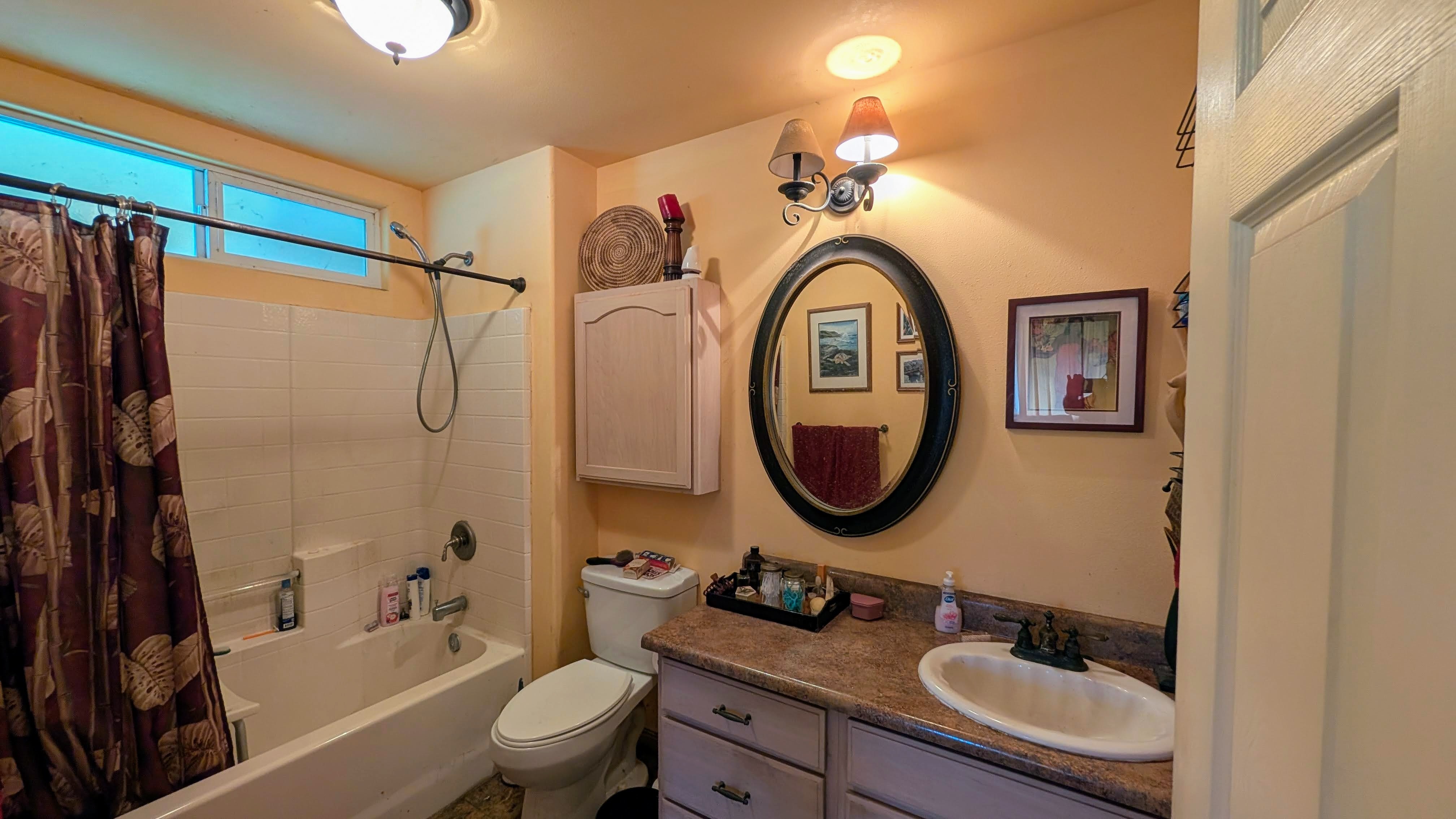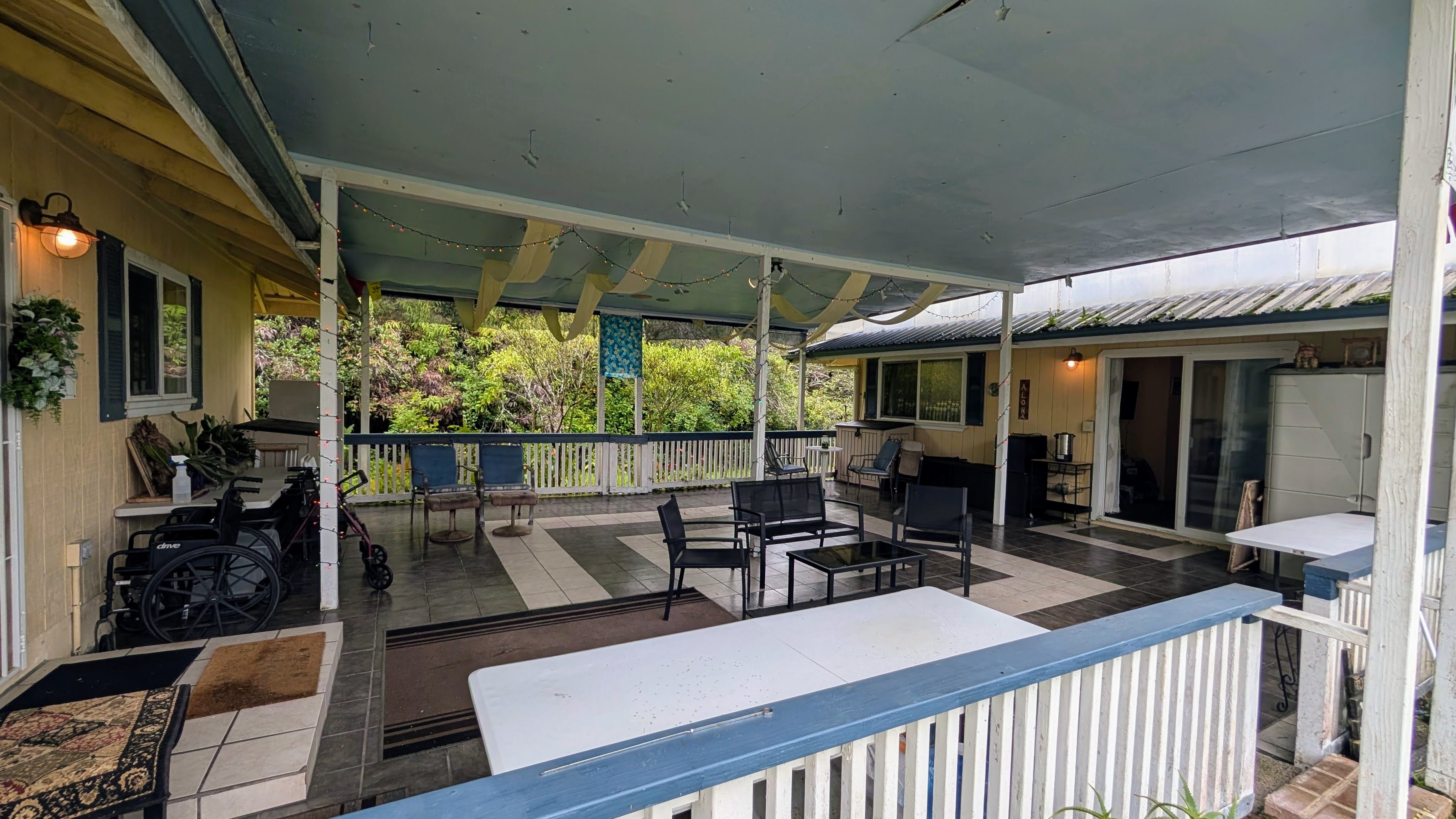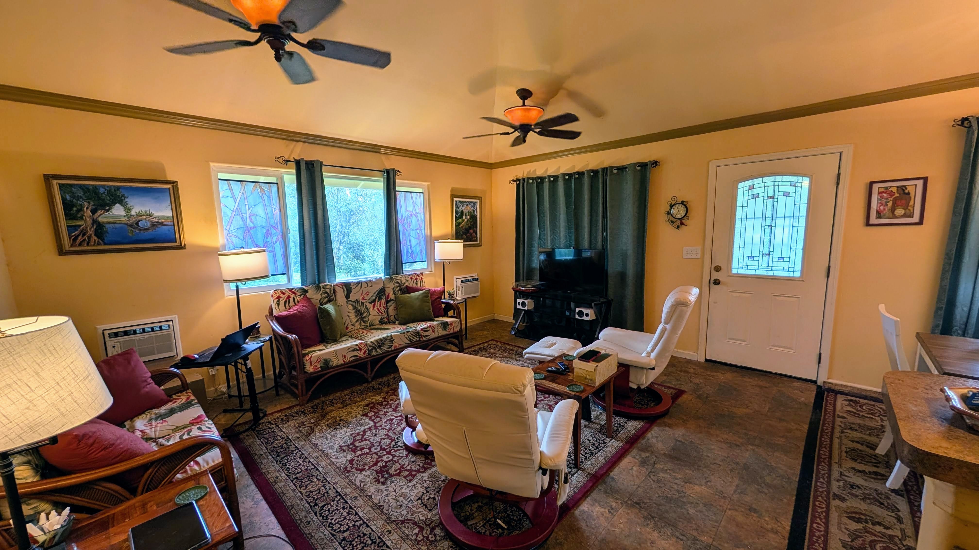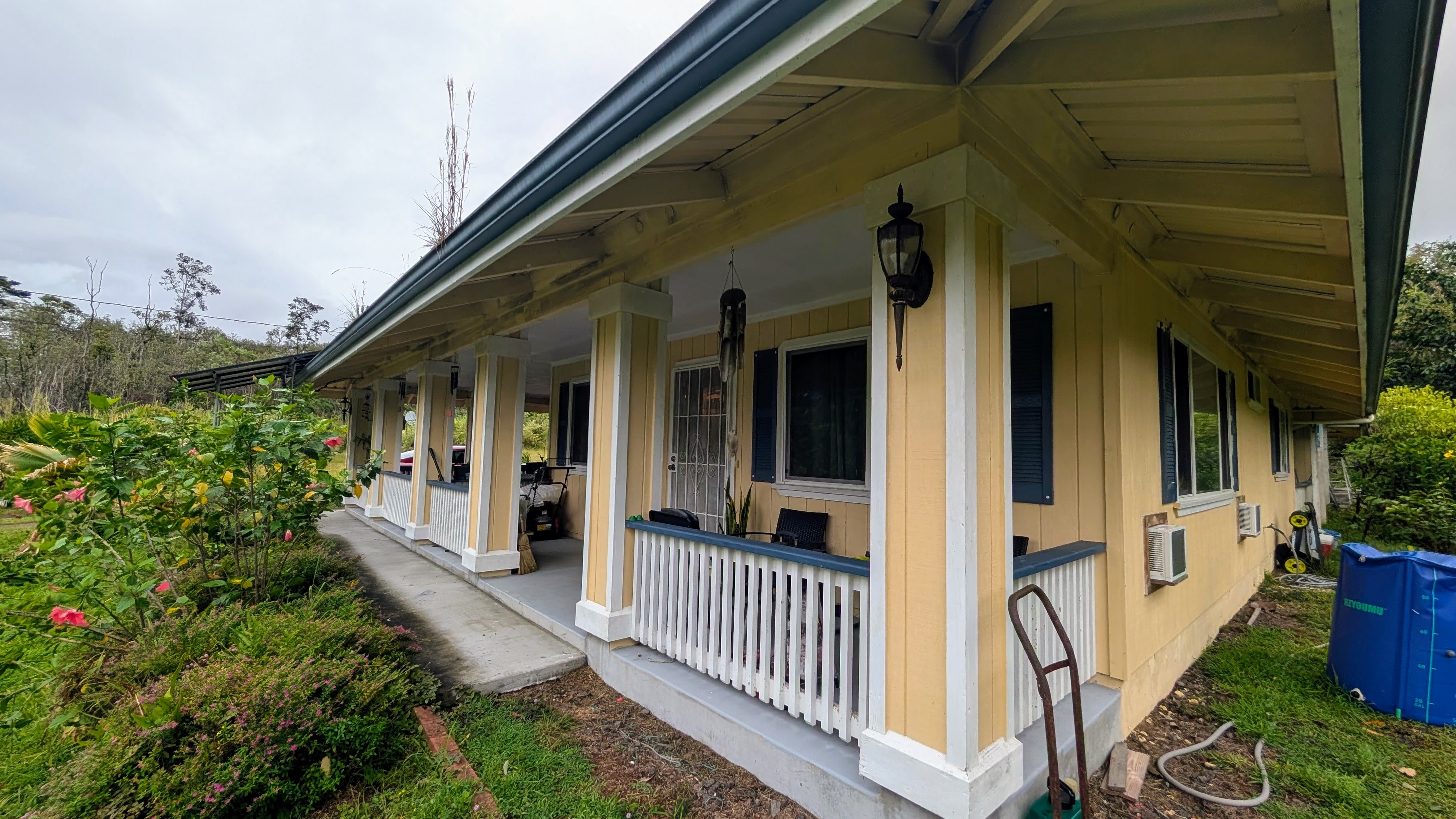 Situated on a one-acre parcel in the cool elevation of Mountain View, this popular Lauhala plan home offers comfort, space, and versatility. The home features an inviting 420 sq. ft. front lanai with spa, perfect for relaxing and enjoying the tropical surroundings. Inside, the open floor plan and vaulted ceilings create a bright, spacious feel. Originally designed as a 3-bedroom home, the primary bedroom was thoughtfully divided to create a 4-bedroom, 2-bath layout. Additional highlights include a generous 780 sq. ft. covered patio behind the home, ideal for entertaining or workspace area. Fiber-optic internet is available, and the garage workshop has been converted into a guest or rental unit for added flexibility. The property is equipped with an 8,000-gallon water catchment tank and an Alexapure water purification system. Numerous fruit trees have already been planted, some already producing, and a small greenhouse is included for gardening enthusiasts. Built at the back of the parcel for added privacy and located on a paved county road, this property offers both convenience and seclusion. Priced to sell and easy to show!
