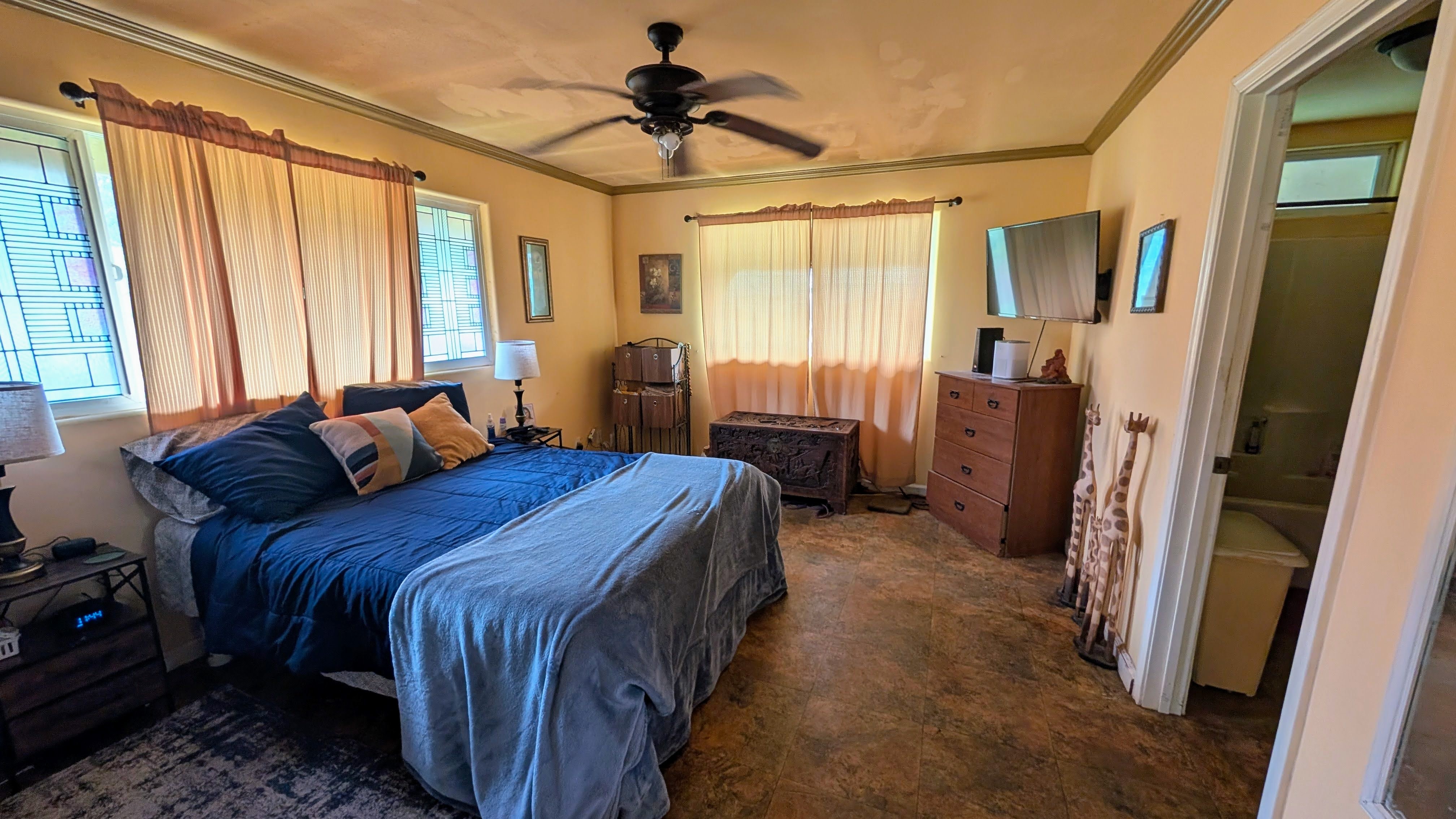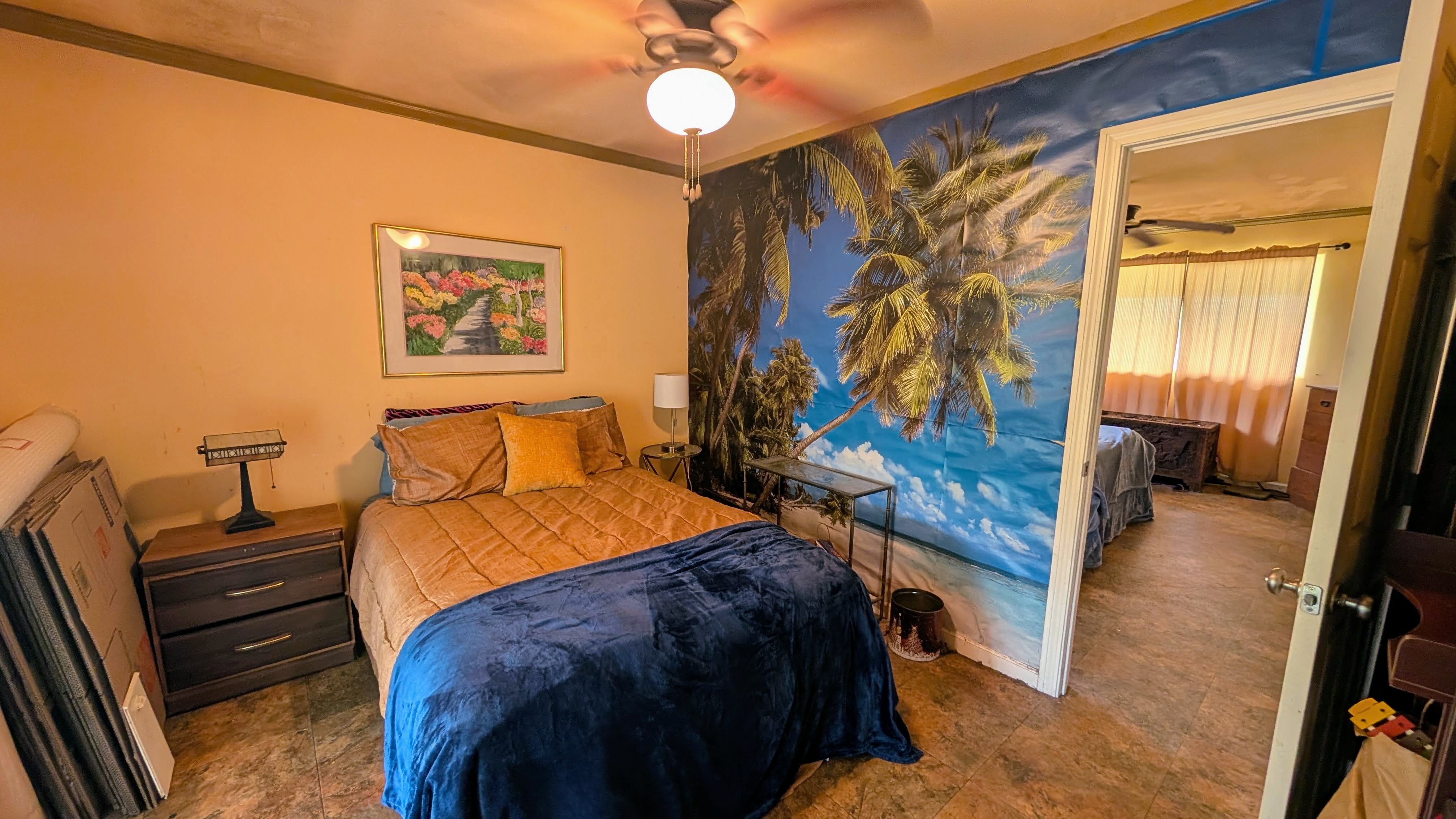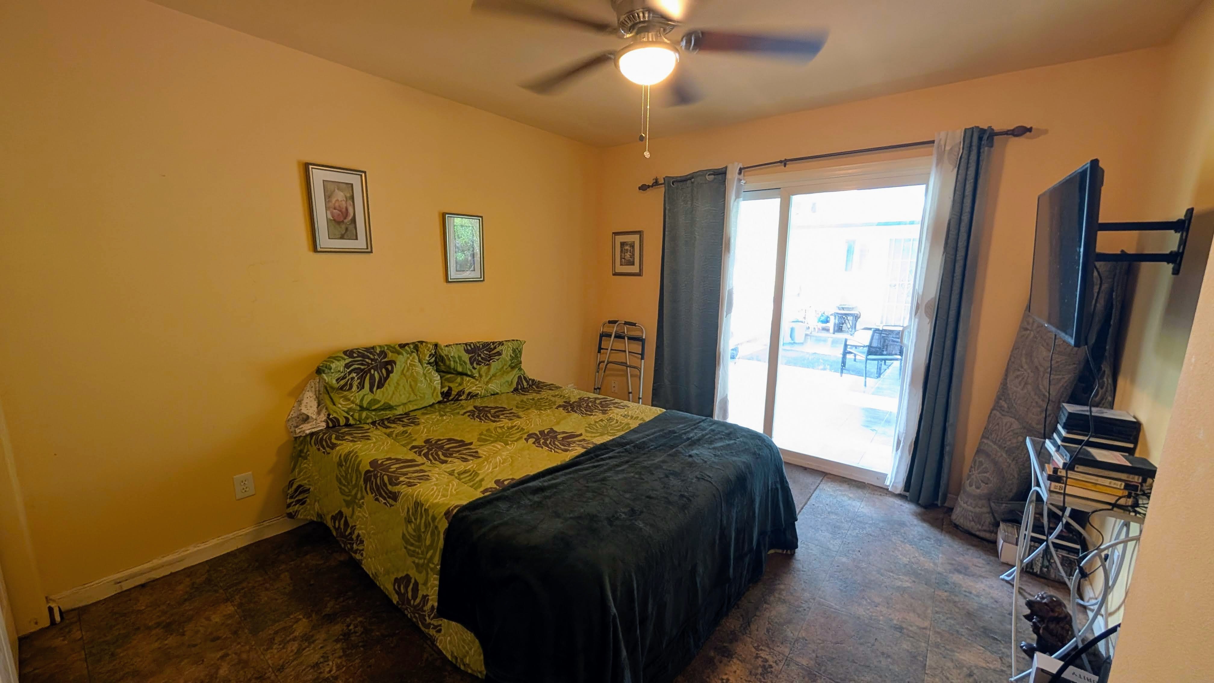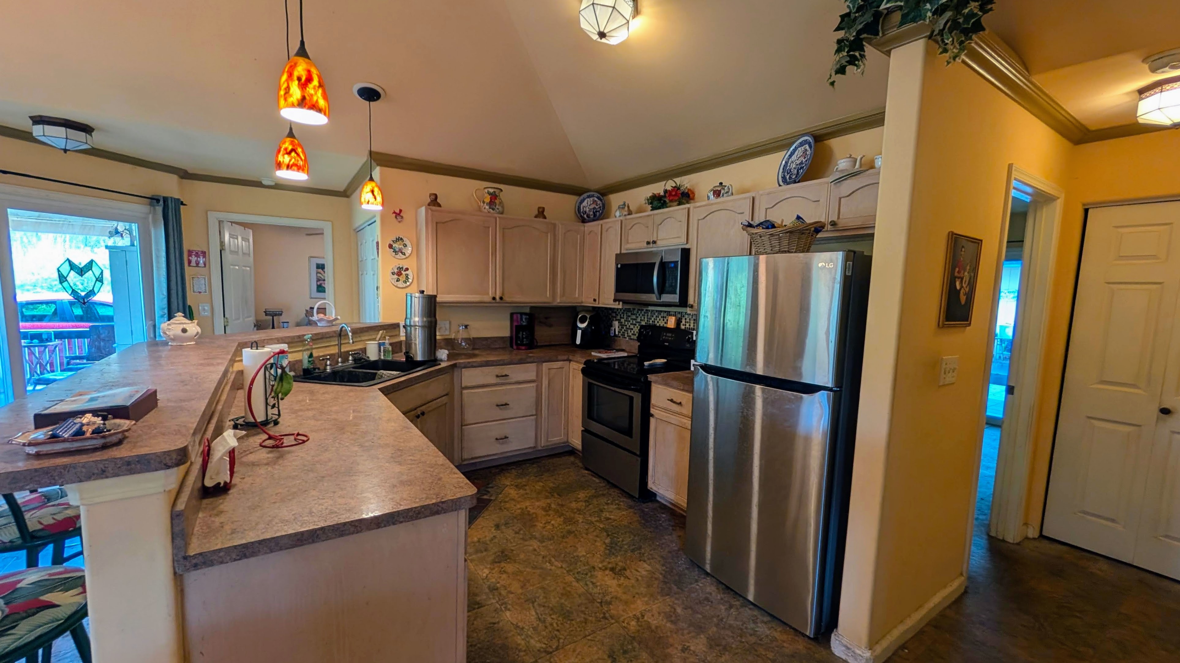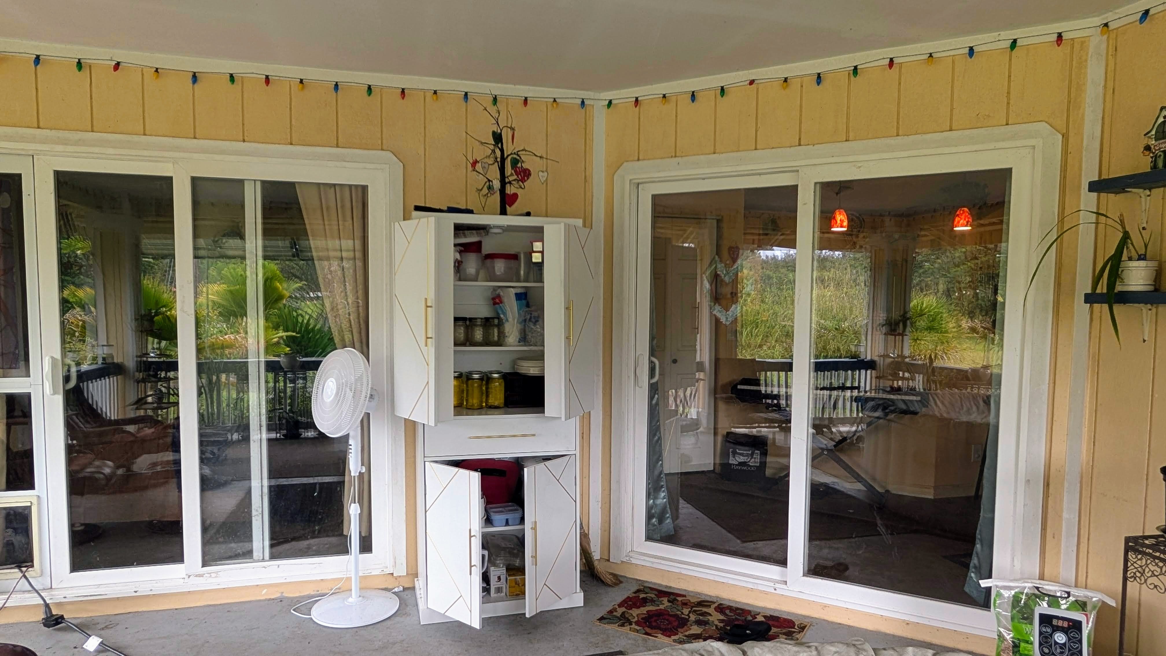 Situated on a one-acre parcel in the cool elevation of Mountain View, this popular Lauhala plan home offers comfort, space, and versatility. The home features an inviting 420 sq. ft. front lanai with spa, perfect for relaxing and enjoying the tropical surroundings. Inside, the open floor plan and vaulted ceilings create a bright, spacious feel. Originally designed as a 3-bedroom home, the primary bedroom was thoughtfully divided to create a 4-bedroom, 2-bath layout. Additional highlights include a generous 780 sq. ft. covered patio behind the home, ideal for entertaining or workspace area. Fiber-optic internet is available, and the garage workshop has been converted into a guest or rental unit for added flexibility. The property is equipped with an 8,000-gallon water catchment tank and an Alexapure water purification system. Numerous fruit trees have already been planted, some already producing, and a small greenhouse is included for gardening enthusiasts. Built at the back of the parcel for added privacy and located on a paved county road, this property offers both convenience and seclusion. Priced to sell and easy to show!