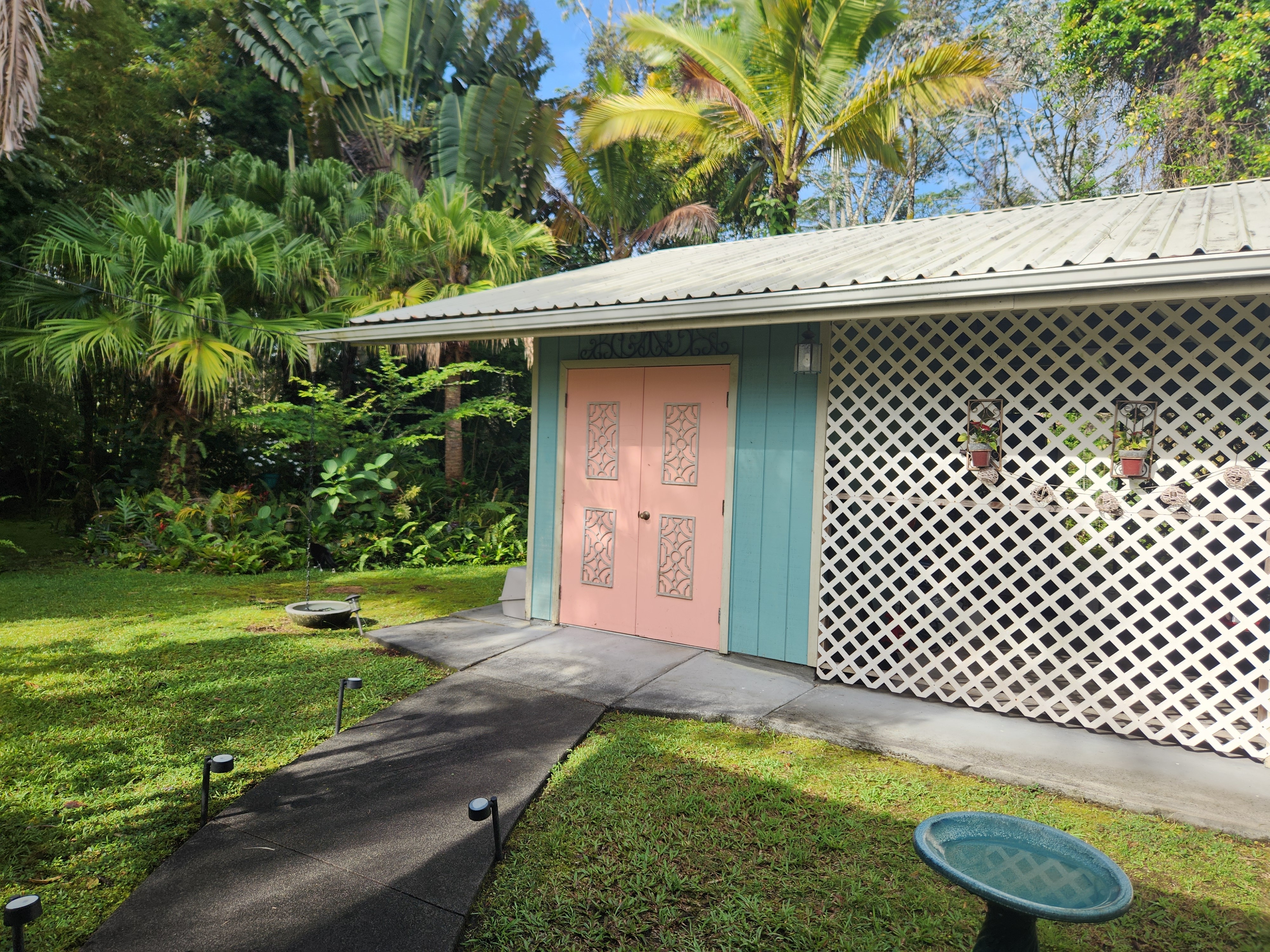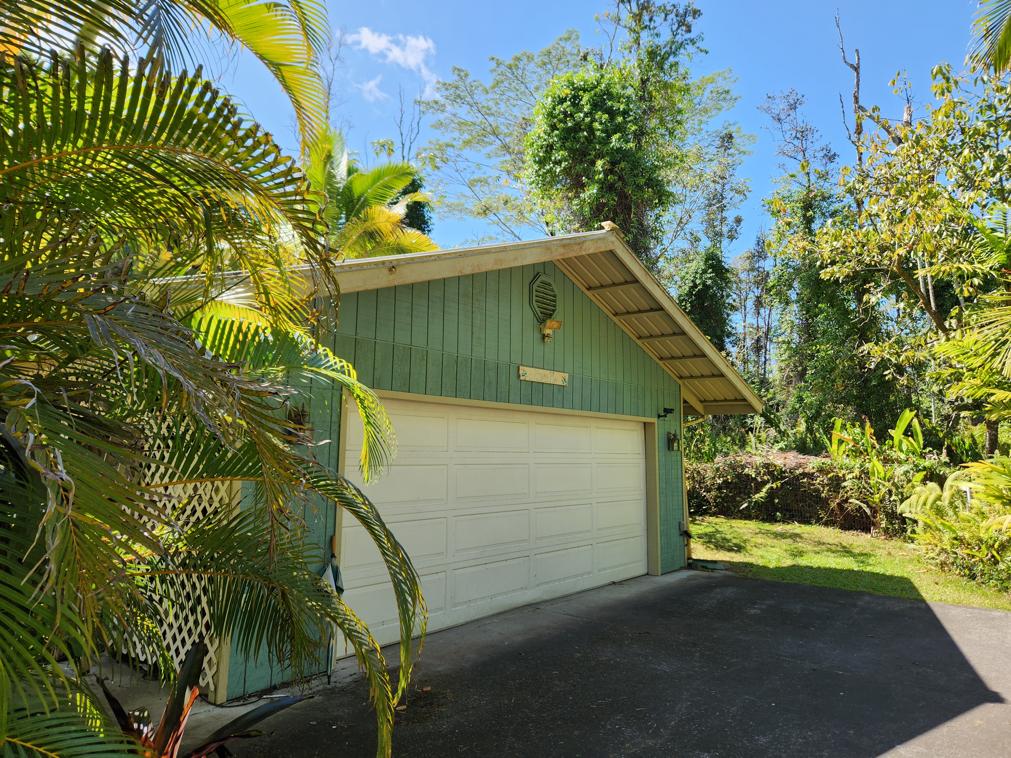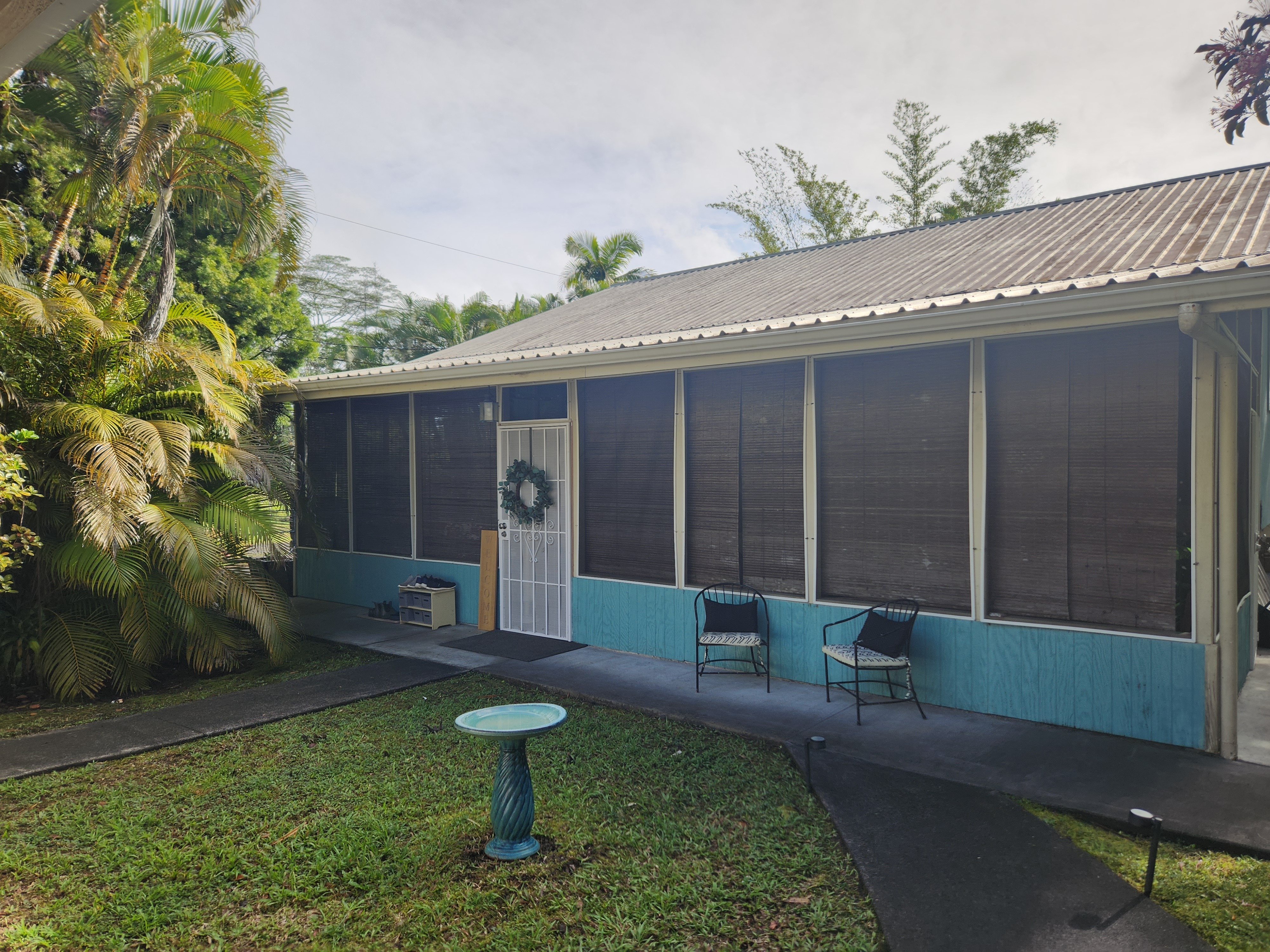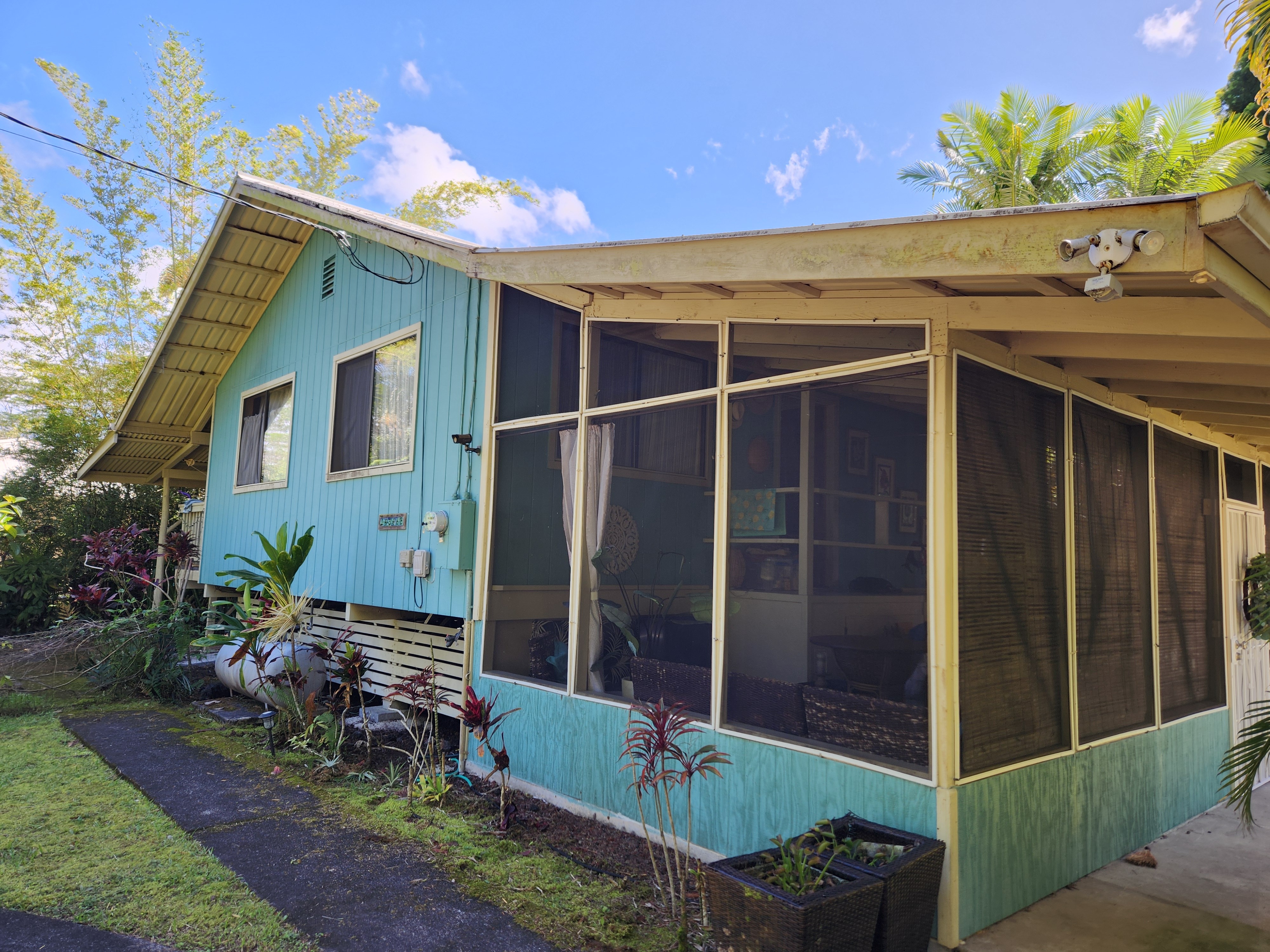 Affordable Paradise! Offered fully furnished!! Sweet 2/1 cottage has many special touches: including a large, screened lanai (384 sq ft) providing the perfect space for entertaining and indoor/outdoor living. At the landing to enter the home is a lovely, tiled floor mural featuring honu (turtles), welcoming you to the home. The living area/ kitchen is open with a bamboo partial wall separating the living and kitchen. Dark espresso cabinets and butcher block counters, tiled backsplash, and ocher walls reflect the tones found in the bamboo. Newer appliances include stainless 5 burner gas range, stainless French door counter-depth refrigerator, large black Kohler sink, w/ restaurant style faucet w/ pull down sprayer. The floors are ceramic tile: great for pets. Two nice-sized bedrooms have large closets, ceiling fans, wall AC unit in primary bedroom, bamboo glass doors, and plank vinyl floors. The bathroom has a new vanity/sink, higher profile toilet, and a tiled walk-in shower. Off the back door is the covered side lanai of 320 sqft, w/ a laundry area,. There's a 10,700 gal. catchment tank and water filtration system (Quantum system & 3 sediment filters). A convenient outside bathroom w/ sliding barndoors is under the covered side lanai & another shower is found in the back garden. There's a circular concrete driveway w/ native stone pillars. Concrete Sidewalks connect carport to home and surround each building. The detached Carport is 576 sqft with a bonus room (192 sqft) provides a versatile space for overflow guests, a home office, or a hobby space. Home is sited on a consolidated double lot (16,080 sqft) in a quiet area with nice neighbors. The beautiful, lush landscape includes a variety of palms, heliconia, Medinilla magnifica, podocarpus, bamboo, Queen Emma lily, Anthuriums, Orchids, Hibiscus, Bromeliads, and so many others. Fruit trees include avocado, tangerine, lemon, macadamia nut, jaboticaba, coffee, pineapples, to name a few.