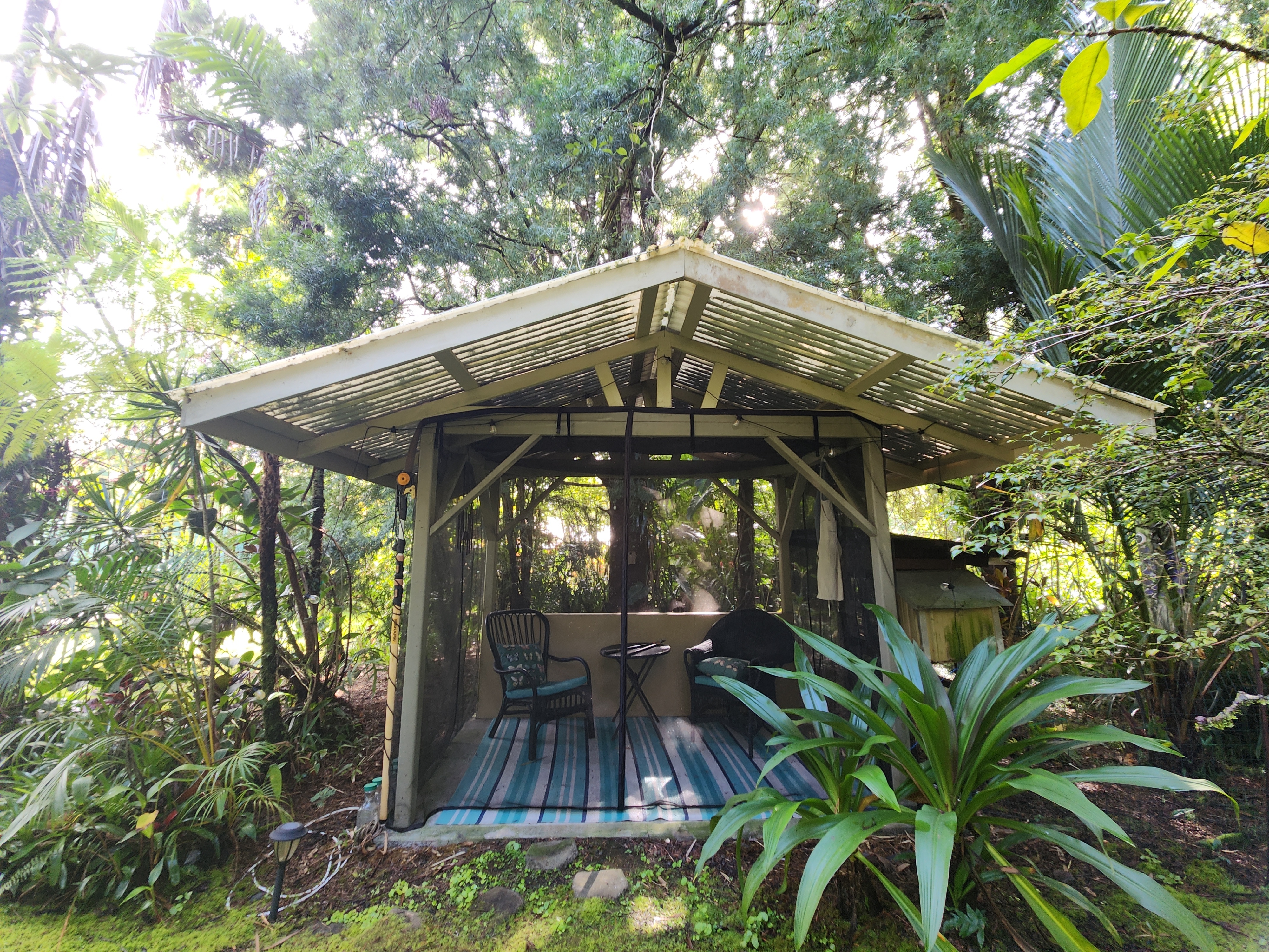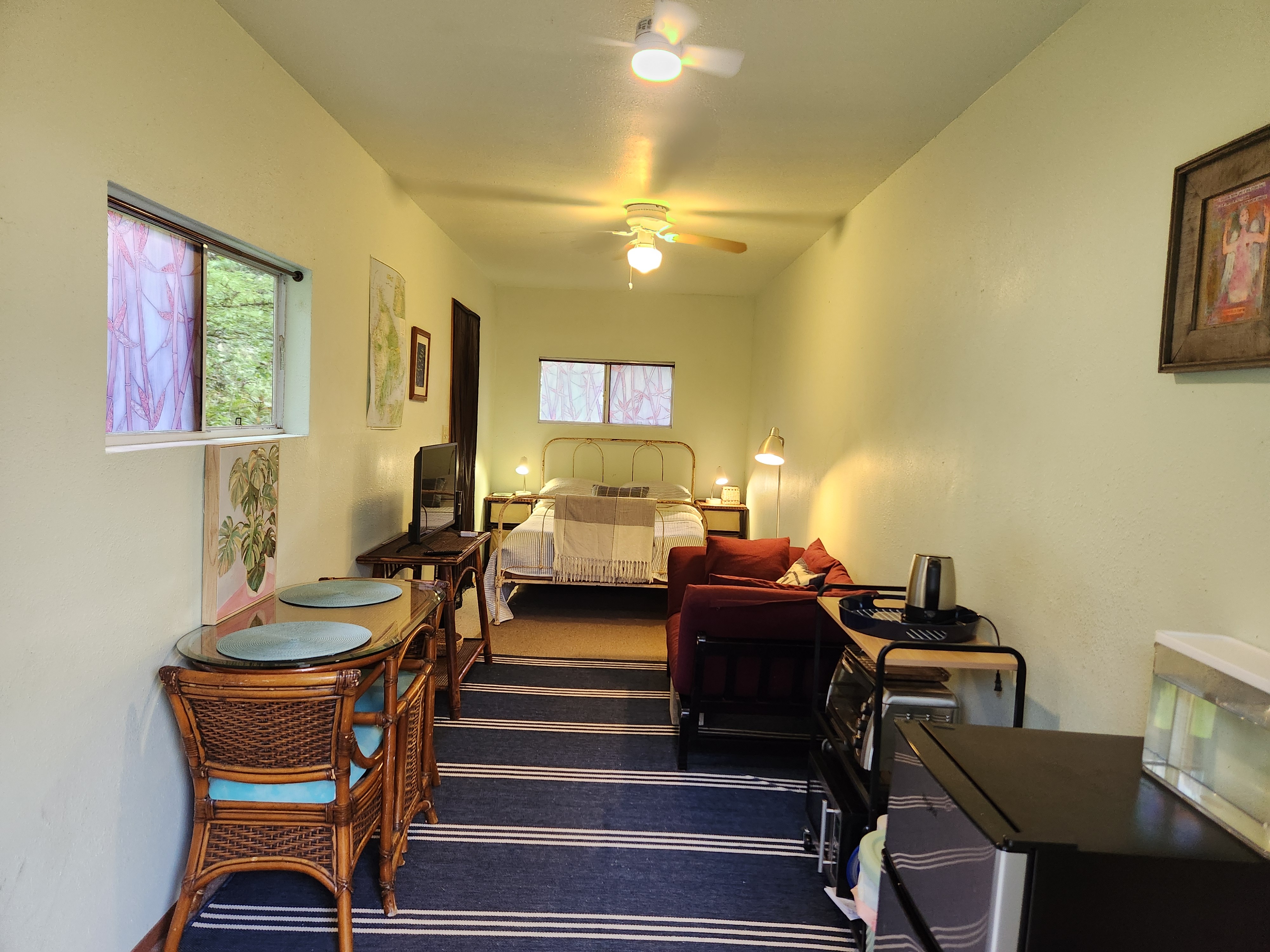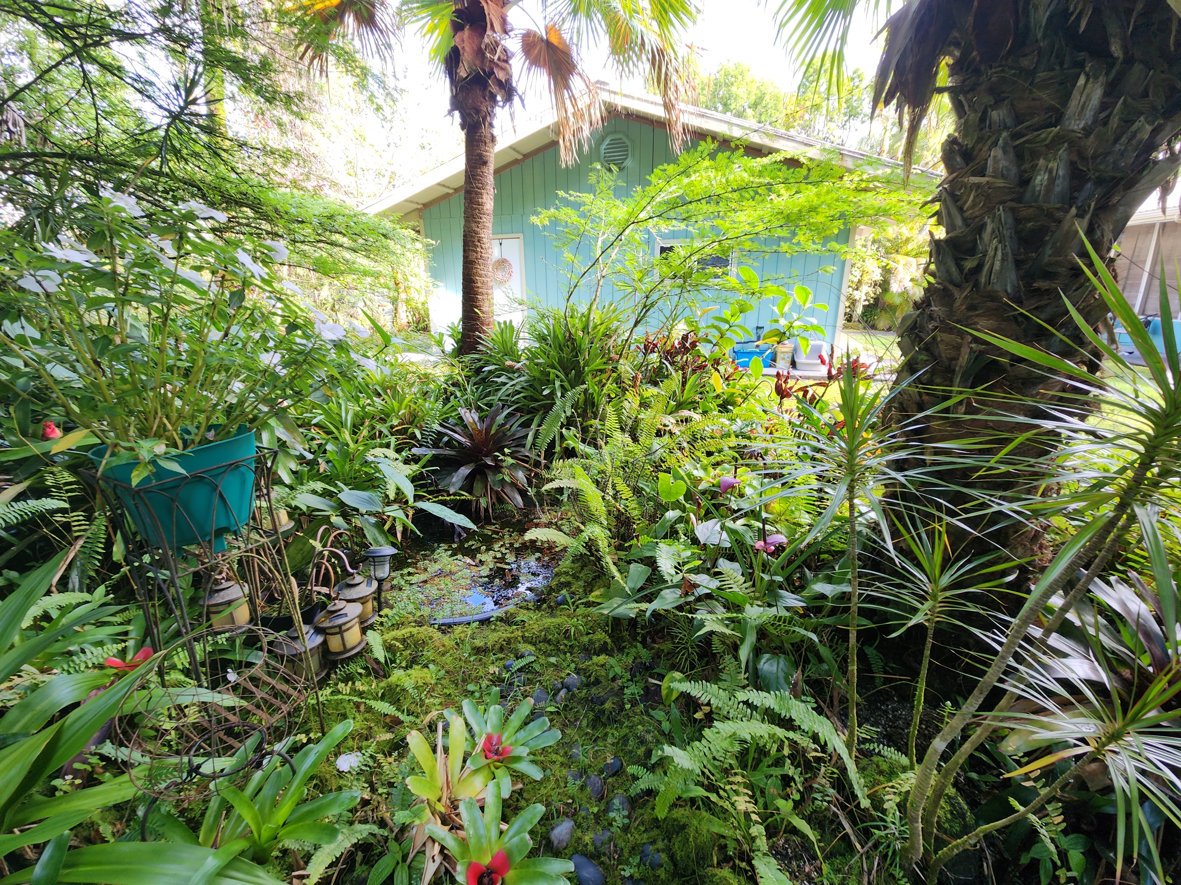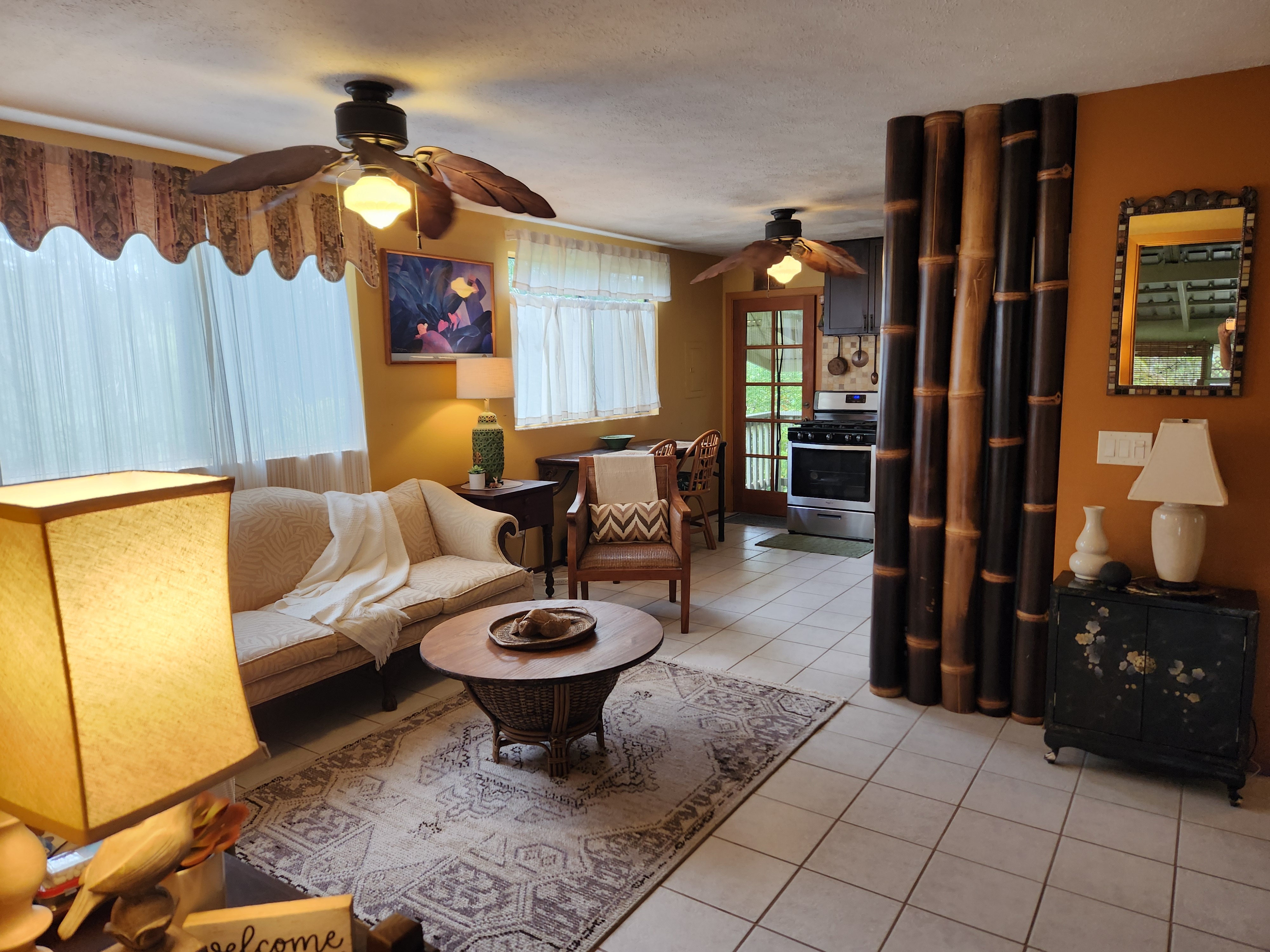 Affordable Paradise! Offered fully furnished!! Sweet 2/1 cottage has many special touches: including a large, screened lanai (384 sq ft) providing the perfect space for entertaining and indoor/outdoor living. At the landing to enter the home is a lovely, tiled floor mural featuring honu (turtles), welcoming you to the home. The living area/ kitchen is open with a bamboo partial wall separating the living and kitchen. Dark espresso cabinets and butcher block counters, tiled backsplash, and ocher walls reflect the tones found in the bamboo. Newer appliances include stainless 5 burner gas range, stainless French door counter-depth refrigerator, large black Kohler sink, w/ restaurant style faucet w/ pull down sprayer. The floors are ceramic tile: great for pets. Two nice-sized bedrooms have large closets, ceiling fans, wall AC unit in primary bedroom, bamboo glass doors, and plank vinyl floors. The bathroom has a new vanity/sink, higher profile toilet, and a tiled walk-in shower. Off the back door is the covered side lanai of 320 sqft, w/ a laundry area,. There's a 10,700 gal. catchment tank and water filtration system (Quantum system & 3 sediment filters). A convenient outside bathroom w/ sliding barndoors is under the covered side lanai & another shower is found in the back garden. There's a circular concrete driveway w/ native stone pillars. Concrete Sidewalks connect carport to home and surround each building. The detached Carport is 576 sqft with a bonus room (192 sqft) provides a versatile space for overflow guests, a home office, or a hobby space. Home is sited on a consolidated double lot (16,080 sqft) in a quiet area with nice neighbors. The beautiful, lush landscape includes a variety of palms, heliconia, Medinilla magnifica, podocarpus, bamboo, Queen Emma lily, Anthuriums, Orchids, Hibiscus, Bromeliads, and so many others. Fruit trees include avocado, tangerine, lemon, macadamia nut, jaboticaba, coffee, pineapples, to name a few.