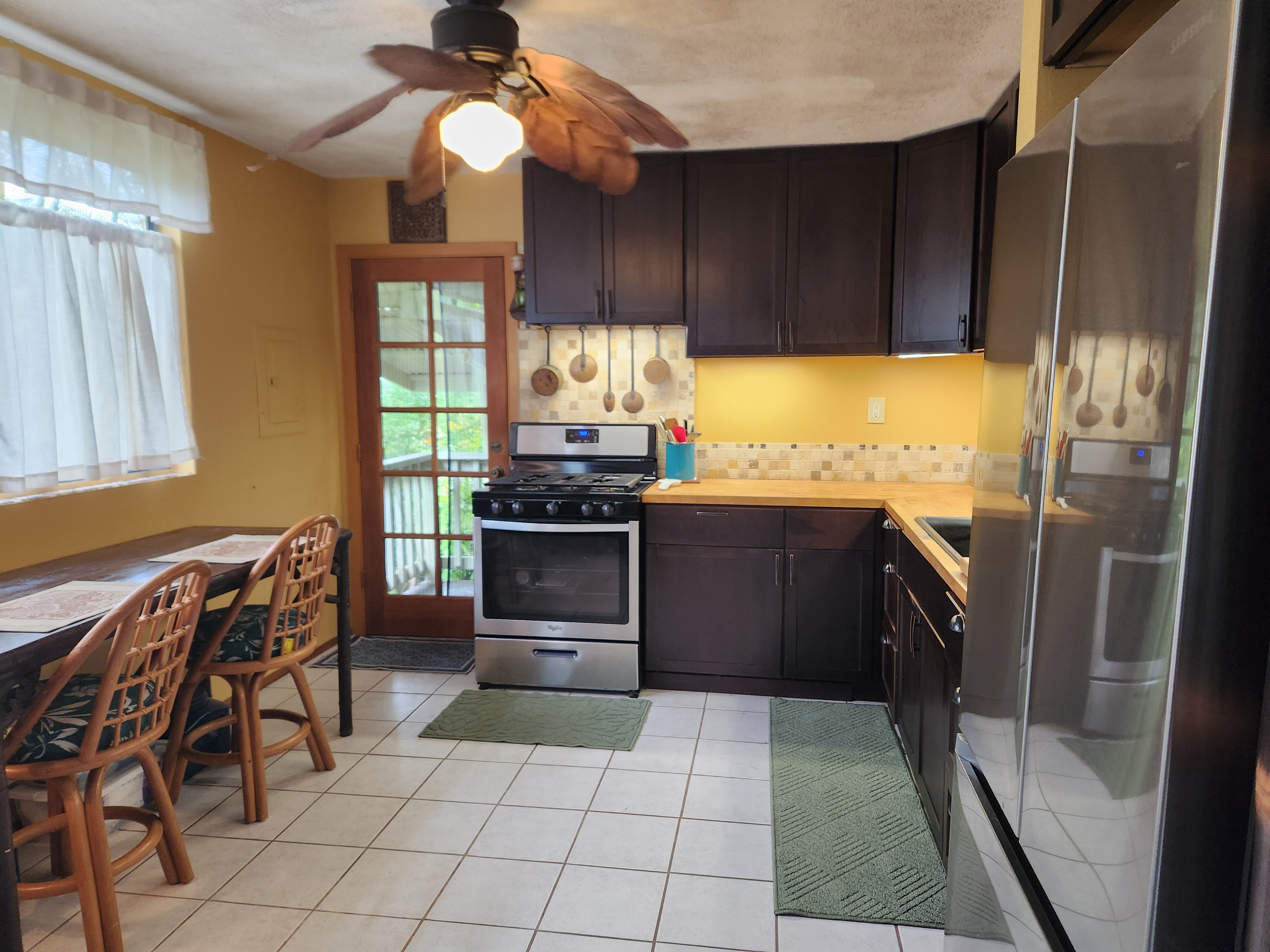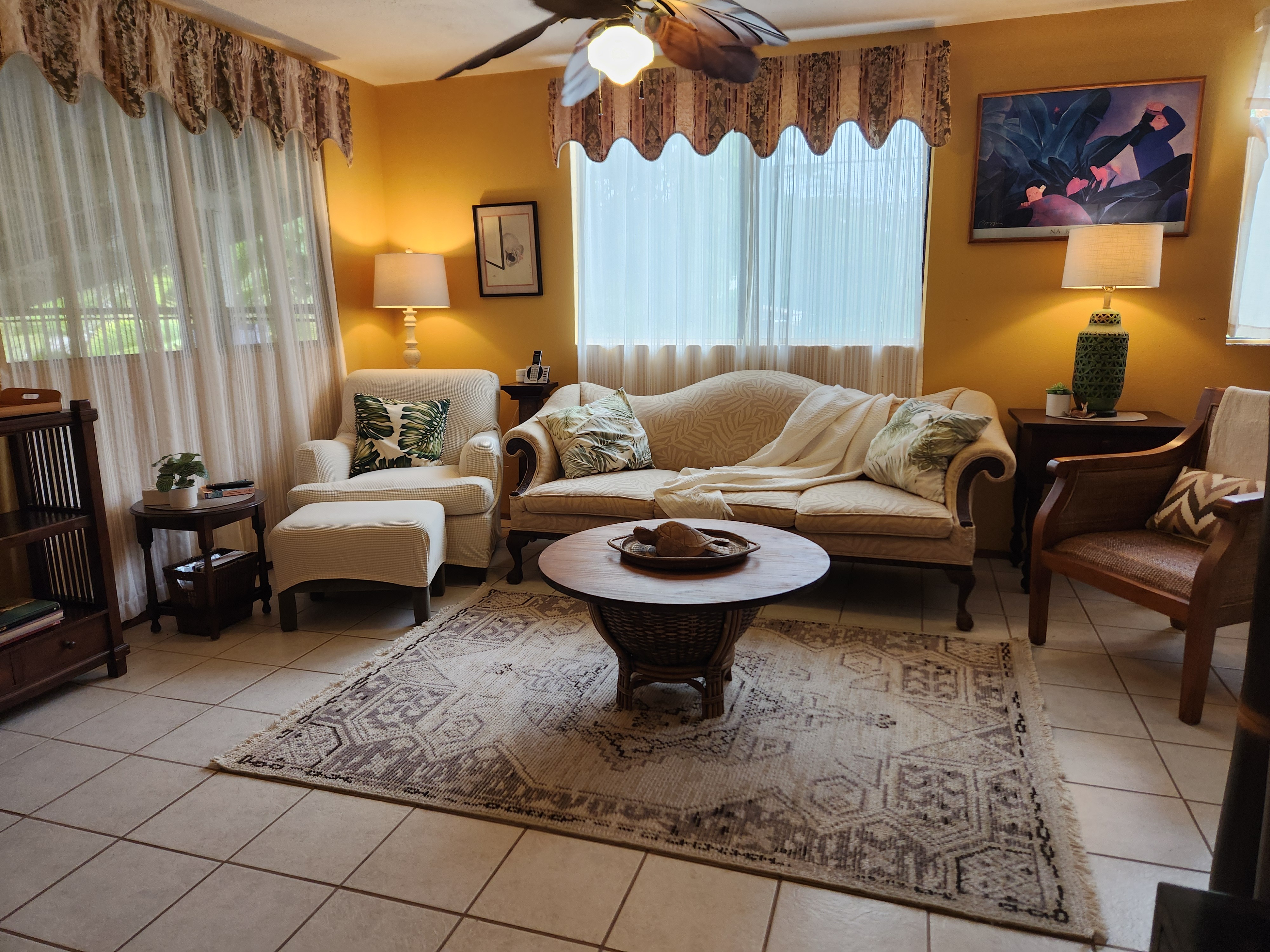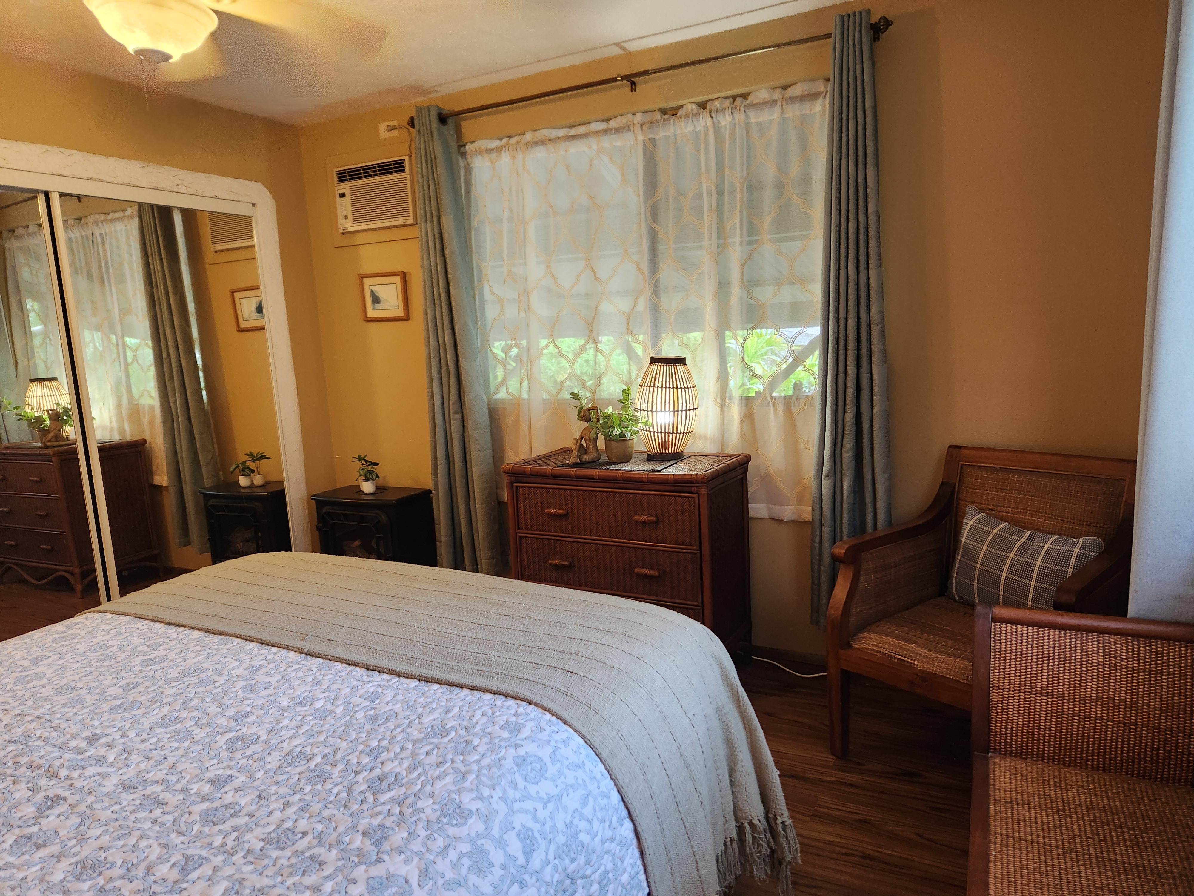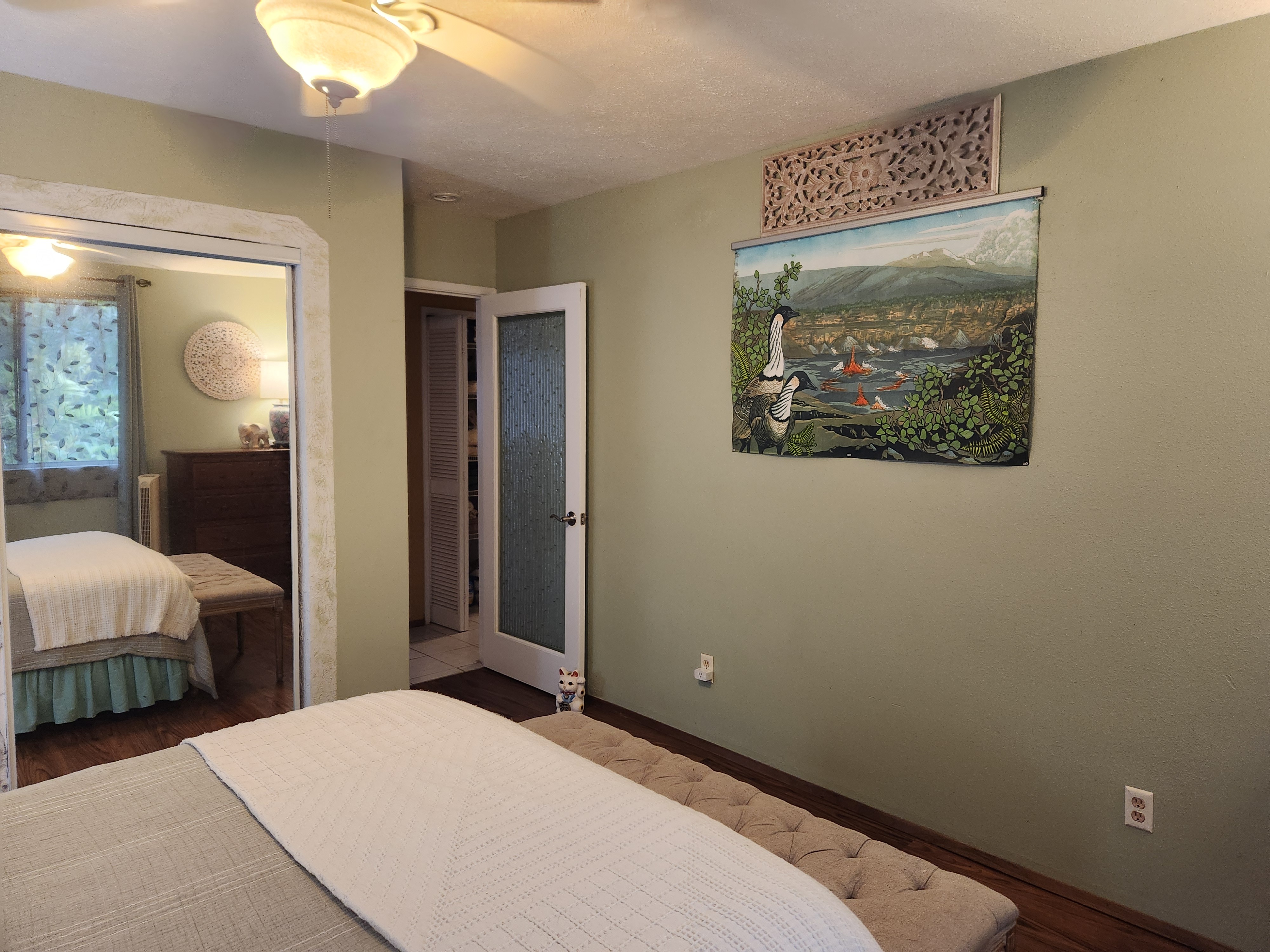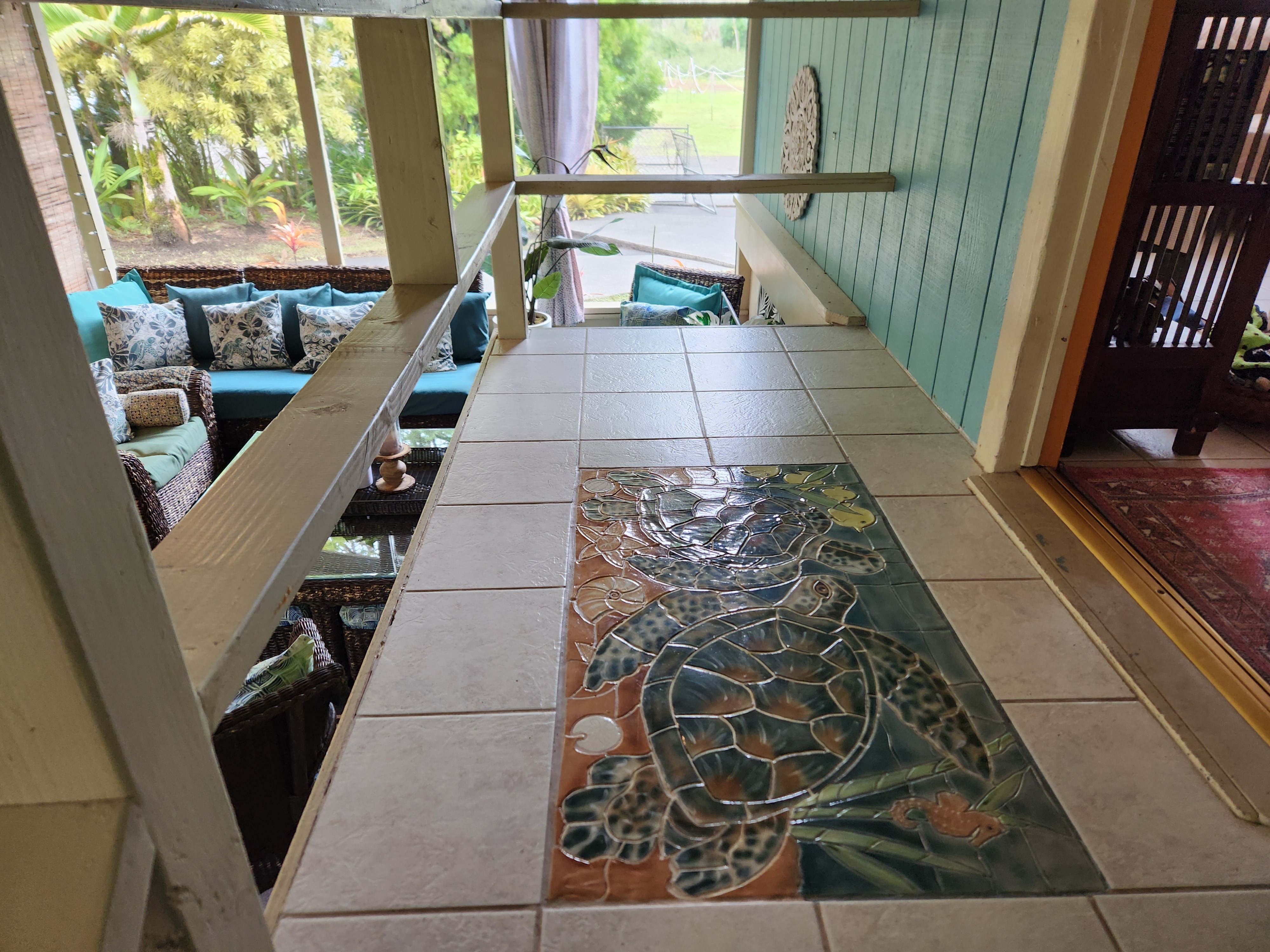 Affordable Paradise! Offered fully furnished!! Sweet 2/1 cottage has many special touches: including a large, screened lanai (384 sq ft) providing the perfect space for entertaining and indoor/outdoor living. At the landing to enter the home is a lovely, tiled floor mural featuring honu (turtles), welcoming you to the home. The living area/ kitchen is open with a bamboo partial wall separating the living and kitchen. Dark espresso cabinets and butcher block counters, tiled backsplash, and ocher walls reflect the tones found in the bamboo. Newer appliances include stainless 5 burner gas range, stainless French door counter-depth refrigerator, large black Kohler sink, w/ restaurant style faucet w/ pull down sprayer. The floors are ceramic tile: great for pets. Two nice-sized bedrooms have large closets, ceiling fans, wall AC unit in primary bedroom, bamboo glass doors, and plank vinyl floors. The bathroom has a new vanity/sink, higher profile toilet, and a tiled walk-in shower. Off the back door is the covered side lanai of 320 sqft, w/ a laundry area,. There's a 10,700 gal. catchment tank and water filtration system (Quantum system & 3 sediment filters). A convenient outside bathroom w/ sliding barndoors is under the covered side lanai & another shower is found in the back garden. There's a circular concrete driveway w/ native stone pillars. Concrete Sidewalks connect carport to home and surround each building. The detached Carport is 576 sqft with a bonus room (192 sqft) provides a versatile space for overflow guests, a home office, or a hobby space. Home is sited on a consolidated double lot (16,080 sqft) in a quiet area with nice neighbors. The beautiful, lush landscape includes a variety of palms, heliconia, Medinilla magnifica, podocarpus, bamboo, Queen Emma lily, Anthuriums, Orchids, Hibiscus, Bromeliads, and so many others. Fruit trees include avocado, tangerine, lemon, macadamia nut, jaboticaba, coffee, pineapples, to name a few.