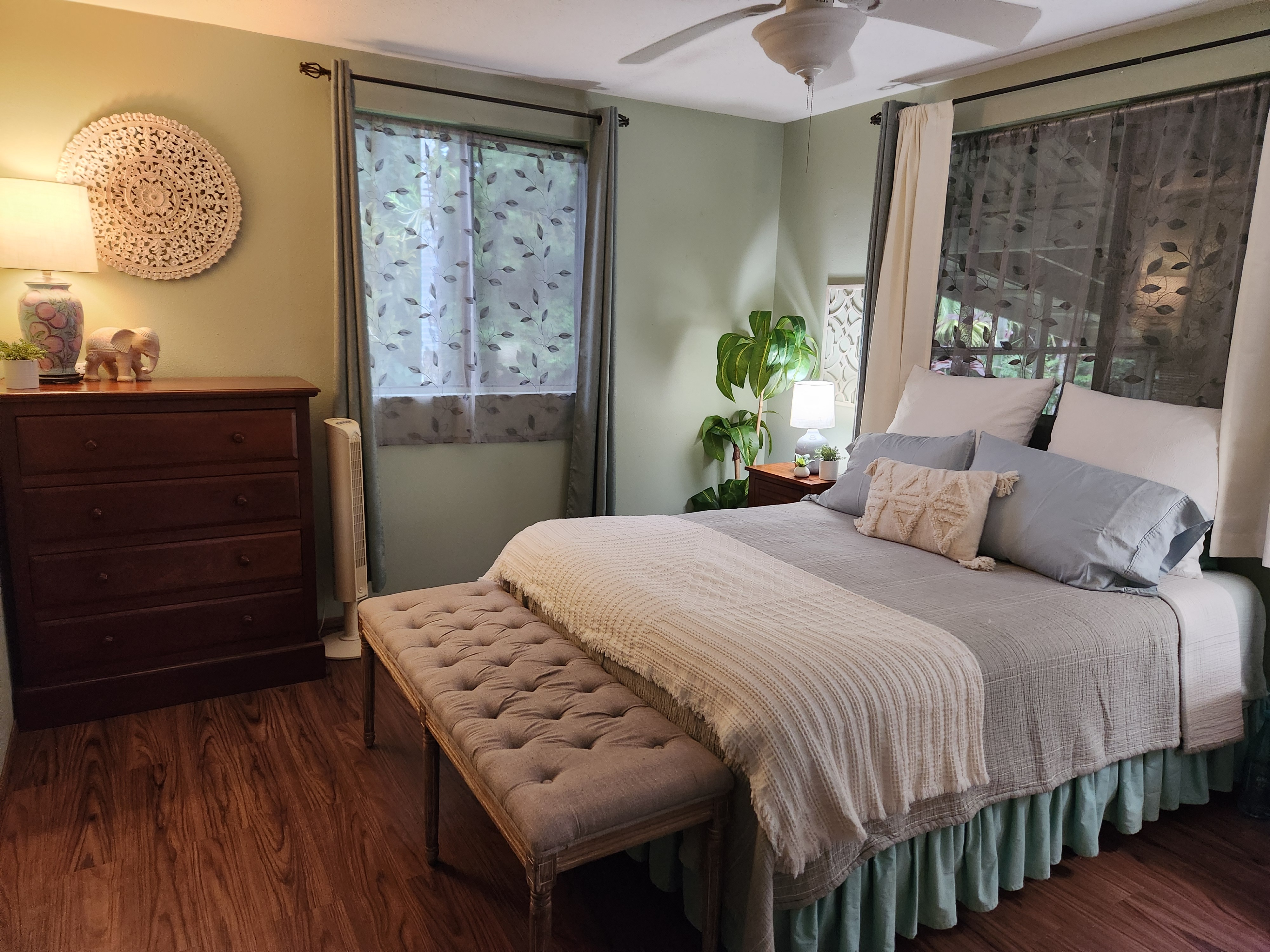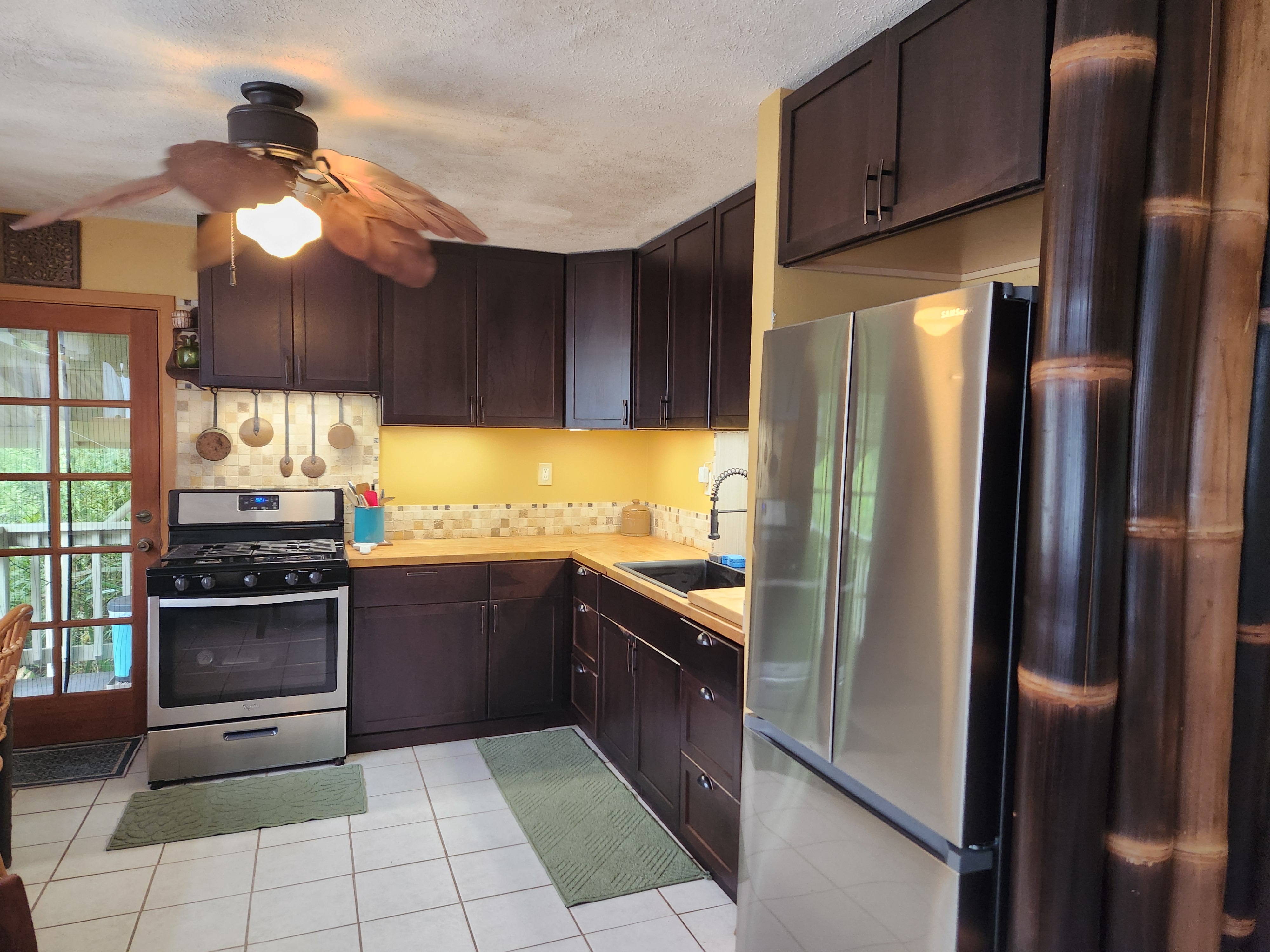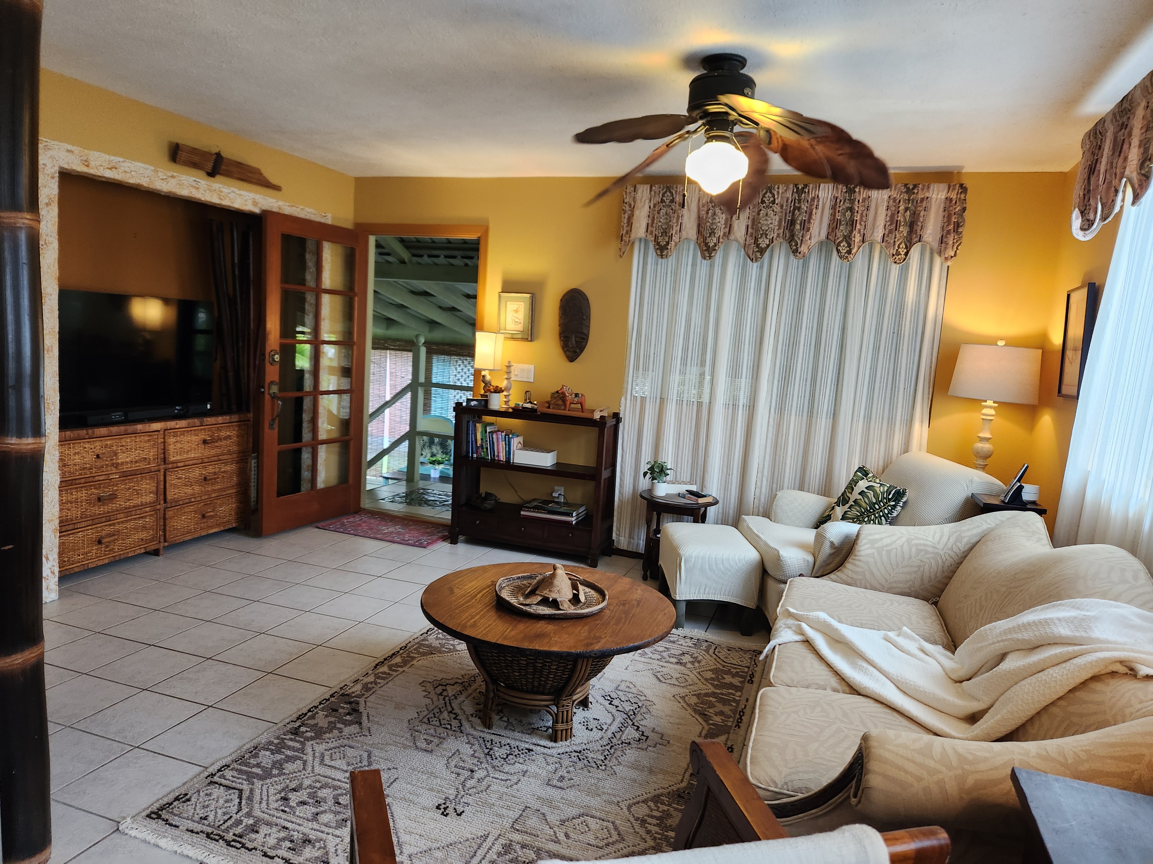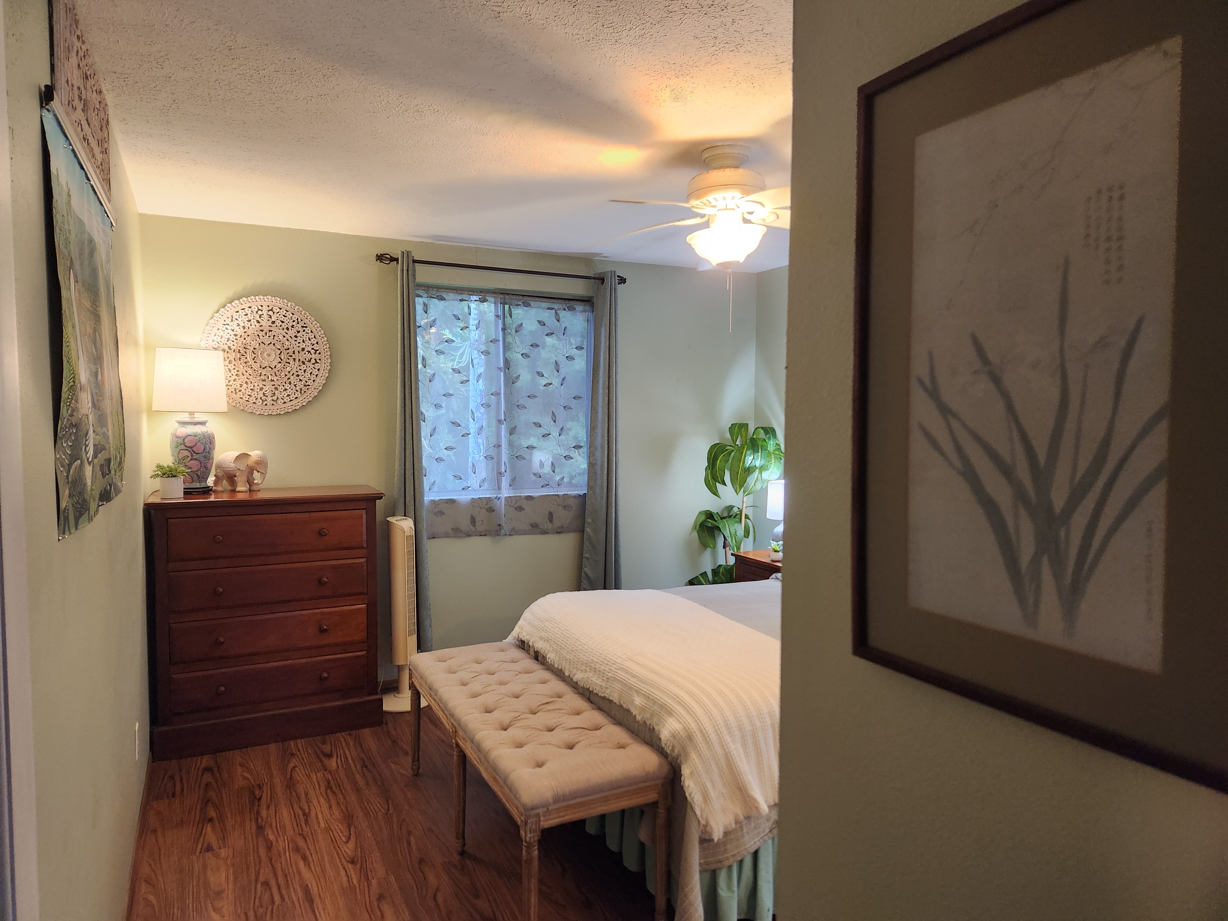 Affordable Paradise! Offered fully furnished!! Sweet 2/1 cottage has many special touches: including a large, screened lanai (384 sq ft) providing the perfect space for entertaining and indoor/outdoor living. At the landing to enter the home is a lovely, tiled floor mural featuring honu (turtles), welcoming you to the home. The living area/ kitchen is open with a bamboo partial wall separating the living and kitchen. Dark espresso cabinets and butcher block counters, tiled backsplash, and ocher walls reflect the tones found in the bamboo. Newer appliances include stainless 5 burner gas range, stainless French door counter-depth refrigerator, large black Kohler sink, w/ restaurant style faucet w/ pull down sprayer. The floors are ceramic tile: great for pets. Two nice-sized bedrooms have large closets, ceiling fans, wall AC unit in primary bedroom, bamboo glass doors, and plank vinyl floors. The bathroom has a new vanity/sink, higher profile toilet, and a tiled walk-in shower. Off the back door is the covered side lanai of 320 sqft, w/ a laundry area,. There's a 10,700 gal. catchment tank and water filtration system (Quantum system & 3 sediment filters). A convenient outside bathroom w/ sliding barndoors is under the covered side lanai & another shower is found in the back garden. There's a circular concrete driveway w/ native stone pillars. Concrete Sidewalks connect carport to home and surround each building. The detached Carport is 576 sqft with a bonus room (192 sqft) provides a versatile space for overflow guests, a home office, or a hobby space. Home is sited on a consolidated double lot (16,080 sqft) in a quiet area with nice neighbors. The beautiful, lush landscape includes a variety of palms, heliconia, Medinilla magnifica, podocarpus, bamboo, Queen Emma lily, Anthuriums, Orchids, Hibiscus, Bromeliads, and so many others. Fruit trees include avocado, tangerine, lemon, macadamia nut, jaboticaba, coffee, pineapples, to name a few.