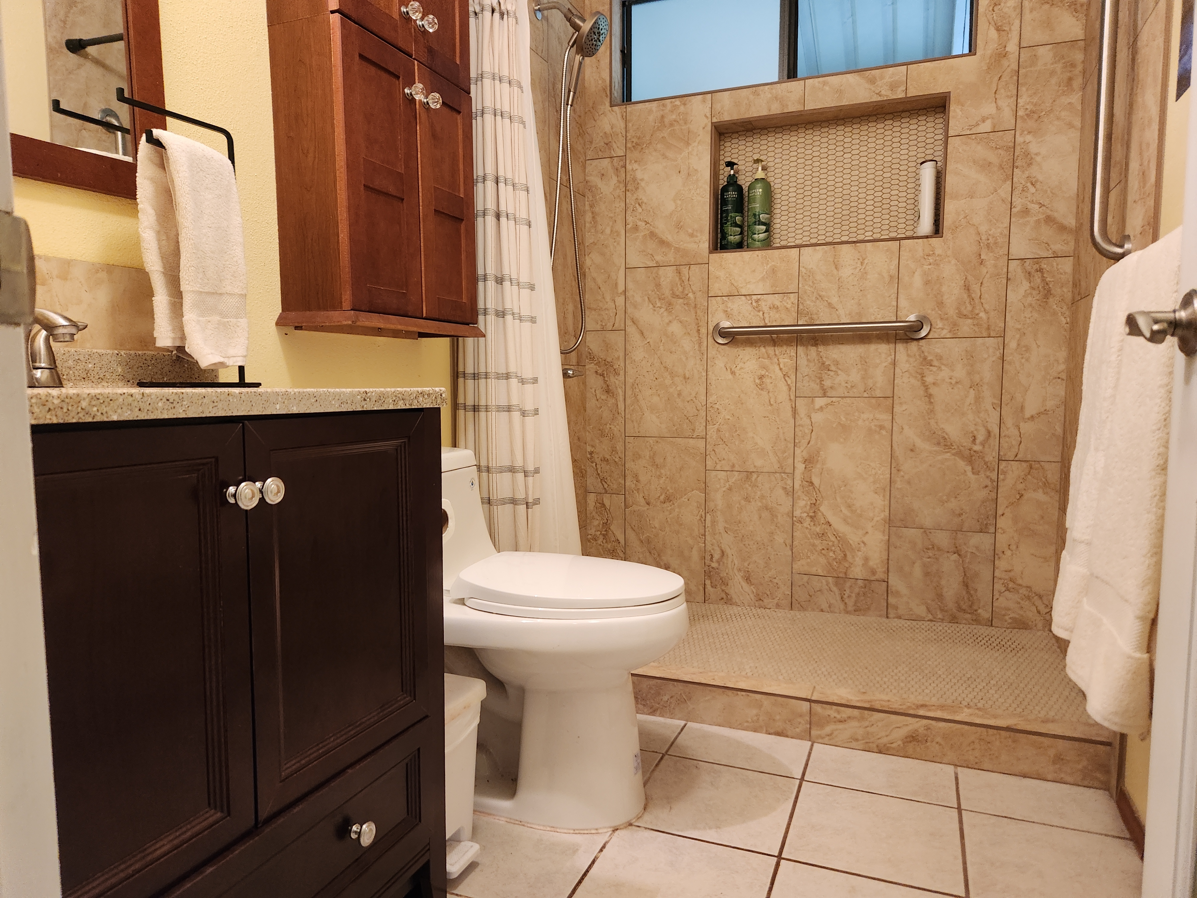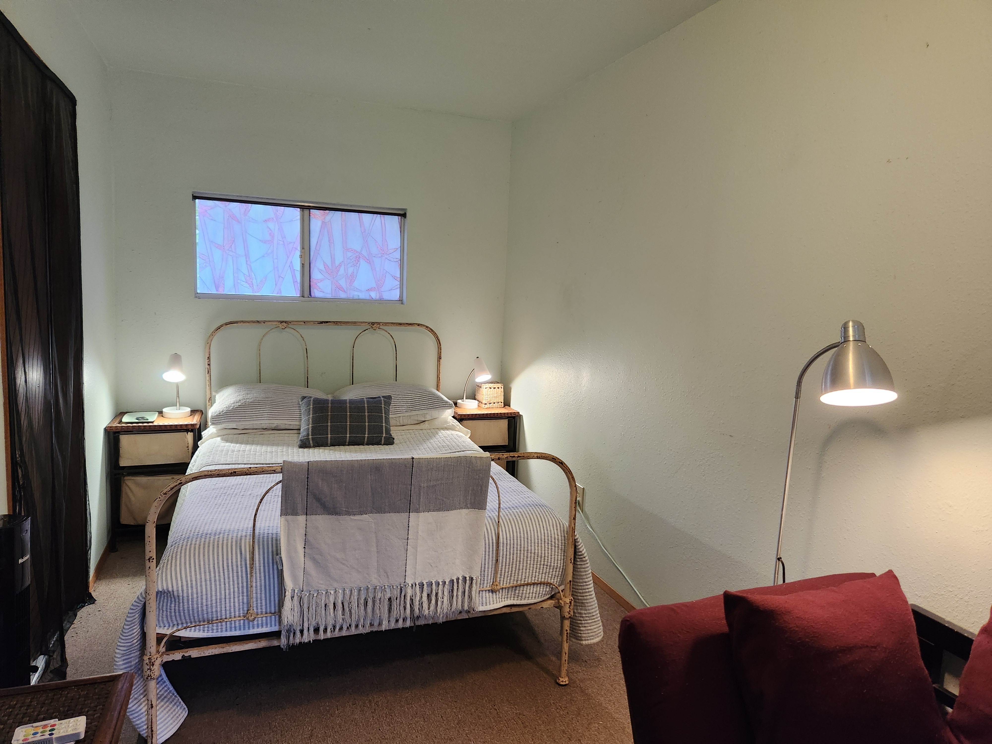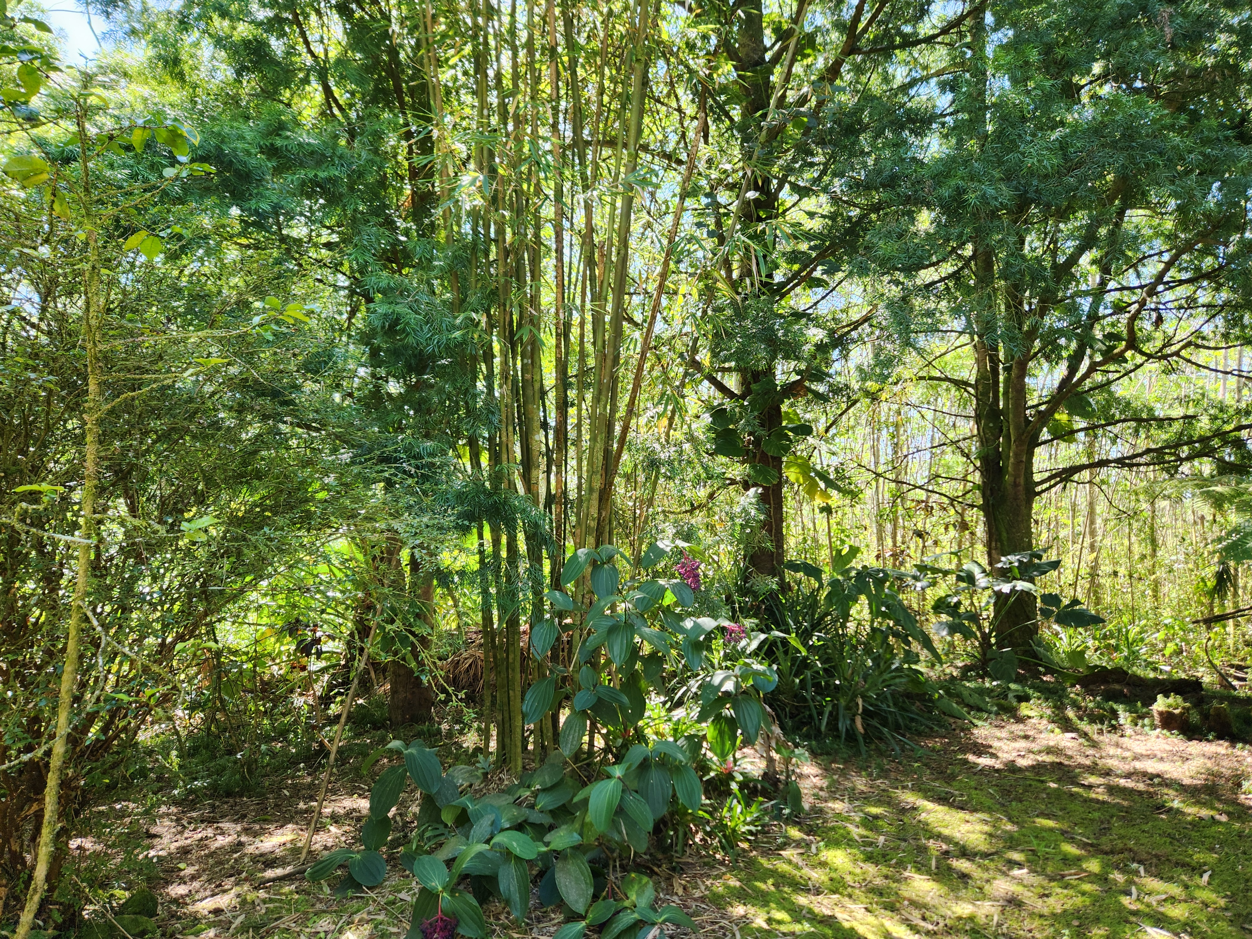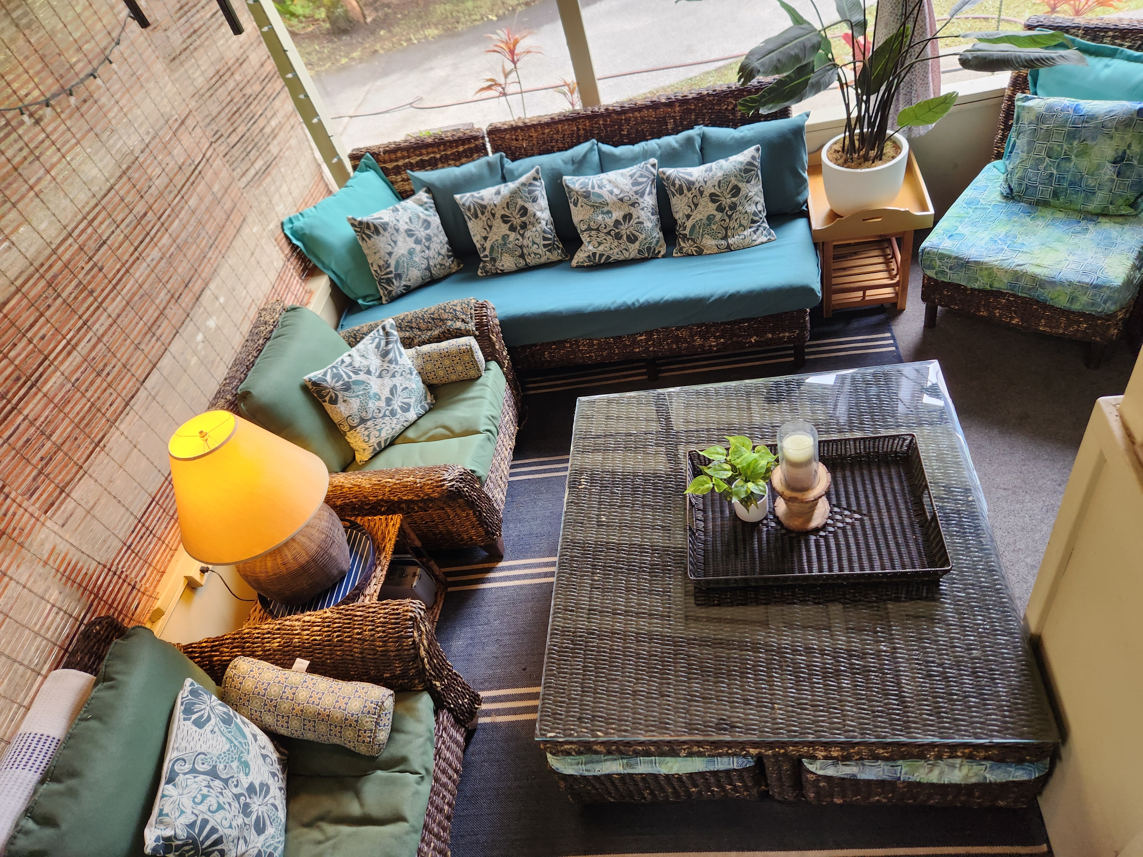 Affordable Paradise! Offered fully furnished!! Sweet 2/1 cottage has many special touches: including a large, screened lanai (384 sq ft) providing the perfect space for entertaining and indoor/outdoor living. At the landing to enter the home is a lovely, tiled floor mural featuring honu (turtles), welcoming you to the home. The living area/ kitchen is open with a bamboo partial wall separating the living and kitchen. Dark espresso cabinets and butcher block counters, tiled backsplash, and ocher walls reflect the tones found in the bamboo. Newer appliances include stainless 5 burner gas range, stainless French door counter-depth refrigerator, large black Kohler sink, w/ restaurant style faucet w/ pull down sprayer. The floors are ceramic tile: great for pets. Two nice-sized bedrooms have large closets, ceiling fans, wall AC unit in primary bedroom, bamboo glass doors, and plank vinyl floors. The bathroom has a new vanity/sink, higher profile toilet, and a tiled walk-in shower. Off the back door is the covered side lanai of 320 sqft, w/ a laundry area,. There's a 10,700 gal. catchment tank and water filtration system (Quantum system & 3 sediment filters). A convenient outside bathroom w/ sliding barndoors is under the covered side lanai & another shower is found in the back garden. There's a circular concrete driveway w/ native stone pillars. Concrete Sidewalks connect carport to home and surround each building. The detached Carport is 576 sqft with a bonus room (192 sqft) provides a versatile space for overflow guests, a home office, or a hobby space. Home is sited on a consolidated double lot (16,080 sqft) in a quiet area with nice neighbors. The beautiful, lush landscape includes a variety of palms, heliconia, Medinilla magnifica, podocarpus, bamboo, Queen Emma lily, Anthuriums, Orchids, Hibiscus, Bromeliads, and so many others. Fruit trees include avocado, tangerine, lemon, macadamia nut, jaboticaba, coffee, pineapples, to name a few.