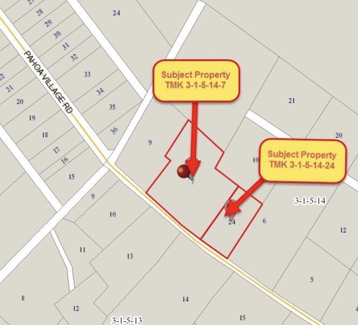 Rarely available 2 separate vacant lots with combined land area approximately 2.18 acres located on main Pahoa Village rd. Parcel 7 situated on 1.6 acres zoned CV-10 (Village Commercial, allowing for a variety of potential uses), and the adjacent Parcel 24 is a .58 acre lot zoned RS-15 (Single Family Residential). These are great opportunity for residential and business operators - Pahoa is an iconic historical much visited area that has, shopping center, entertainment, boutique shops, banks, farmers market, community pool, and more, and this property has large frontage on main fair through road and expansive enough offering both privacy and commercial exposure. Package sale shall include 2 properties: 15-2815 Pahoa Village Road, TMK 3-1-5-14-7. CV-10 - Village Commercial Zoning: 1.6 acres. MLS Listing #727823 15-2819 Pahoa Village Road, TMK 3-1-5-14-24. RS-15 - Single Family Zoning. Urban State Land Use: 25,320 sq. ft. / .58 acre of land. MLS Listing #727824 Both properties combined approximately 2.18 Acres Lots has been dozed, graded and frontage fenced with Dual sliding gated entrances. Per the Department of Water Supply, both parcels have available service laterals for installation of a water meter. Both parcels are serviceable for TV and Internet connection.