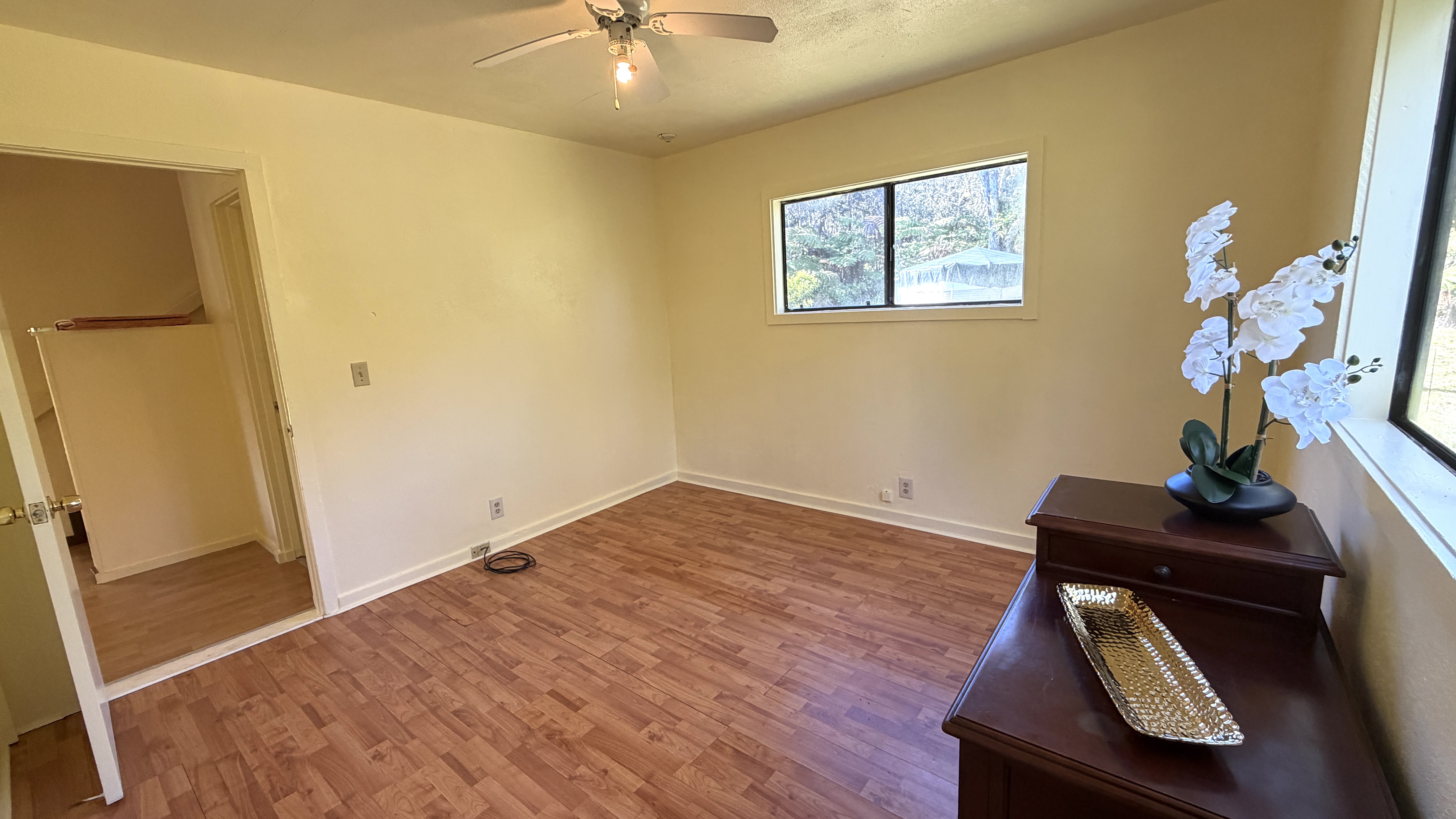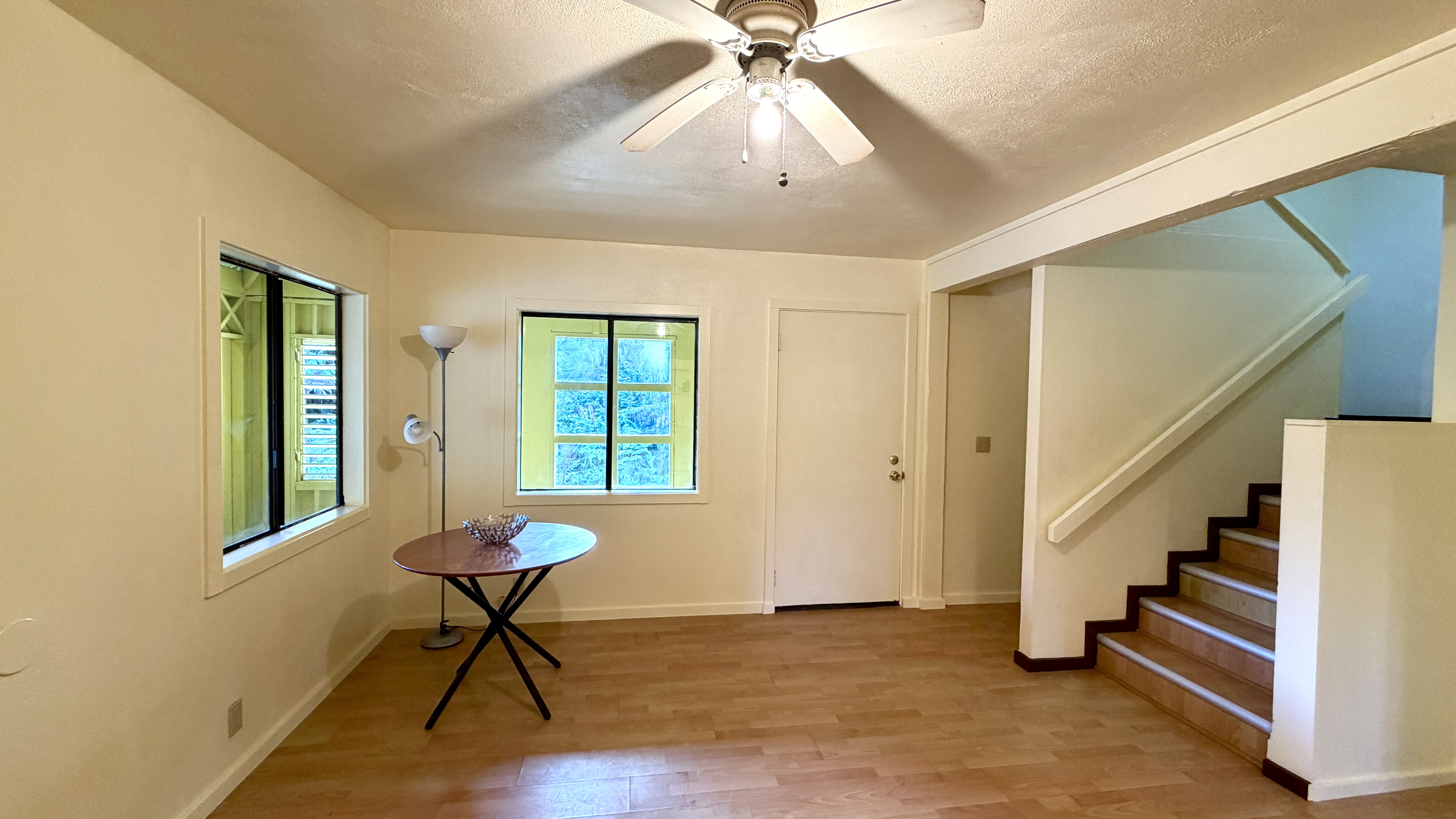 Discover your next home, nestled in tranquil Ohia Estates! This enchanting 2-story residence is a perfect blend of comfort and opportunity, ready for some updating and your personal touch to transform it into your ideal sanctuary. Step onto the welcoming wrap-around front porch and enter a bright and airy living space adorned with multiple windows and high ceilings. The main floor has a cozy layout that includes a well-proportioned kitchen, with space for new appliances, a comfortable dining/living room, a guest bathroom, and a convenient bedroom, or spacious living room. Ascend the winding staircase to find two additional bedrooms offering stunning views, a shared bathroom, and a cozy second living area–perfect for relaxation on cool evenings. A dedicated space for an electric heater ensures warmth and comfort year-round. The interior has been freshly repainted, and flooring has been installed throughout. The kitchen is ready for your choice of appliances, allowing you to design the culinary space of your dreams. Set on a generous, fully fenced,15,700 sqft flag lot, this home is surrounded by lush greenery and offers a tranquil atmosphere for you to unwind. The thoughtful landscaping includes a beautiful tapestry of native foliage with large Ohias and ginger along the back of the property, and Koa and aloe in the back yard. The neighboring property, which buffers this one from the road, is a tapestry of ornamentals which cascade along the road and driveway, enhancing your entrance. Enjoy the benefits of elevated living in Volcano, where crisp, sunny days blend seamlessly with cool evenings. Just a short drive away, you’ll find shopping, dining, and amenities in Volcano town, with Hilo and the airport only 45 minutes away. This charming home combines privacy, character, and potential in a picturesque setting. Don’t miss your chance to make it your own. An assumable VA loan is available with $70k down (plus Buyer closing costs) at 3.5% interest.