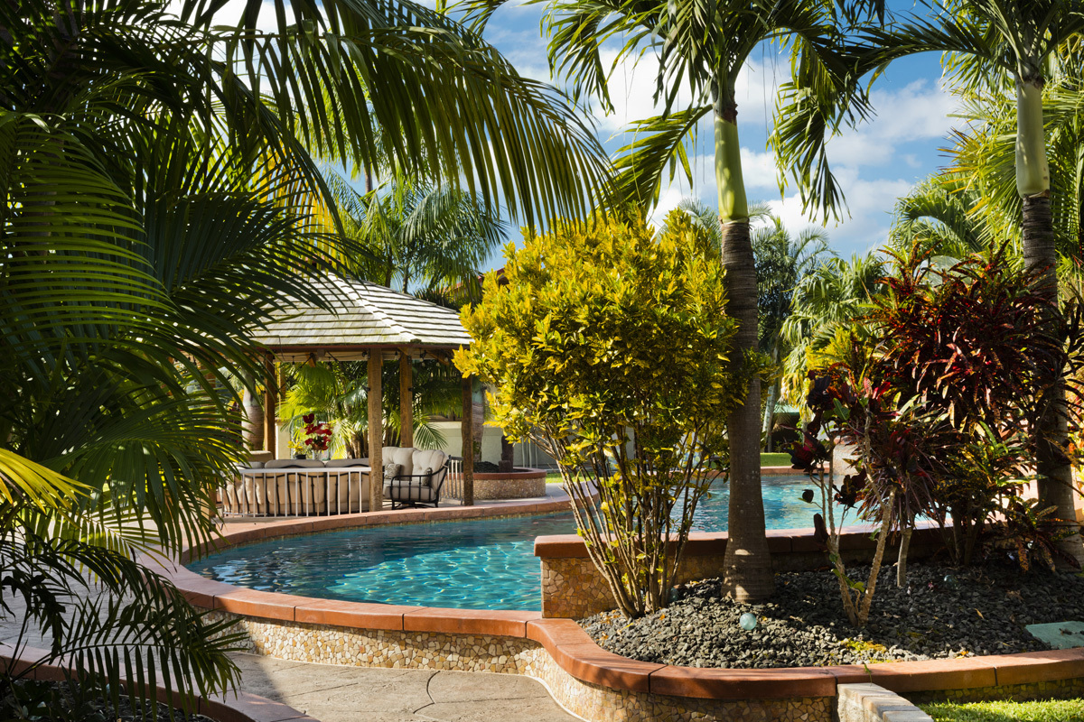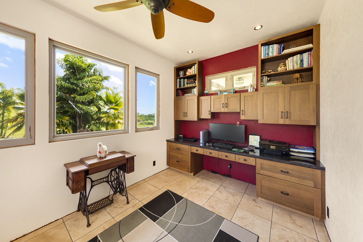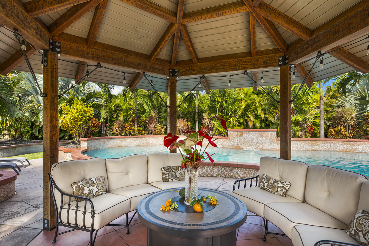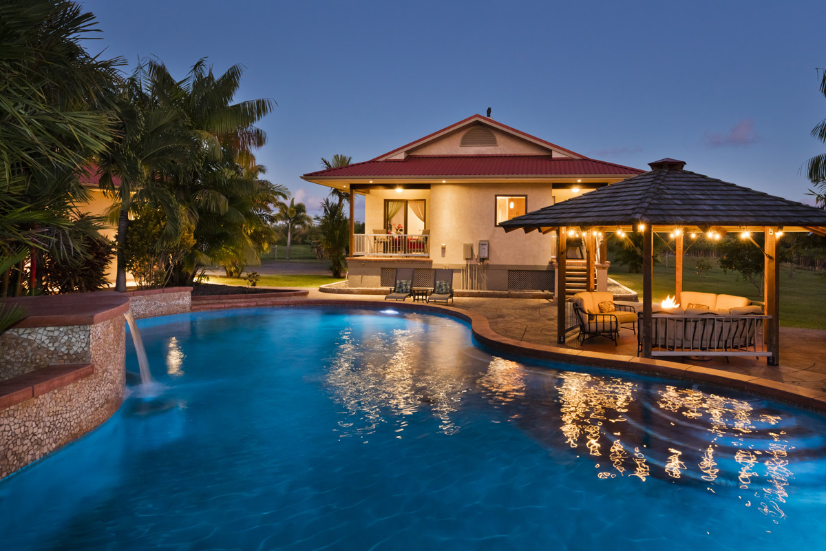 Welcome to Kamaili Oasis, a meticulously crafted off-grid sanctuary, 11 years in the making. Nestled on 5 fenced acres, this rural paradise offers unparalleled privacy and seclusion–an ideal legacy home and retreat. Upon arrival, the driveway gently winds through manicured grounds, showcasing a fruit orchard and an array of vibrant trees, palms, and ornamentals. The stylish house and adjacent 3-car garage immediately showcase the stunning architectural design and craftsmanship! The custom-built 1,664 sq ft home features 2/1.5 baths, 9.5-foot ceilings, and luxurious finishes. Expansive windows and pocket doors open and close seamlessly. High-end finishes include travertine floors, custom-troweled walls/ ceilings, built-in bookshelves, a wet bar, soft-close Walnut cabinetry, Kohler faucets, and fixtures throughout. The Ohana unit is perfect for guests and family. The 520 SF 1-bedroom, 1-bath home mirrors the main house in craftsmanship. The 2 separate covered lanais, totaling 400 sq ft of space, offer an ideal balance of privacy and connectivity. At the heart of the property is the 42,000-gallon gunite in-ground saltwater pool (50' L x 25' W), with a waterfall, shaped similarly to an infinity 8, graced with natural stone, surrounded by palms, a gazebo, and a fire pit. The impressive 1,664 sq ft 3-car garage has oversized 10.5’ x 10.5’ garage doors, finished walls and ceiling, two 128 sq ft storage rooms, a 64 sq ft solar equipment room, a 128 sq ft storage room, and a ½ bath for storage and functionality. The 600 sq ft Ag building has an 11’ x 16’ garage door and a mezzanine for dry storage, 12' covered lanais on three sides, and 3,000 gal of water storage. A 384 sq ft greenhouse with raised beds is ready for your fresh vegetables. The solar power system has 24 panels (8400W), two inverters, charge controllers & a 7kW backup generator with remote start. The Fero concrete catchment tank is 13,300 gal. Seller Financing available.