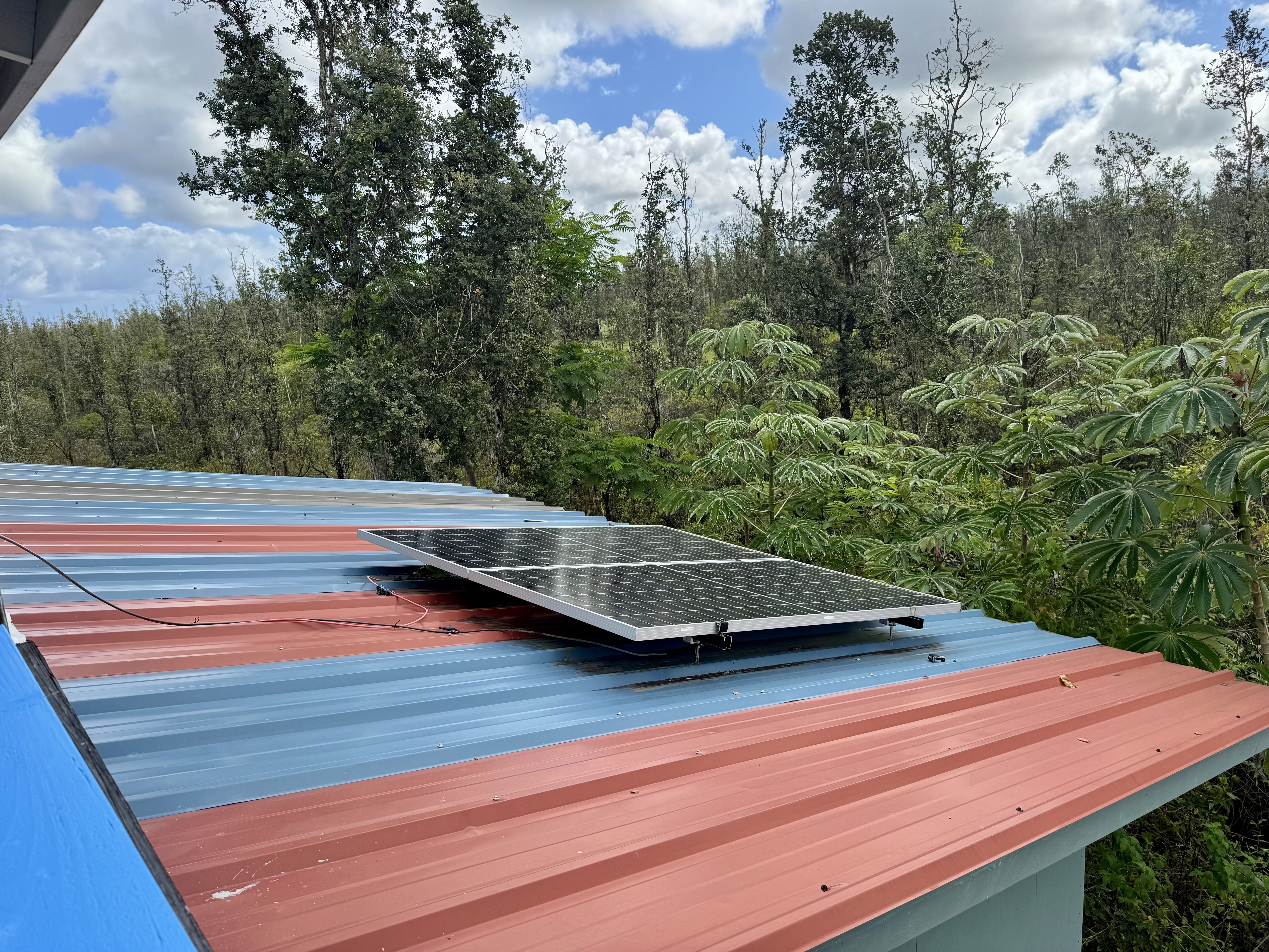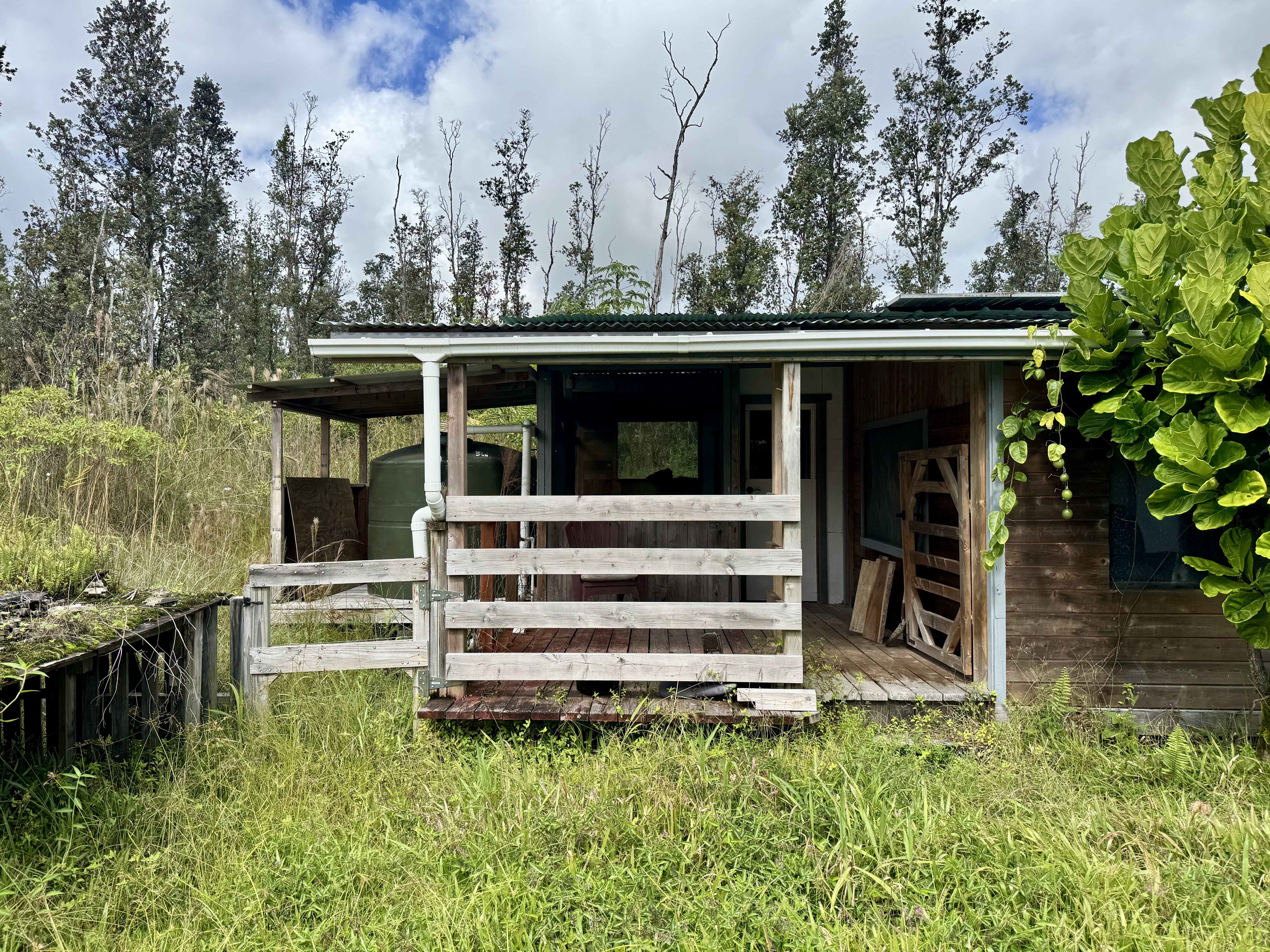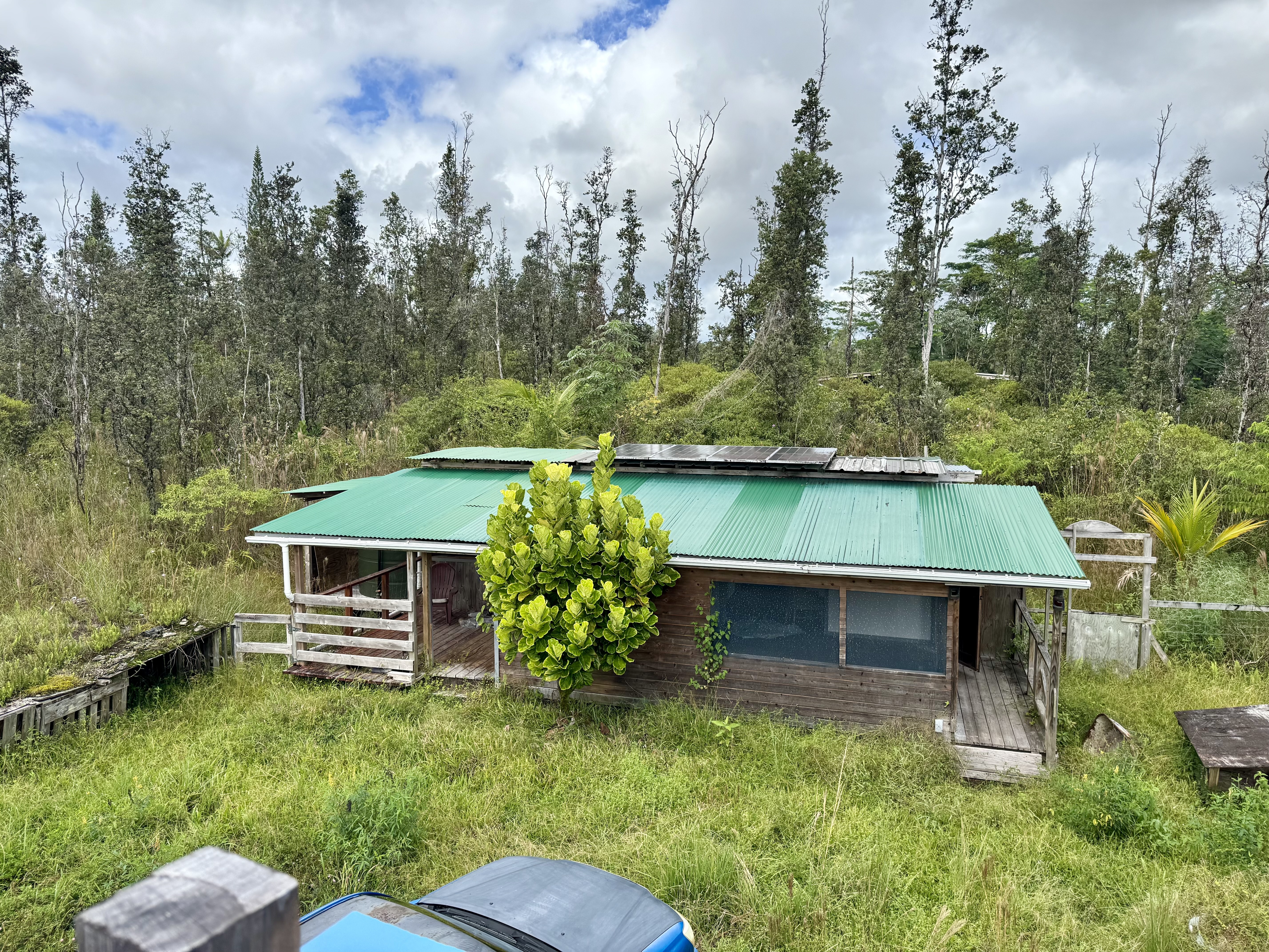 Rustic two-level structure with metal roof, upper lanai, and flexible interior layout. Solar system in place, surrounded by tropical greenery for privacy and airflow.