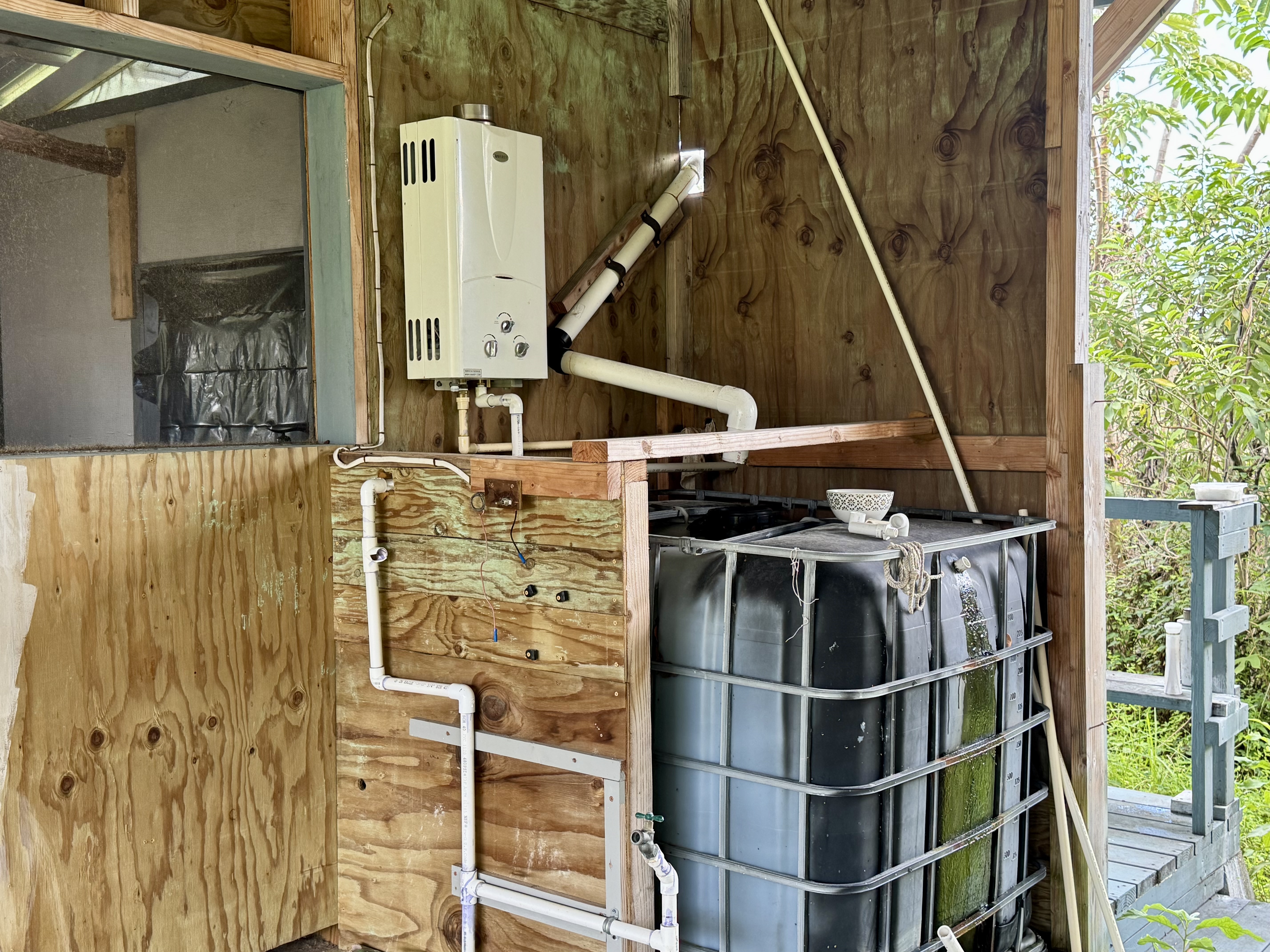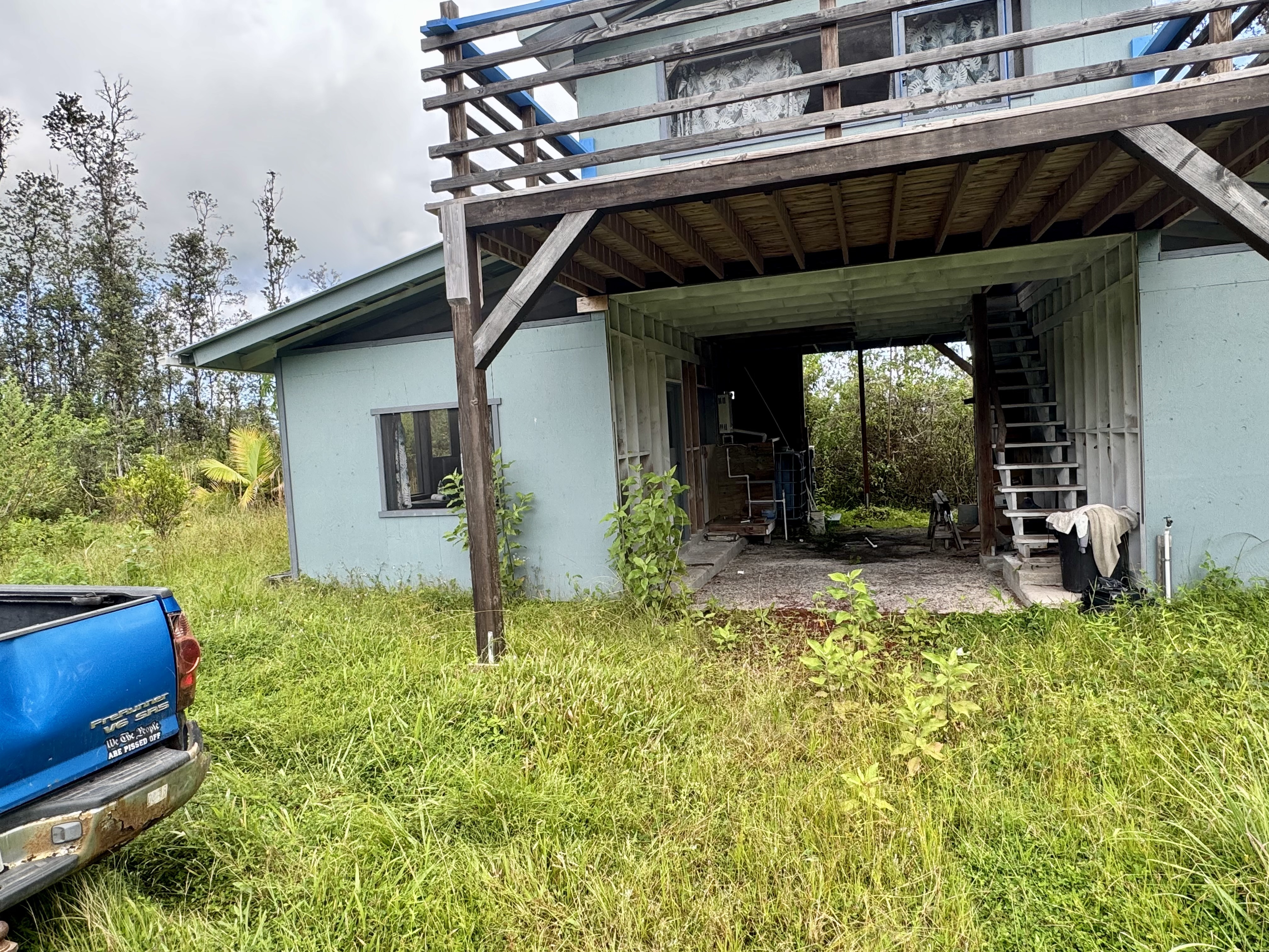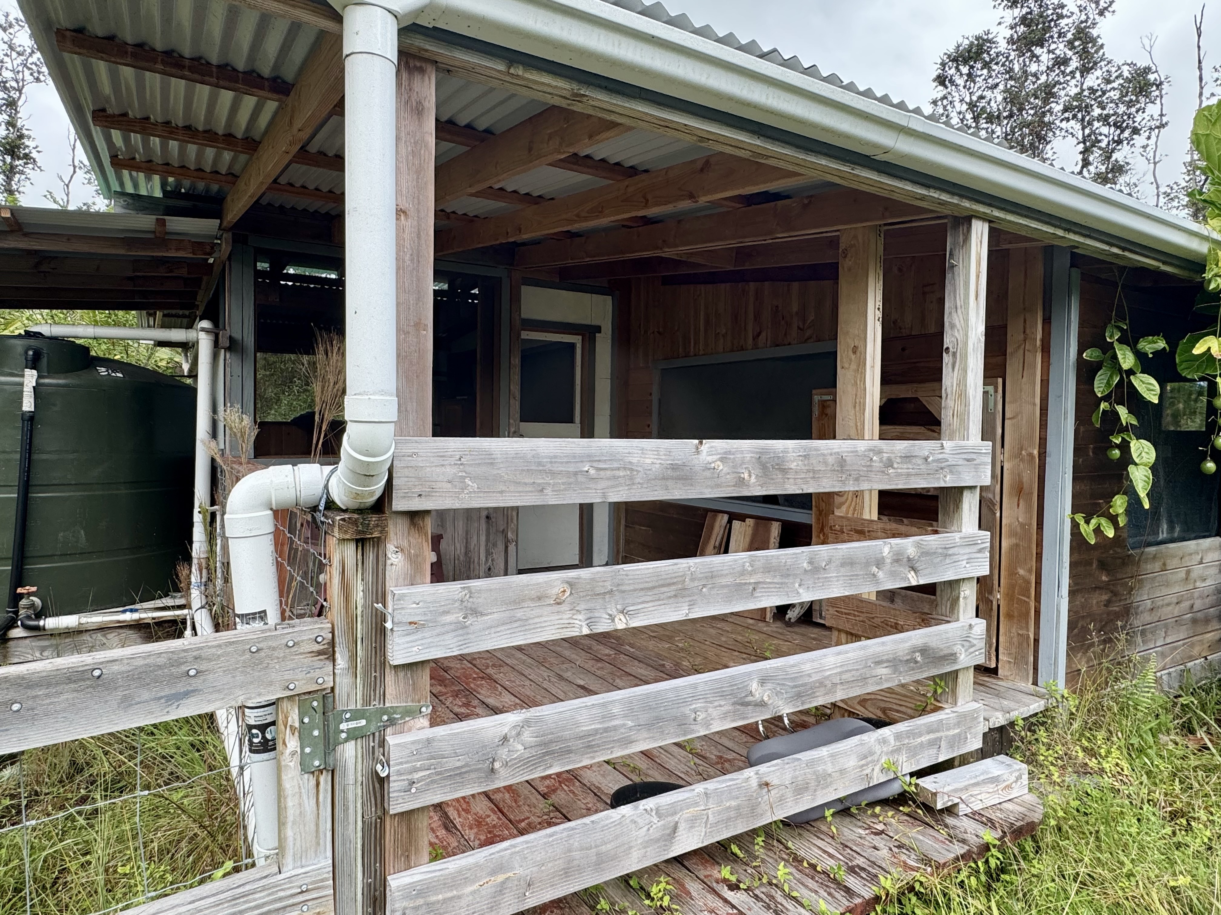Rustic two-level structure with metal roof, upper lanai, and flexible interior layout. Solar system in place, surrounded by tropical greenery for privacy and airflow.