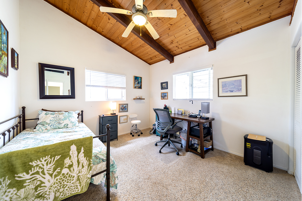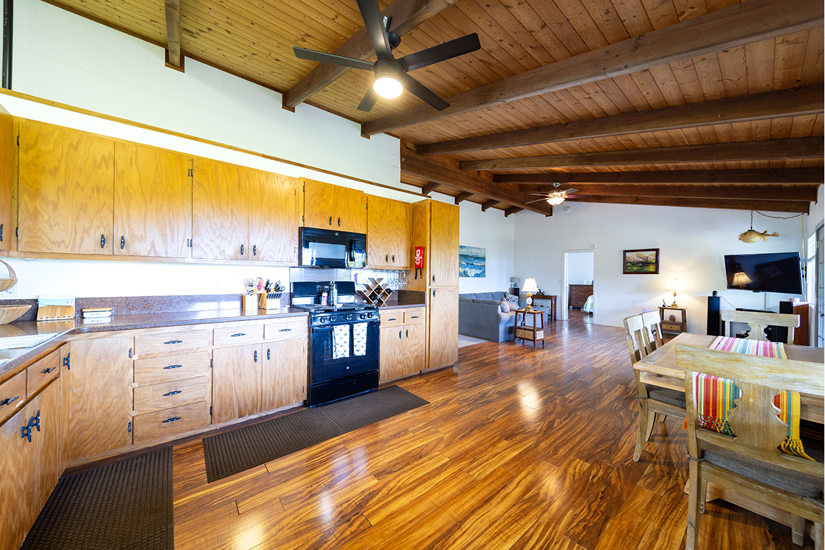 Vaulted ceilings throughout, curly Koa laminate and tile flooring.