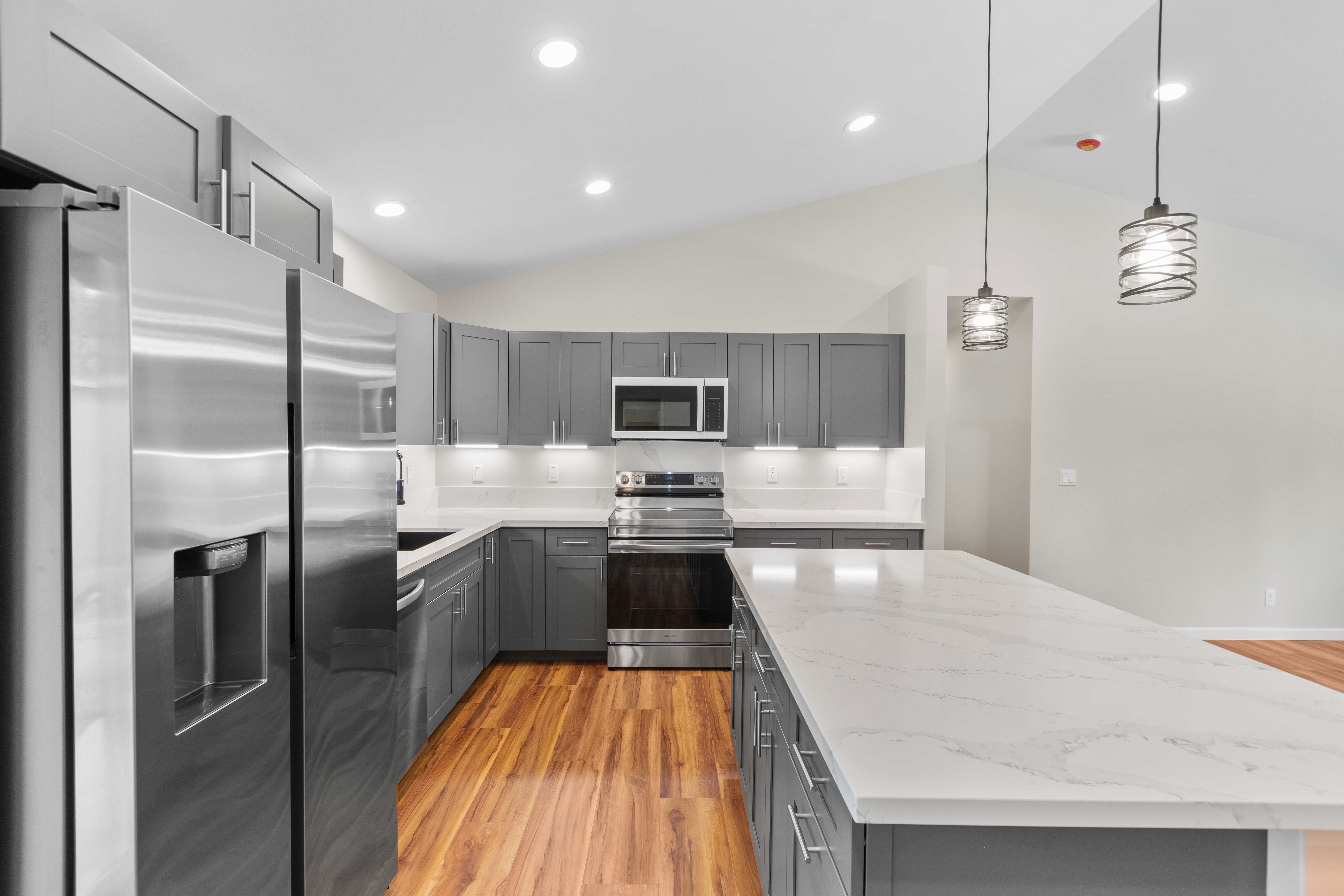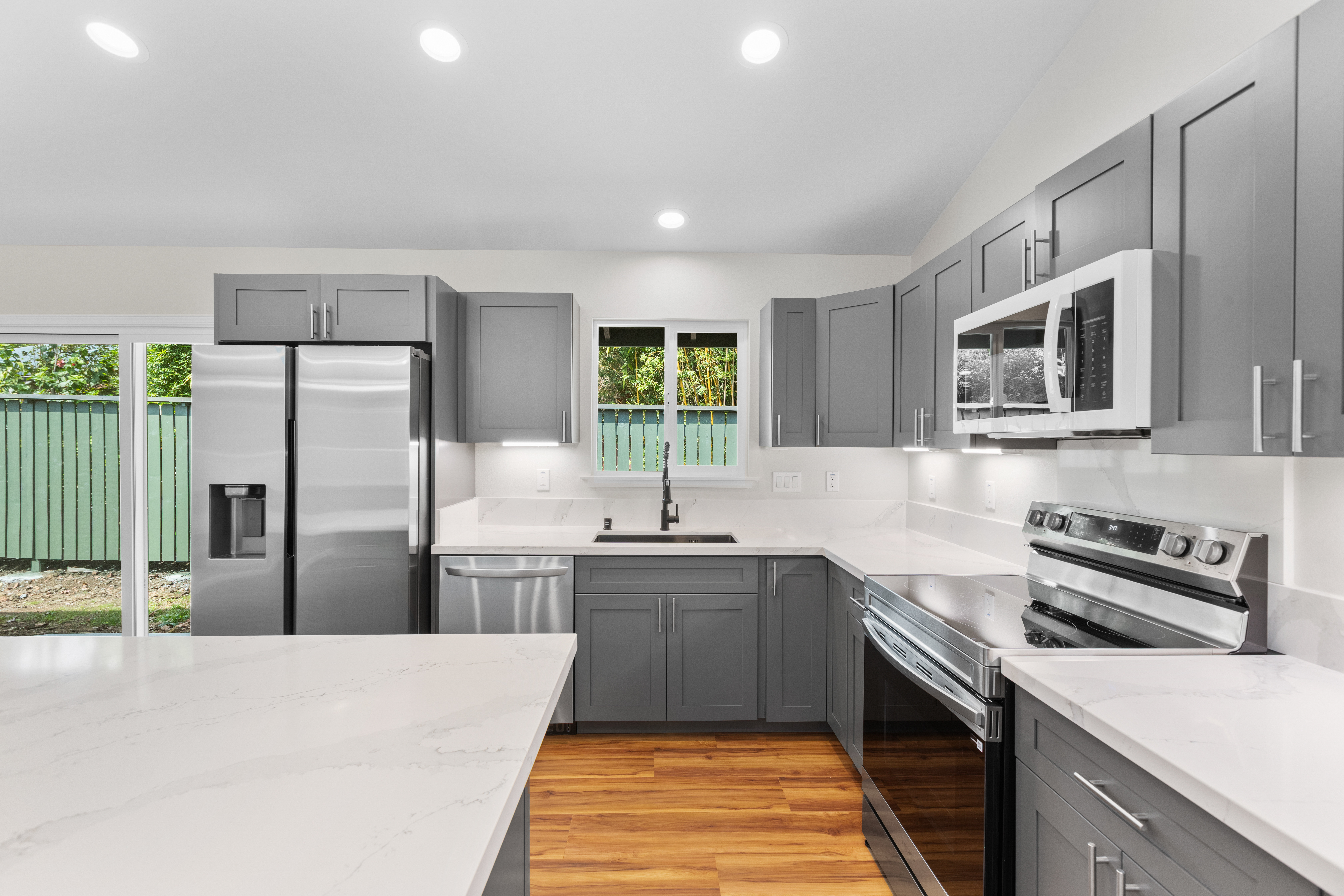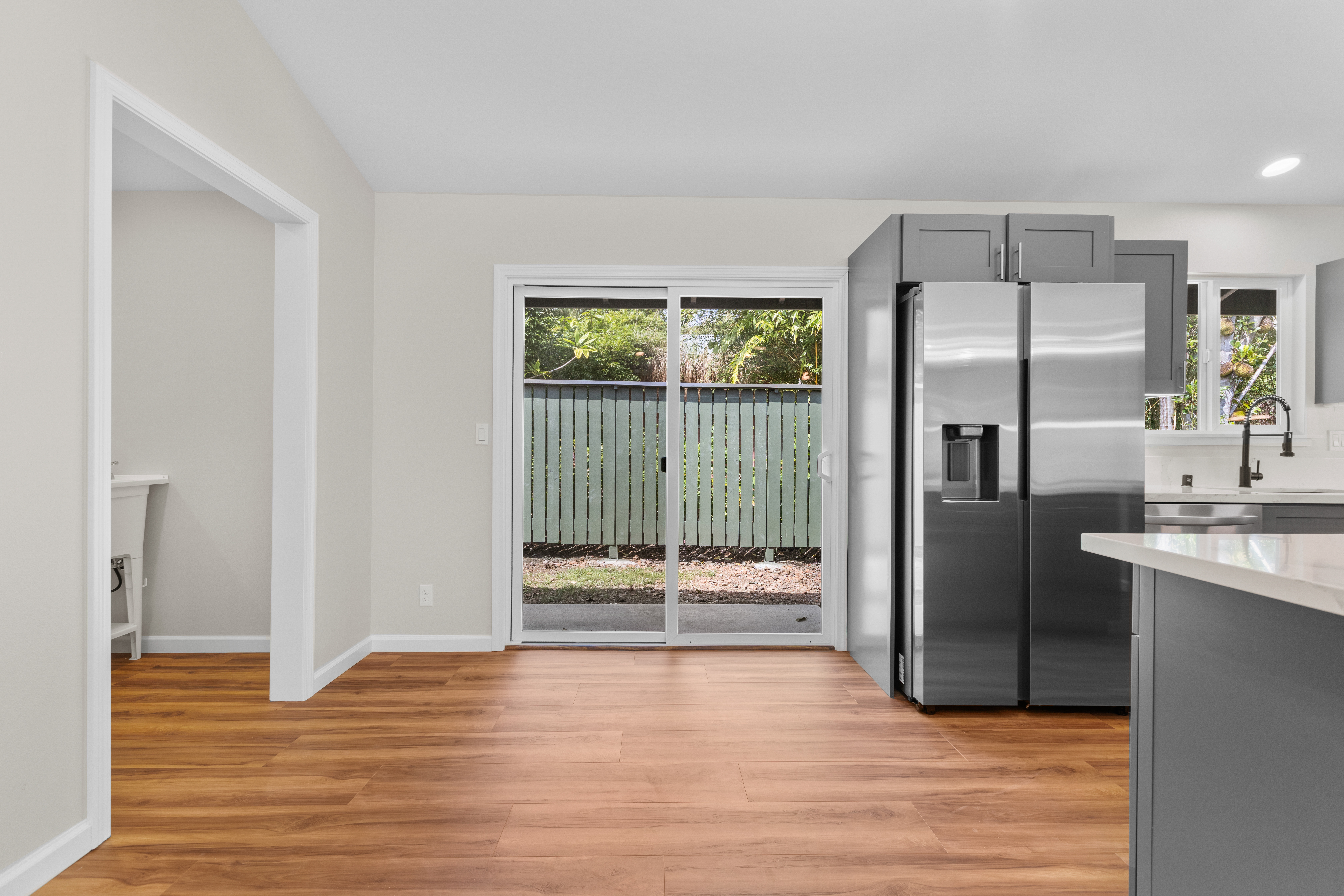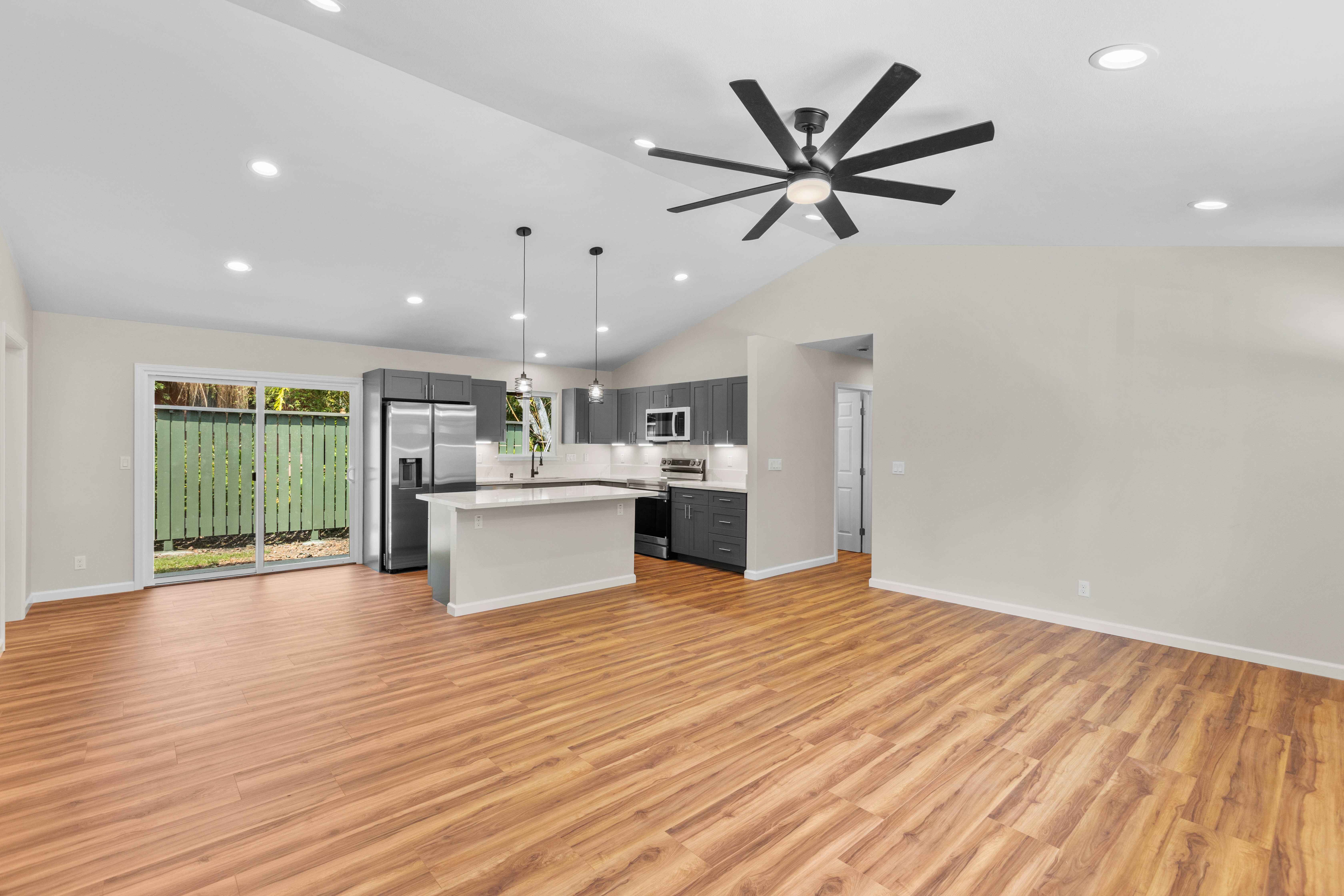 Beautiful new home in Mountain View in a great location! Brand new build. Gorgeous new flooring and light fixtures. All new appliances, which include stove, oven, microwave, dishwasher and refrigerator. Big island in the kitchen, for all your food prep needs. Cute laundry room with a washer and dryer hookup. Beautiful laminate flooring that looks like real hardwood. Lovely bathrooms, with beautiful countertops. Large property with a lot of outdoor space, and plenty of room to plant a garden. Partially fenced. The home comes with a full garage and a utility sink. Only a short drive to Keaau, where there’s shopping and dining options, and only a 20-minute drive to Hilo, where there are more shopping and dining options, along with a mall, a movie theatre, and more.
