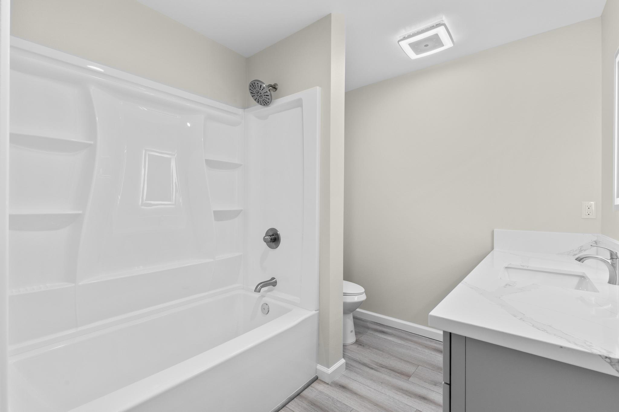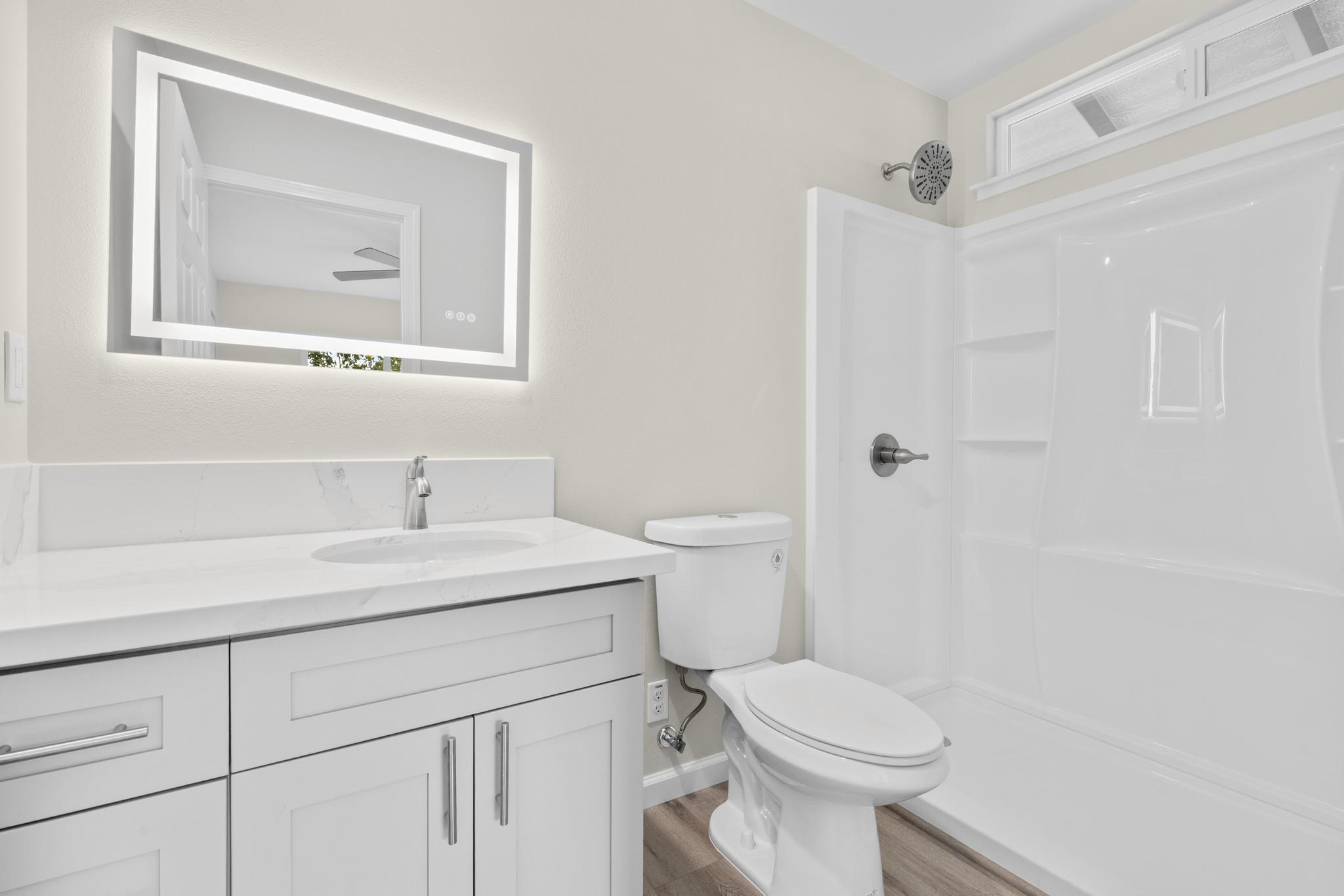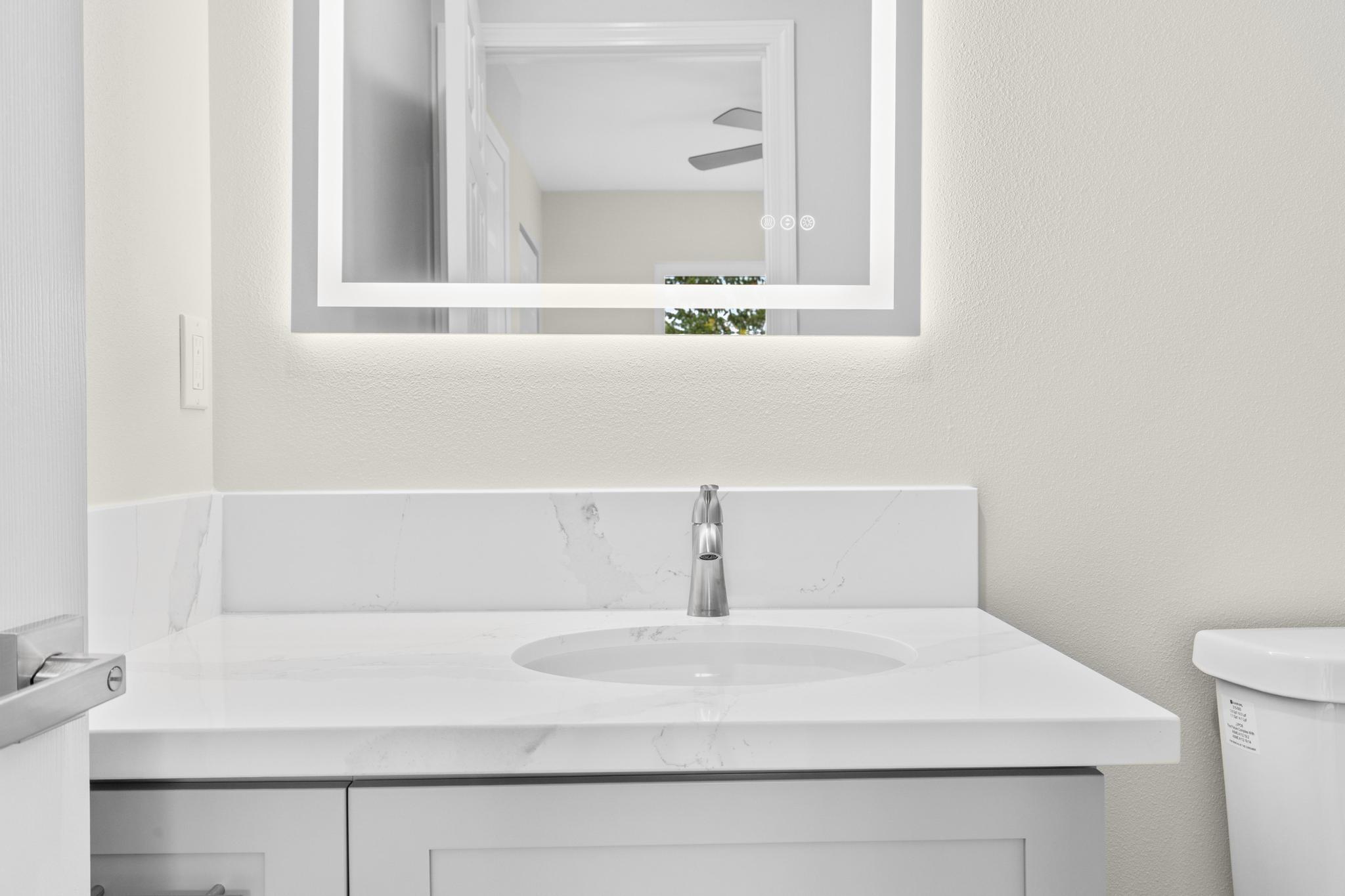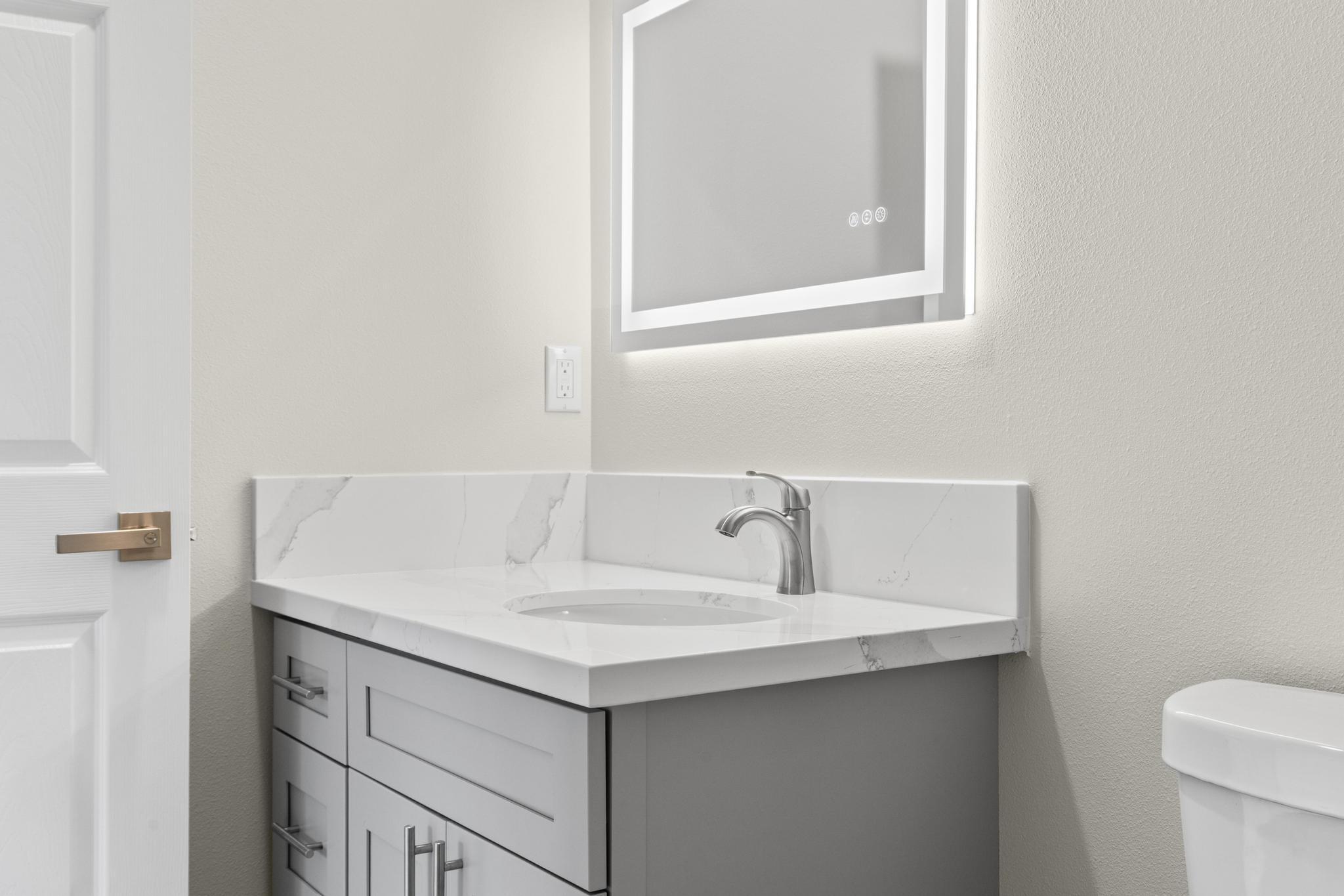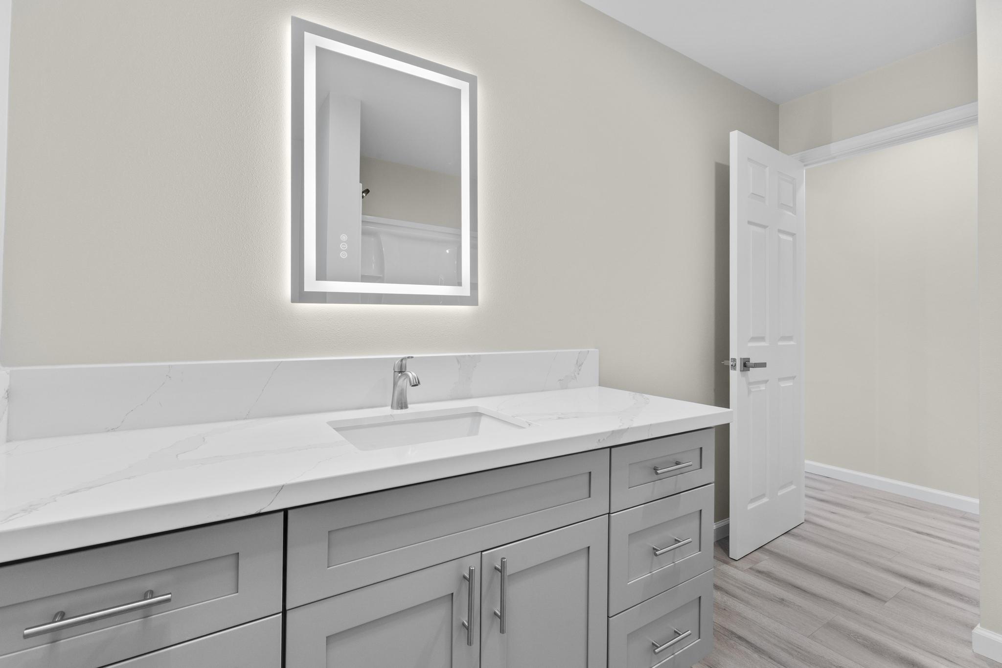 The two full baths boast a functional bathtub and walk in shower, plenty of storage space, quartz countertop, and back-lit LED mirror.