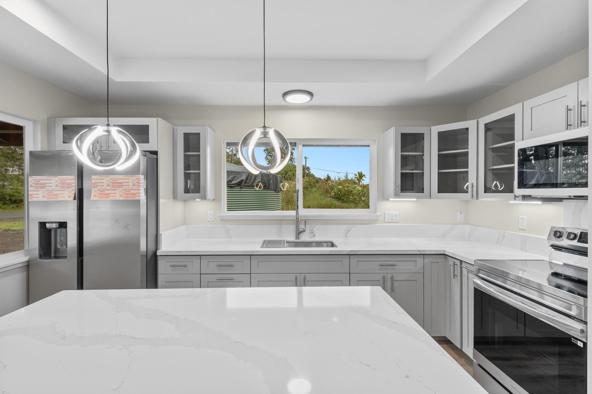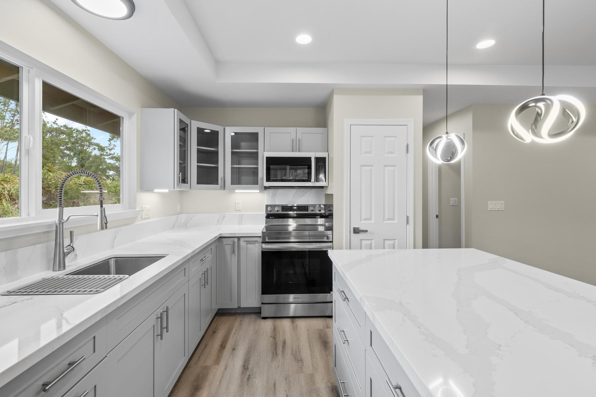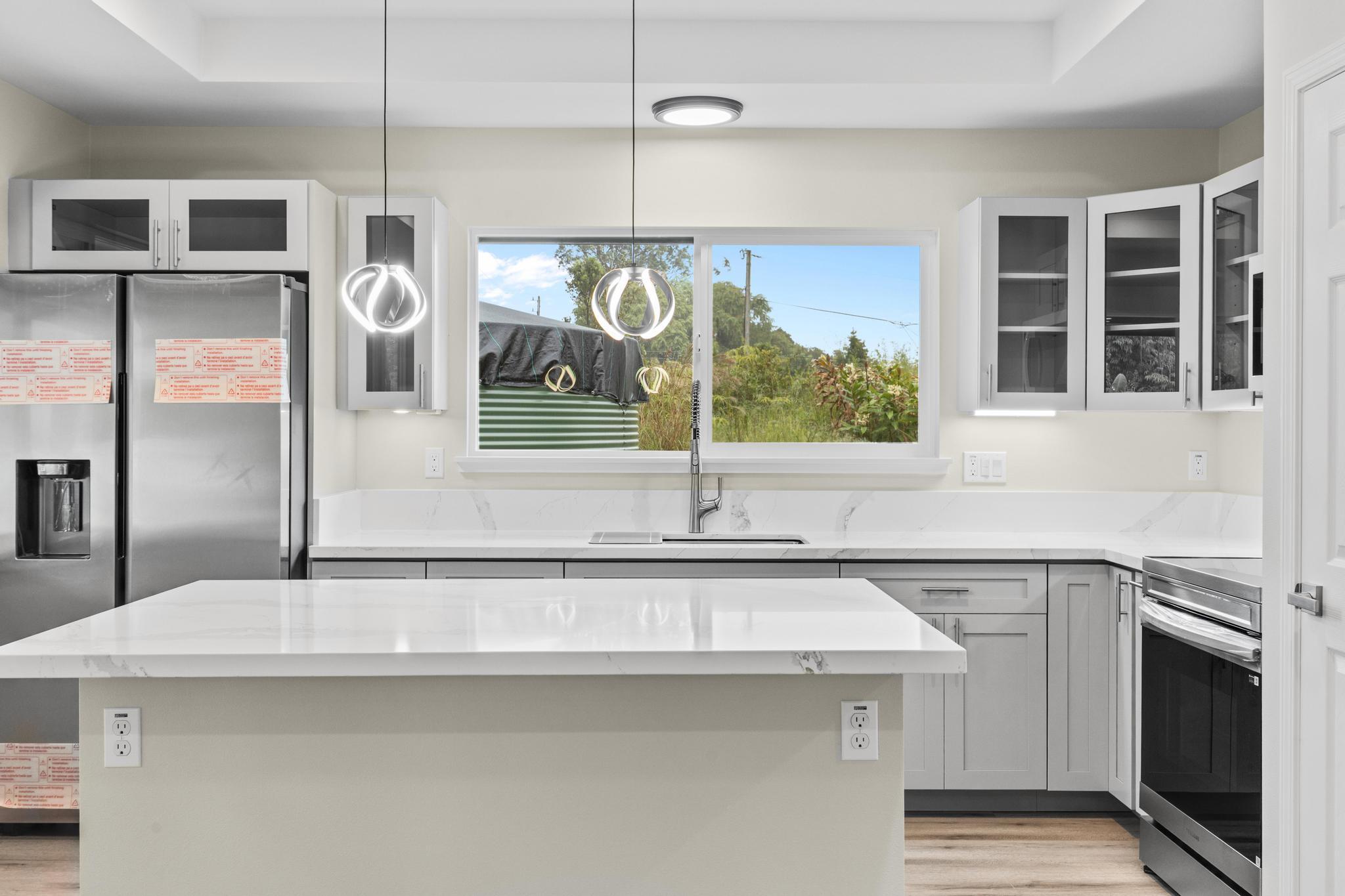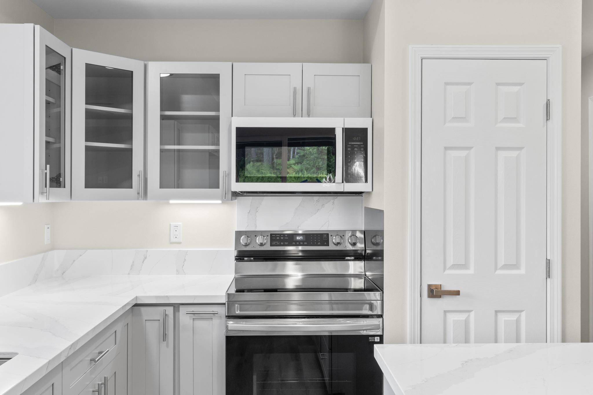 With its high ceilings and clean design lines, this house feels very comfortable. The open-concept kitchen features quartz countertops, elegant cabinetry with soft-close drawers and stainless steel appliances include a refrigerator, electric stove and microwave hood.