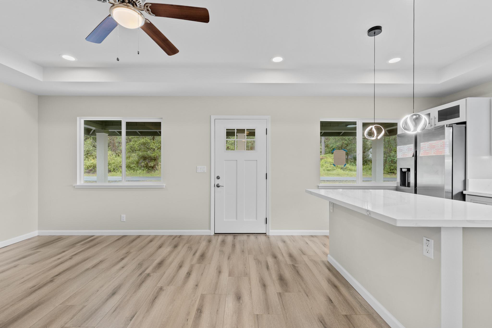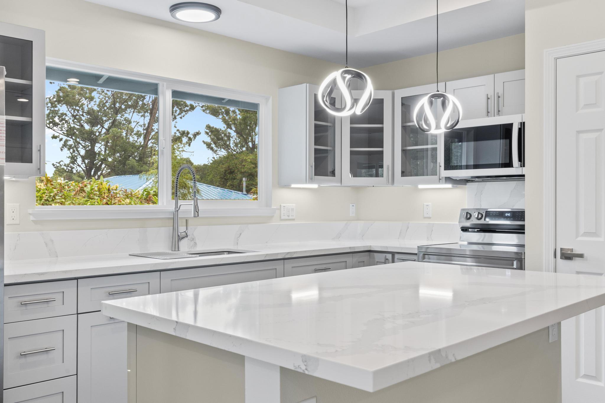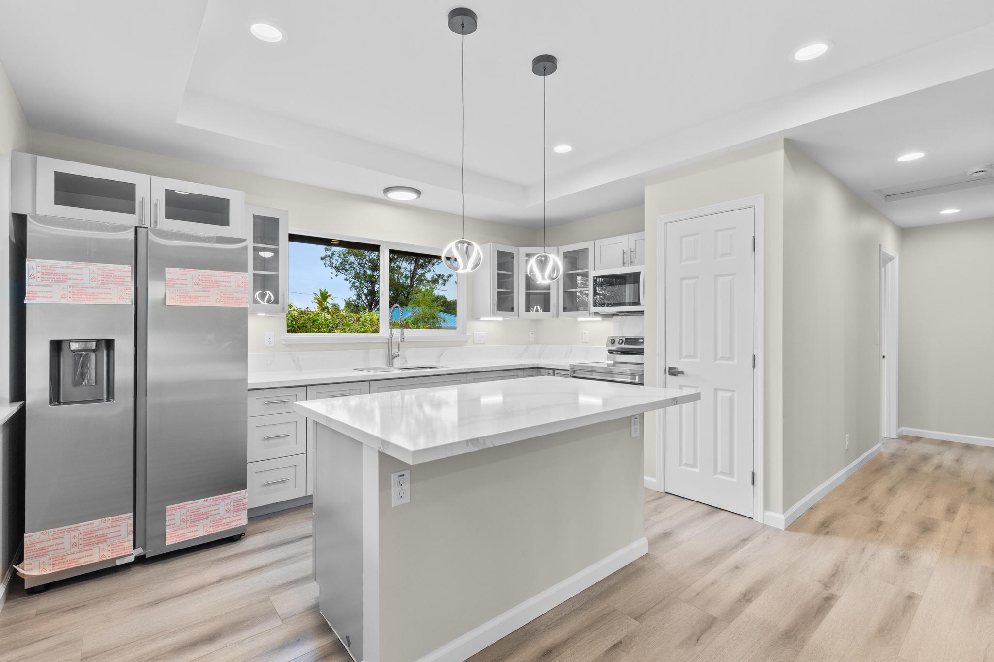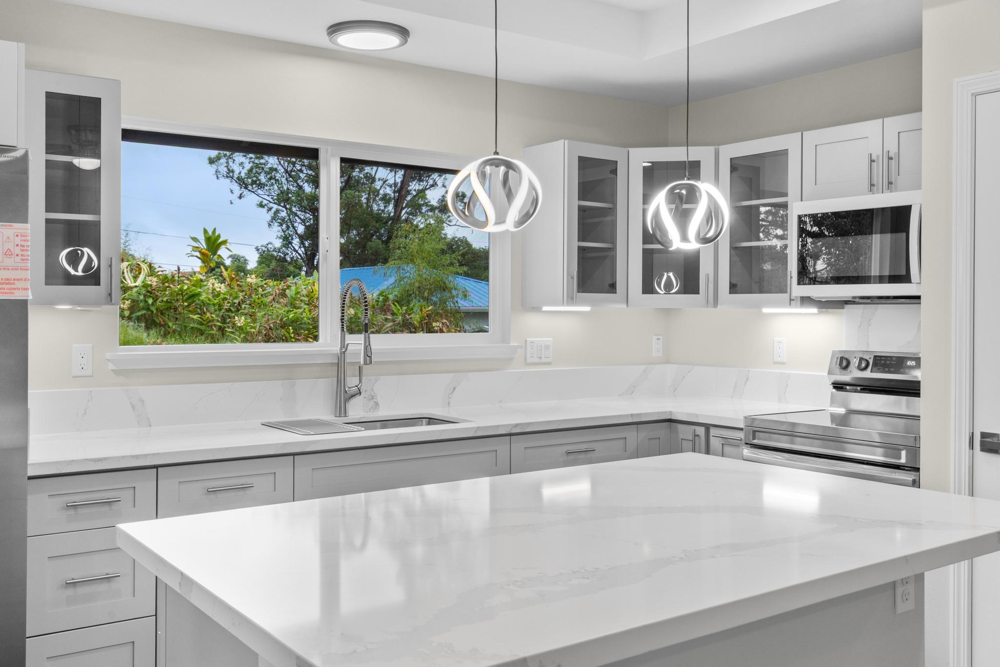 With its high ceilings and clean design lines, this house feels very comfortable. The open-concept kitchen features quartz countertops, elegant cabinetry with soft-close drawers and stainless steel appliances include a refrigerator, electric stove and microwave hood.