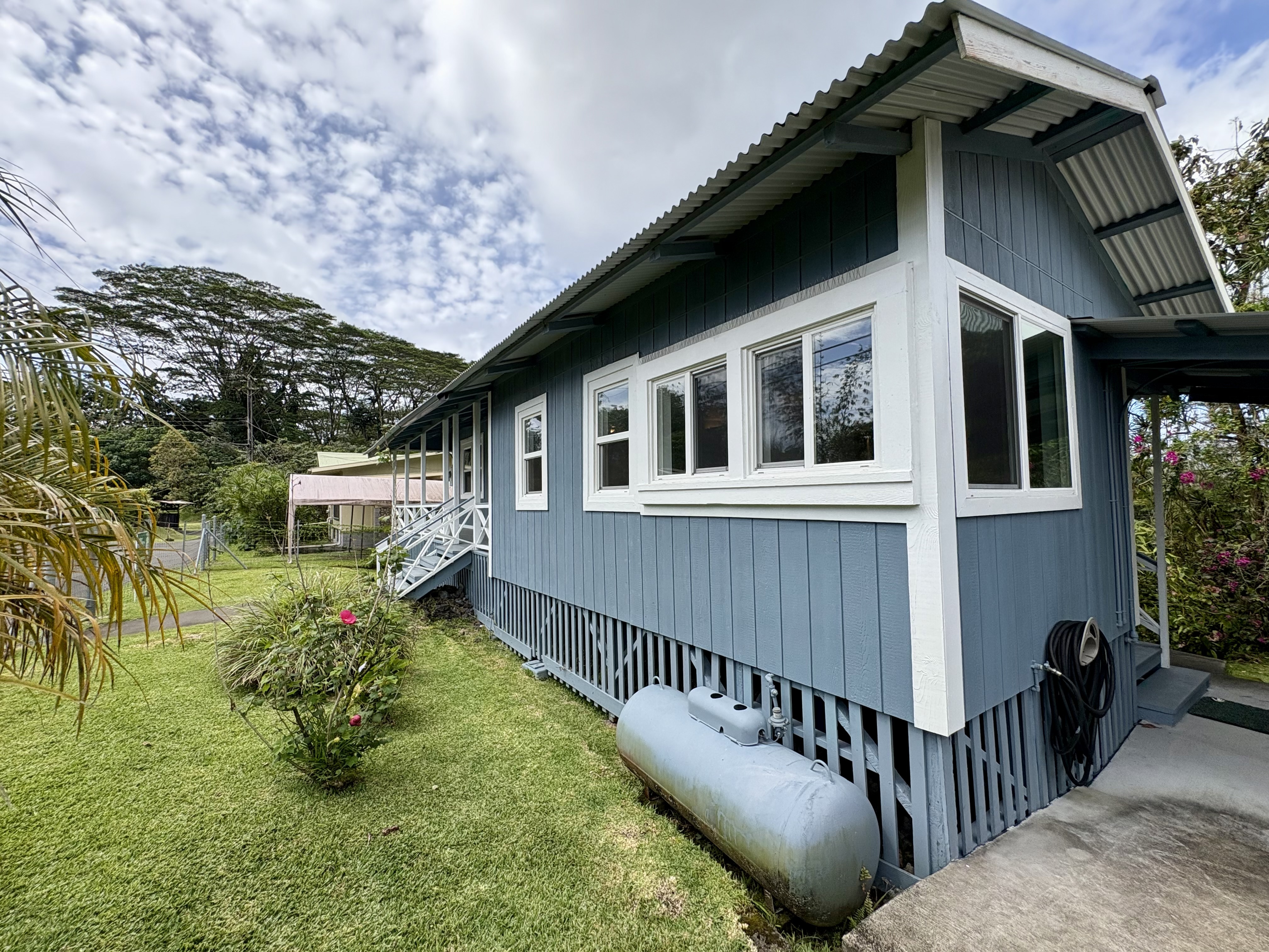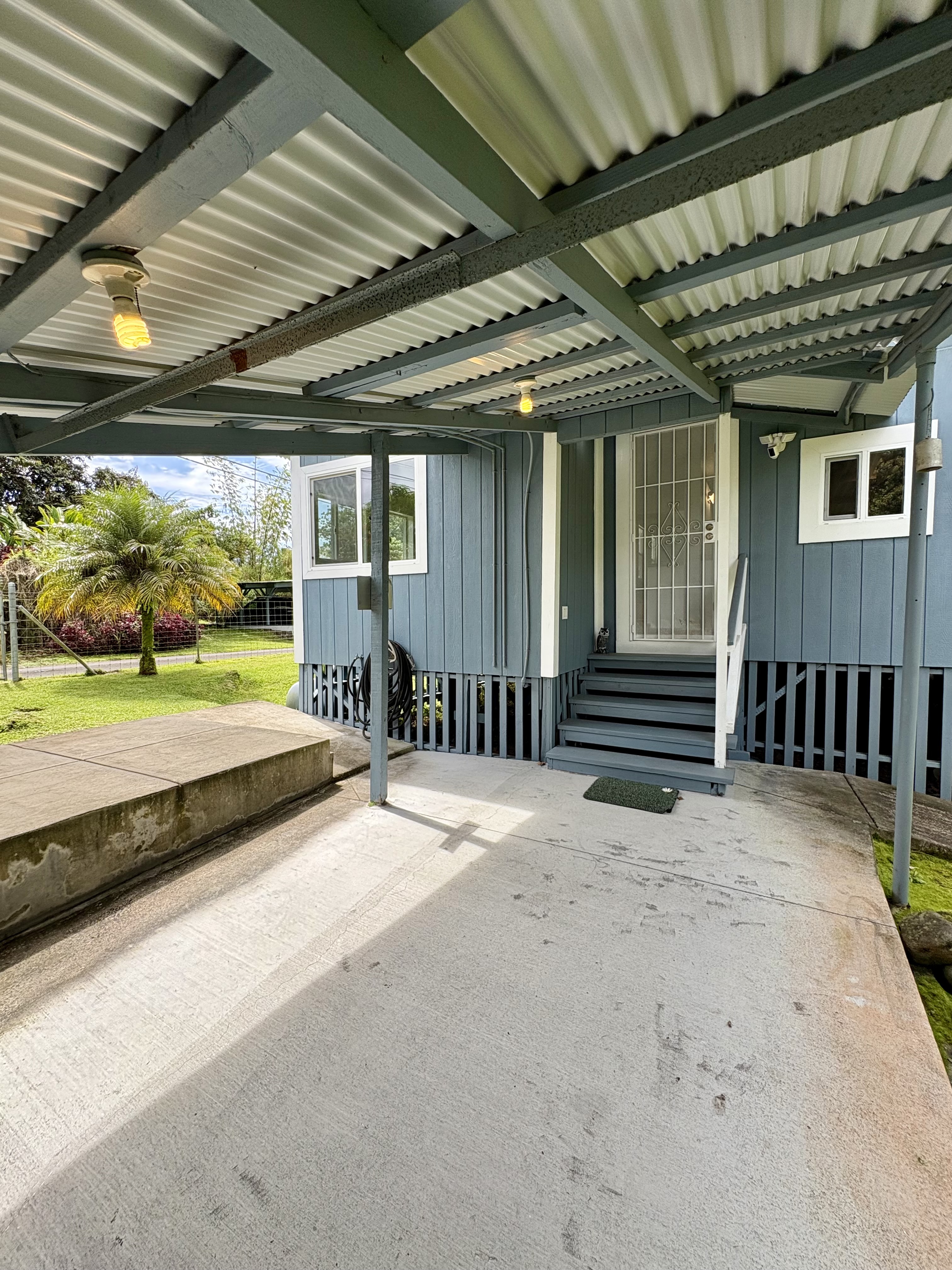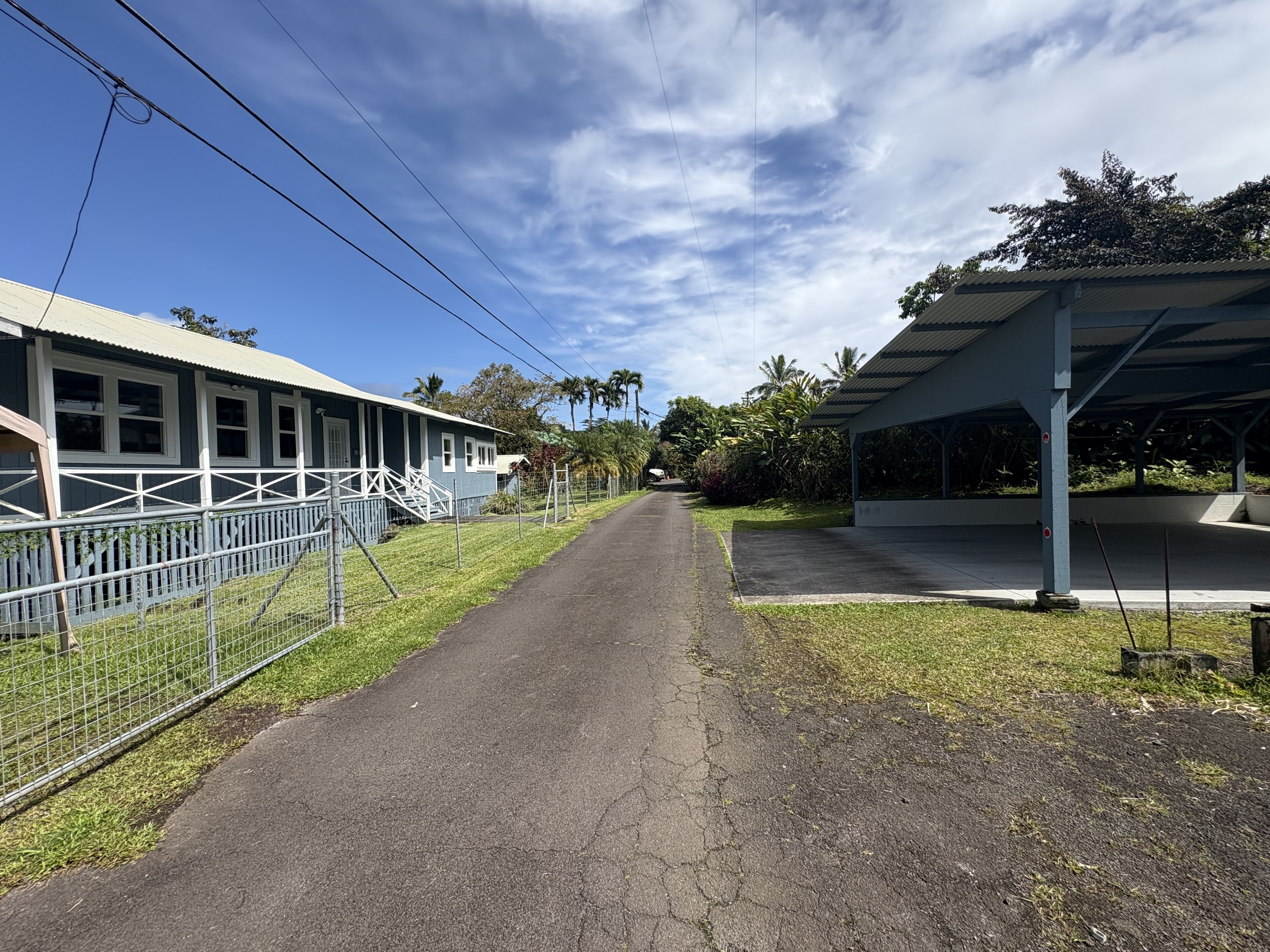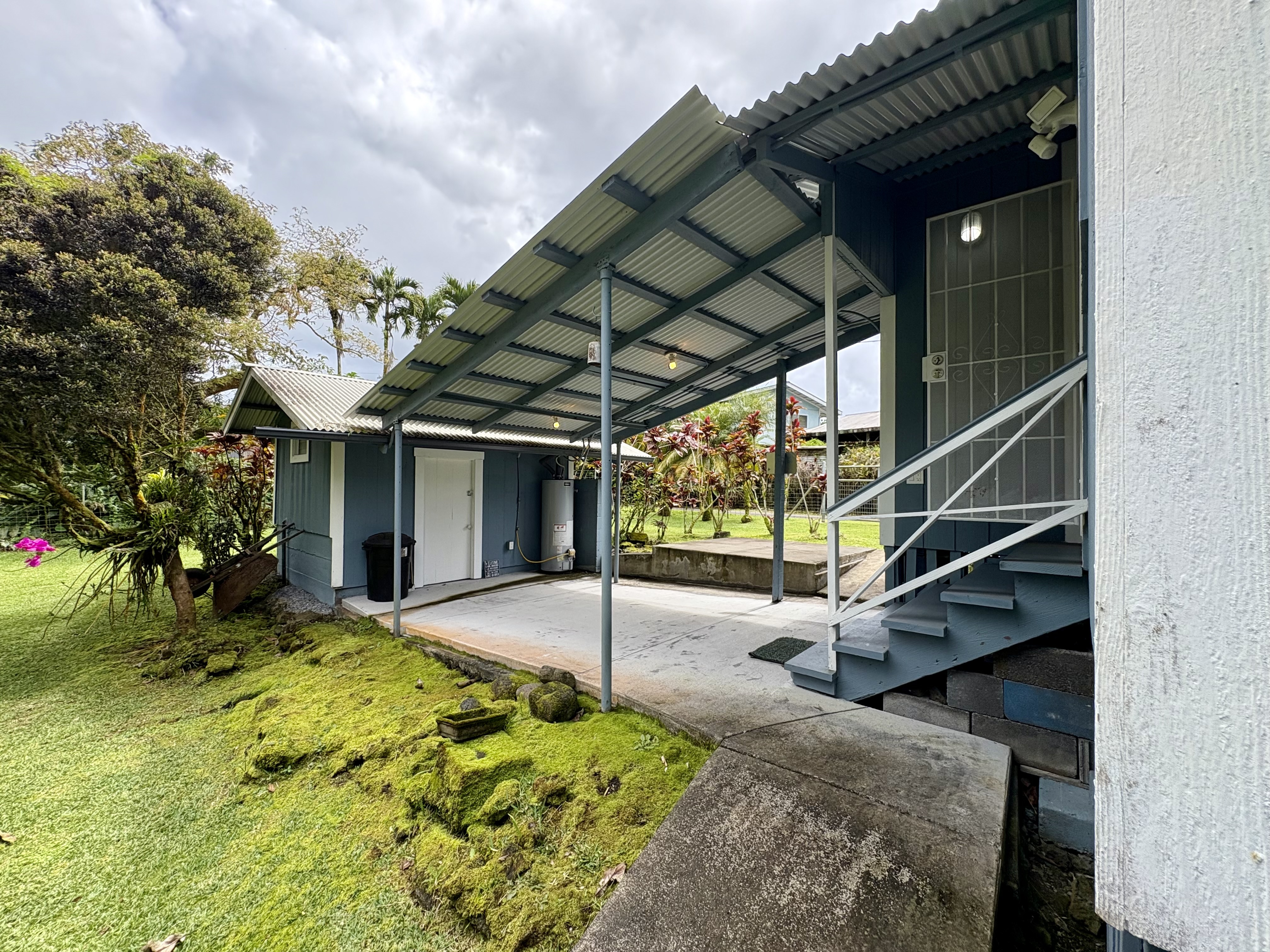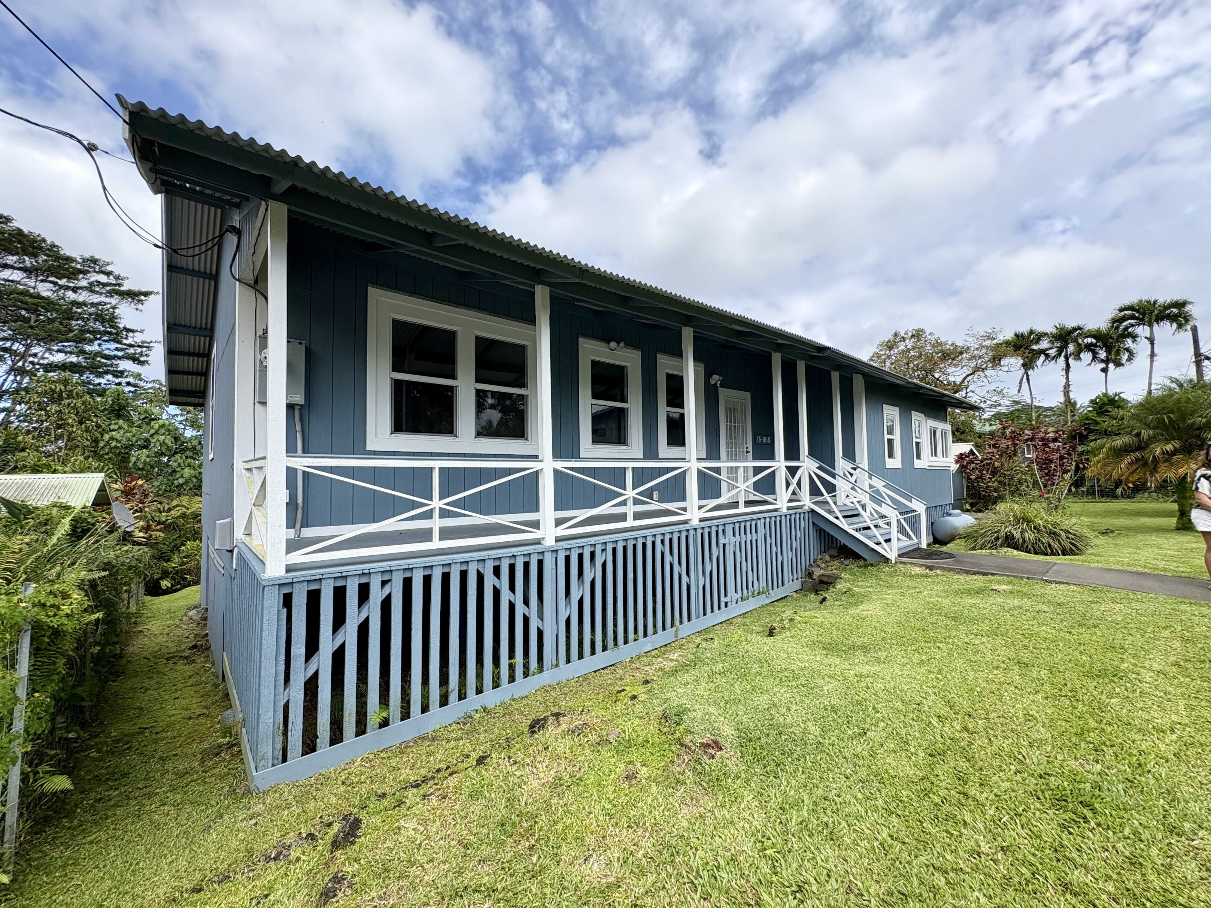 Sale includes TMKS 3-1-5-12-34 and 3-1-5-12-62. Unique opportunity to own two parcels in the heart of Pahoa Town. This renovated plantation-style 2-bedroom, 1-bath home sits on a 12,915 sq ft lot surrounded by lush tropical landscaping and a peaceful forest backdrop, with an additional TMK located across the road that includes a covered parking structure. The home has been extensively upgraded with a new roof and rafters, new interior and exterior paint, updated plumbing and electrical, storm windows and screens, and security screen doors. Interior features include mosaic stone tile flooring, luxury laminate flooring, tiled bathroom showers, and an updated kitchen with new appliances, cabinets, and countertops. A movable granite-top island adds flexibility to the dining space. The property features mature tropical landscaping including anthuriums, yellow ohia trees, lychee, avocado, citrus, tree ferns and liliko'i. The spacious living area offers abundant natural light and refreshing island breezes, while the primary bedroom enjoys peaceful forest views through newly installed windows. A major benefit is that the property is serviced by county water. The second TMK across the road provides a two-car covered parking area with a concrete base, offering additional flexibility for parking, storage, or future use. Conveniently located within walking distance to Pahoa town, shops, dining, and local amenities. Sale includes two TMKs, providing additional space and value with this unique property.
