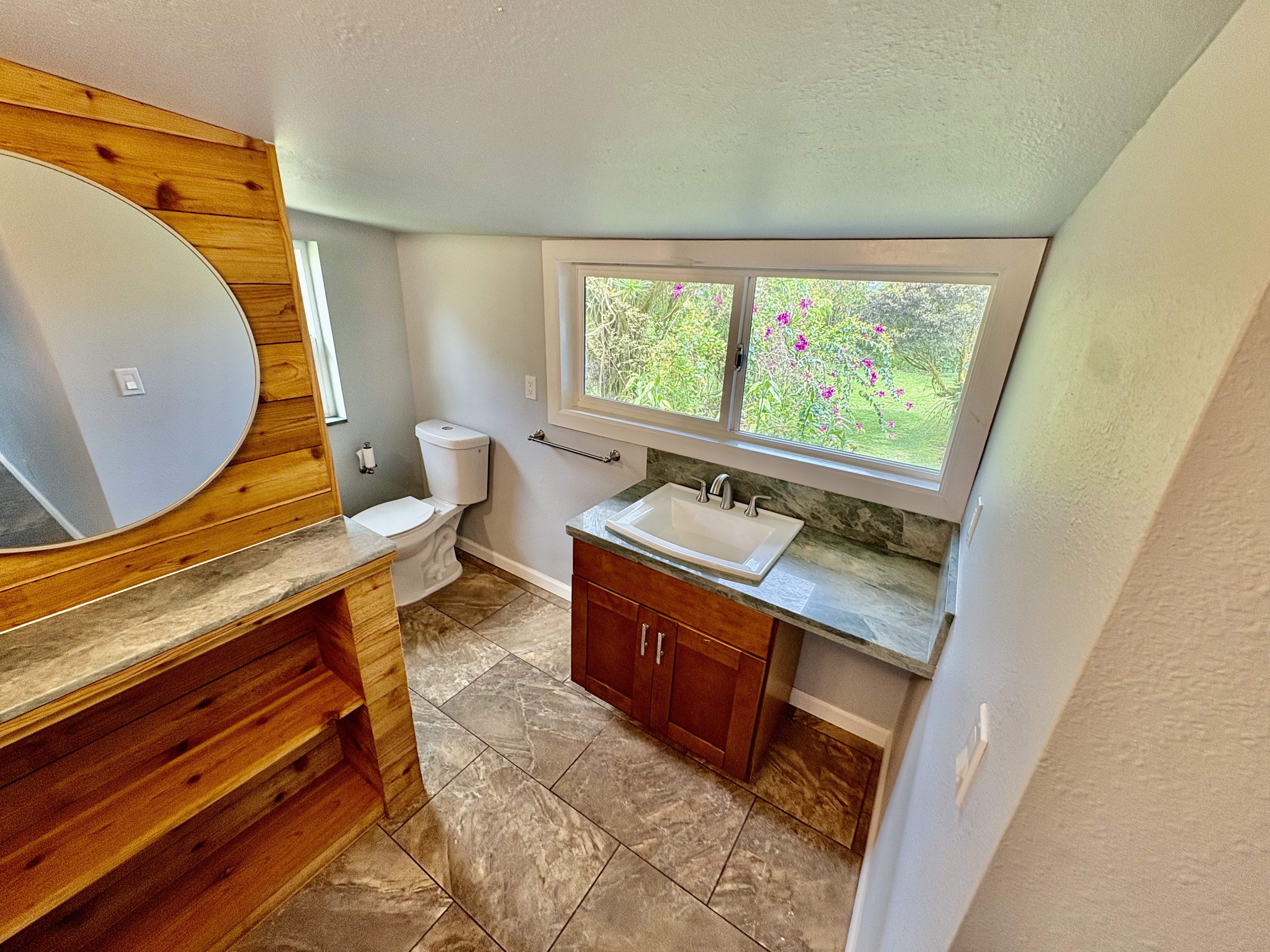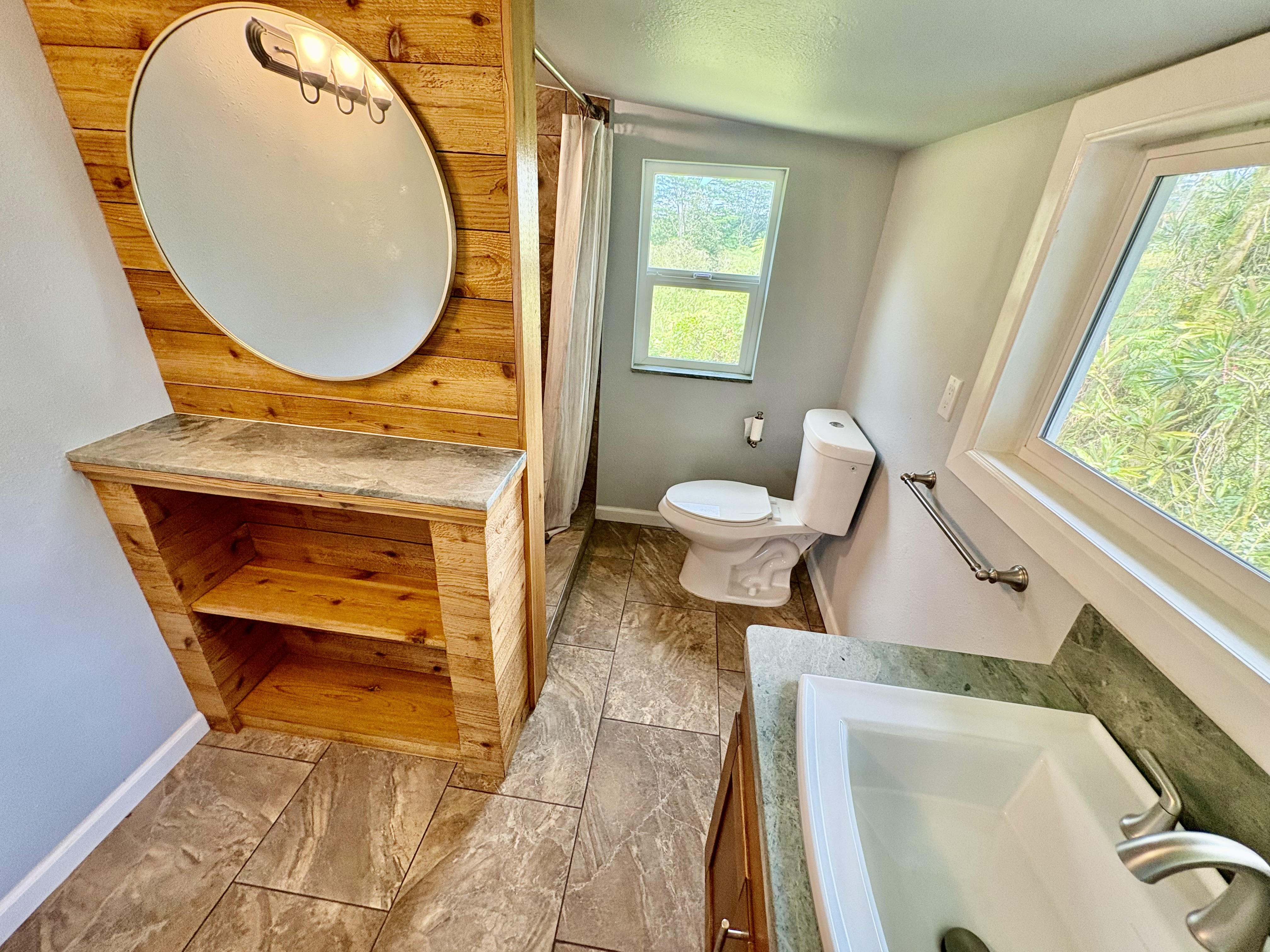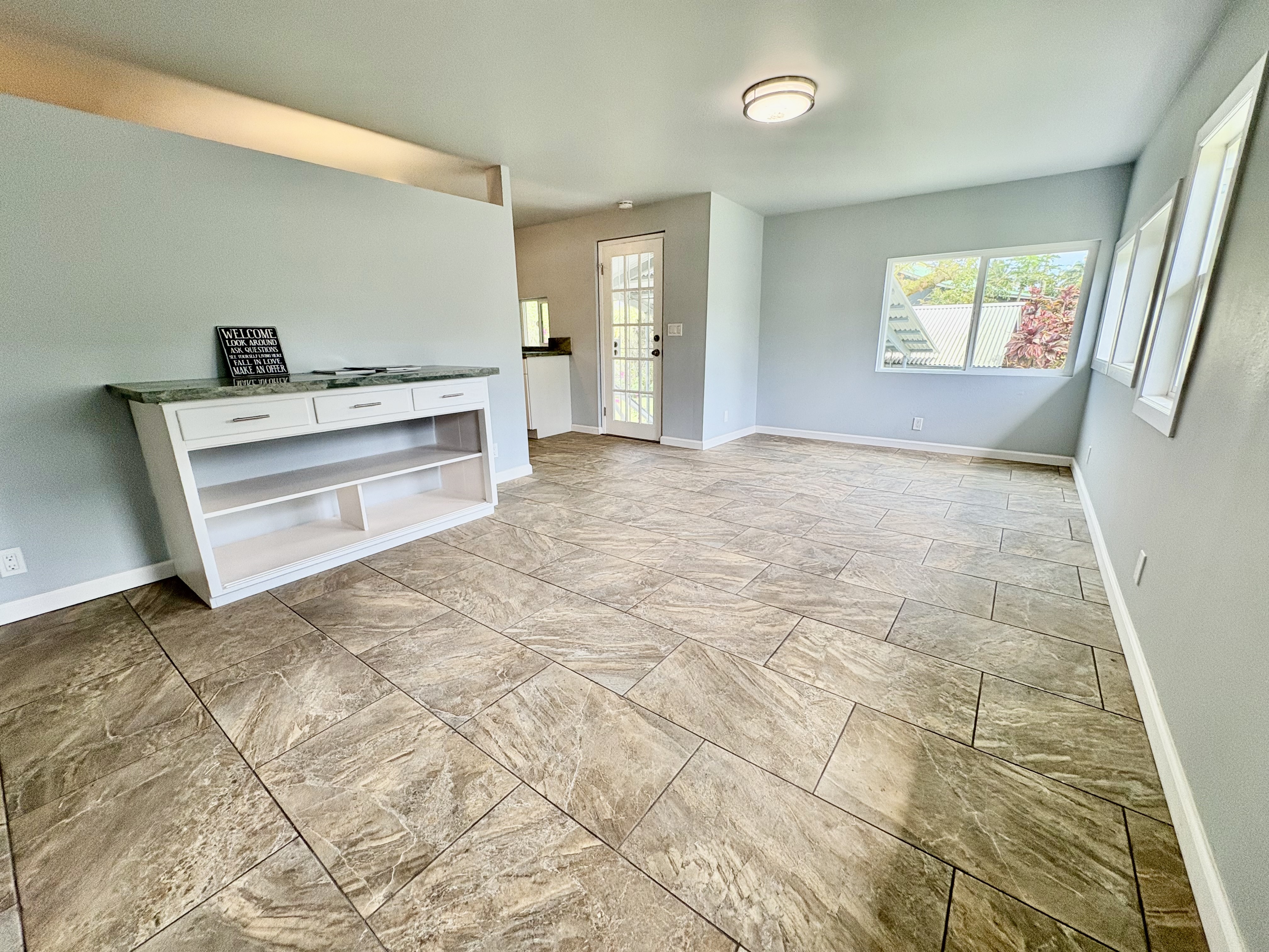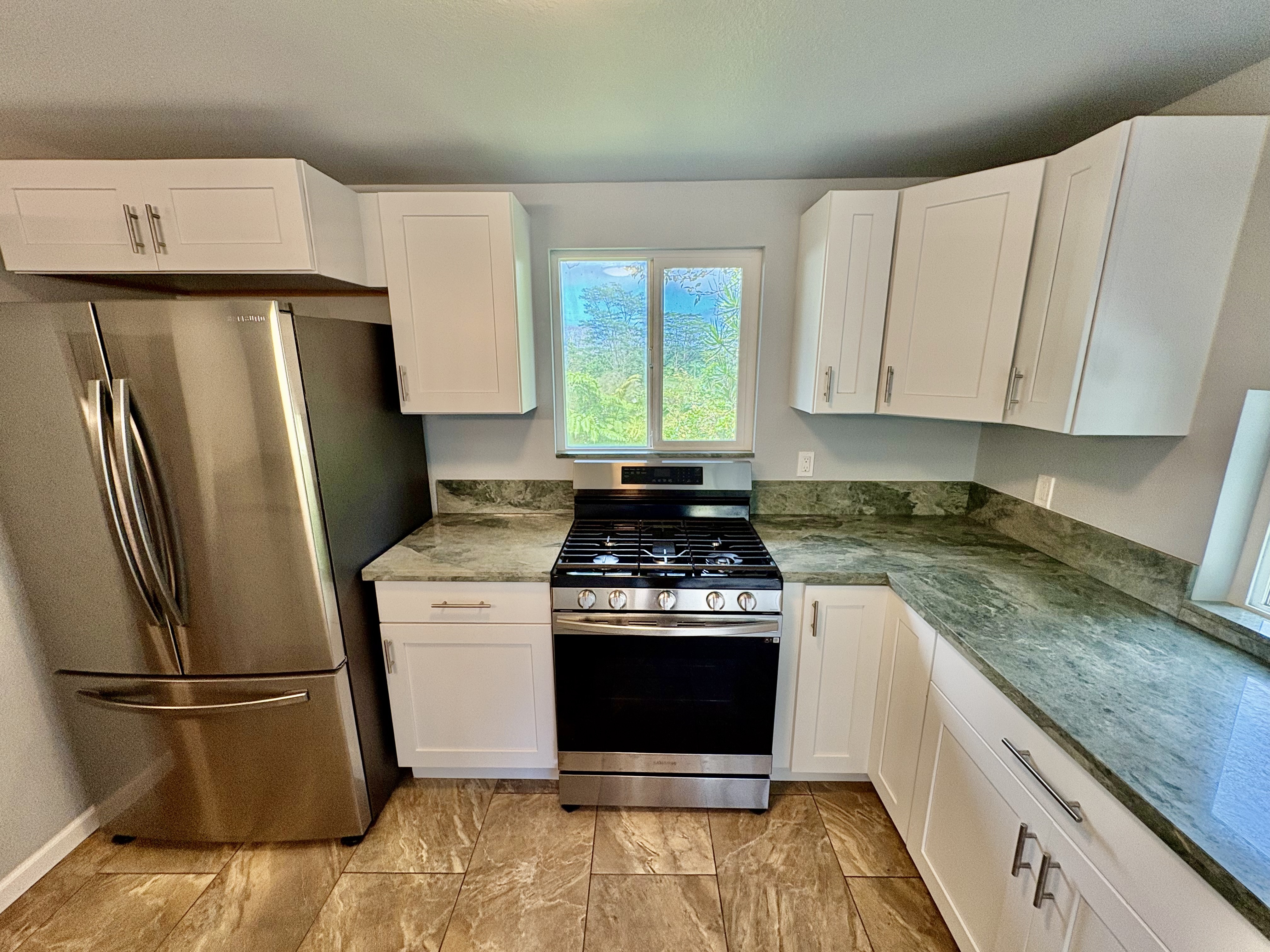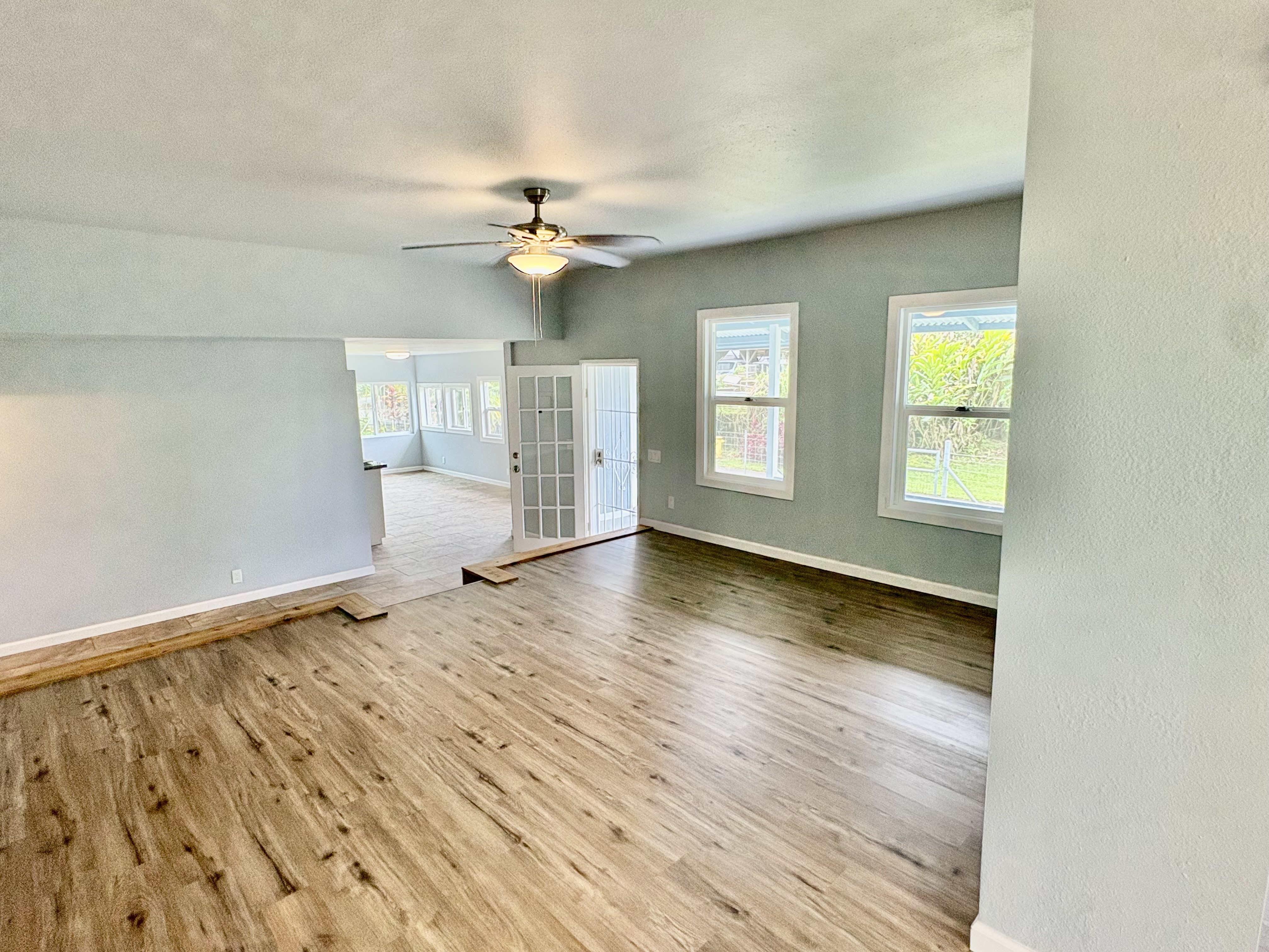 Sale includes TMKS 3-1-5-12-34 and 3-1-5-12-62. Unique opportunity to own two parcels in the heart of Pahoa Town. This renovated plantation-style 2-bedroom, 1-bath home sits on a 12,915 sq ft lot surrounded by lush tropical landscaping and a peaceful forest backdrop, with an additional TMK located across the road that includes a covered parking structure. The home has been extensively upgraded with a new roof and rafters, new interior and exterior paint, updated plumbing and electrical, storm windows and screens, and security screen doors. Interior features include mosaic stone tile flooring, luxury laminate flooring, tiled bathroom showers, and an updated kitchen with new appliances, cabinets, and countertops. A movable granite-top island adds flexibility to the dining space. The property features mature tropical landscaping including anthuriums, yellow ohia trees, lychee, avocado, citrus, tree ferns and liliko'i. The spacious living area offers abundant natural light and refreshing island breezes, while the primary bedroom enjoys peaceful forest views through newly installed windows. A major benefit is that the property is serviced by county water. The second TMK across the road provides a two-car covered parking area with a concrete base, offering additional flexibility for parking, storage, or future use. Conveniently located within walking distance to Pahoa town, shops, dining, and local amenities. Sale includes two TMKs, providing additional space and value with this unique property.