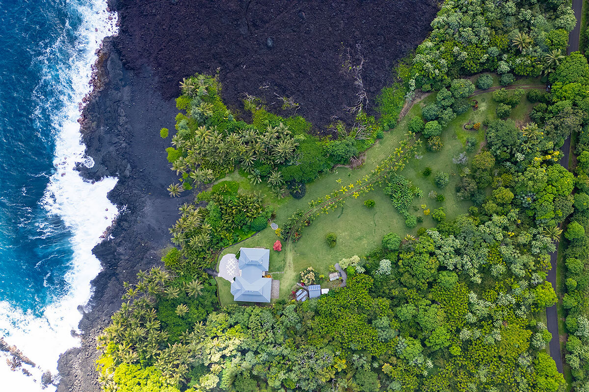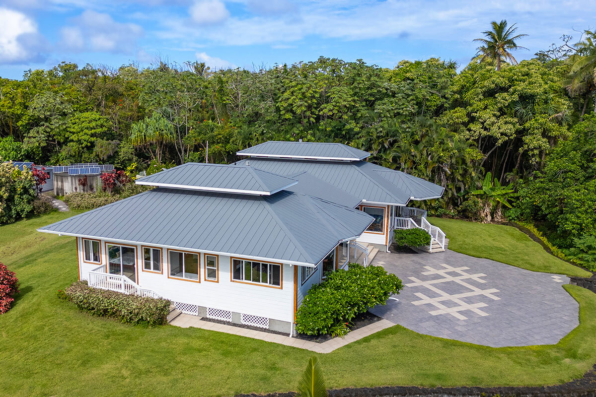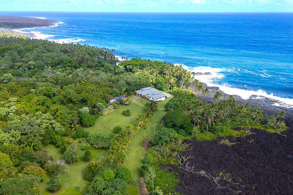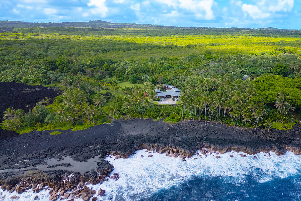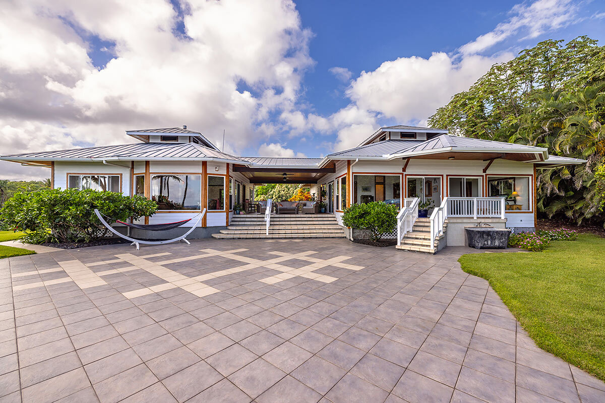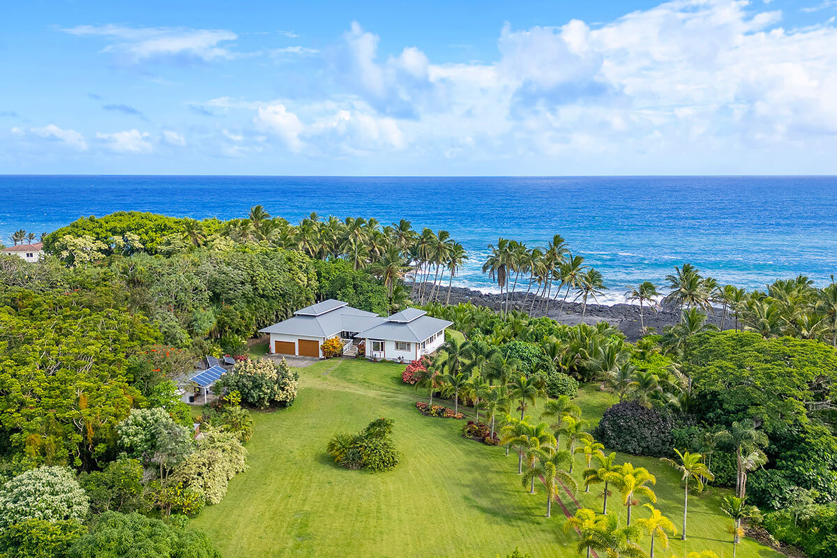 Rare oceanfront estate on 5+ private acres along the spectacular Pohoiki coastline. Originally designed and built by a master builder and lovingly maintained, this unique property blends quality construction, privacy, and breathtaking natural beauty. Whether enjoyed as a serene private residence or a hosted vacation rental, the setting offers an unforgettable East Hawai?i experience. Enter through a private gate to a lush tropical property featuring a mature orchard with mango, banana, avocado, ?ulu, citrus, macadamia, and other fruit trees. A palm-lined driveway leads to the home, perfectly positioned to capture expansive ocean views and cooling sea breezes. The thoughtfully designed layout includes two separate structures connected by a large covered lanai, creating seamless indoor-outdoor living. The main residence features an ocean-facing living room, spacious kitchen, dining area, and a private primary bedroom suite. The second structure offers a comfortable living area, kitchenette, and two bedrooms–one with stunning ocean views. Architectural features include soaring 10-foot ceilings with cupolas designed for natural airflow. Outdoor living is highlighted by an expansive 1,688 sq ft oceanside tile sundeck–perfect for relaxing, entertaining, or watching the sunrise over the Pacific. Additional amenities include an outdoor shower, soaking tub, and rock walls with steps leading toward the coastline. The property is designed for sustainable island living with a new solar power system, cement catchment tank with UV water filtration, work shed, chicken coop, garden workspace, and compost bins. An oversized 816 sq ft garage with boat/RV-height door and separate laundry room adds convenience and flexibility. A rare opportunity to own a private relaxing oceanfront retreat surrounded by lush tropical landscape and the dramatic beauty of Hawai?i’s East Coast. Additional interior and exterior photos & video will be provided.